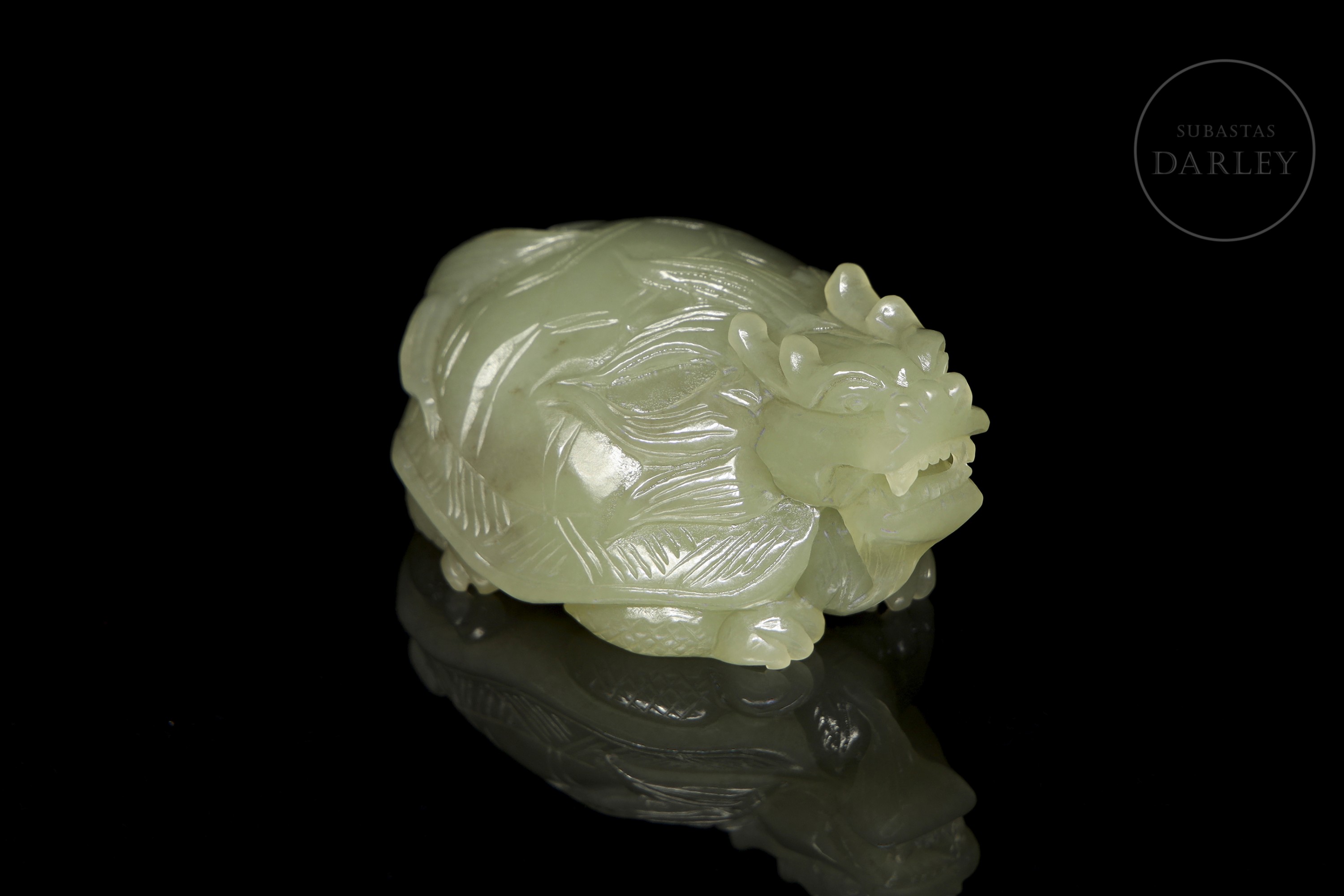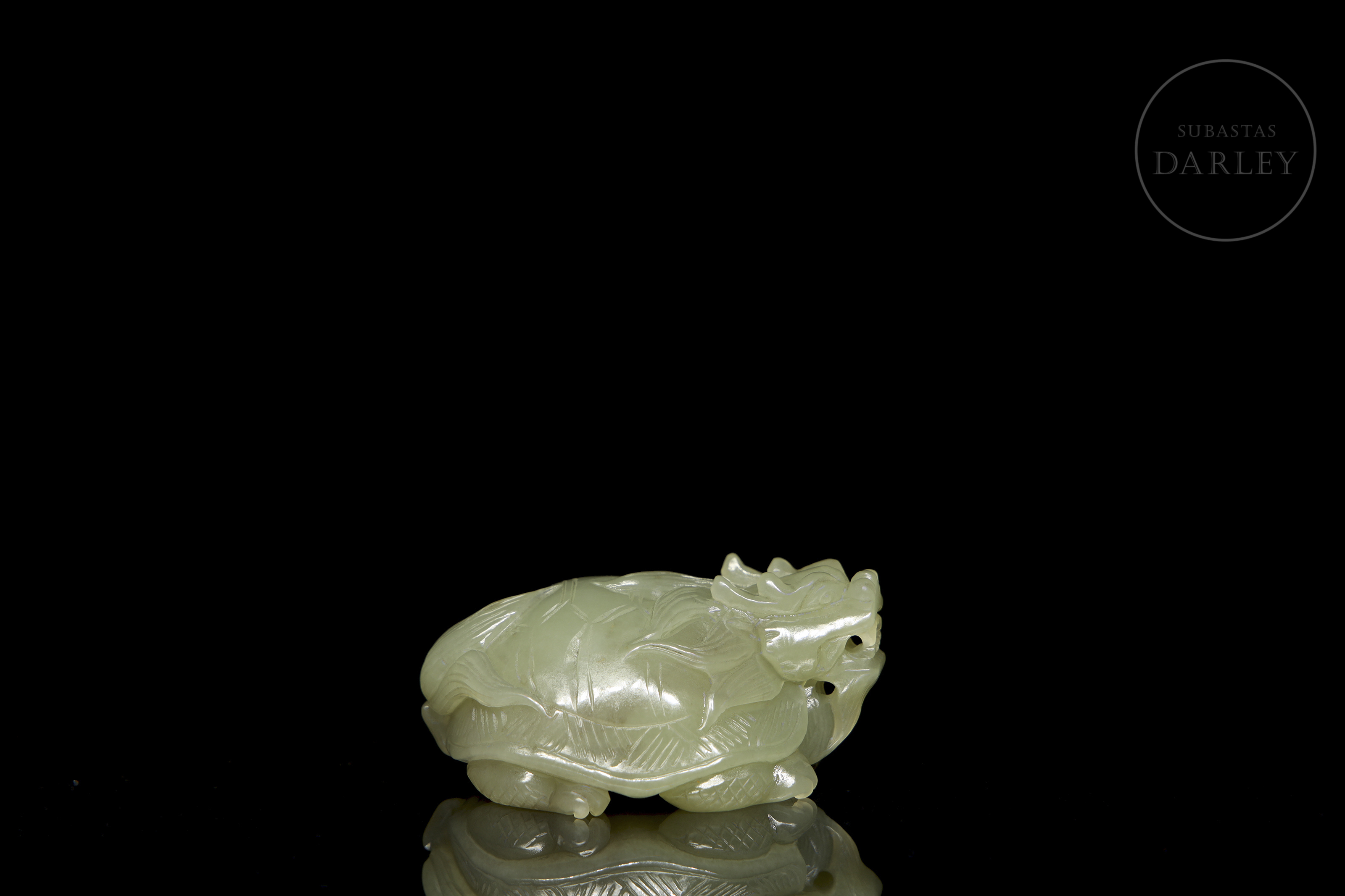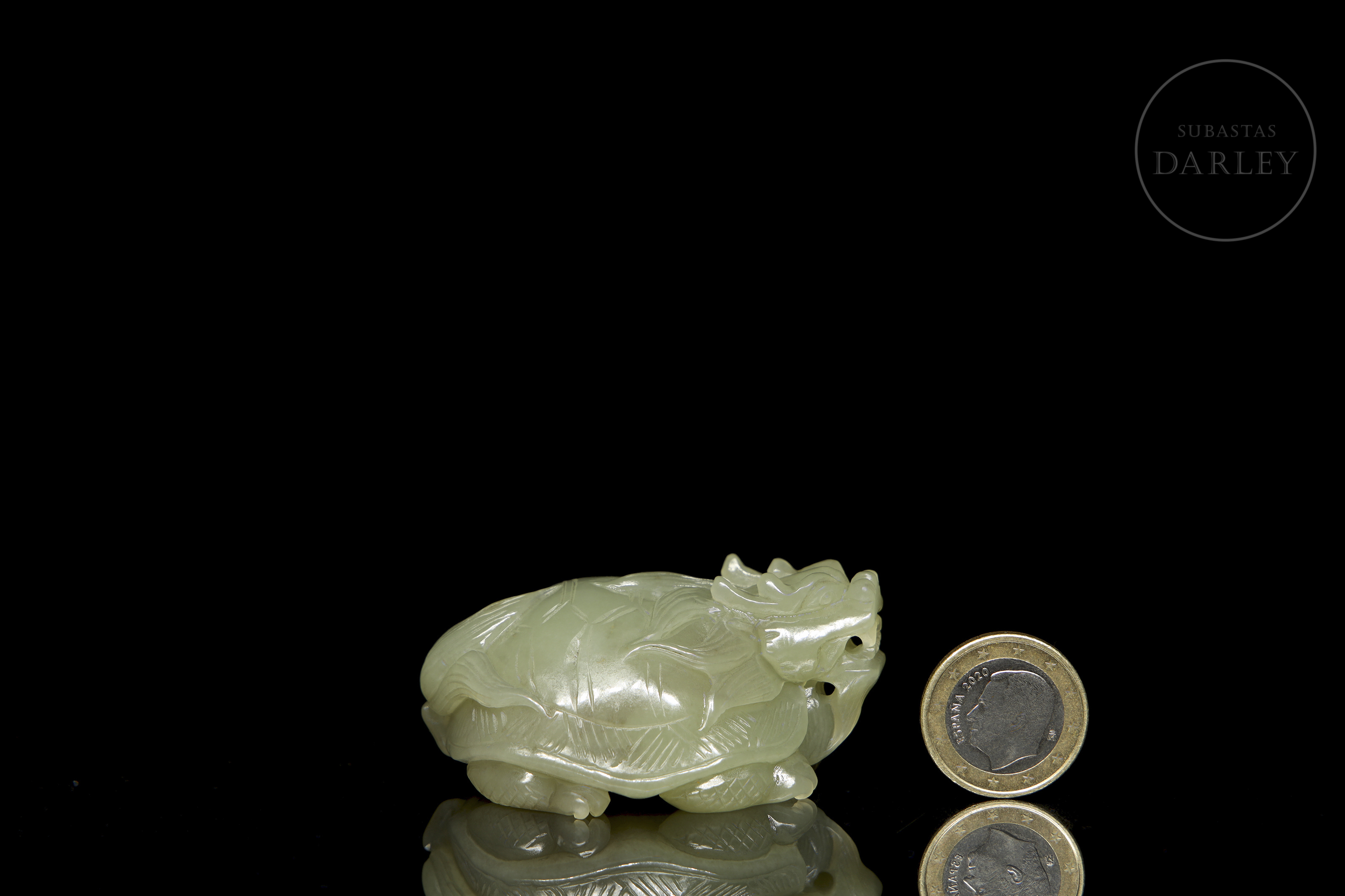 Escultura tallada en jade de tonalidad verde pálido translúcido, representando a una tortuga dragón (Bixi), una criatura mítica de la tradición china, símbolo de longevidad, fuerza y protección. La pieza muestra un cuerpo robusto de tortuga con detalladas patas y caparazón, mientras que la cabeza adopta rasgos de dragón, con prominentes cuernos, ojos expresivos y boca entreabierta que deja ver los colmillos. La talla presenta finos grabados lineales que destacan las escamas, las garras y los motivos decorativos del caparazón, combinando volumen y detalle con gran maestría. La base de la figura es plana, permitiendo su estabilidad.