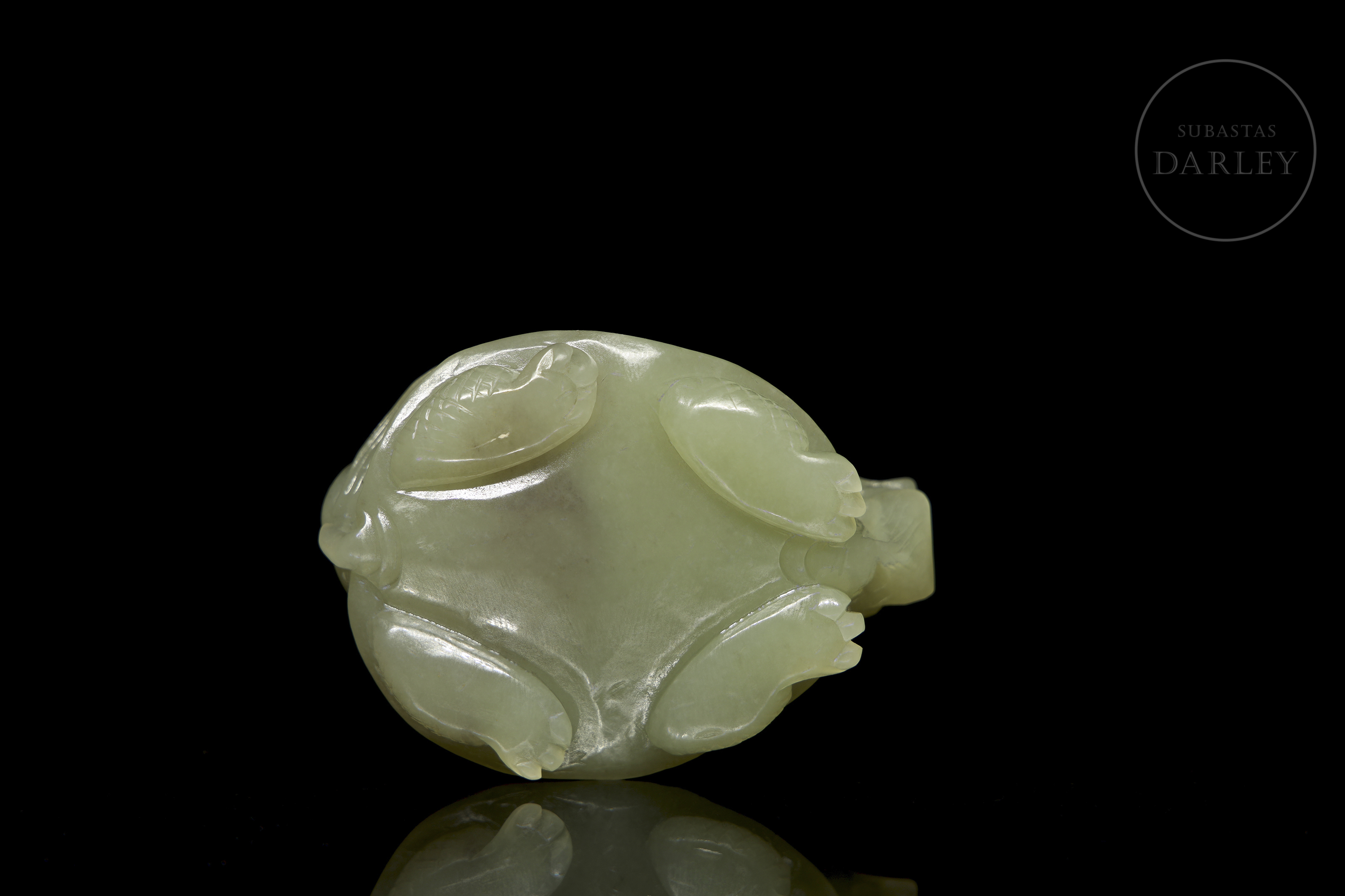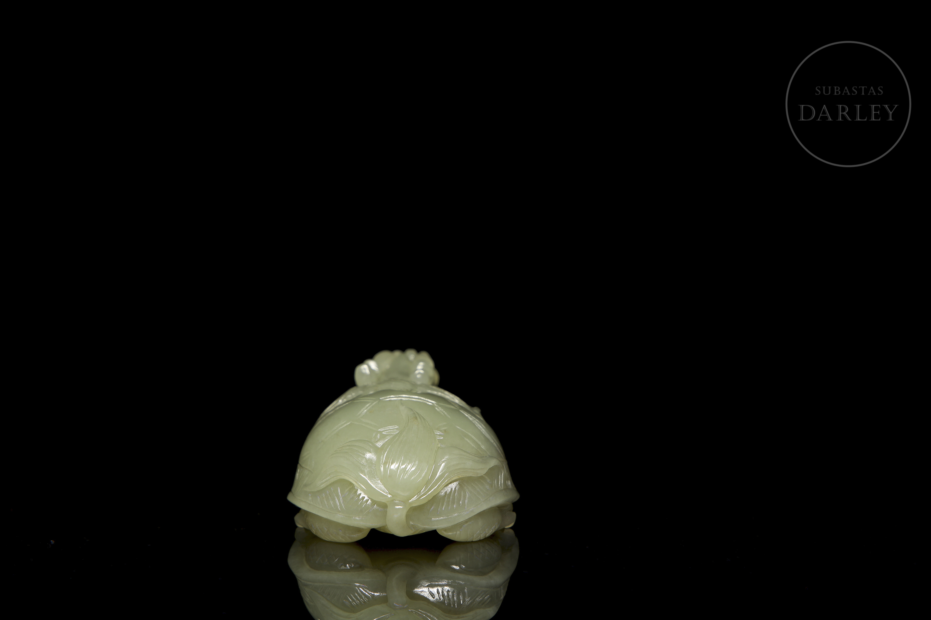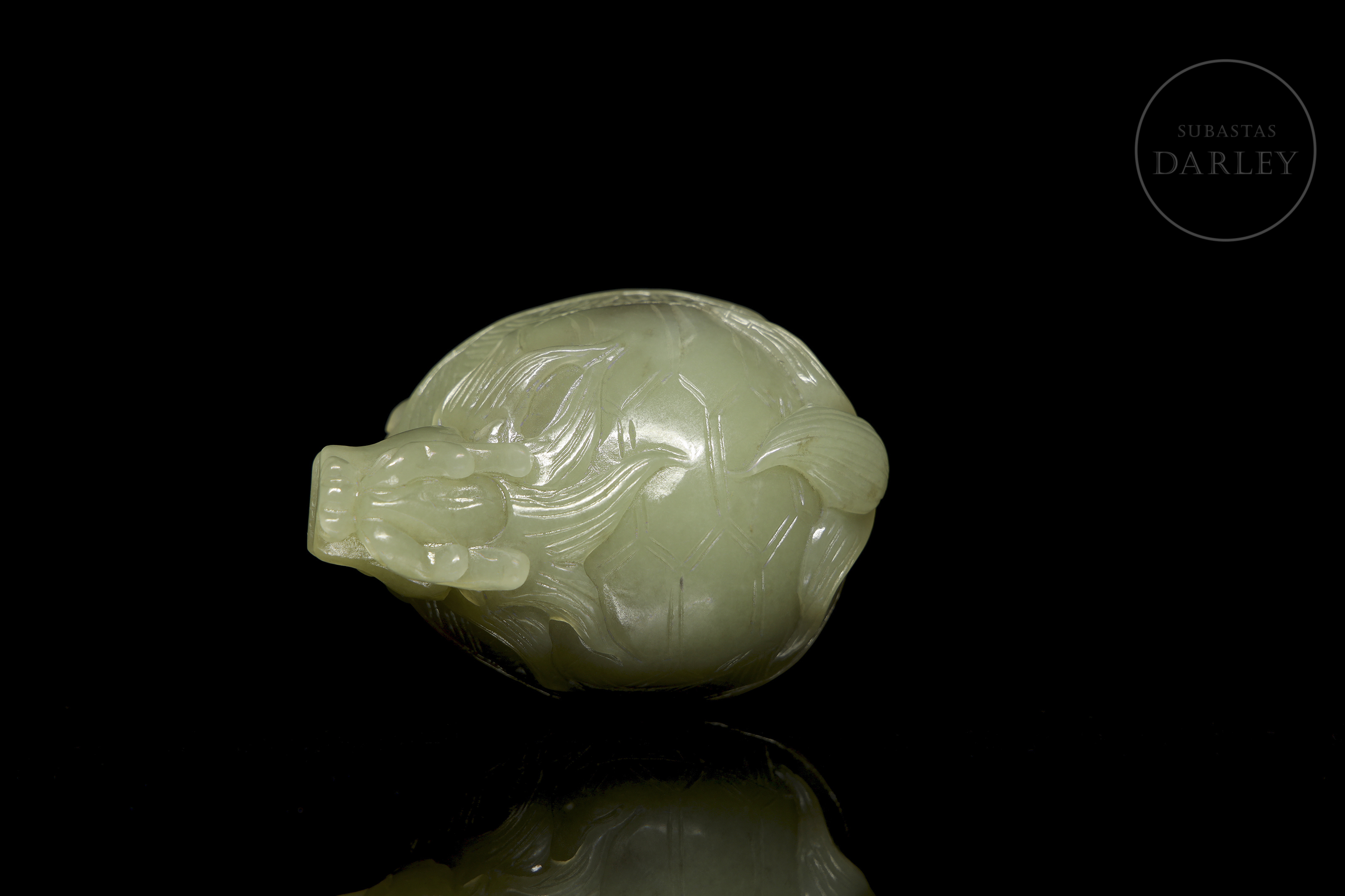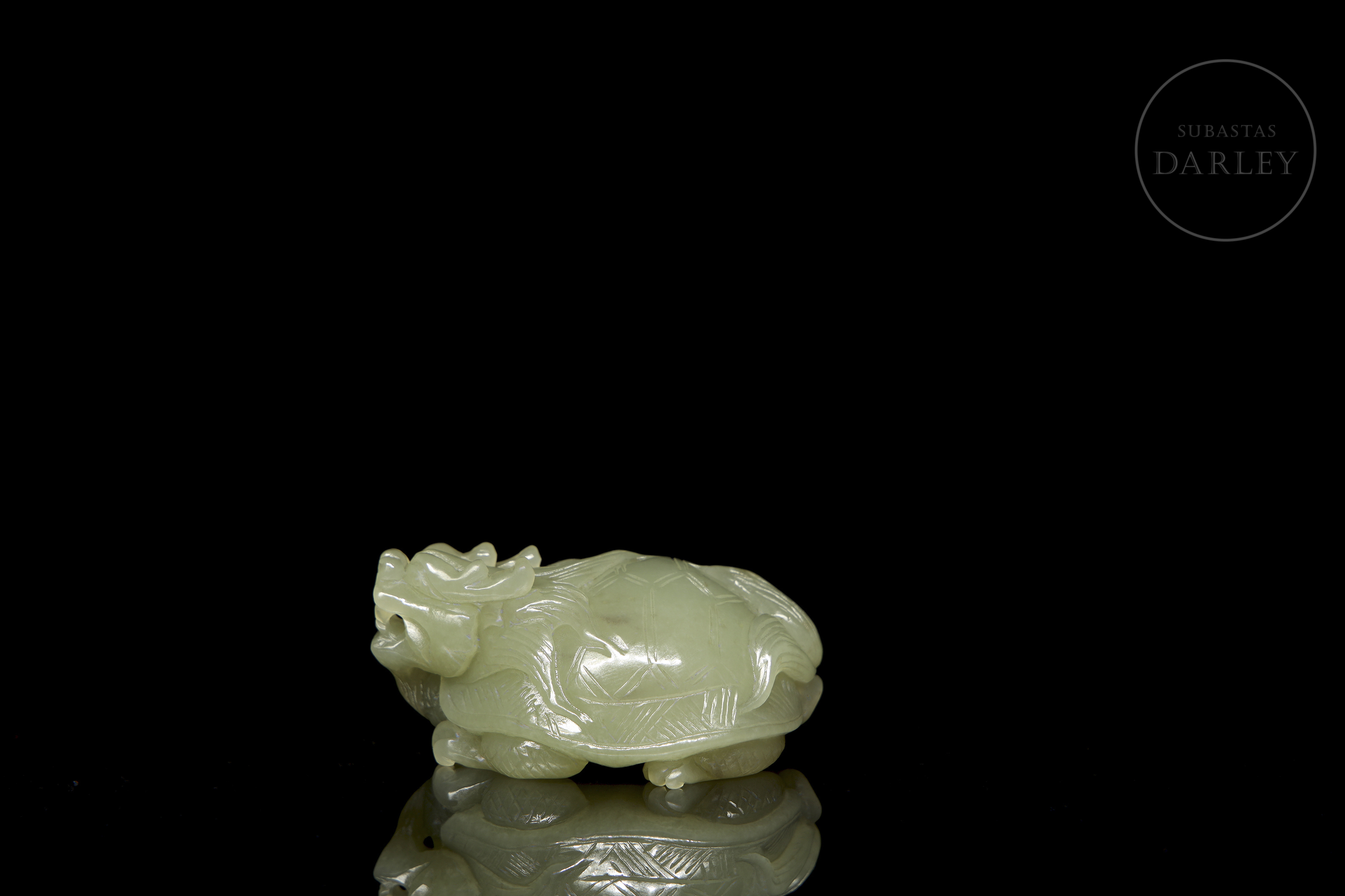 Escultura tallada en jade de tonalidad verde pálido translúcido, representando a una tortuga dragón (Bixi), una criatura mítica de la tradición china, símbolo de longevidad, fuerza y protección. La pieza muestra un cuerpo robusto de tortuga con detalladas patas y caparazón, mientras que la cabeza adopta rasgos de dragón, con prominentes cuernos, ojos expresivos y boca entreabierta que deja ver los colmillos. La talla presenta finos grabados lineales que destacan las escamas, las garras y los motivos decorativos del caparazón, combinando volumen y detalle con gran maestría. La base de la figura es plana, permitiendo su estabilidad.