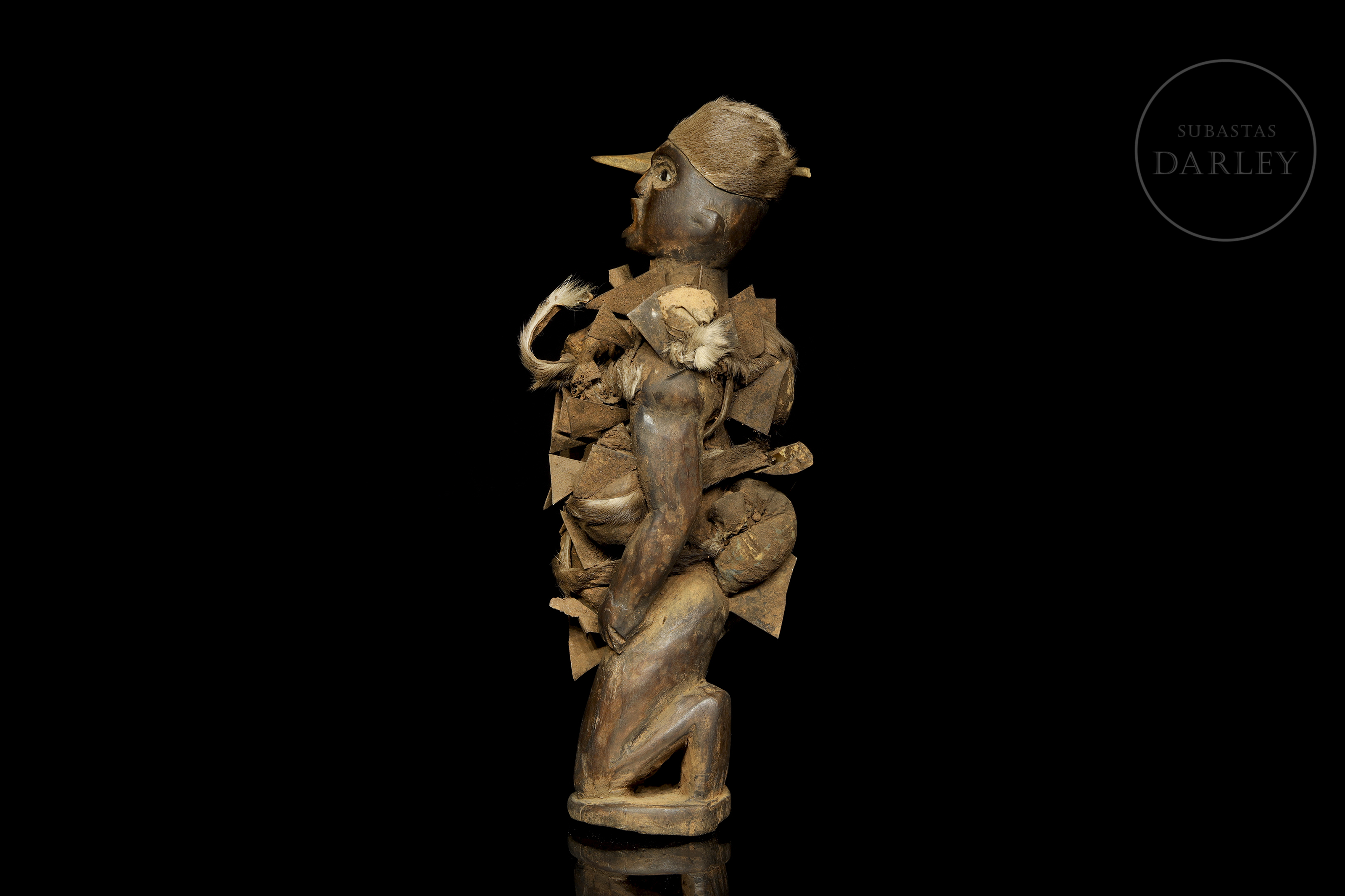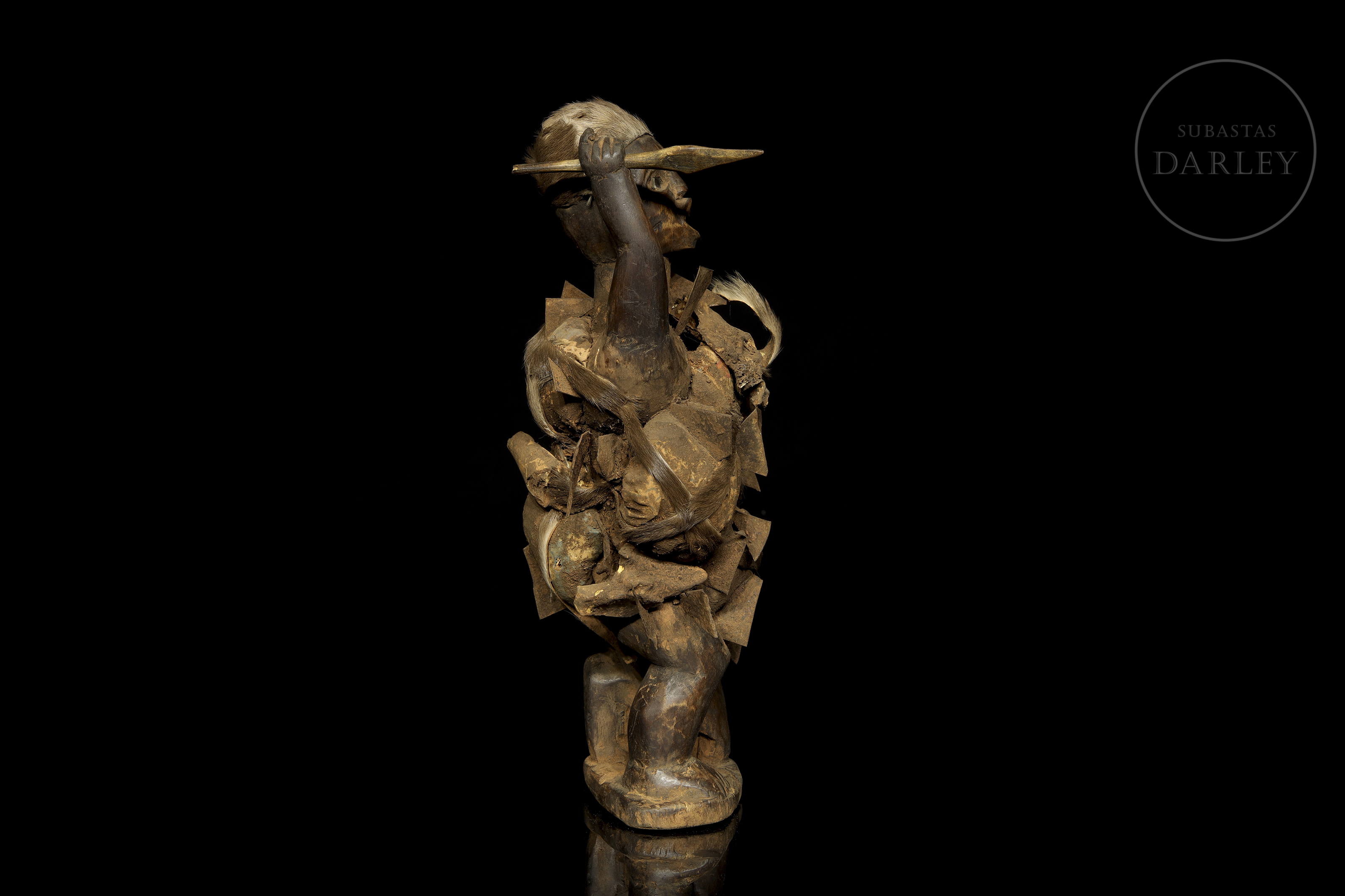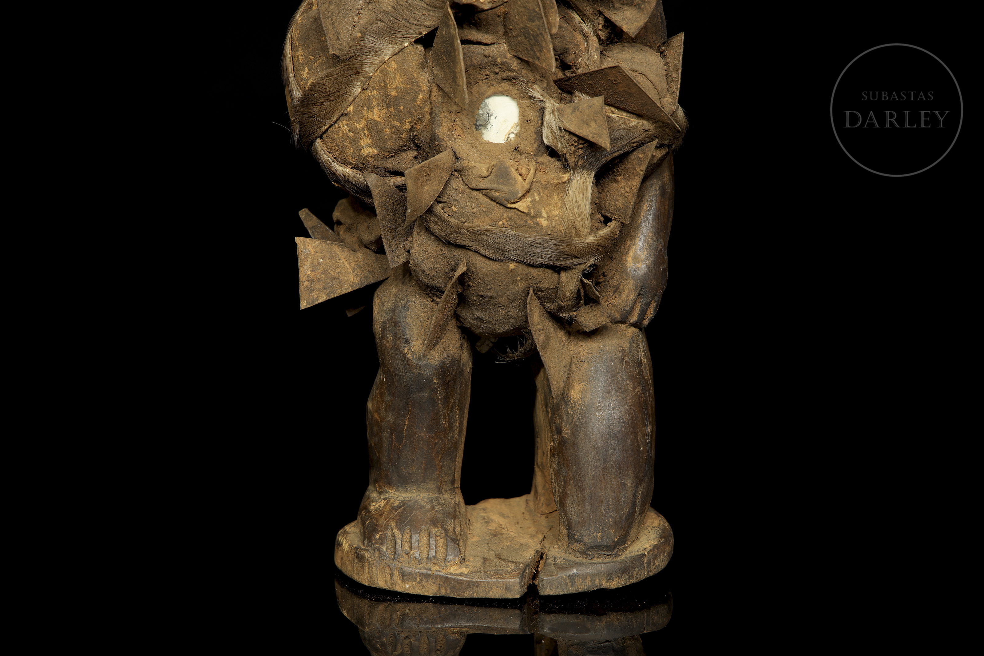 Figura fetiche de poder siguiendo modelos de las figuras Nkondi, realizada a partir de pelo, metal, vidrio, madera y textiles. Consideradas como unas figuras espirituales, estos "cazadores" son los encargados de proteger a su comunidad. Cabe destacar el énfasis en las expresiones de la figura, así como la postura desafiante y los distintos elementos adheridos al cuerpo, prueba de la importancia y ayuda a su comunidad.