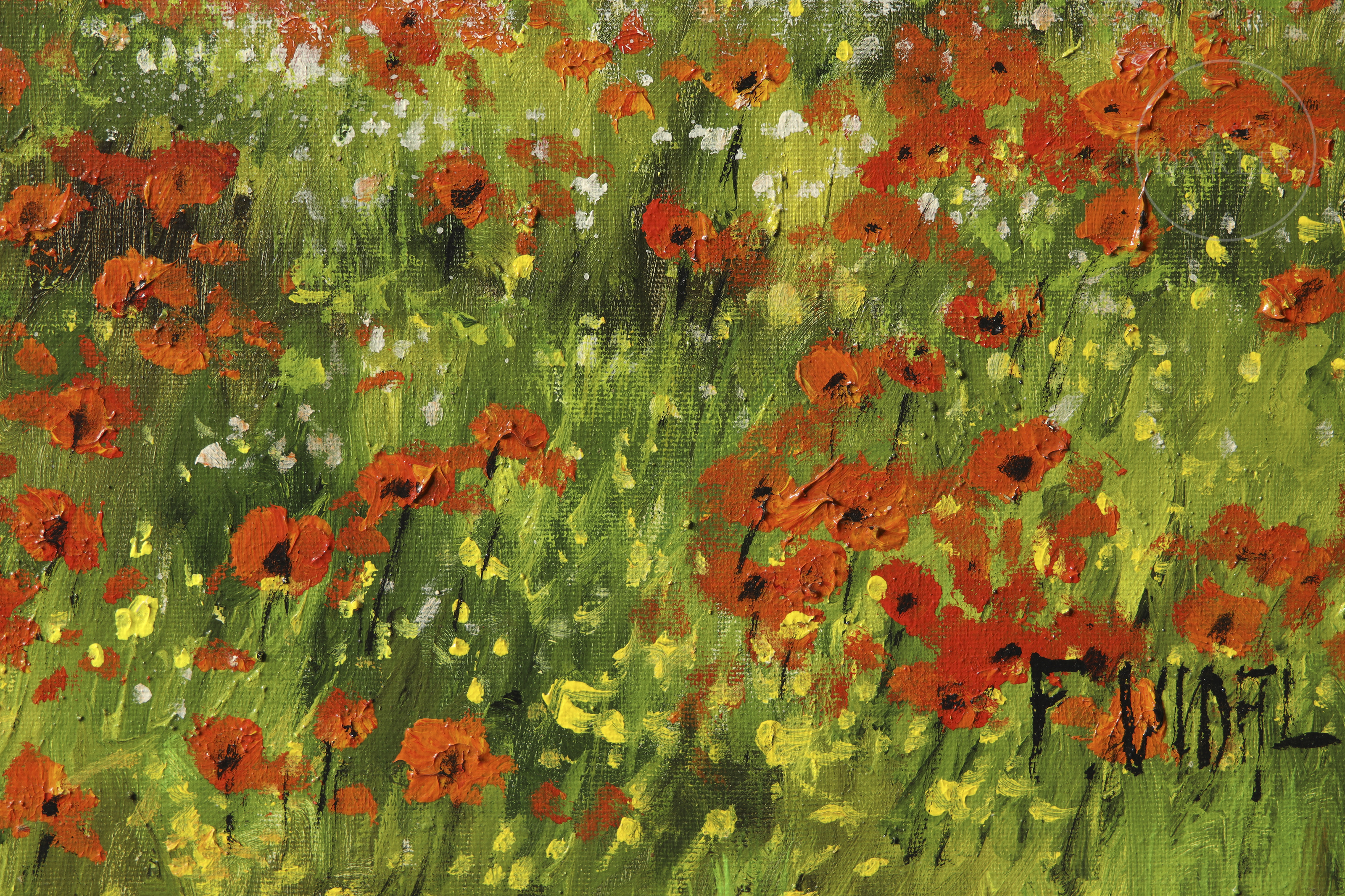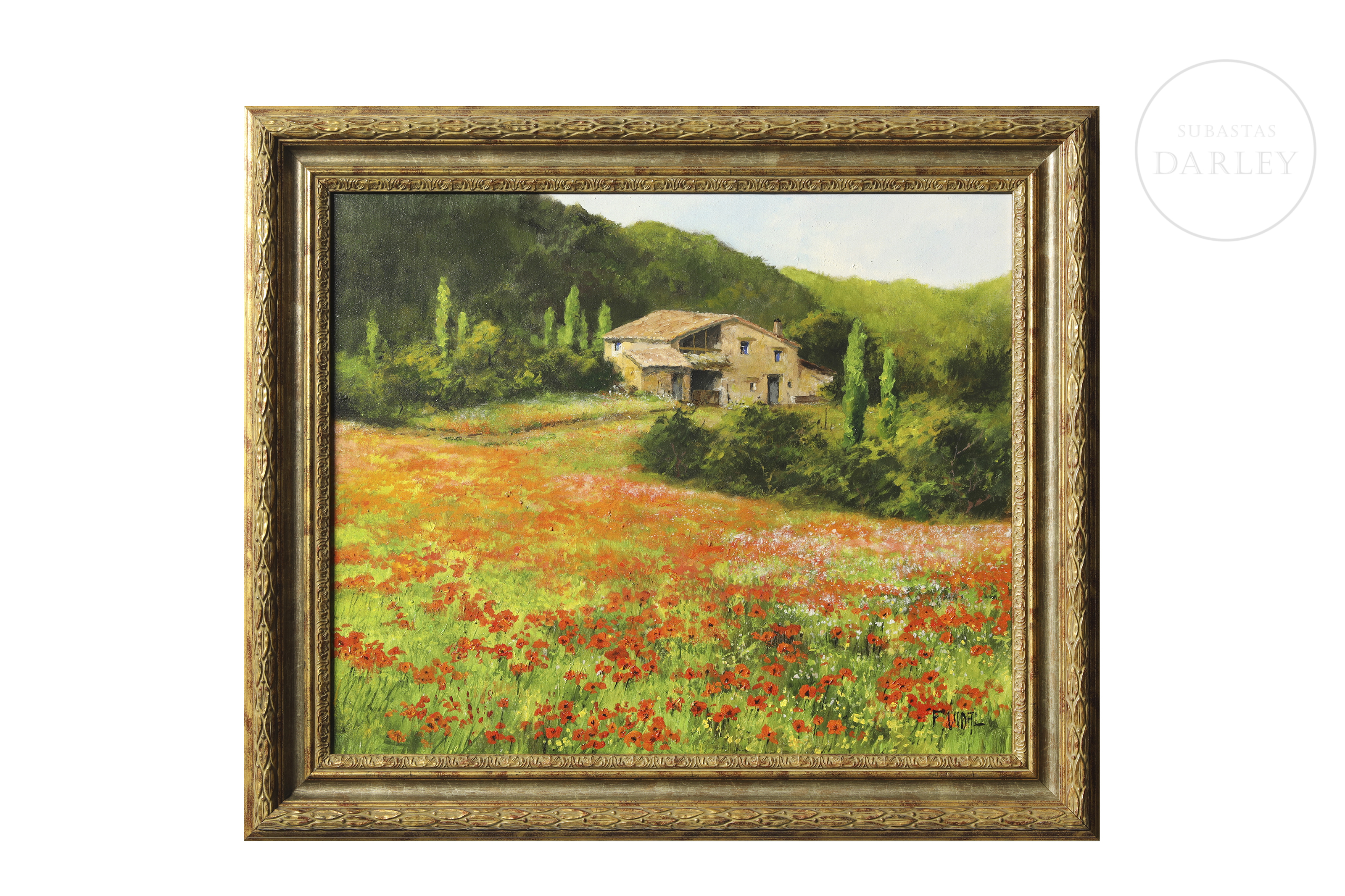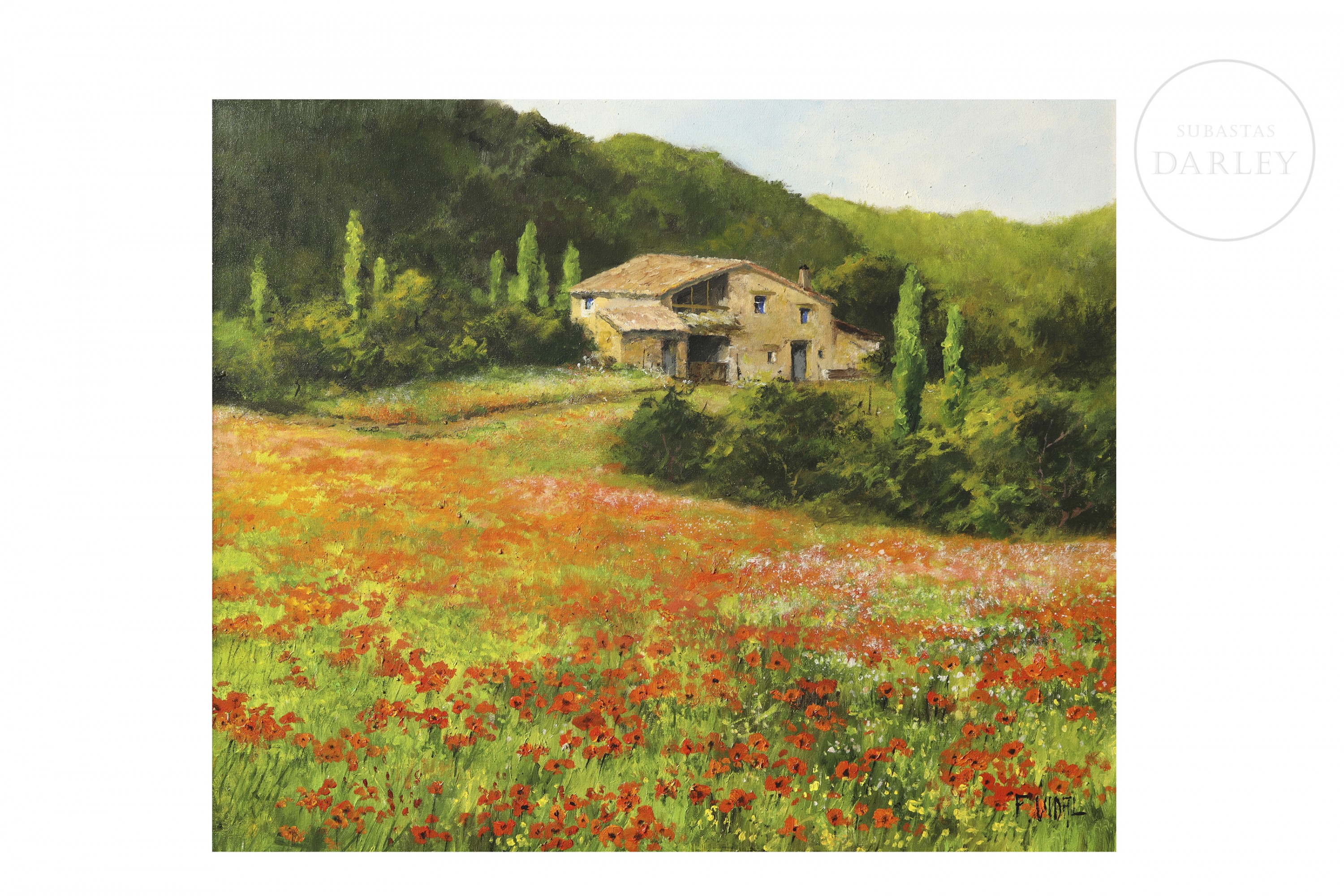 Óleo sobre lienzo. Paisaje de pincelada impresionista que representa un campo cubierto de amapolas rojas bajo un cielo de verano. Firmado "F. Vidal" en la esquina inferior derecha.