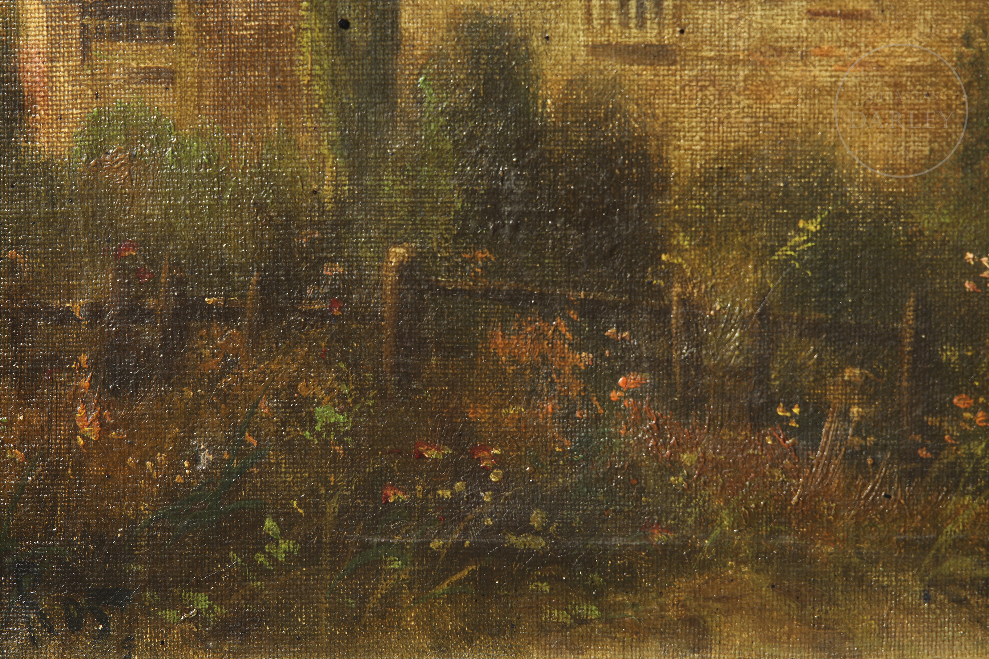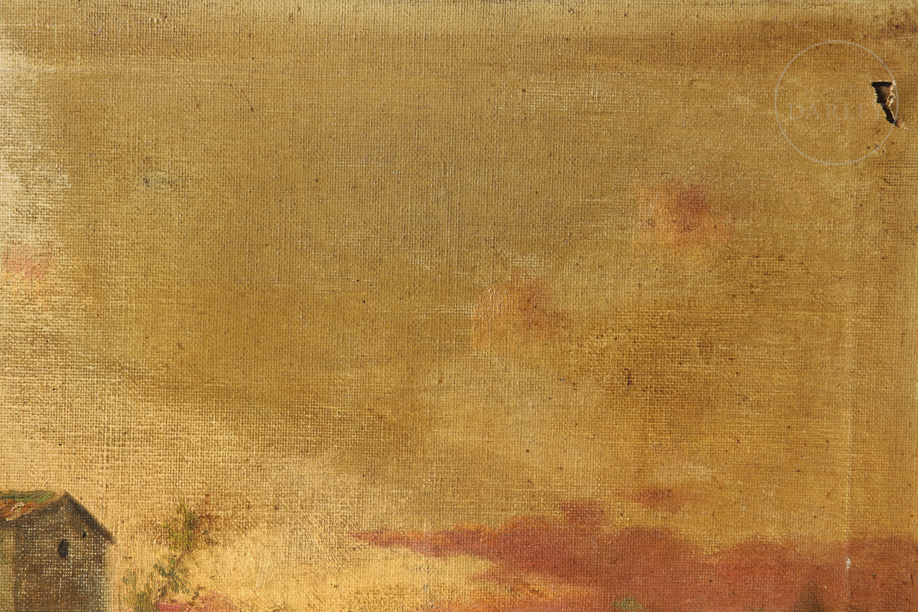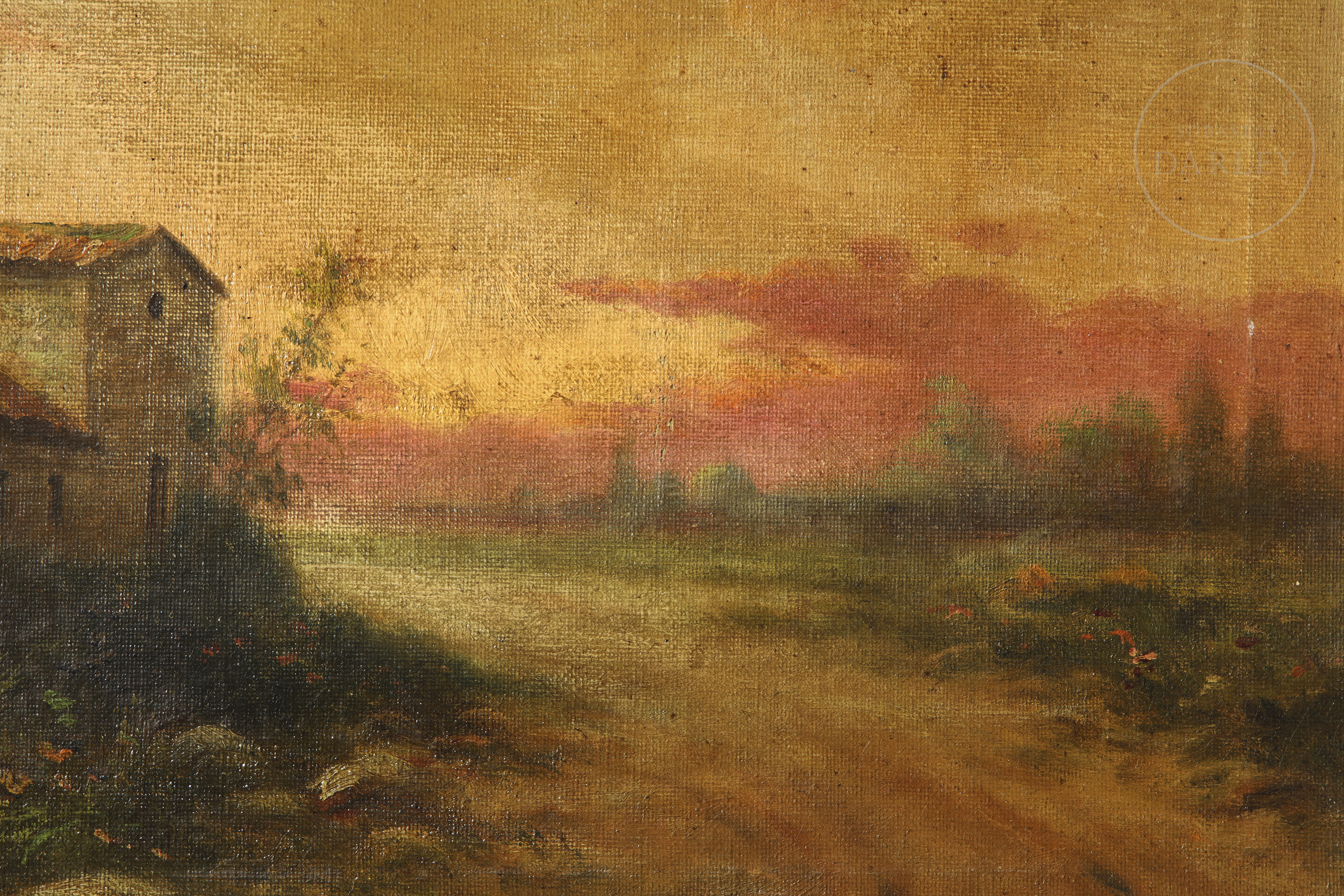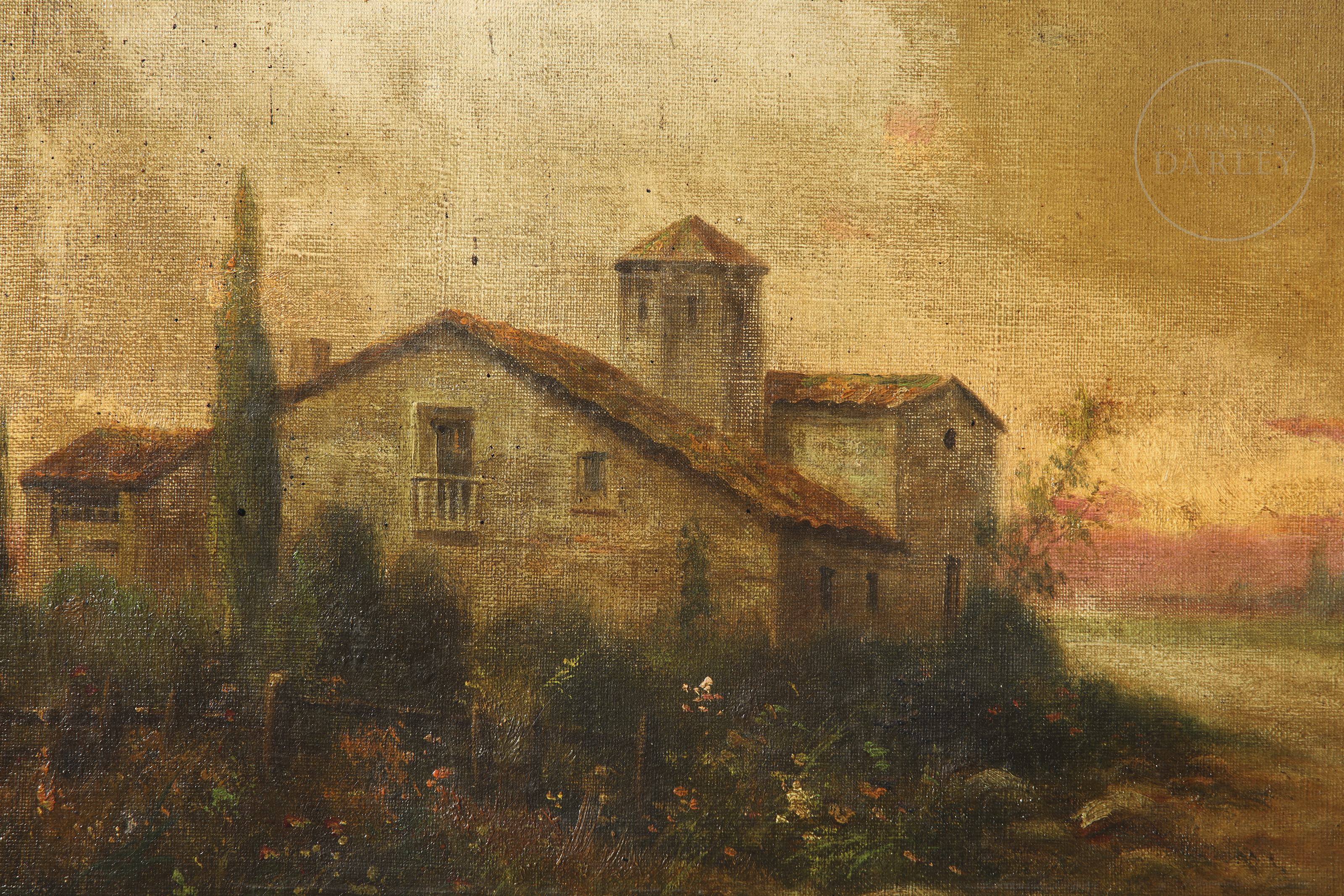 Óleo sobre lienzo. Vista de un camino rural flanqueado por casas y vegetación. Firmado en la esquina inferior izquierda.