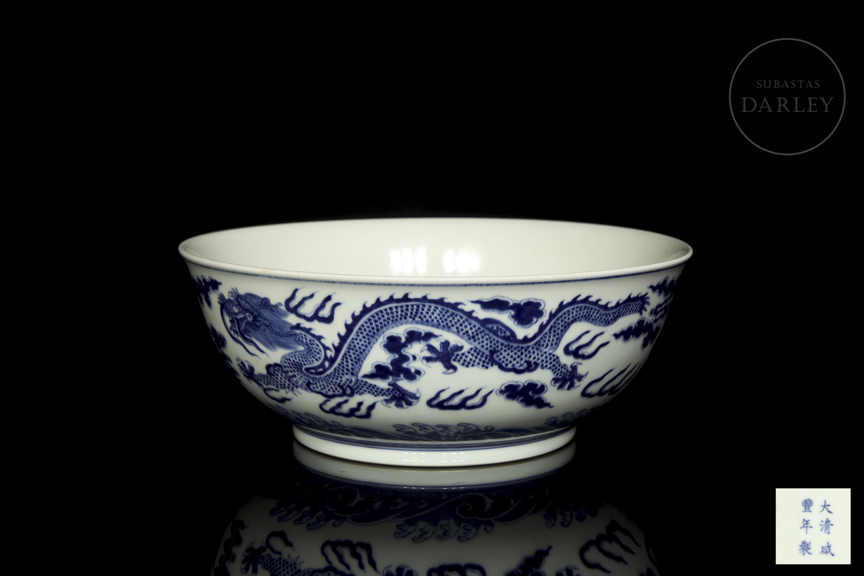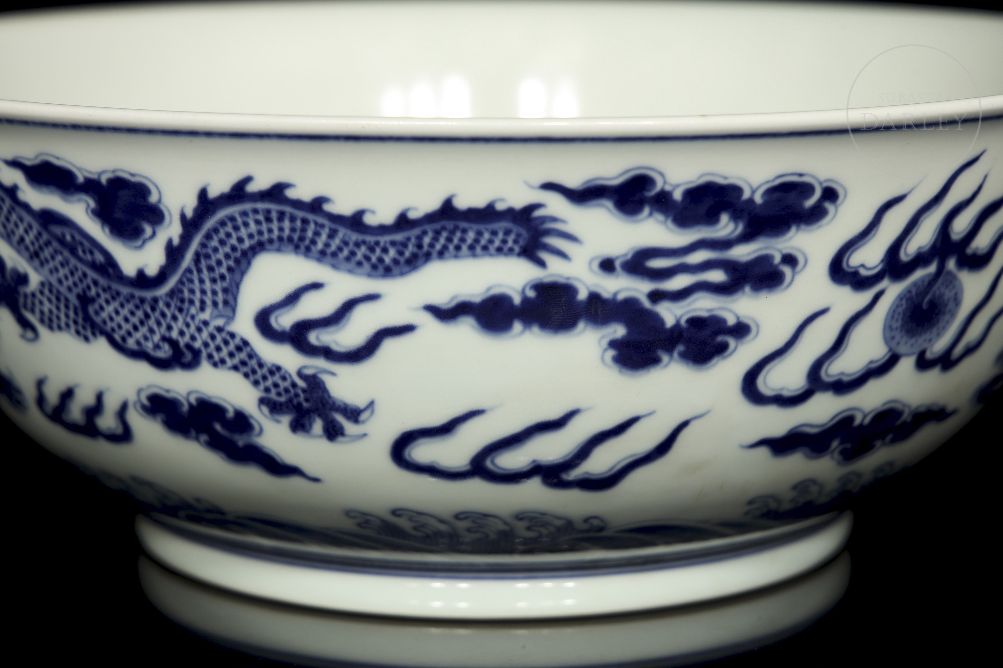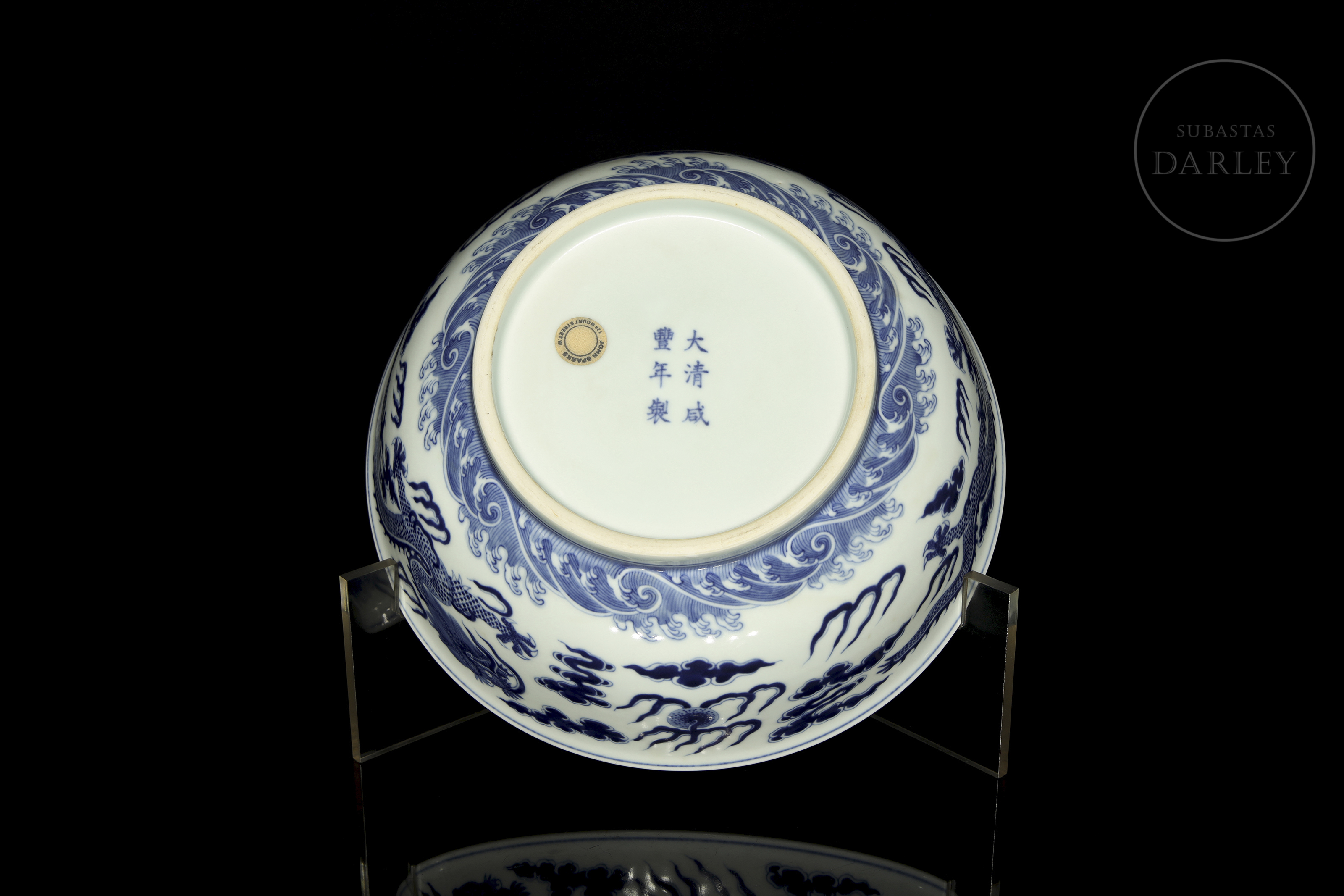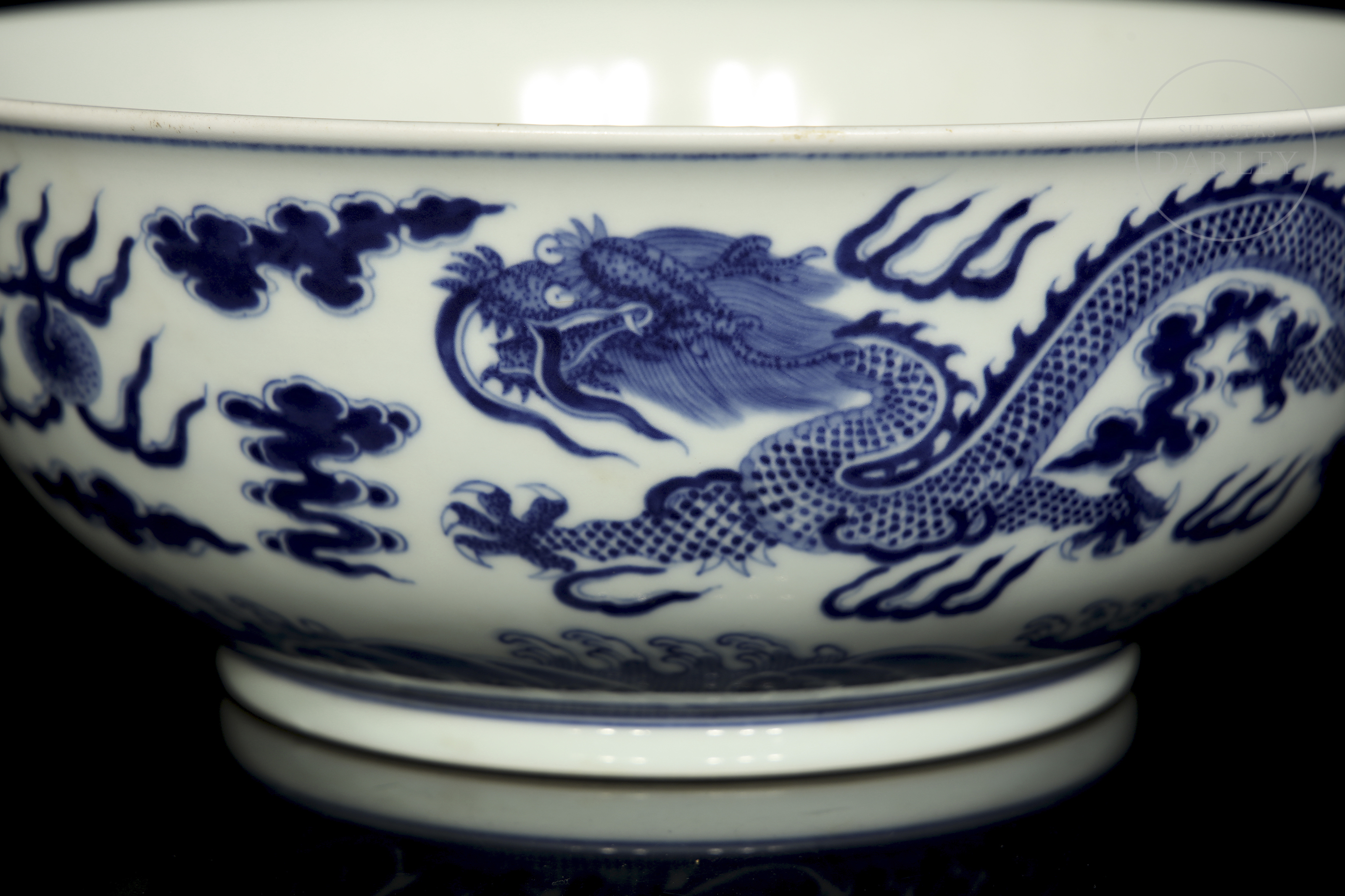 Gran bowl de porcelana esmaltada, de forma redonda y profunda, con paredes curvadas y pie anular. Adornado con dos dragones imperiales de cinco garras que se persiguen entre nubes y llamas, buscando las perlas llameantes sobre la superficie exterior; todo ello realizado en esmalte azul cobalto sobre fondo blanco. En la base se observa el sello "大清咸丰年制" en azul bajo vidriado. Dinastía Qing (1644–1912).
