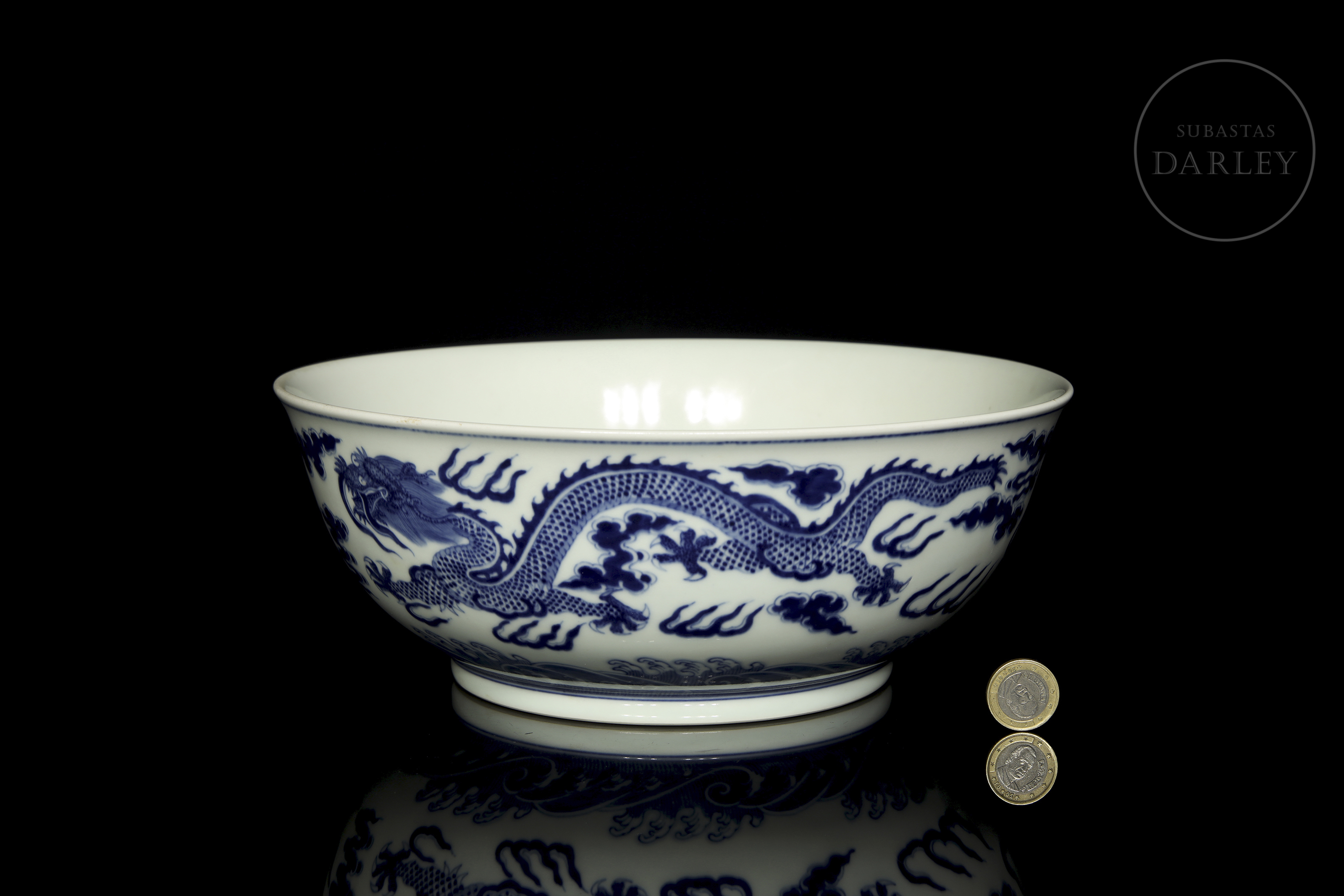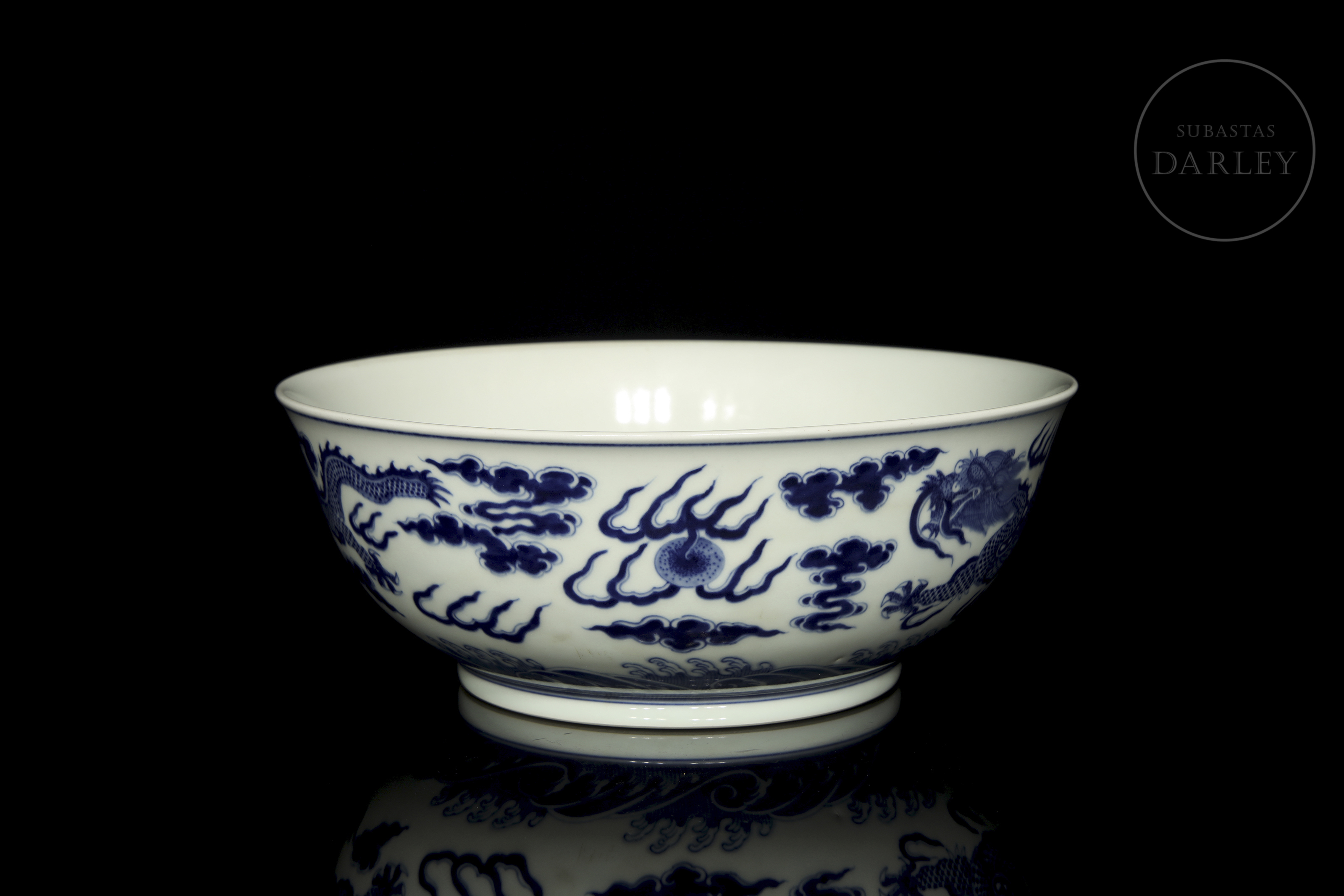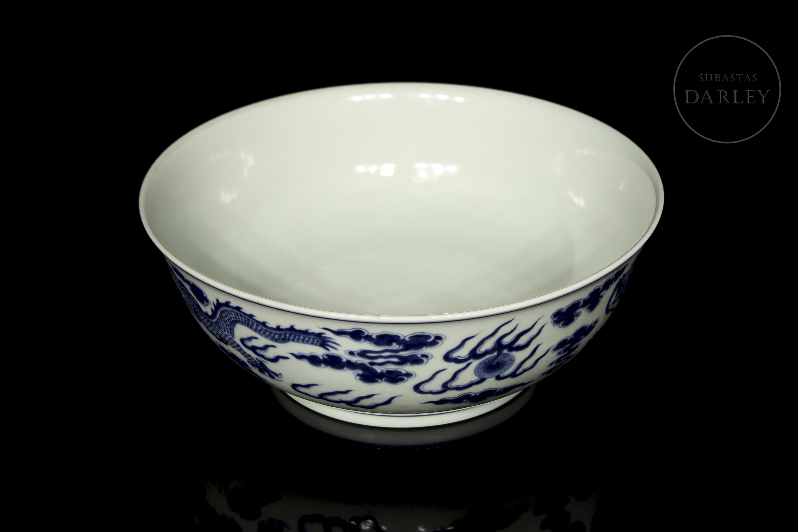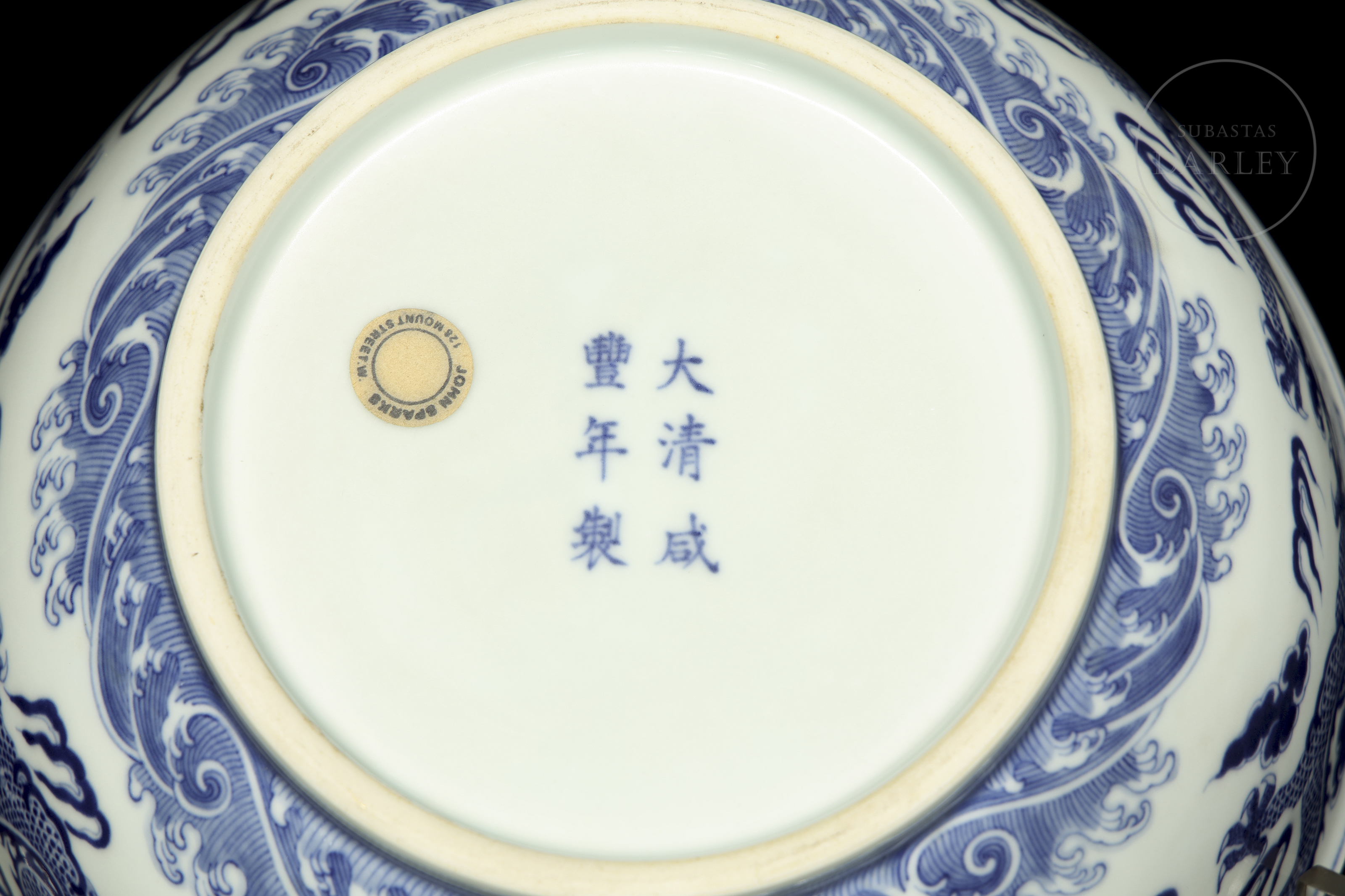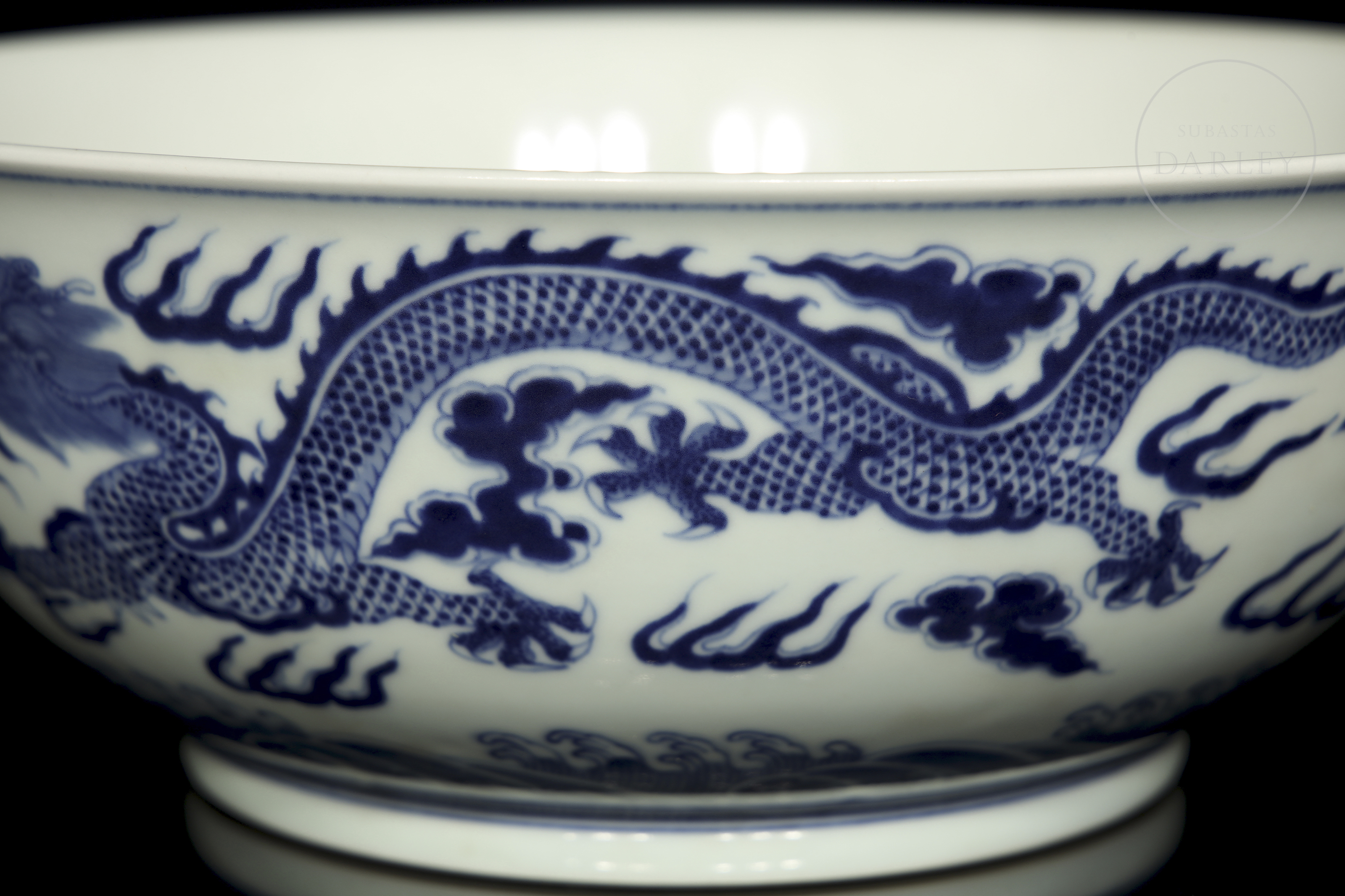 Gran bowl de porcelana esmaltada, de forma redonda y profunda, con paredes curvadas y pie anular. Adornado con dos dragones imperiales de cinco garras que se persiguen entre nubes y llamas, buscando las perlas llameantes sobre la superficie exterior; todo ello realizado en esmalte azul cobalto sobre fondo blanco. En la base se observa el sello "大清咸丰年制" en azul bajo vidriado. Dinastía Qing (1644–1912).