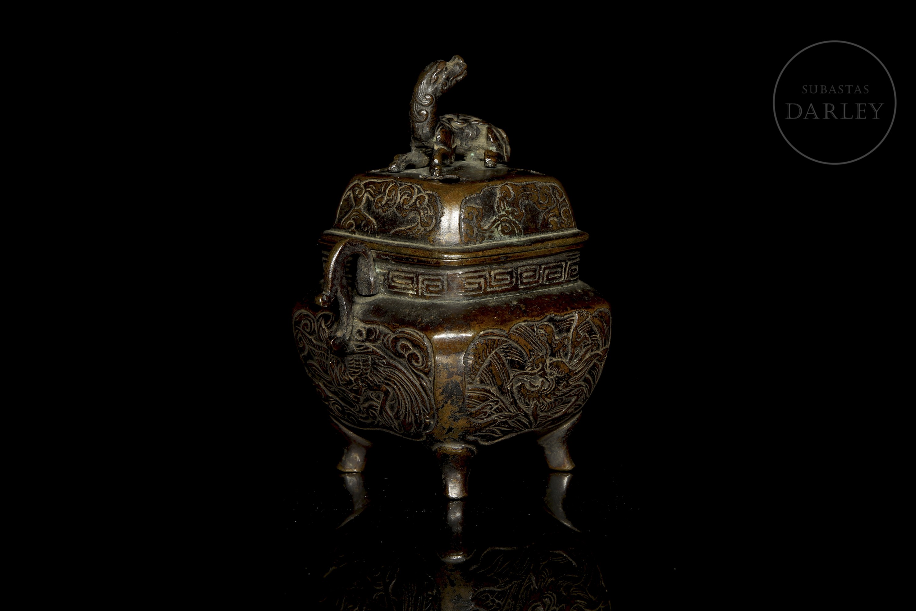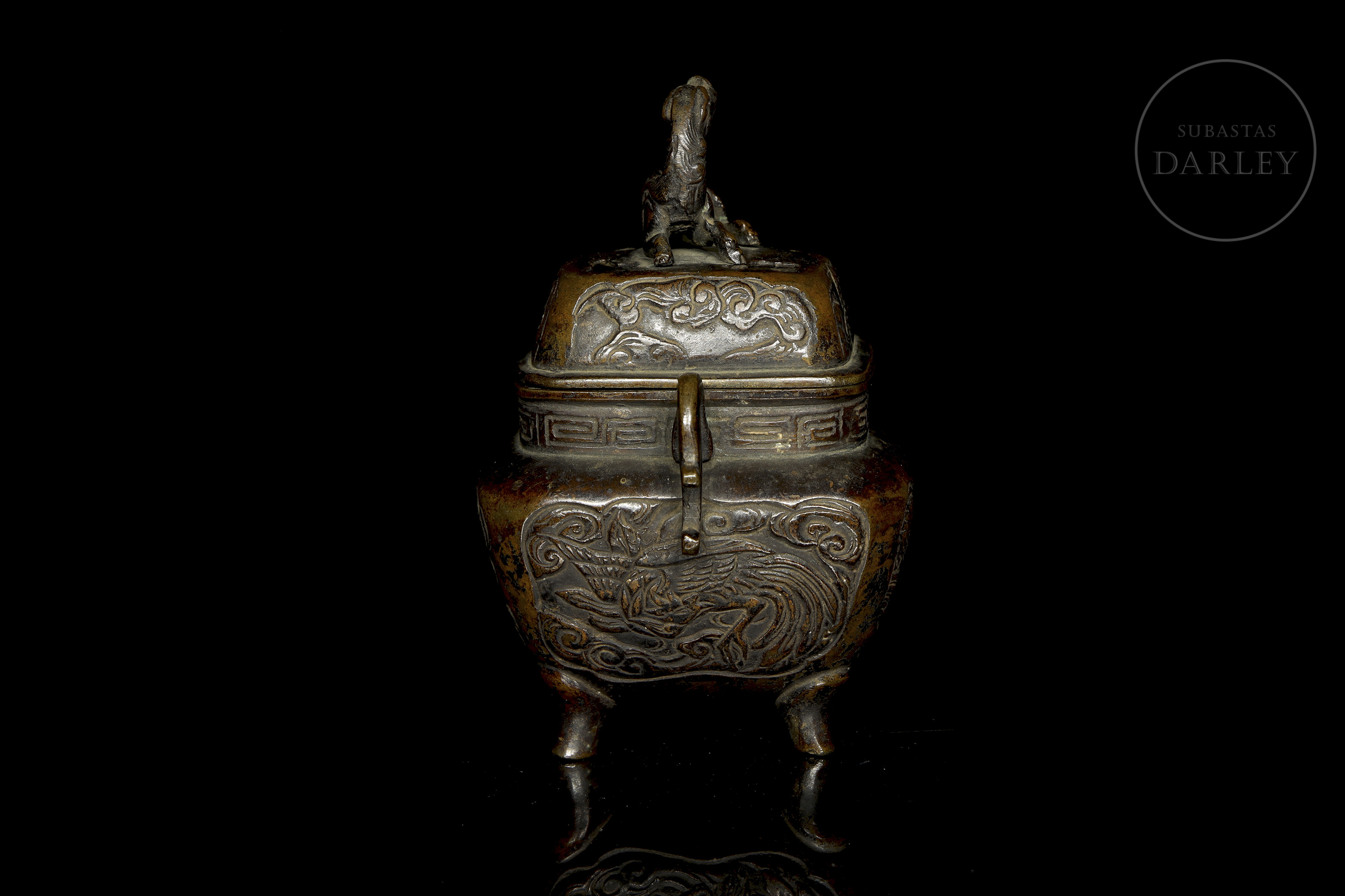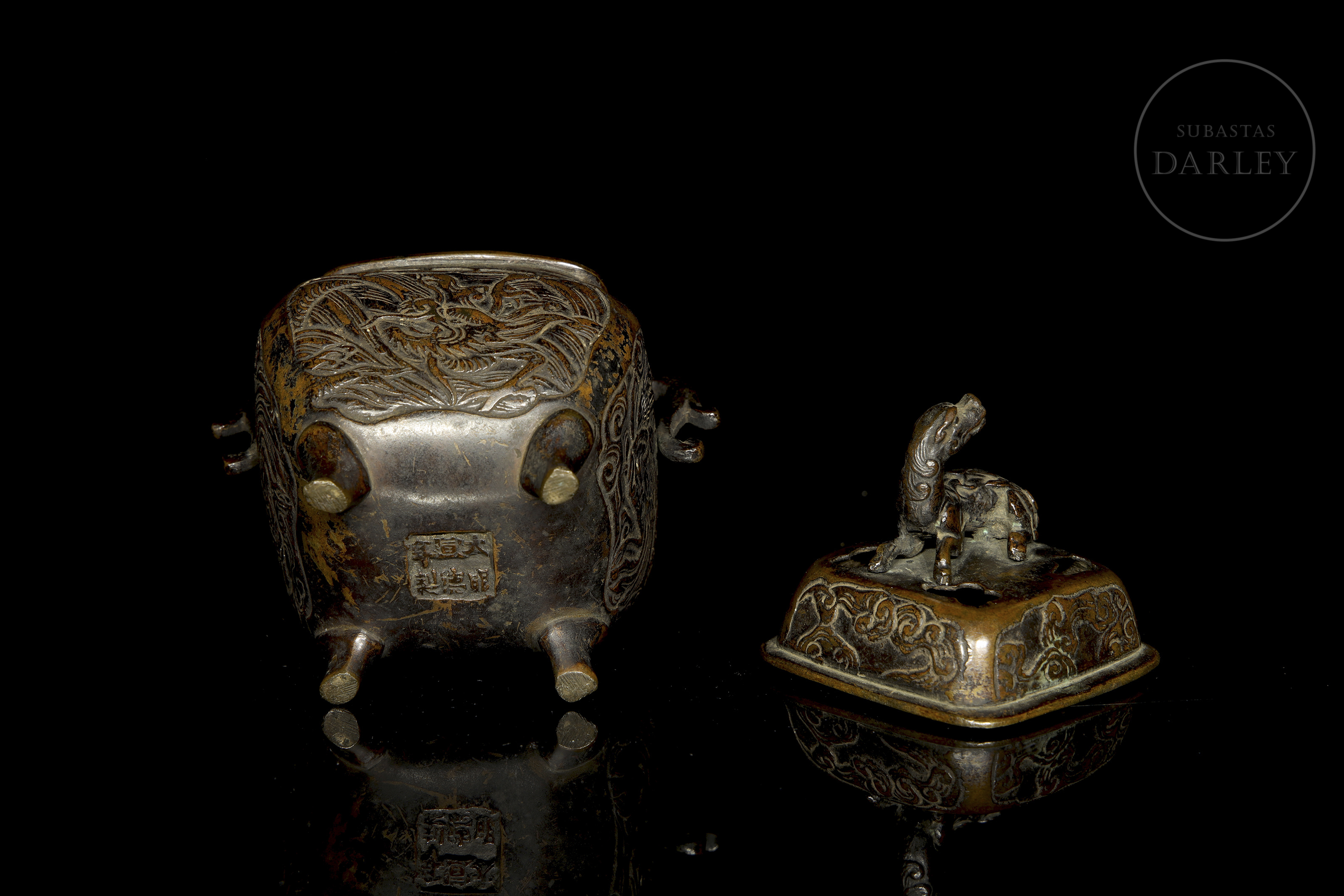Bronce con una pátina oscura. Posee un formato cuadrangular apoyado sobre cuatro patas cabriolé y dos asas laterales. El cuerpo y la tapa están profusamente decorados con escenas de bestias místicas, enmarcadas por bandas de grecas. Rematada por la figura de una bestia mitológica en alerta. En la base se aprecia un sello grabado de cuatro caracteres.