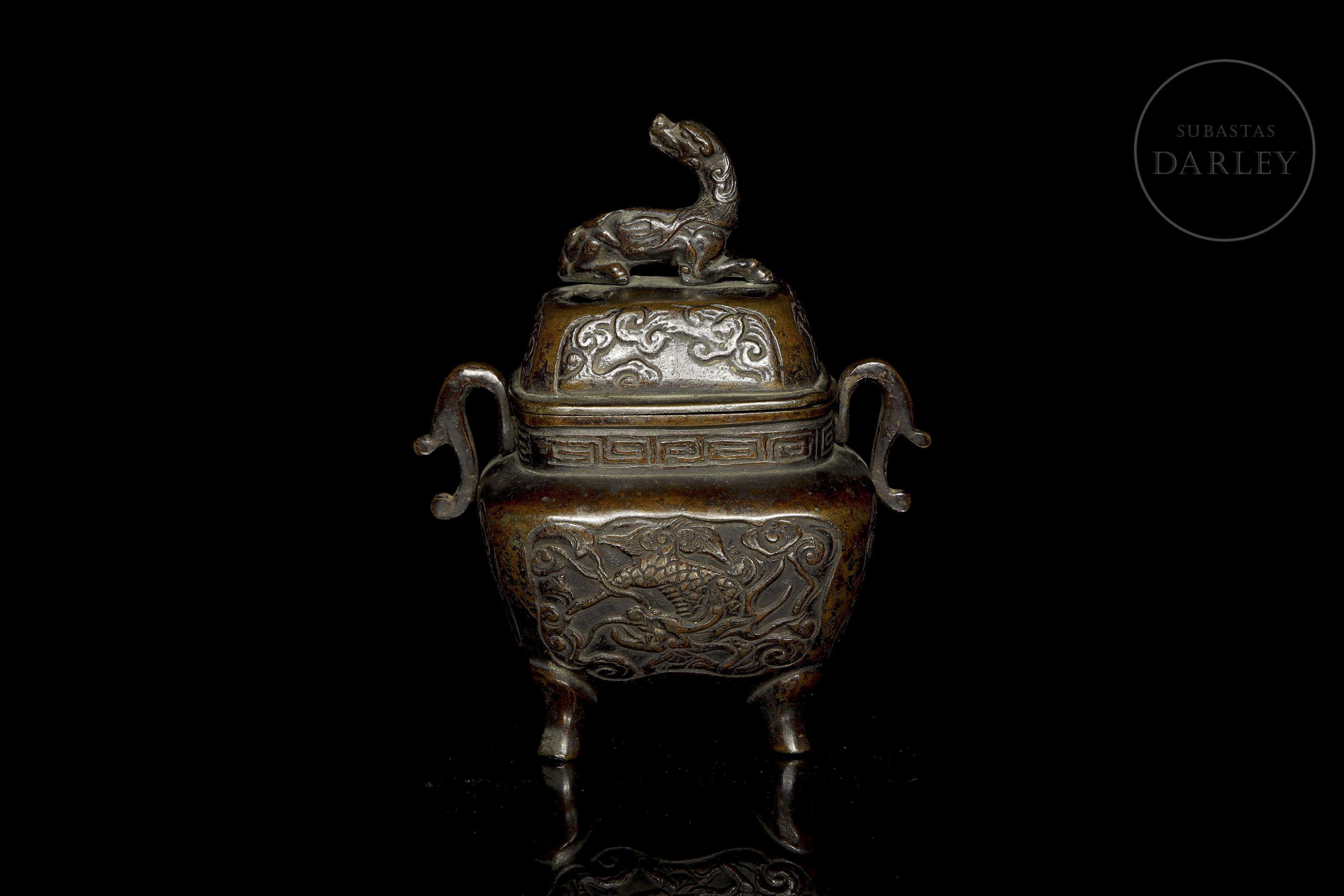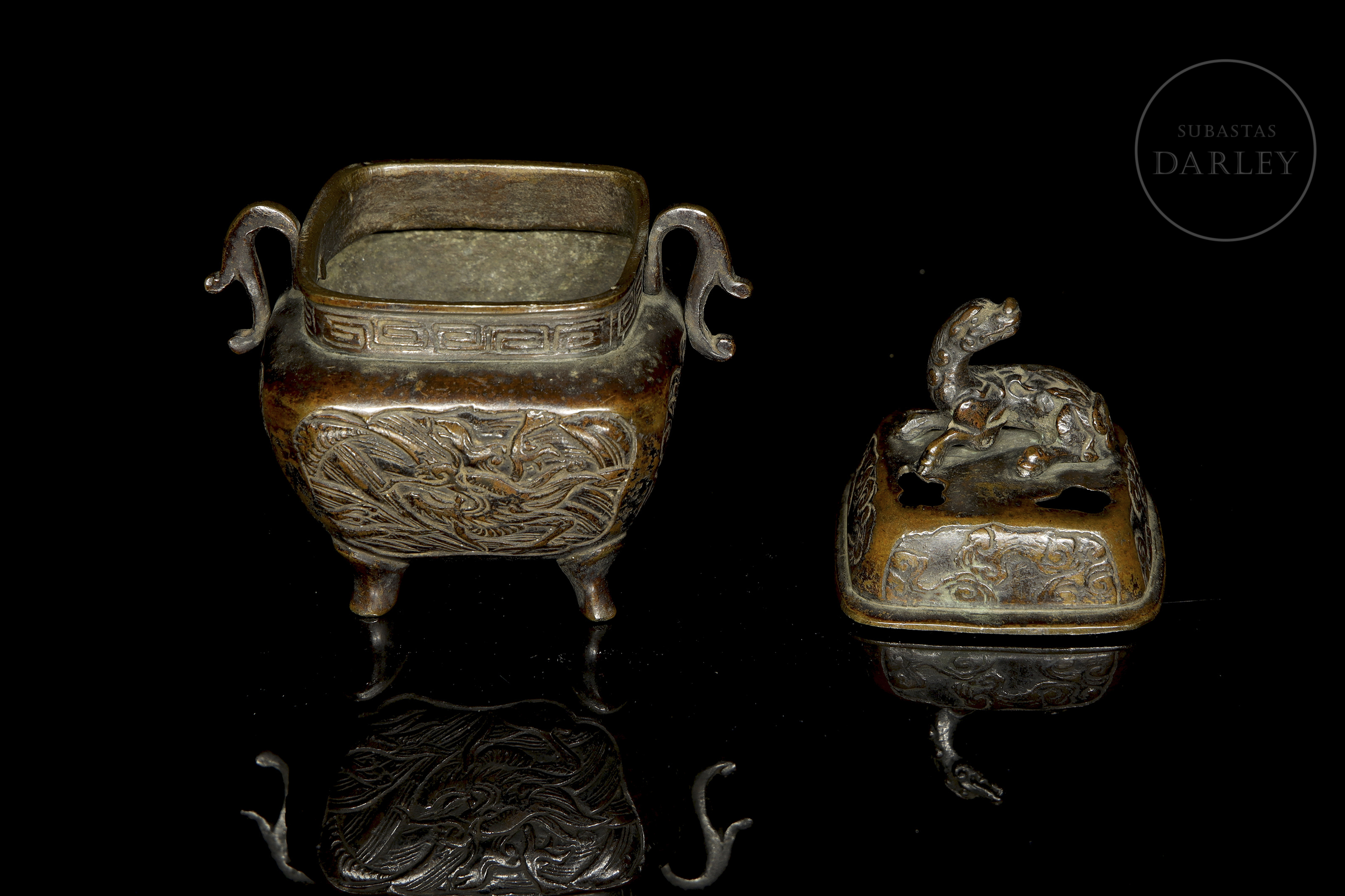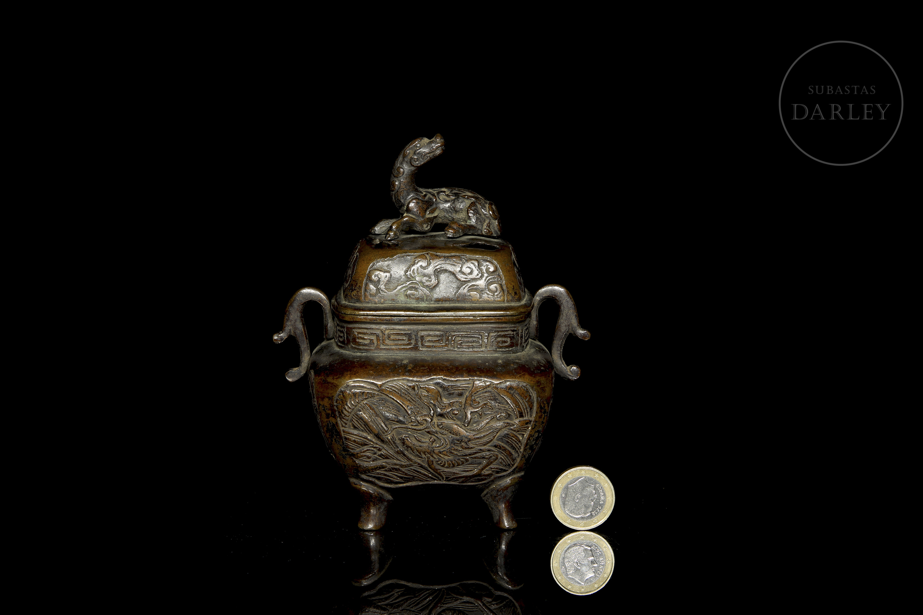 Bronce con una pátina oscura. Posee un formato cuadrangular apoyado sobre cuatro patas cabriolé y dos asas laterales. El cuerpo y la tapa están profusamente decorados con escenas de bestias místicas, enmarcadas por bandas de grecas. Rematada por la figura de una bestia mitológica en alerta. En la base se aprecia un sello grabado de cuatro caracteres.