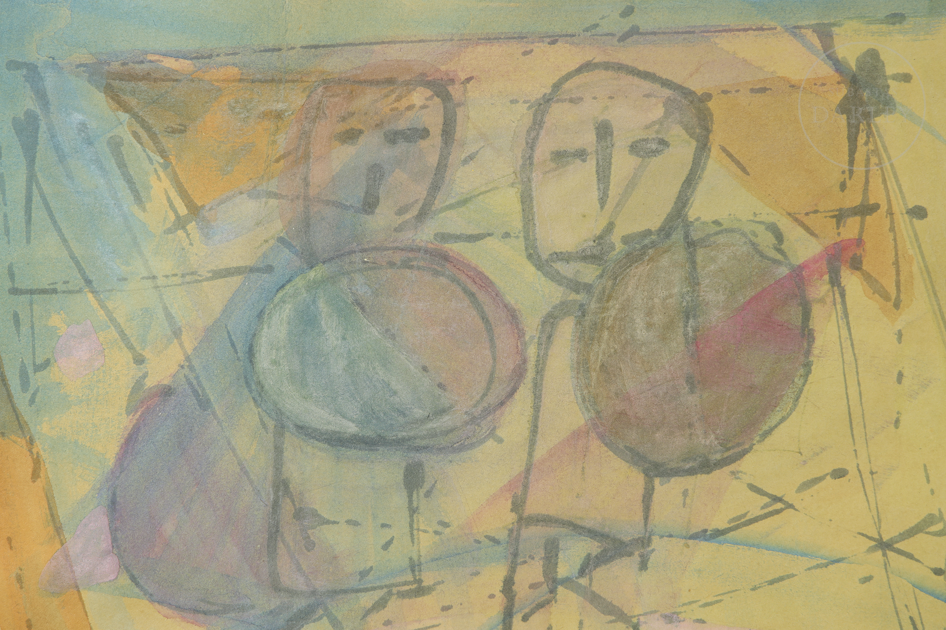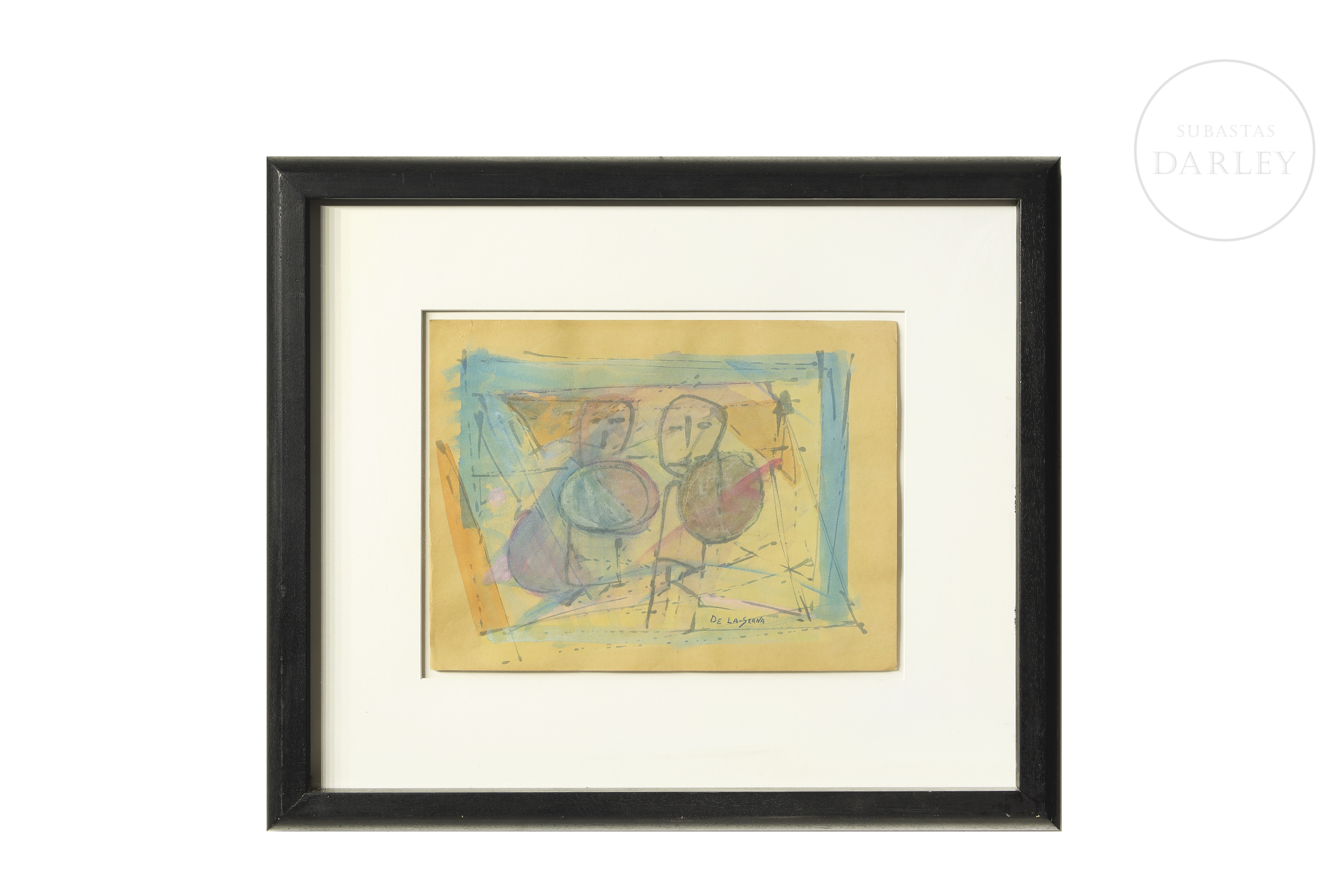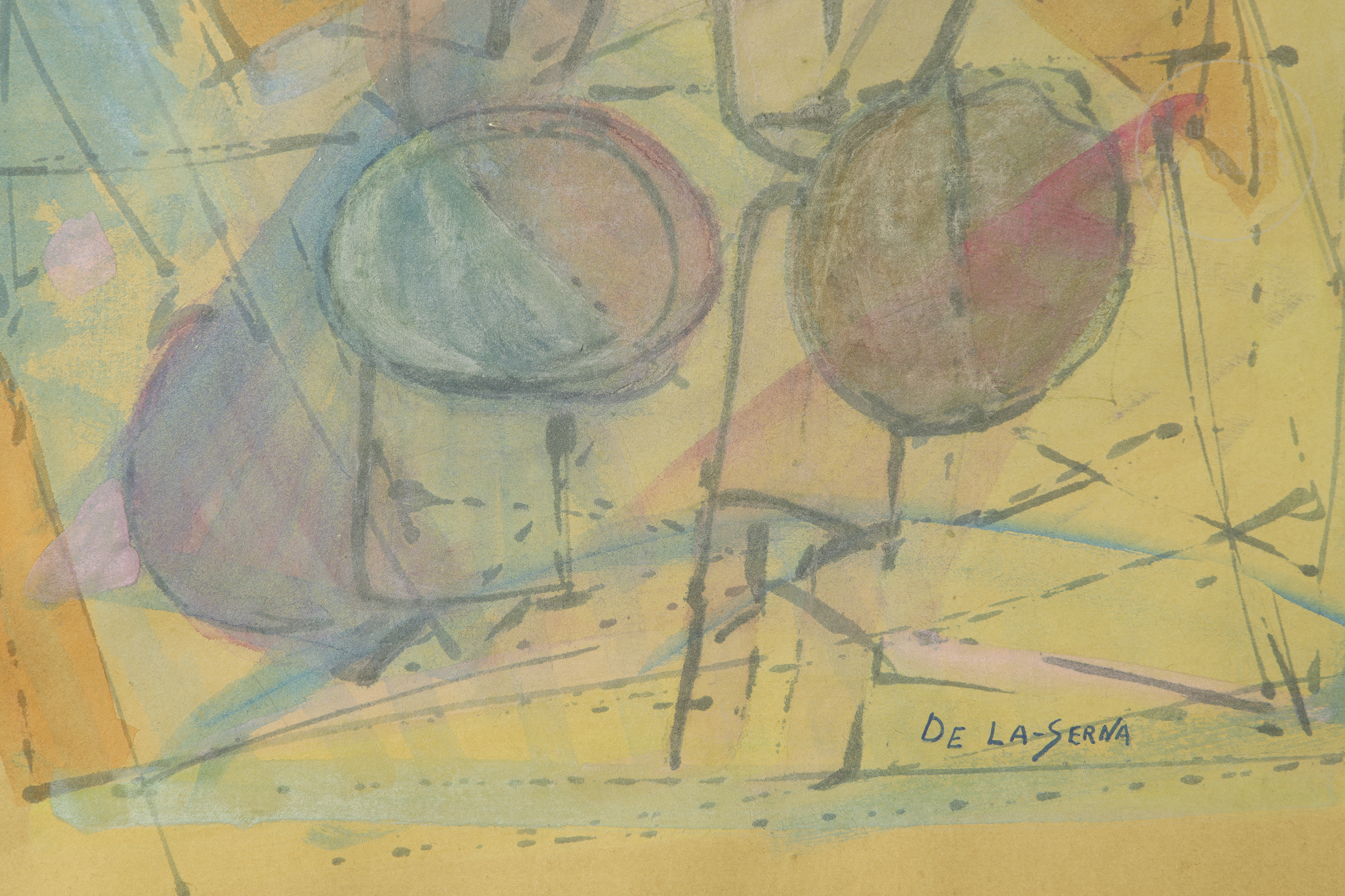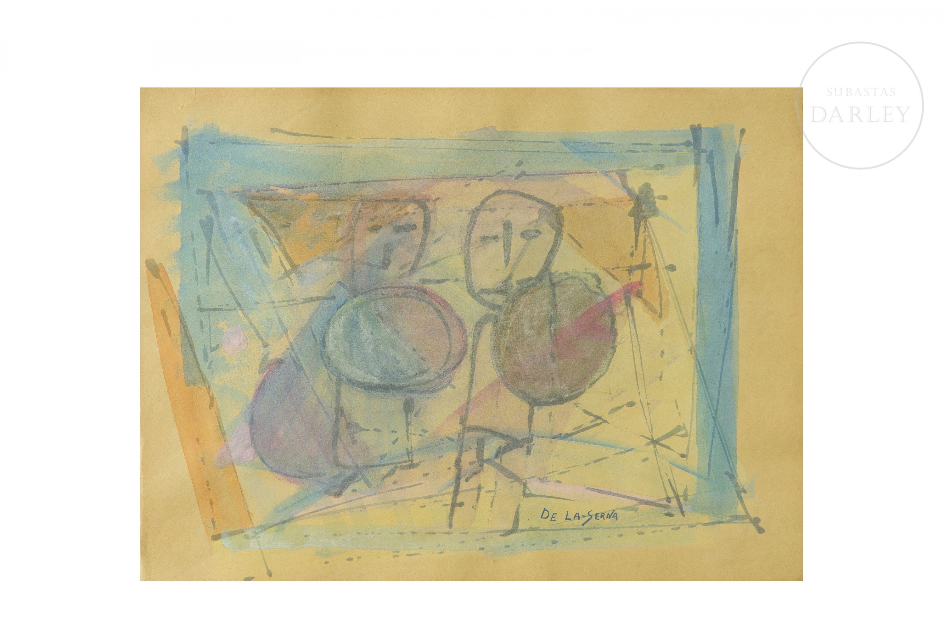 Técnica mixta (acuarela y tinta) sobre papel. Composición de vanguardia que representa dos figuras esquemáticas o máscaras. La obra combina el dibujo lineal con manchas de acuarela. Firmado "DE LA-SERNA" en la esquina inferior derecha.