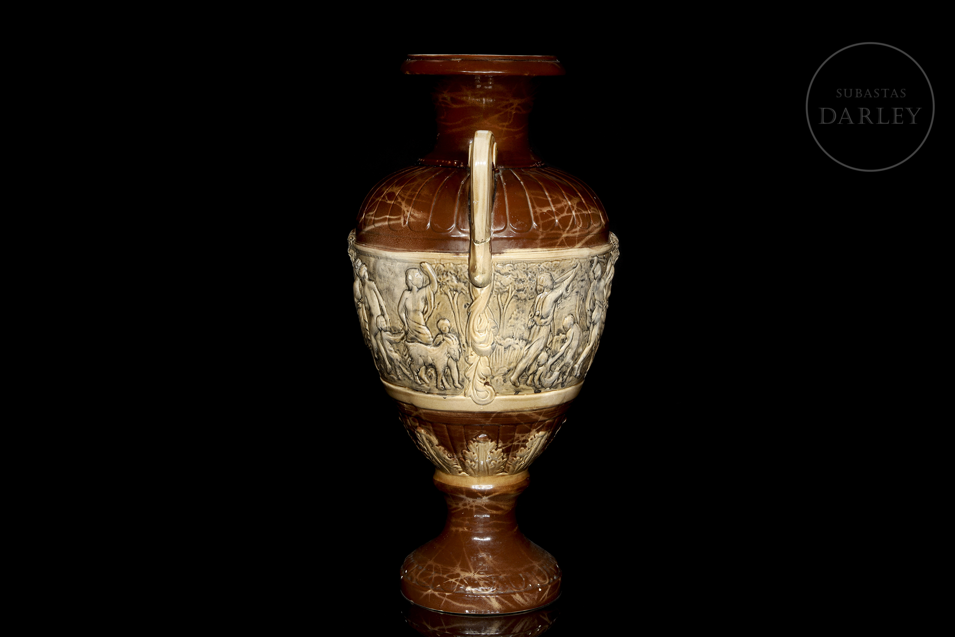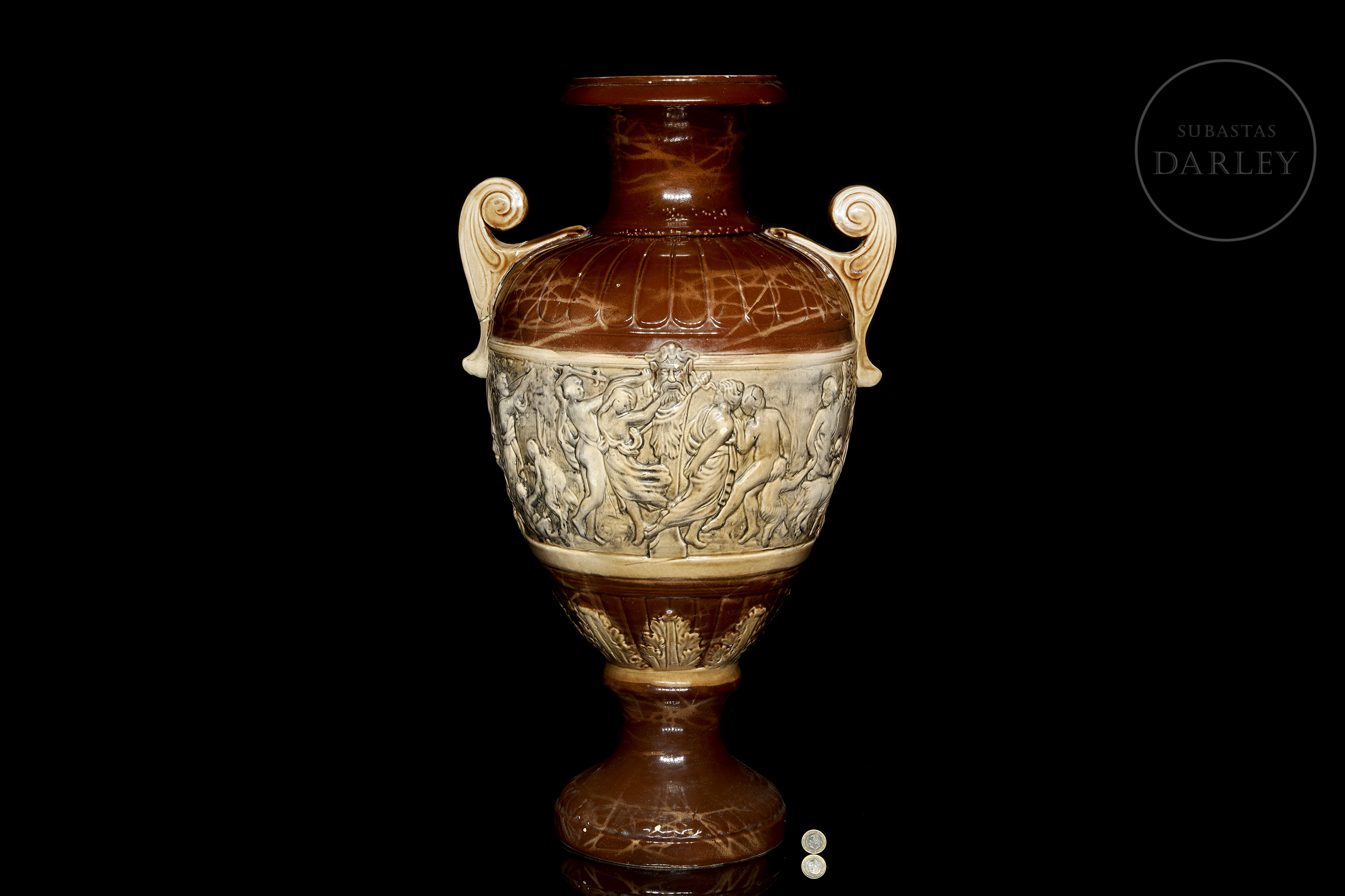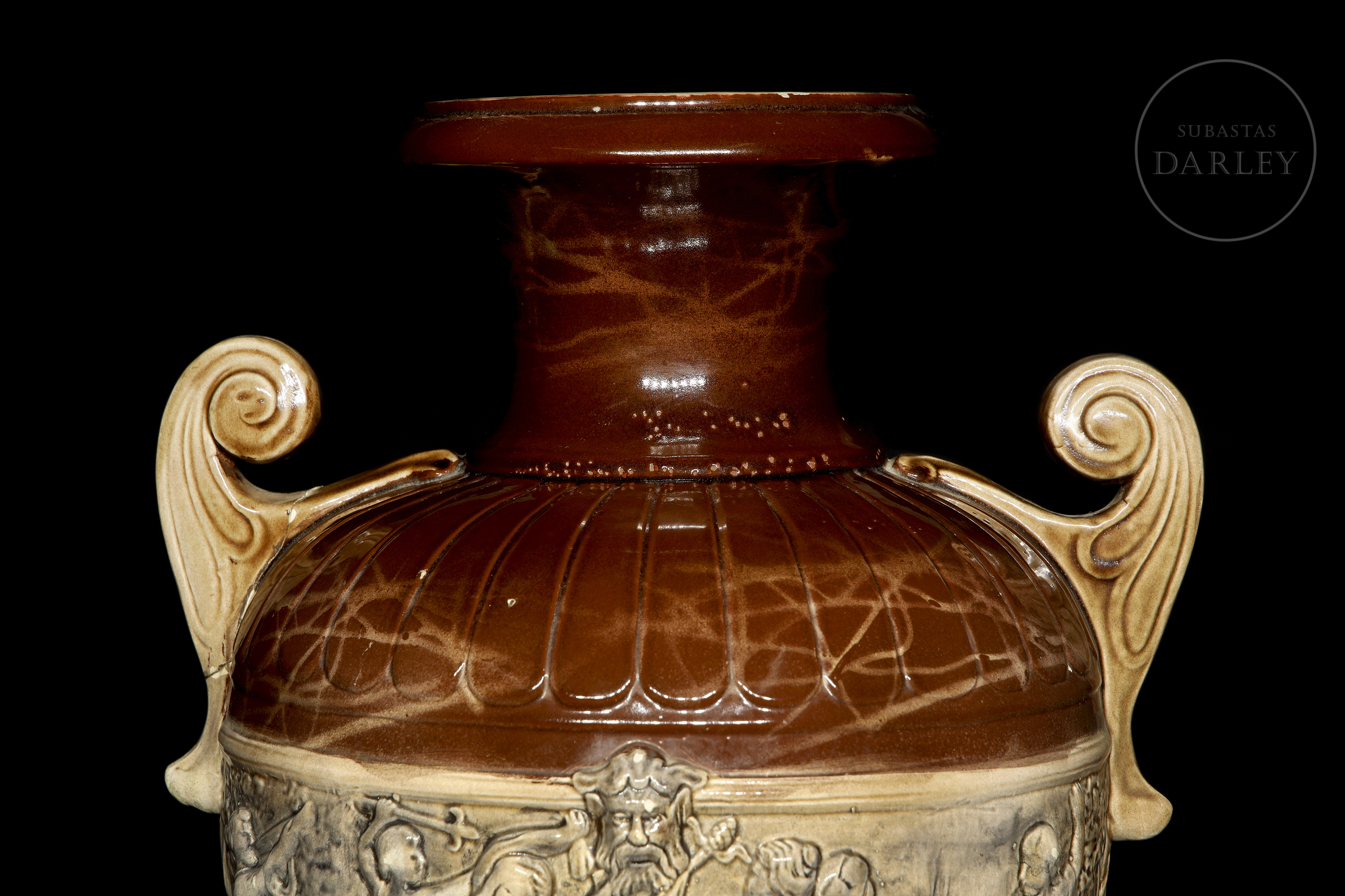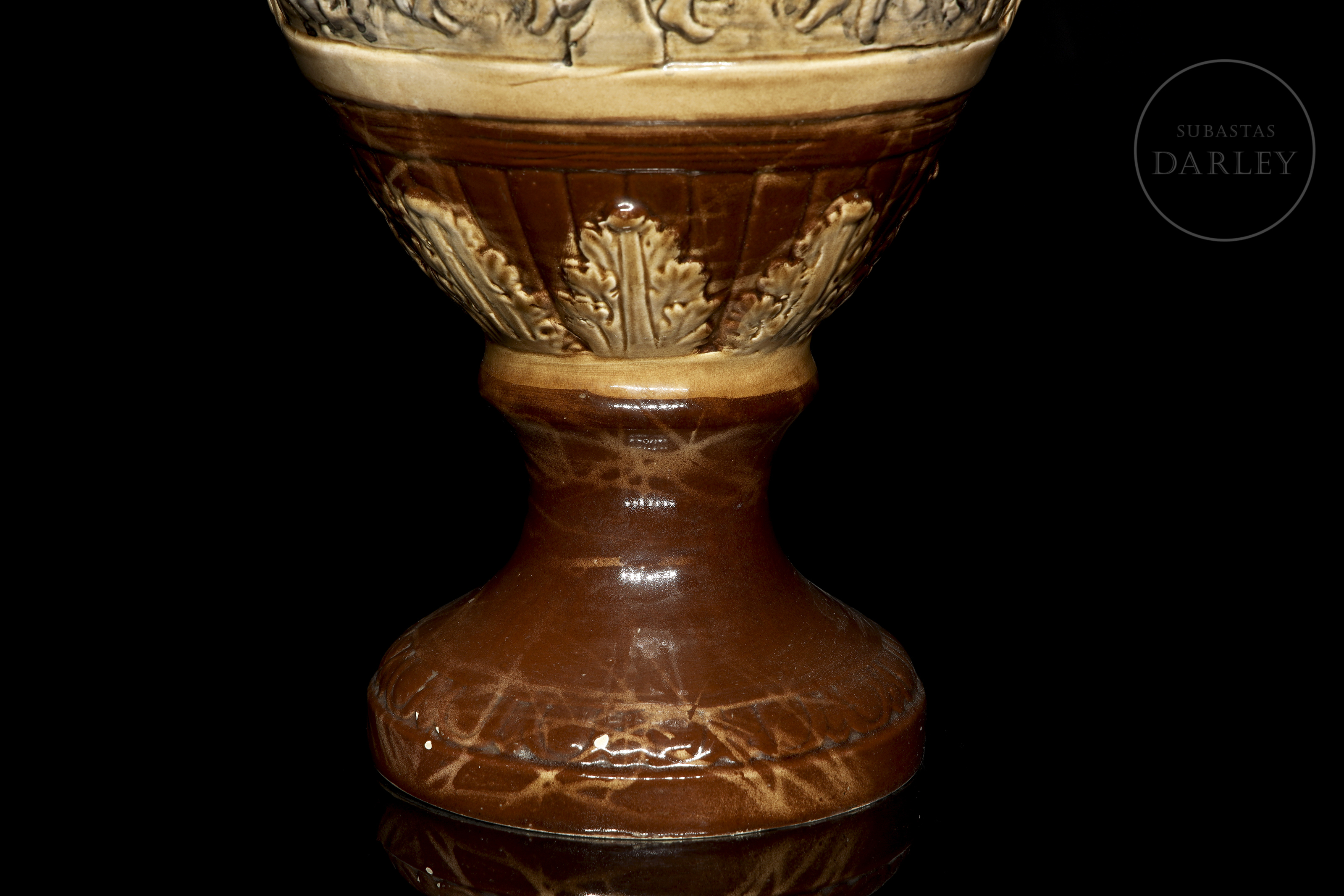 Jarrón de cuerpo ovoidal sobre pedestal circular, decorado en relieve con escena báquica en friso continuo. Superficie vidriada en tonos marrón y crema, con asas laterales en voluta. Presenta restauraciones.