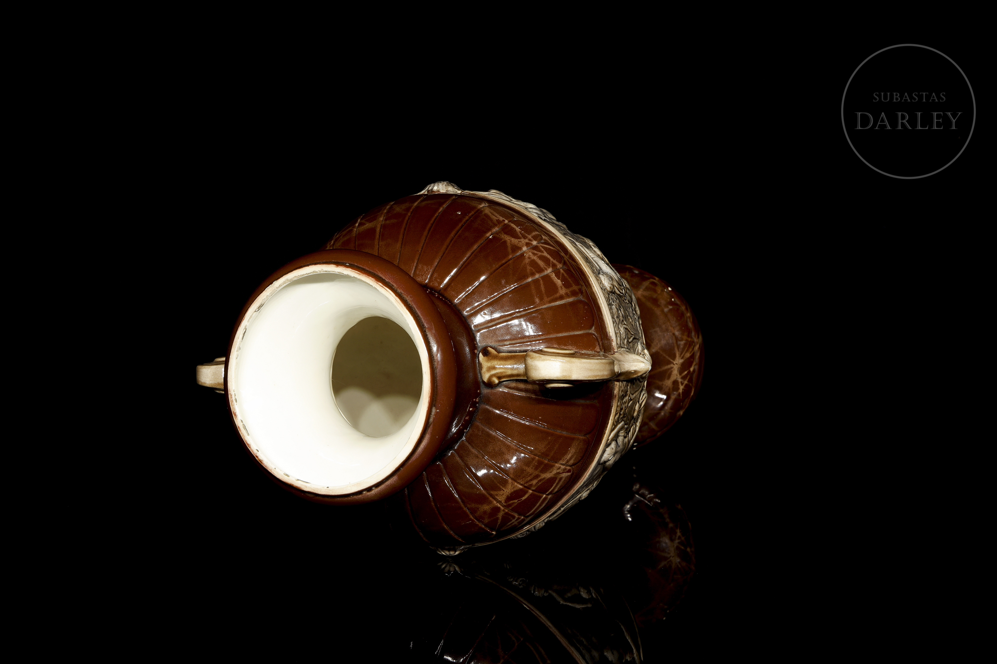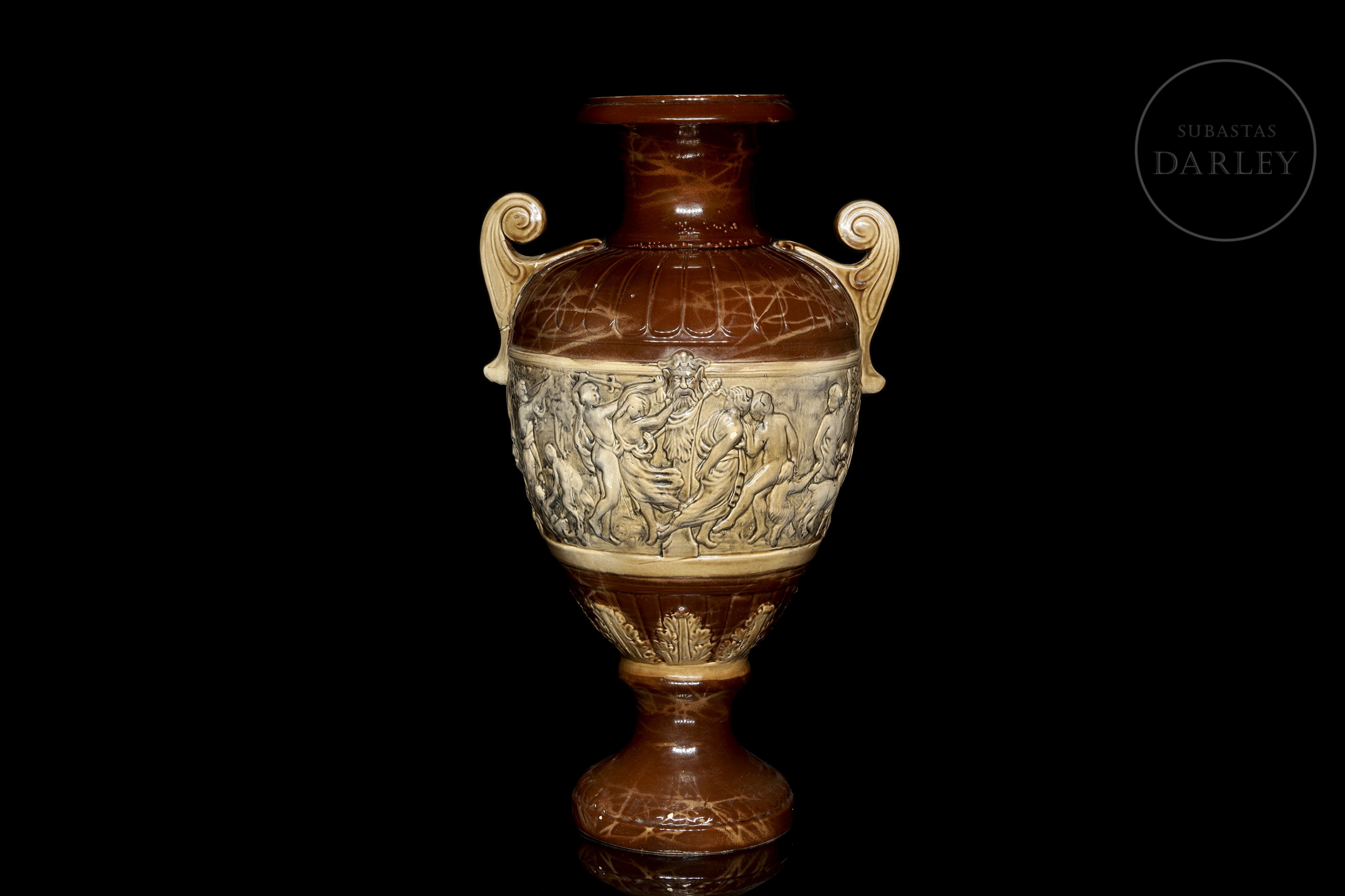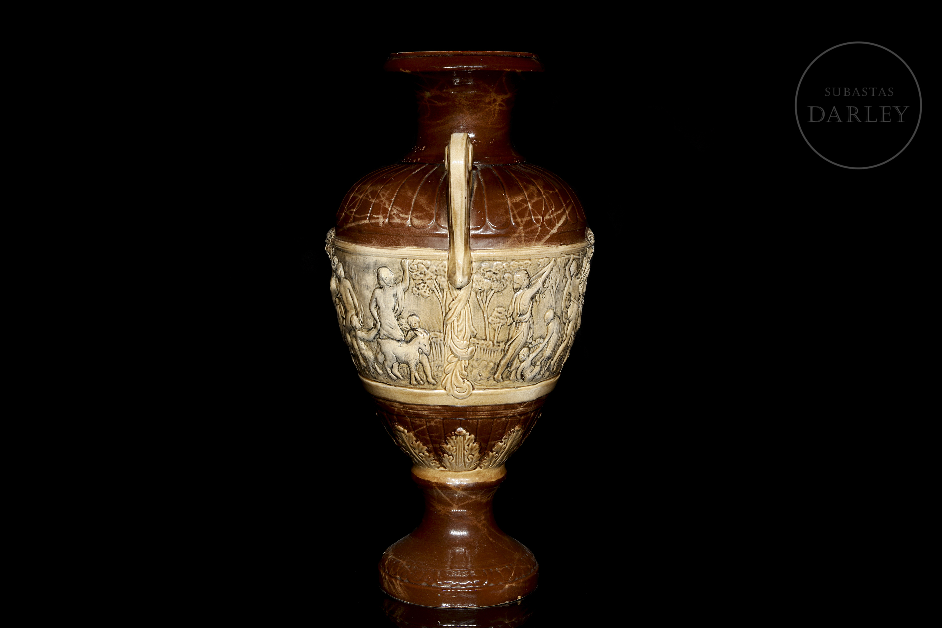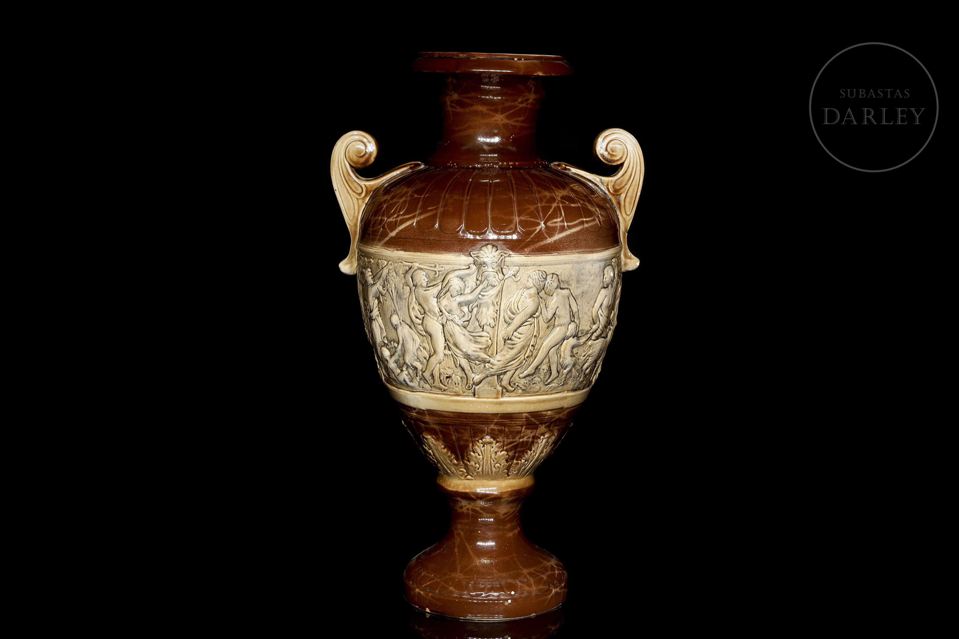 Jarrón de cuerpo ovoidal sobre pedestal circular, decorado en relieve con escena báquica en friso continuo. Superficie vidriada en tonos marrón y crema, con asas laterales en voluta. Presenta restauraciones.