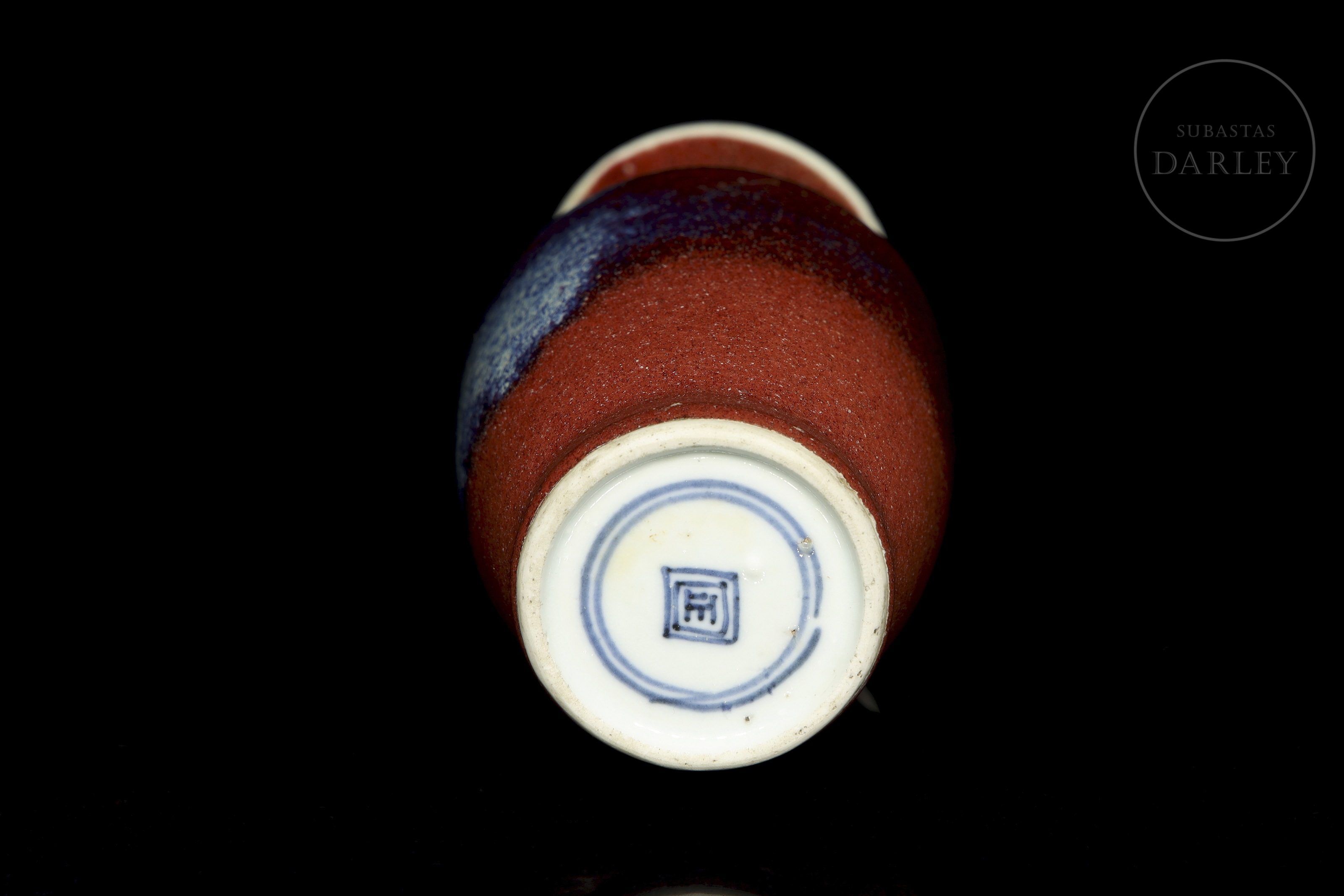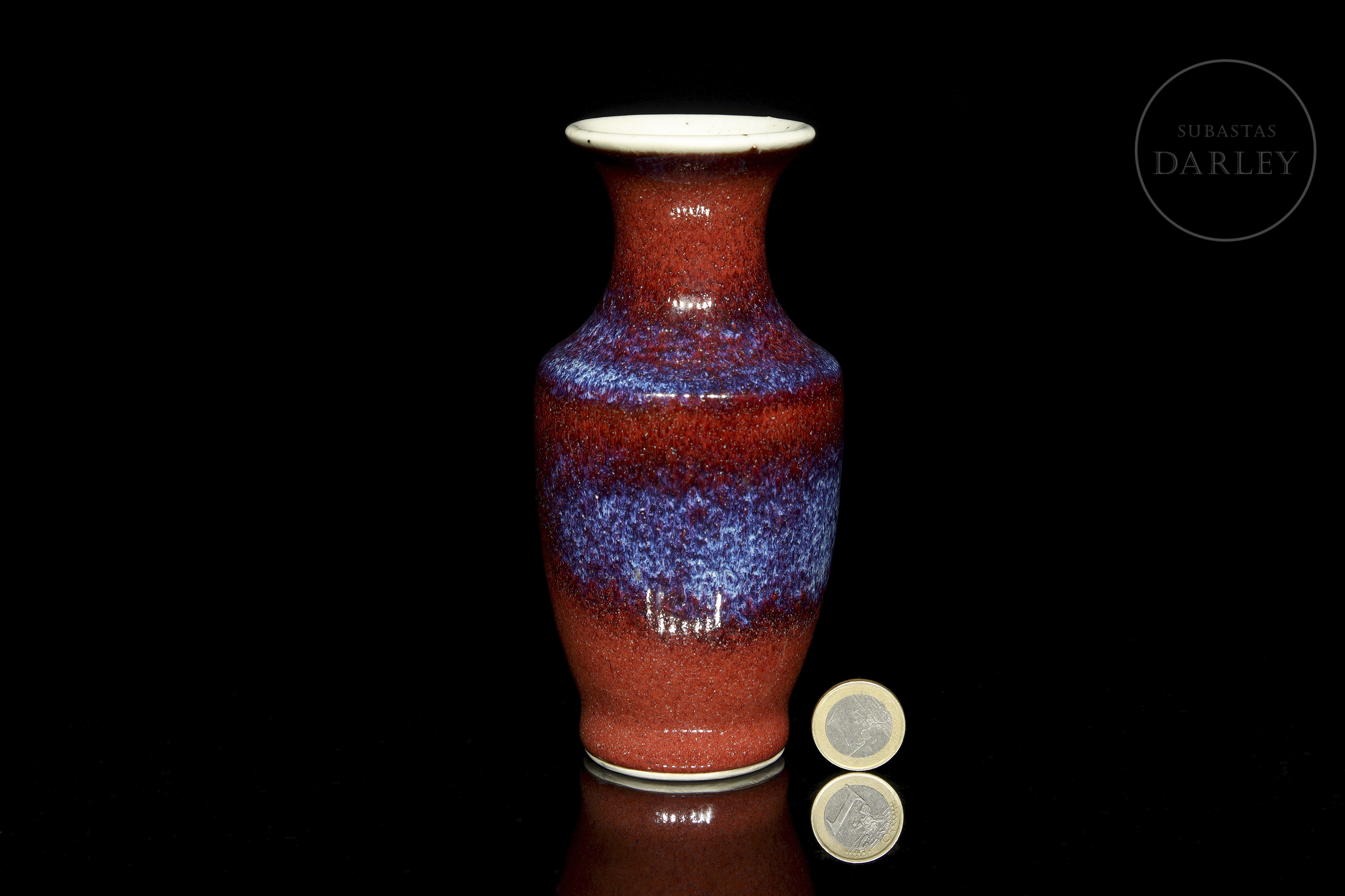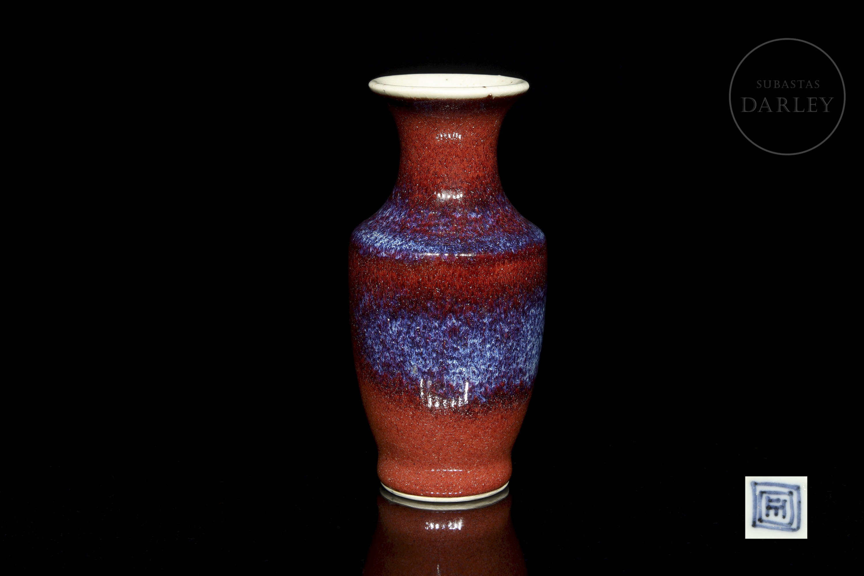 Pequeño jarrón de porcelana, de base circular, cuerpo abalaustrado y boca abocinada. El cuerpo está cubierto por un vidriado, que combina esmaltes en rojo intenso y azul. En la base se encuentra un doble anillo azul bajo vidriado y una marca. Dinastía Qing (1644-1912) o posterior.