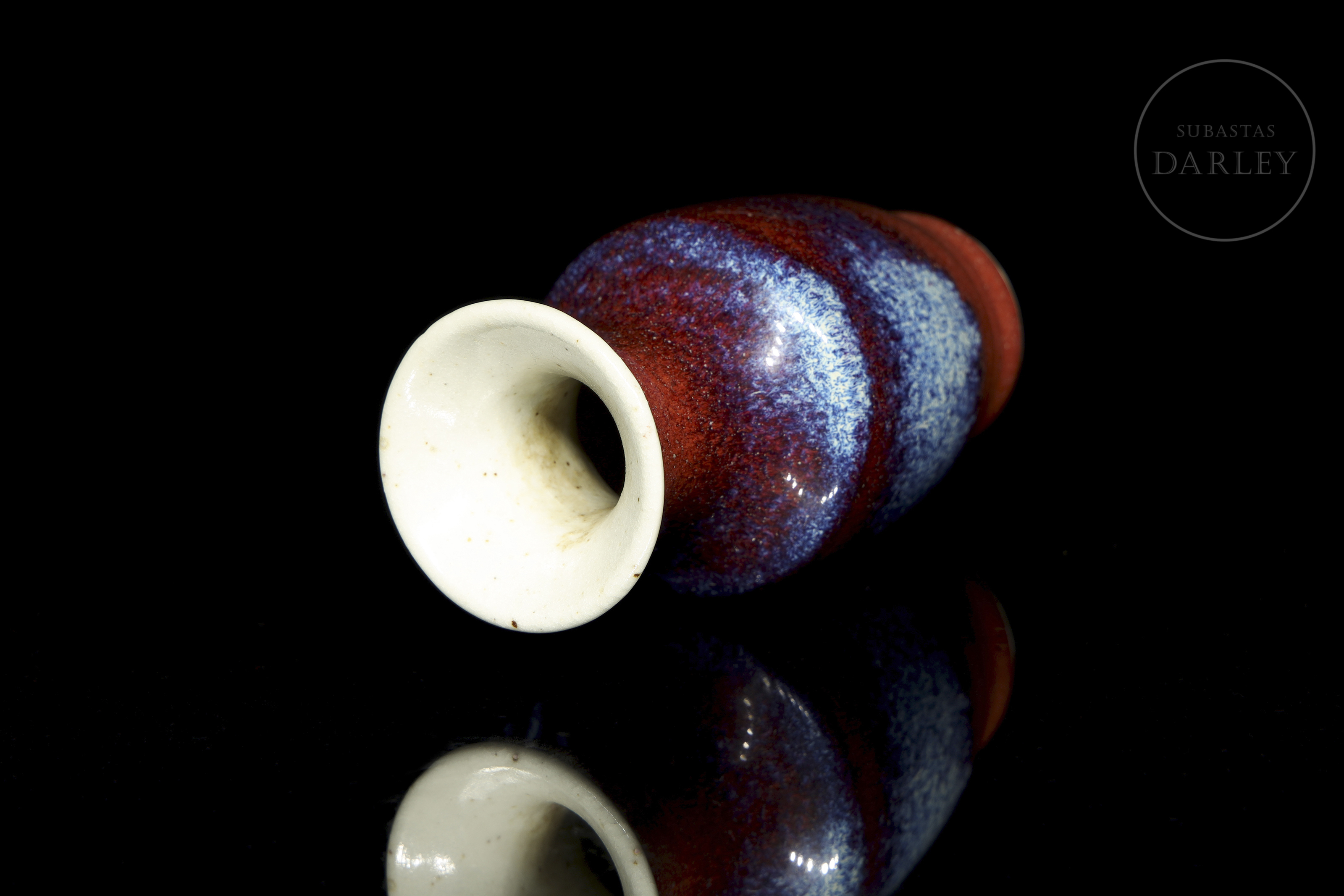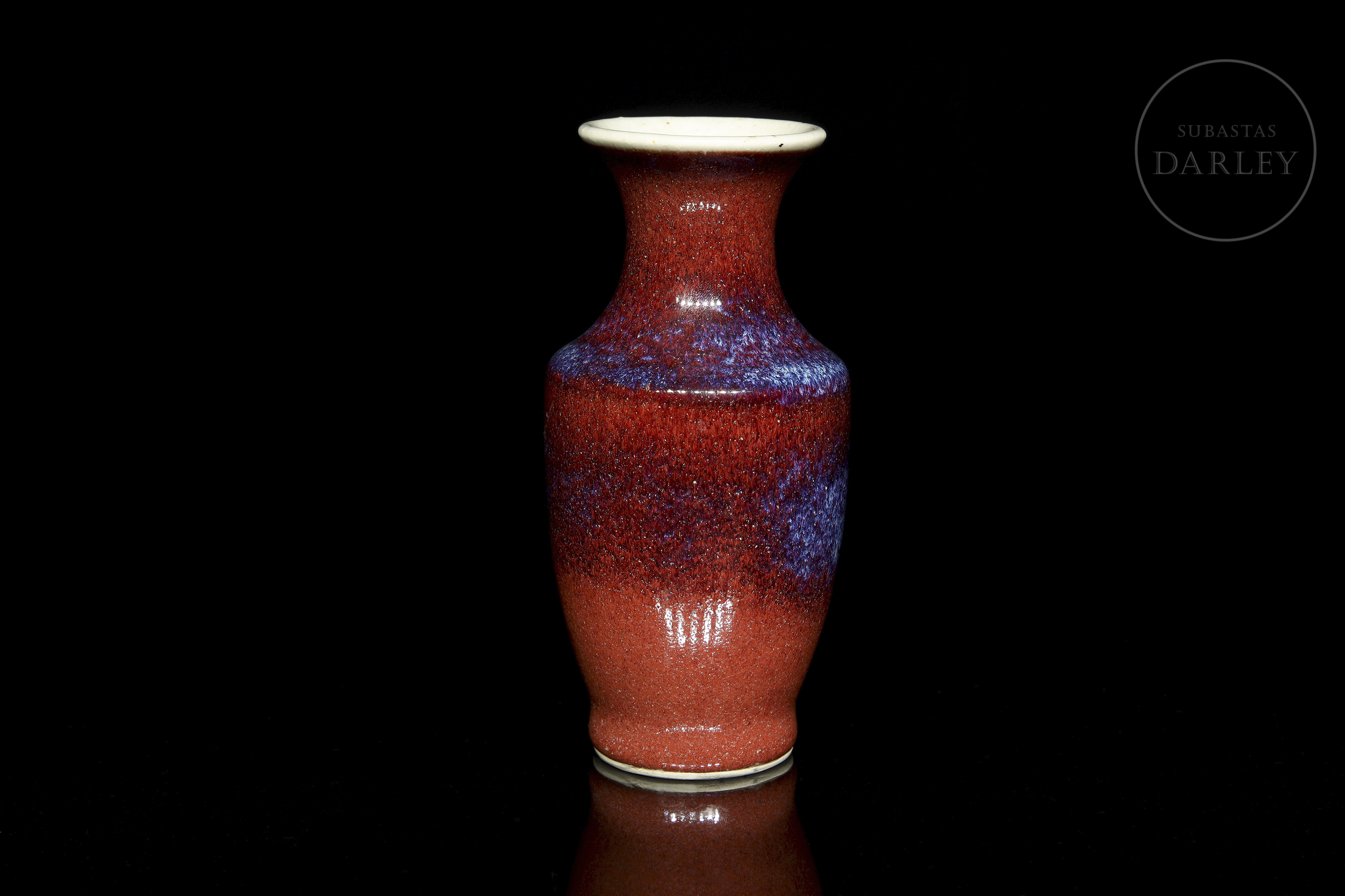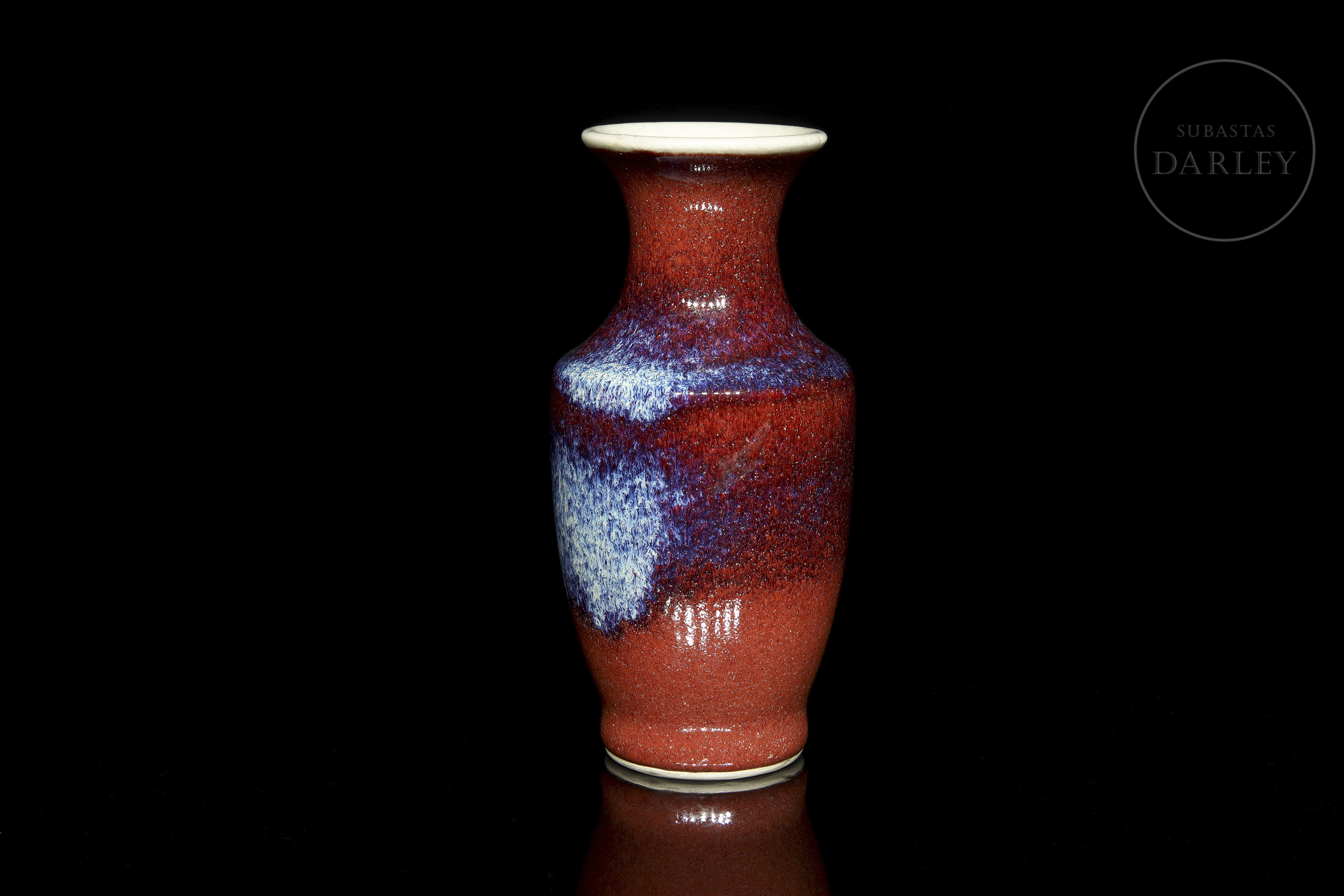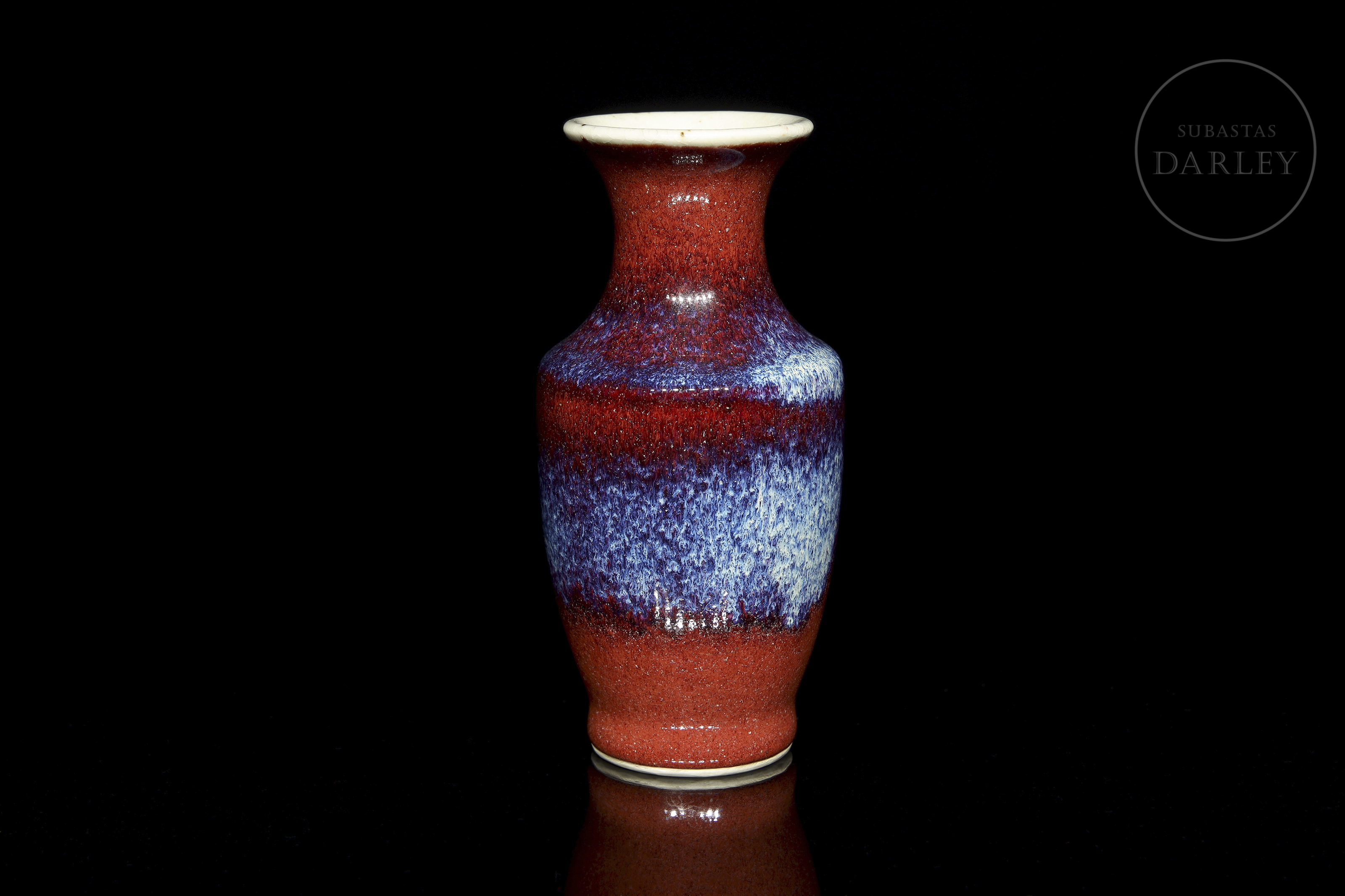 Pequeño jarrón de porcelana, de base circular, cuerpo abalaustrado y boca abocinada. El cuerpo está cubierto por un vidriado, que combina esmaltes en rojo intenso y azul. En la base se encuentra un doble anillo azul bajo vidriado y una marca. Dinastía Qing (1644-1912) o posterior.