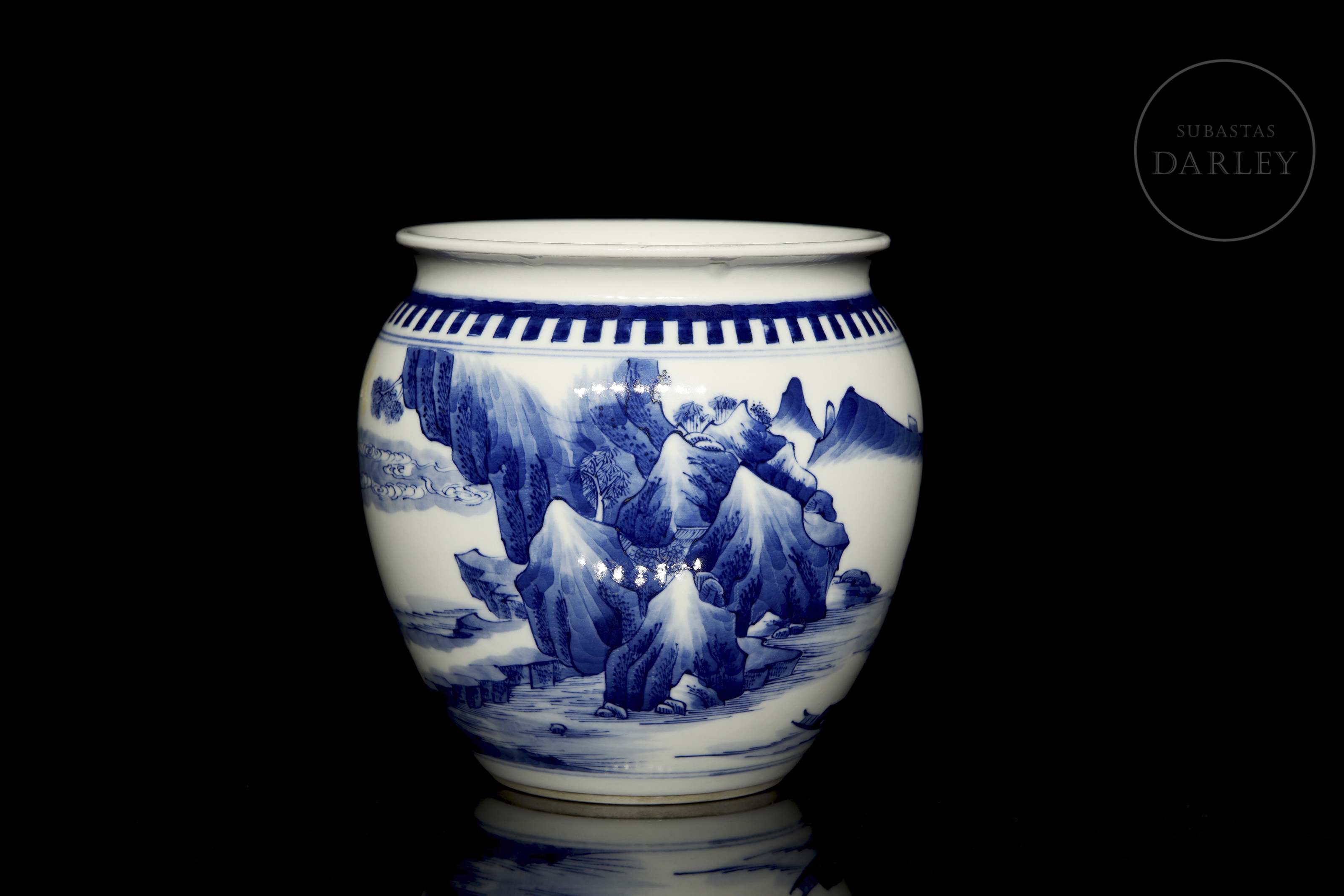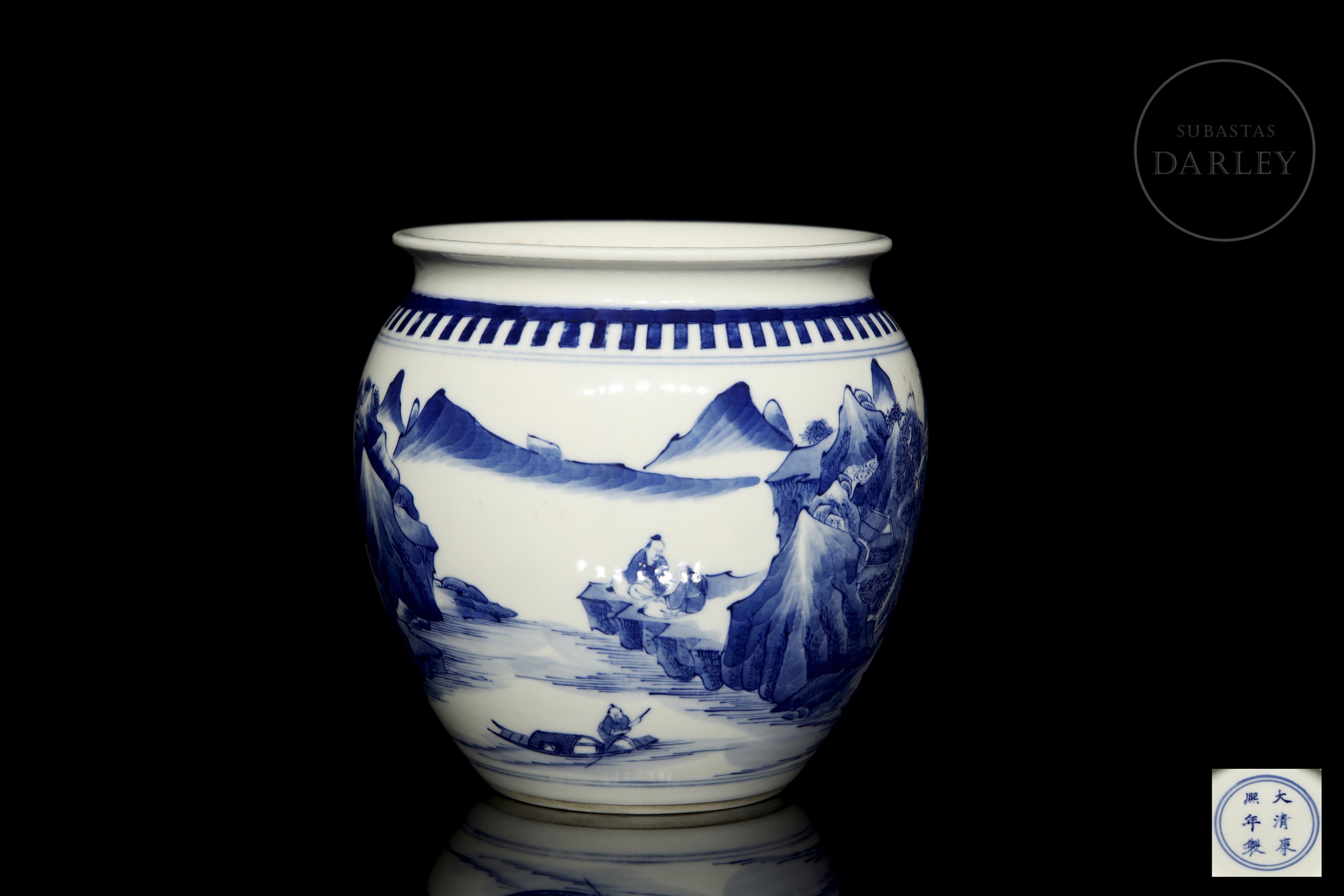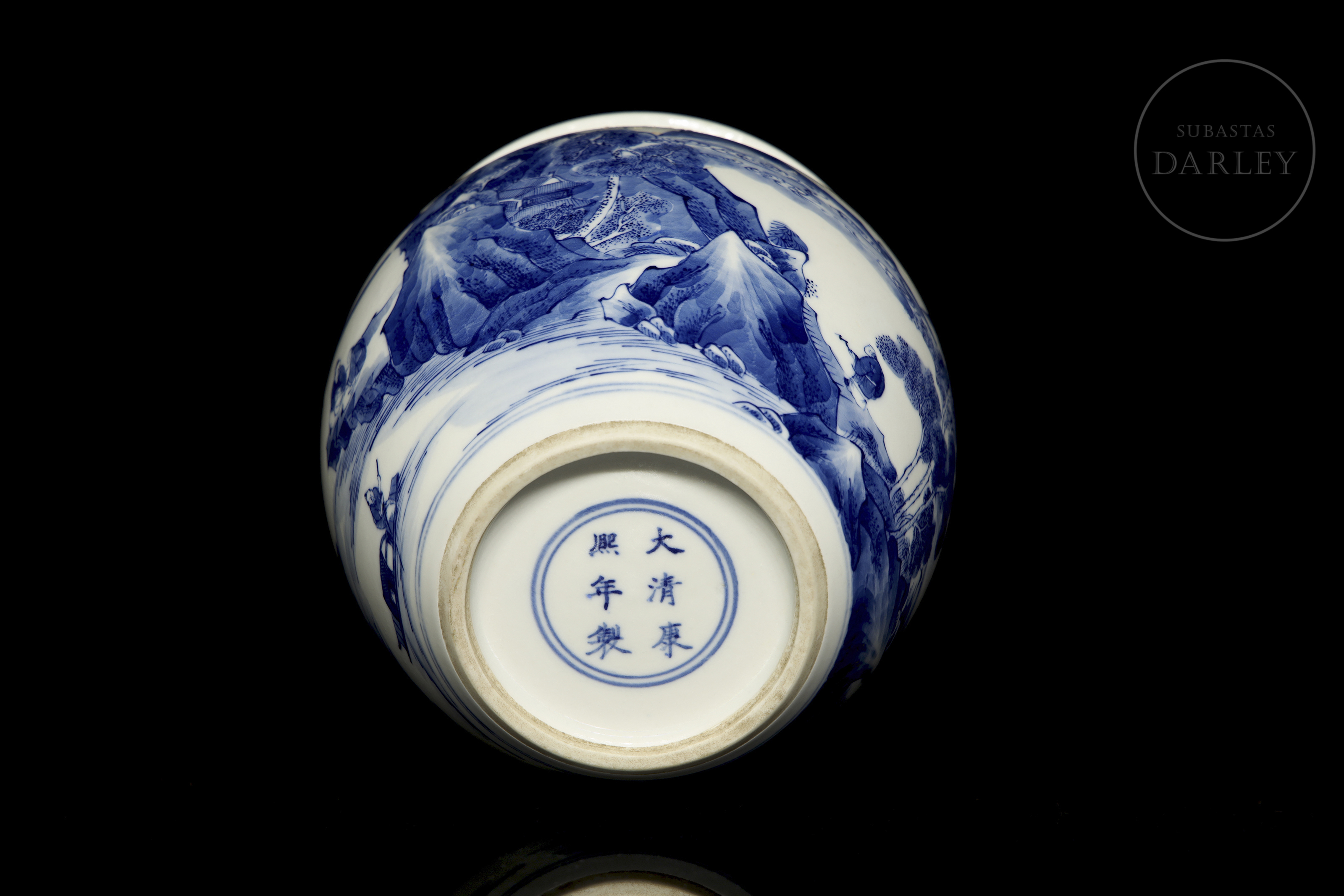 Jarrón de porcelana esmaltada de forma globular, con una base ligeramente estrechada que se ensancha hacia la parte superior, lo que le da un contorno armonioso y equilibrado. La decoración en azul cobalto sobre fondo blanco presenta un paisaje montañoso clásico chino, con montañas, nubes y árboles estilizados en tonos grises y azules. En el primer plano, se pueden observar figuras humanas que navegan en una pequeña embarcación, lo que aporta un toque de vida a la escena natural. En la parte superior del jarrón, una banda decorativa de líneas geométricas complementa la composición. La base del jarrón está marcada con un sello en azul que dice "大清康熙年制".