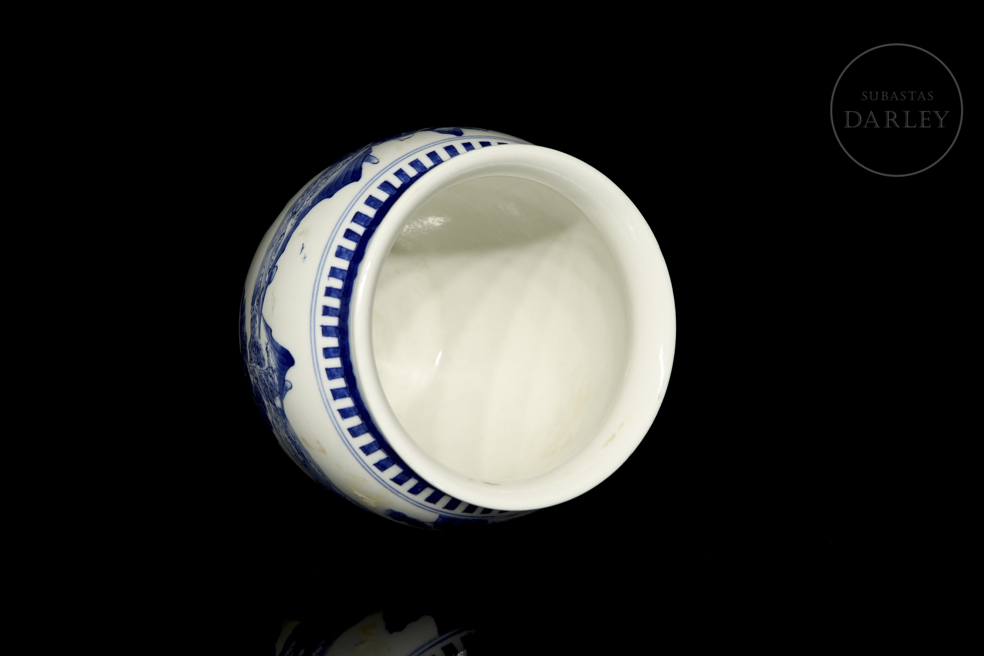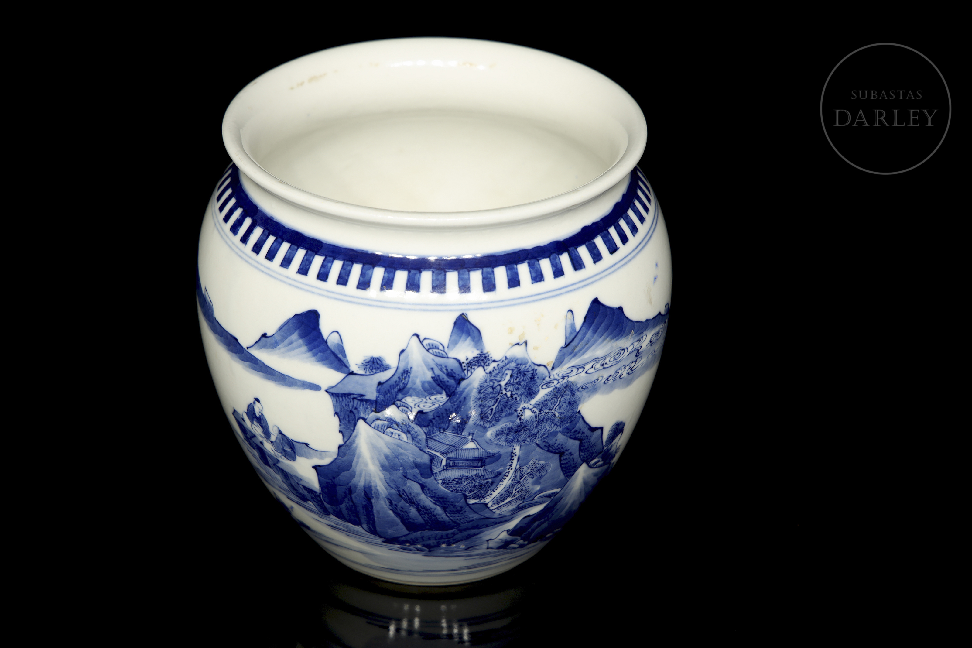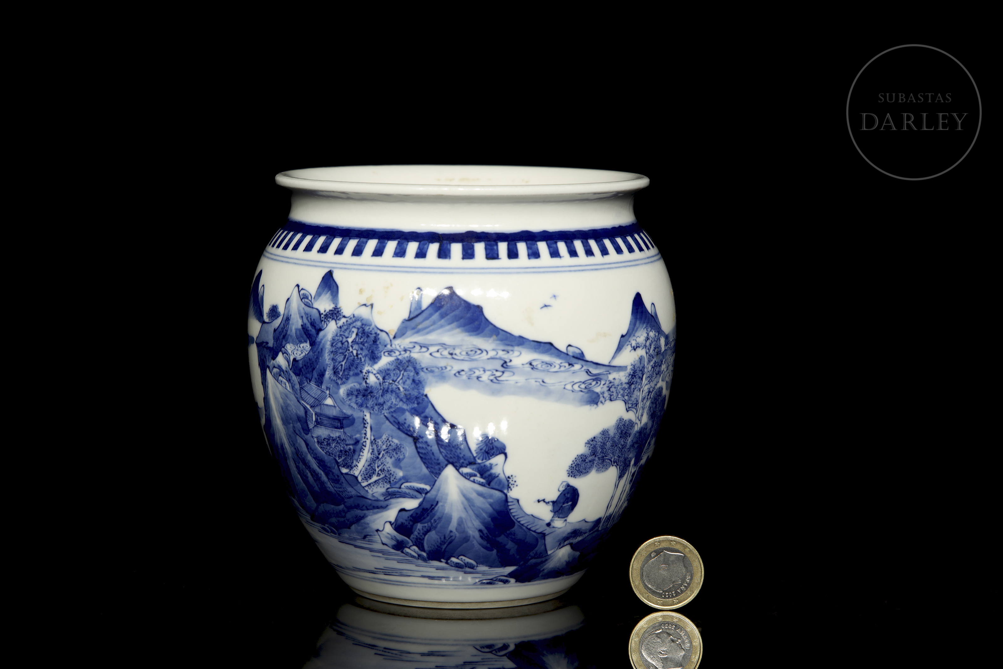 Jarrón de porcelana esmaltada de forma globular, con una base ligeramente estrechada que se ensancha hacia la parte superior, lo que le da un contorno armonioso y equilibrado. La decoración en azul cobalto sobre fondo blanco presenta un paisaje montañoso clásico chino, con montañas, nubes y árboles estilizados en tonos grises y azules. En el primer plano, se pueden observar figuras humanas que navegan en una pequeña embarcación, lo que aporta un toque de vida a la escena natural. En la parte superior del jarrón, una banda decorativa de líneas geométricas complementa la composición. La base del jarrón está marcada con un sello en azul que dice "大清康熙年制".