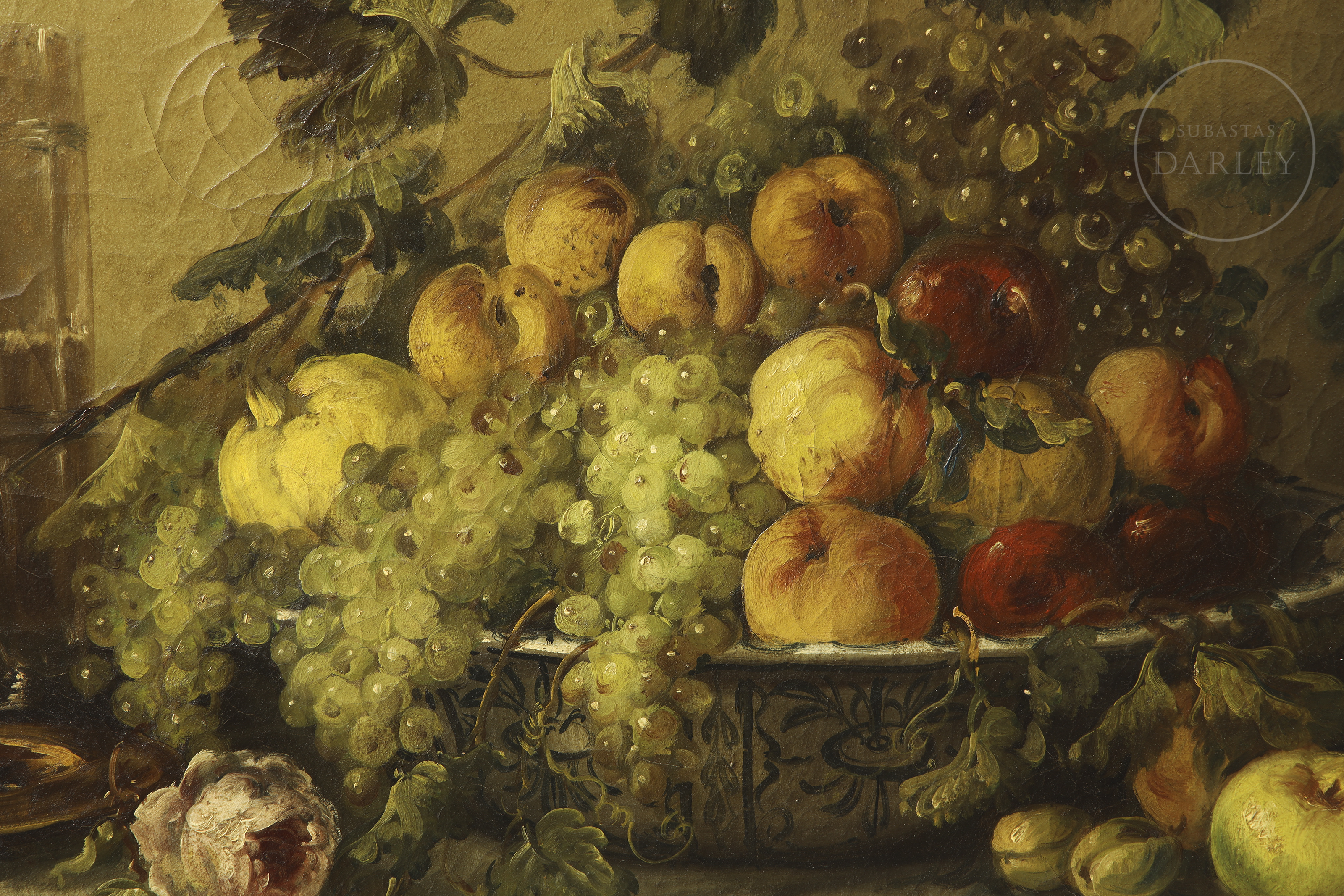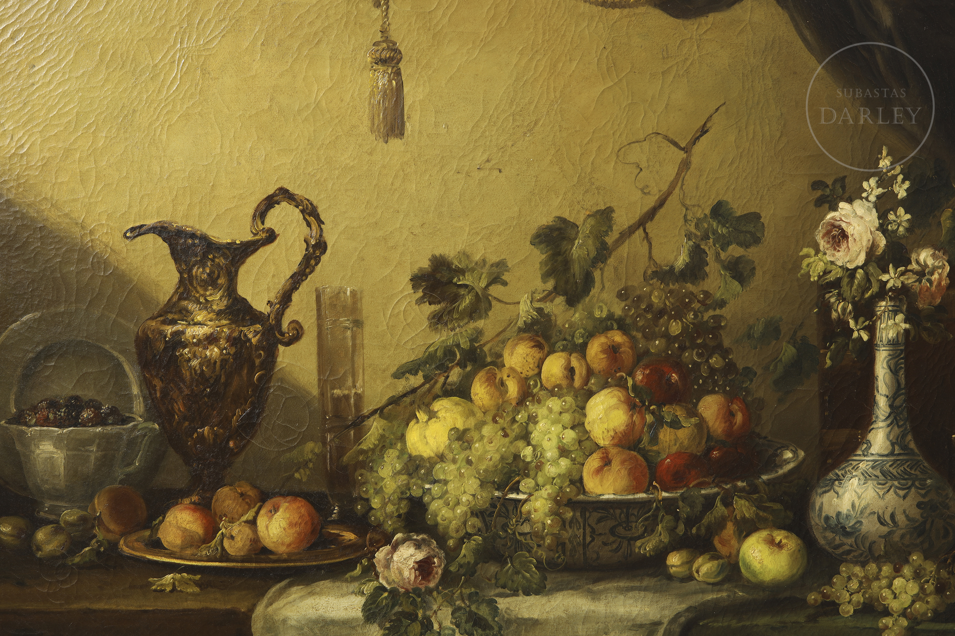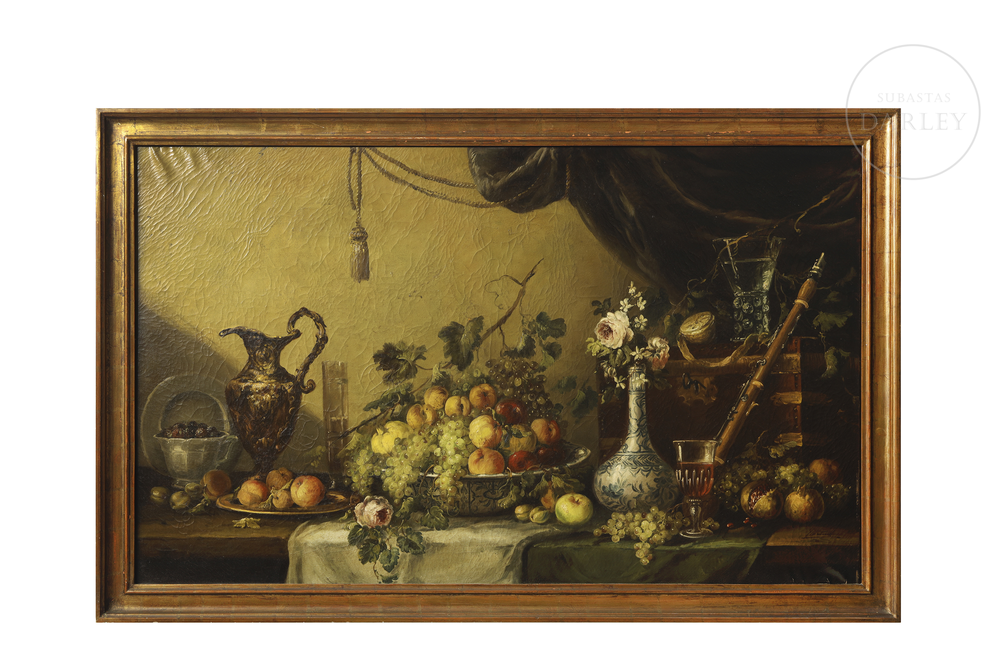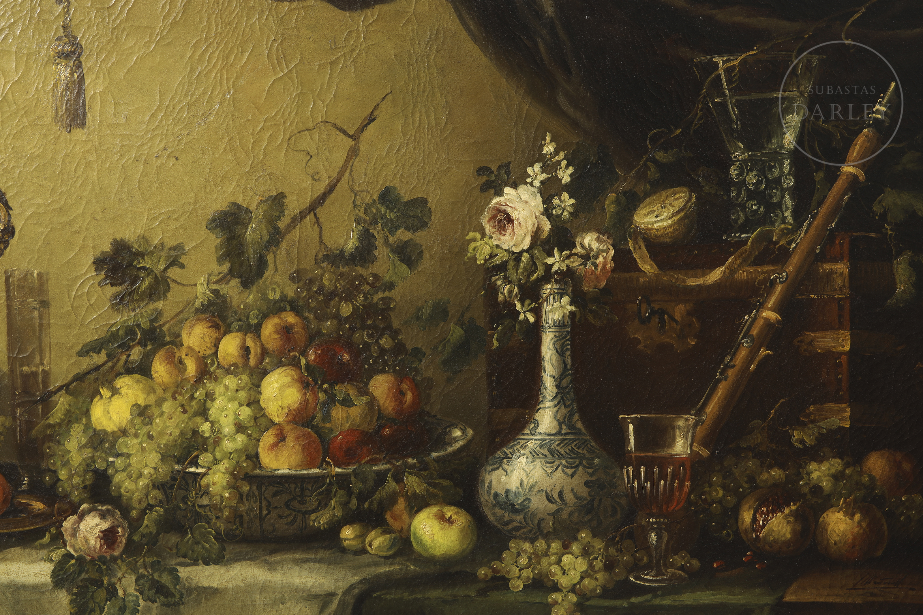 Óleo sobre lienzo. Firmado "J. Martorell" en la esquina inferior derecha. Composición compleja formada por frutos, jarrones, mobiliario e instrumentos.