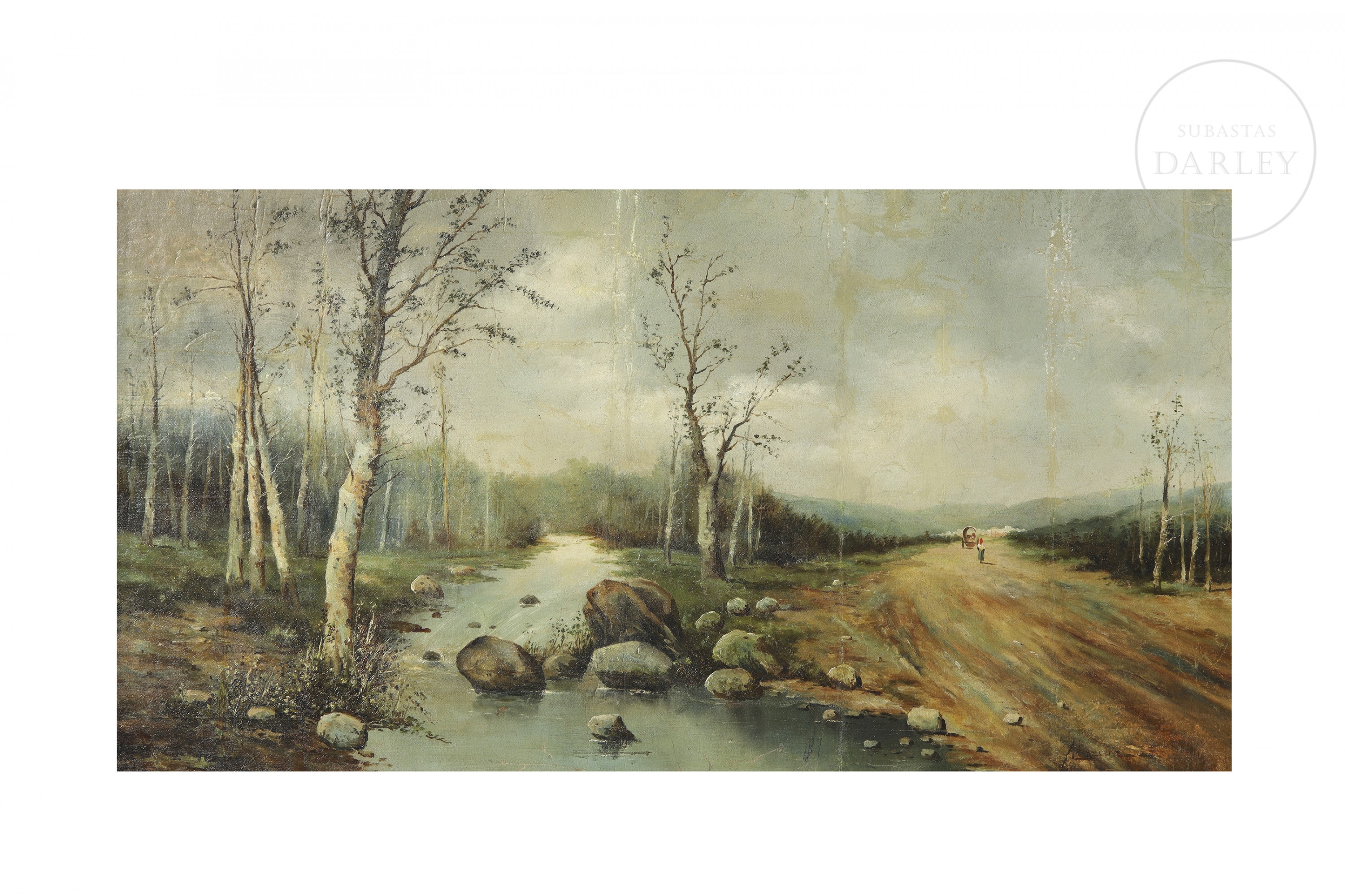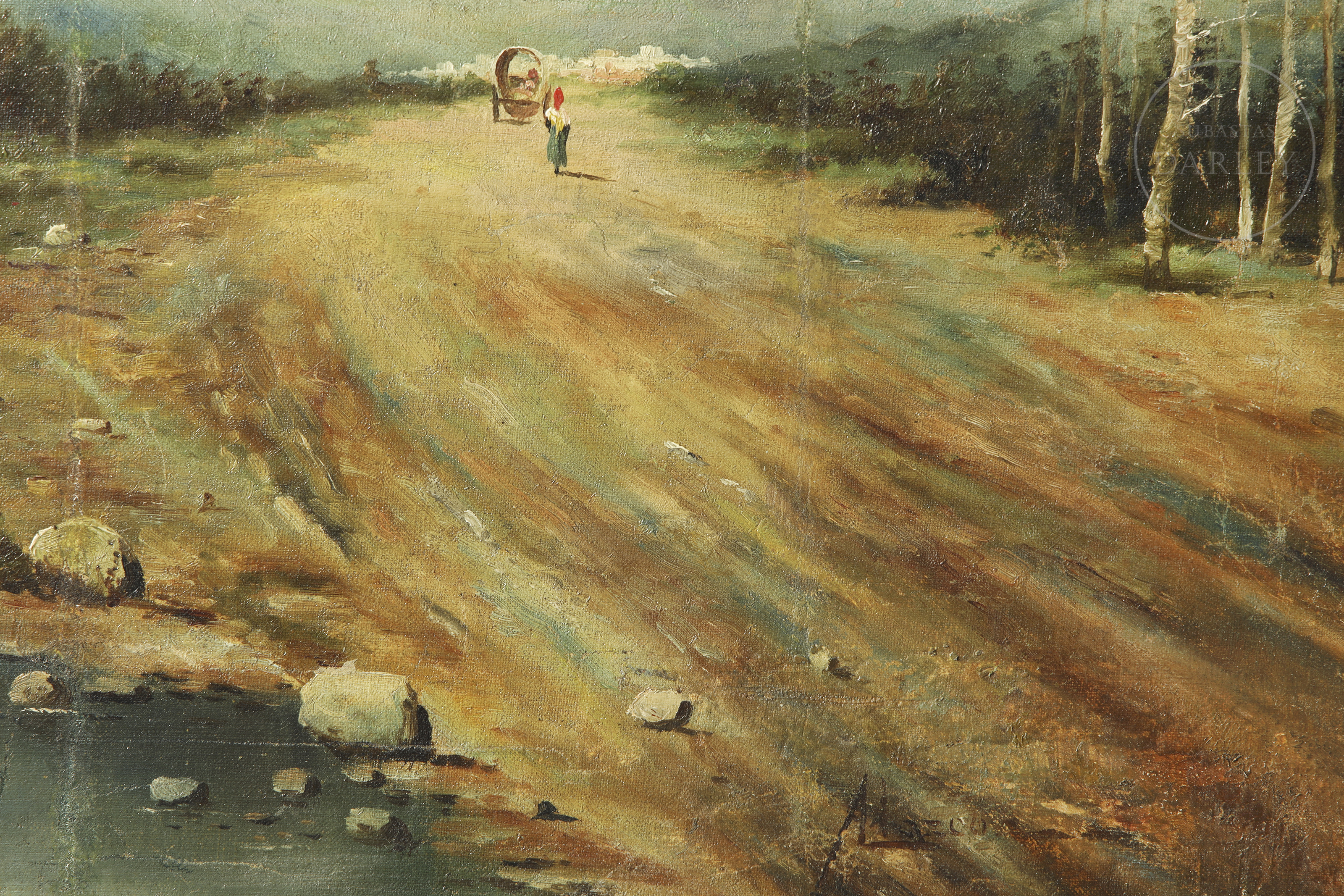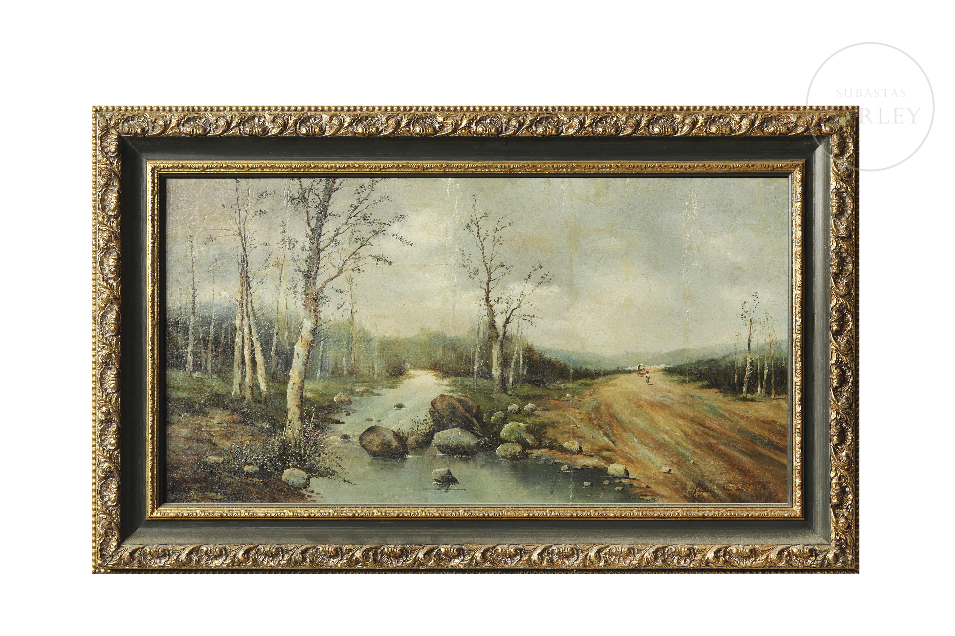 Óleo sobre lienzo, firmado en el ángulo inferior derecho. Representa un paisaje sereno con un sendero que discurre paralelo a un río, donde una figura campesina camina hacia una carreta.