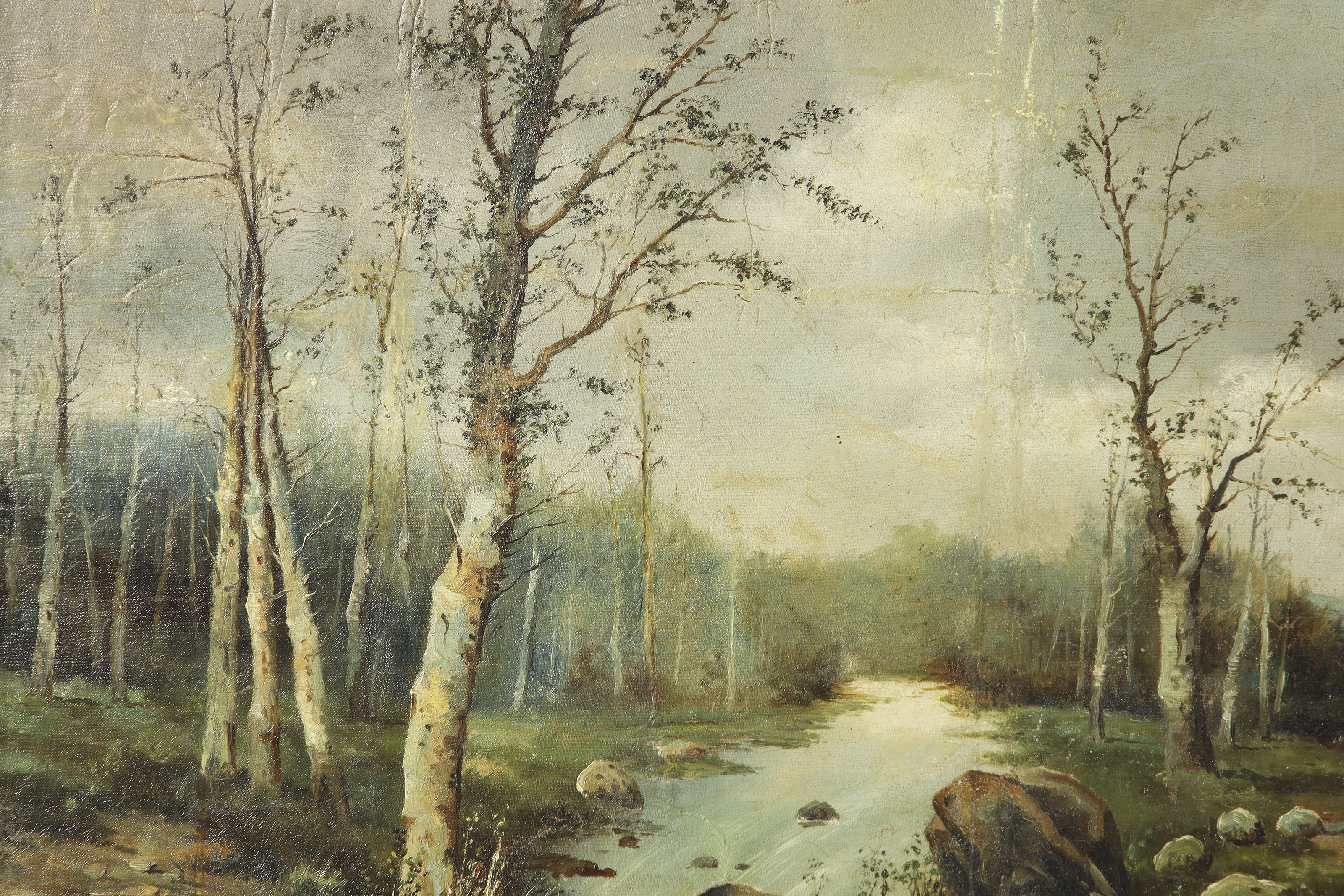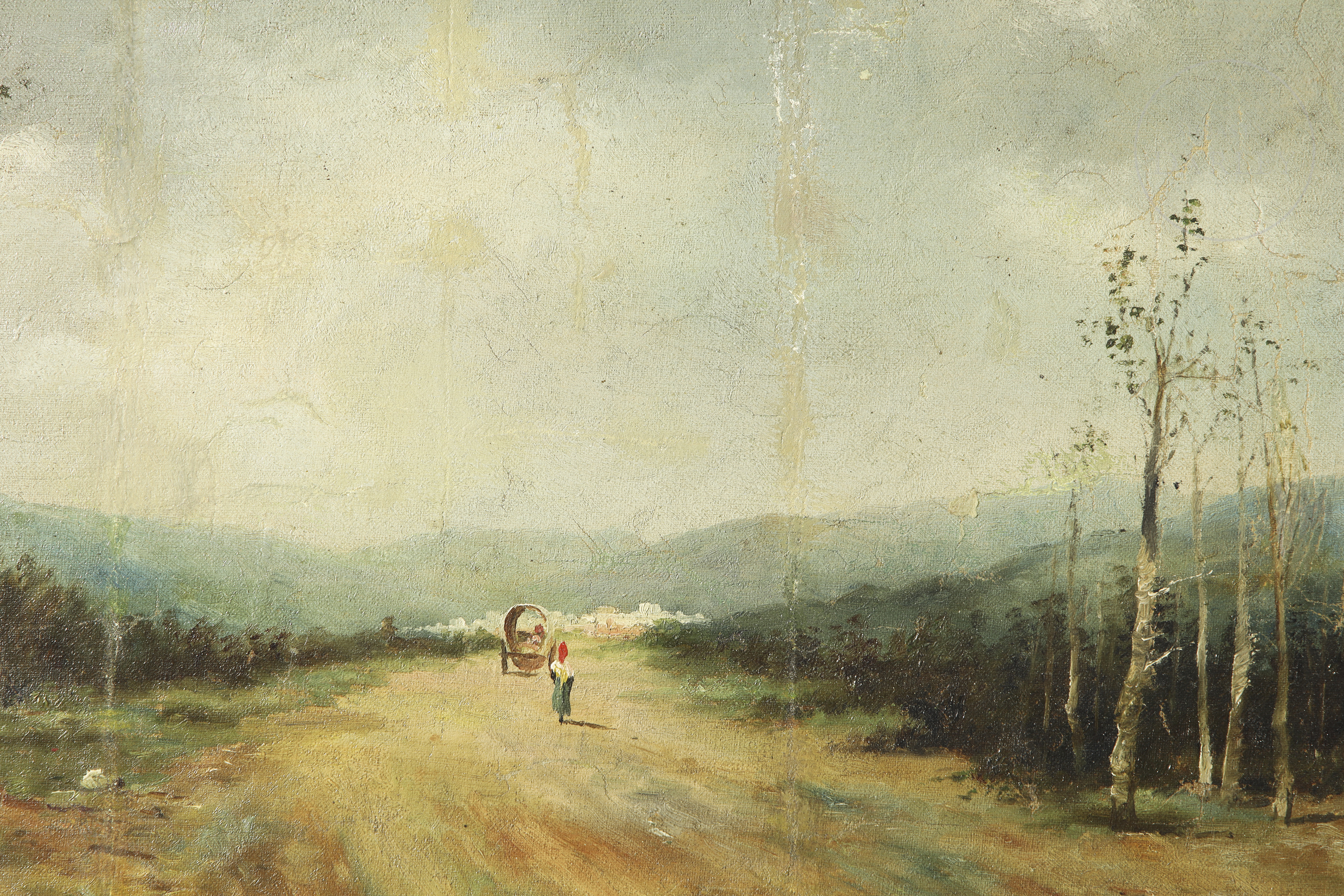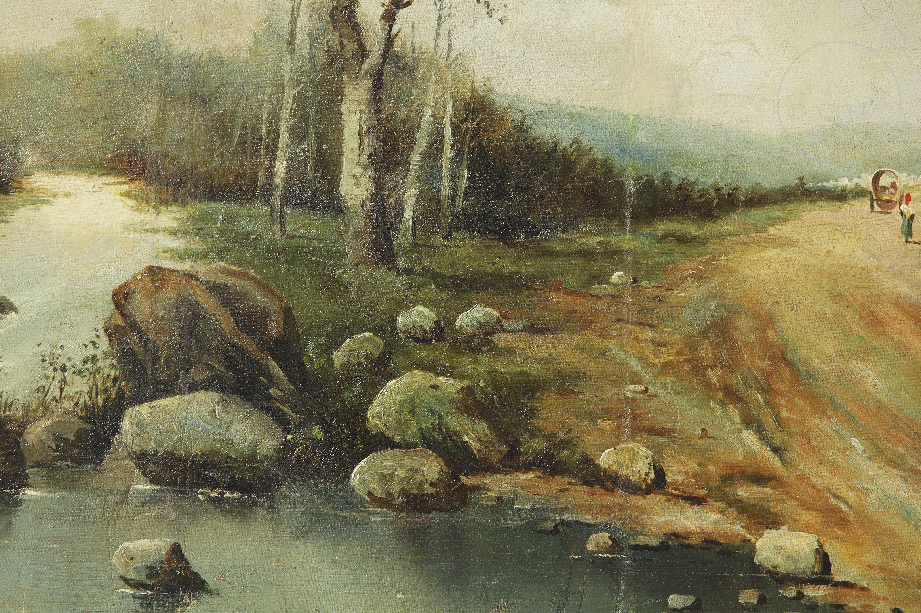 Óleo sobre lienzo, firmado en el ángulo inferior derecho. Representa un paisaje sereno con un sendero que discurre paralelo a un río, donde una figura campesina camina hacia una carreta.