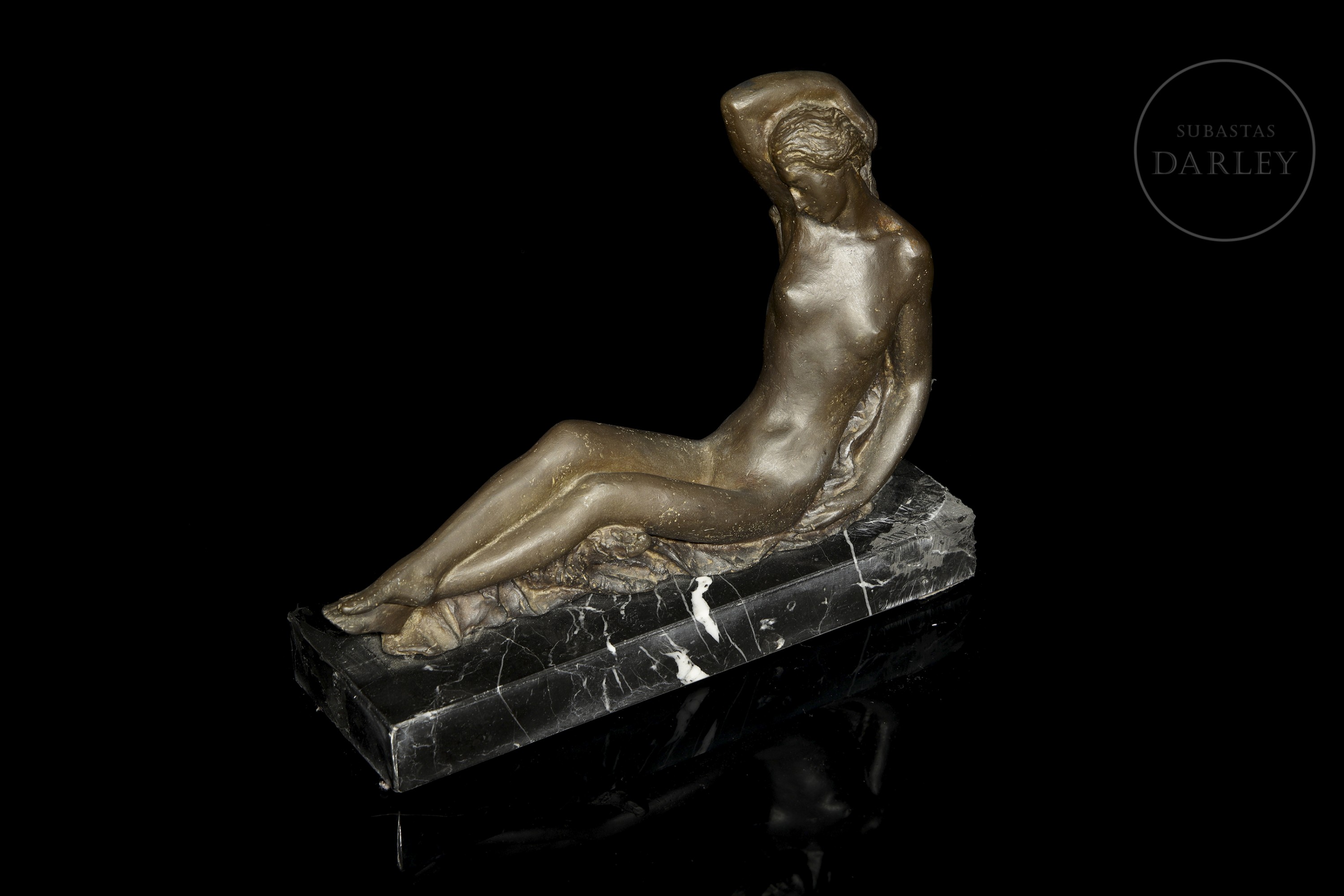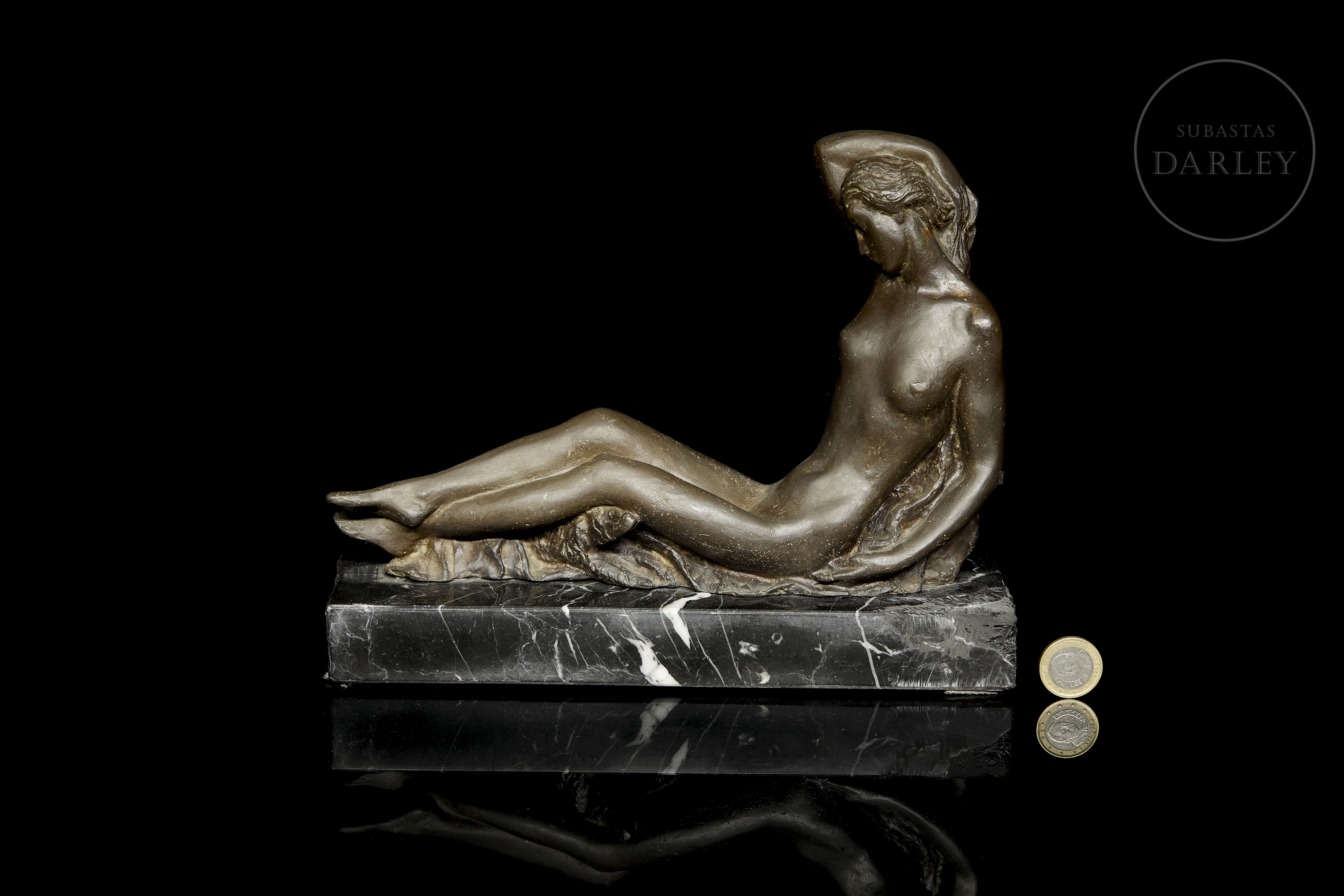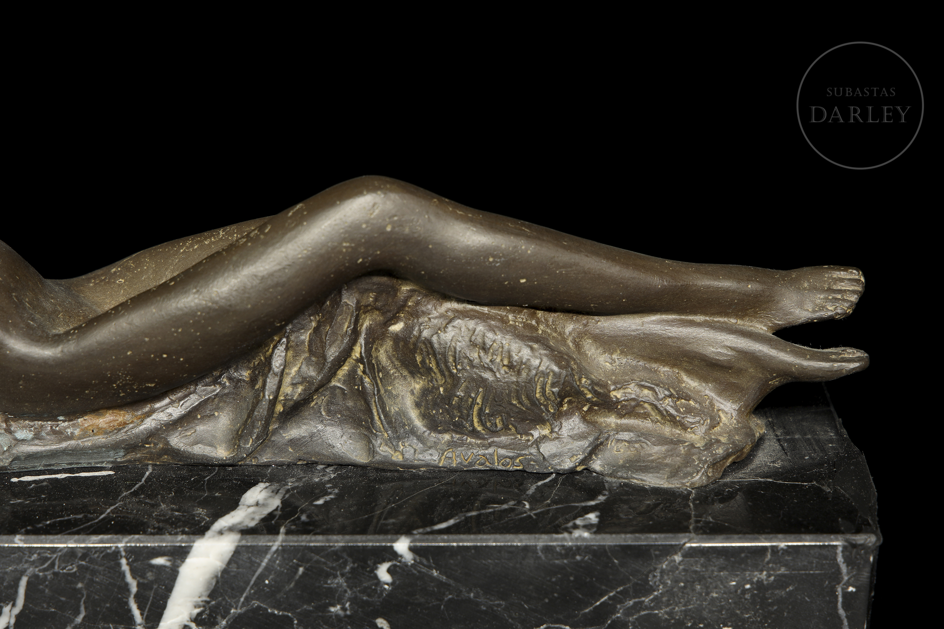 Escultura en bronce patinado sobre peana de mármol. Desnudo femenino recostado sobre un paño, en una pose de inspiración clásica. La escultura se presenta sobre una base de mármol (con restauración). Firmado "Avalos" en la base.
