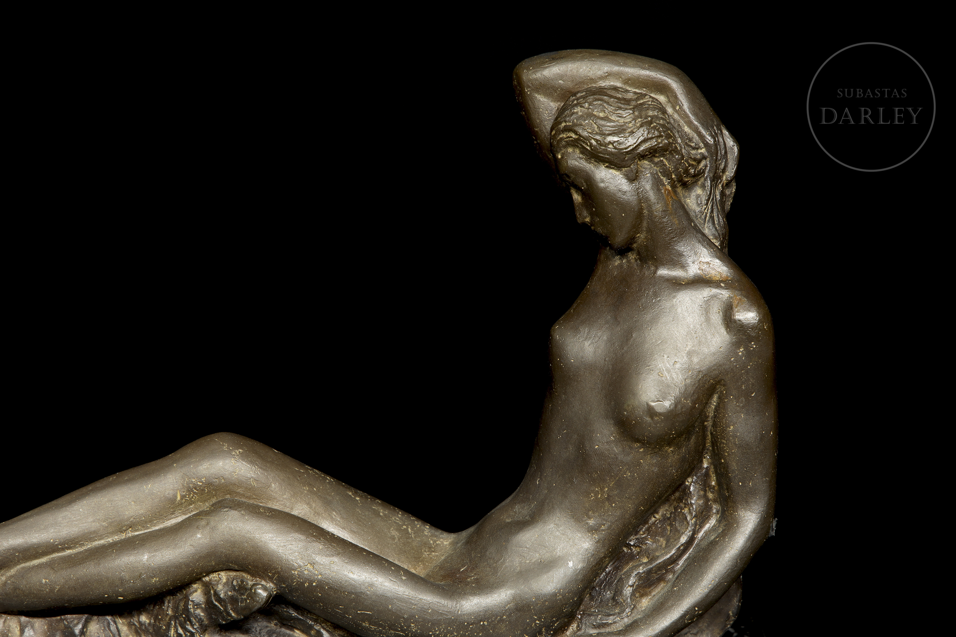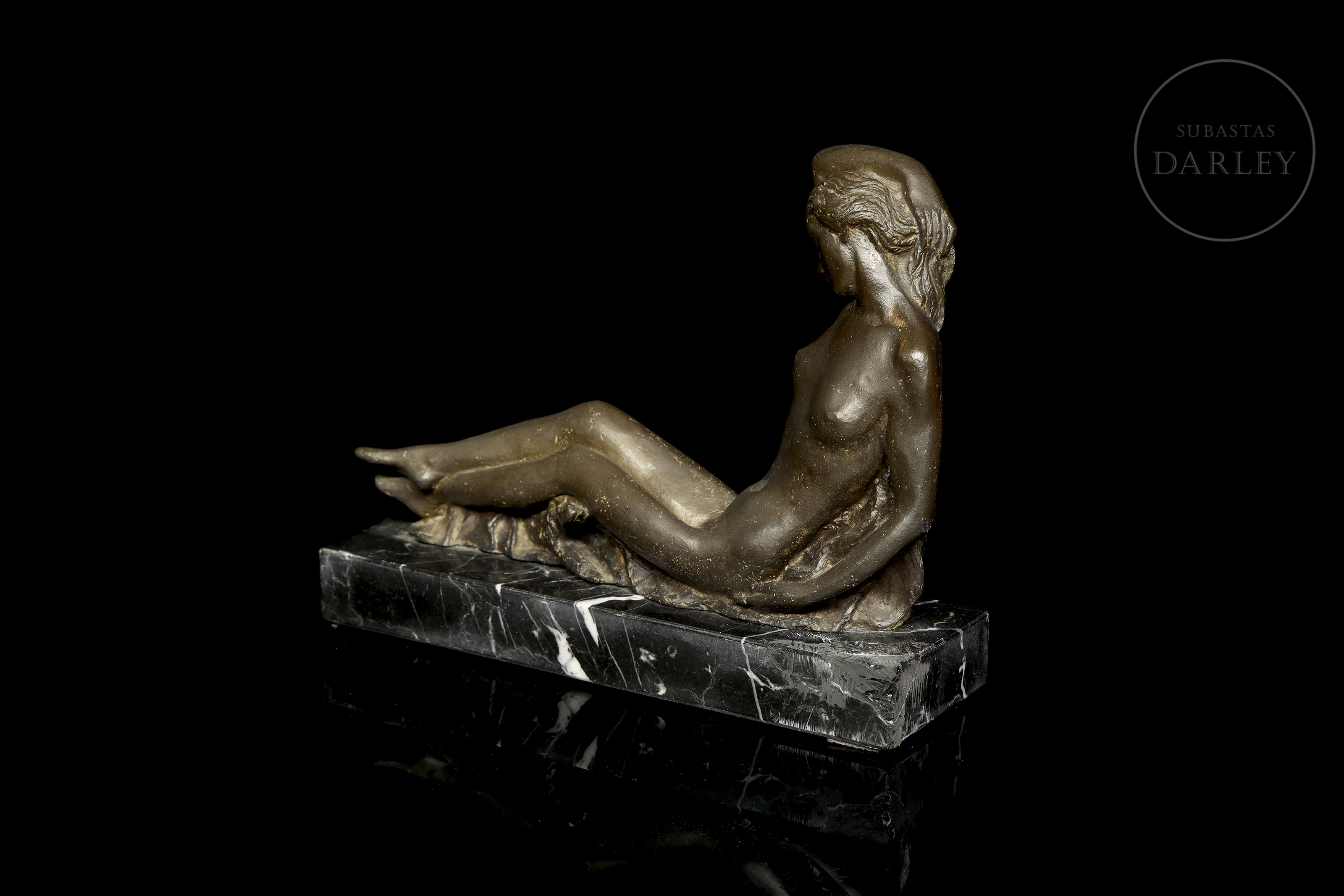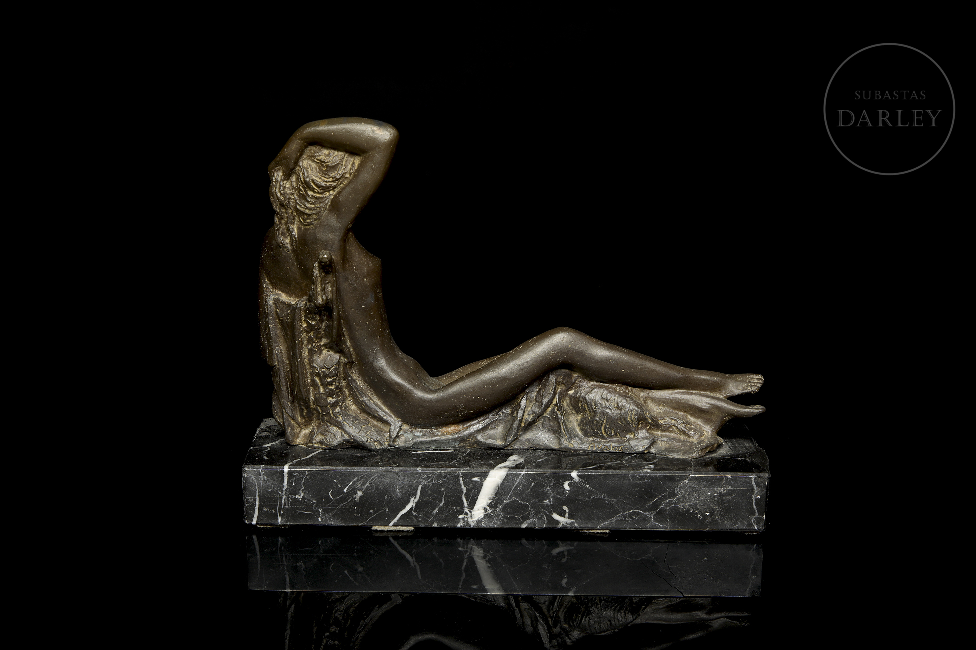 Escultura en bronce patinado sobre peana de mármol. Desnudo femenino recostado sobre un paño, en una pose de inspiración clásica. La escultura se presenta sobre una base de mármol (con restauración). Firmado "Avalos" en la base.