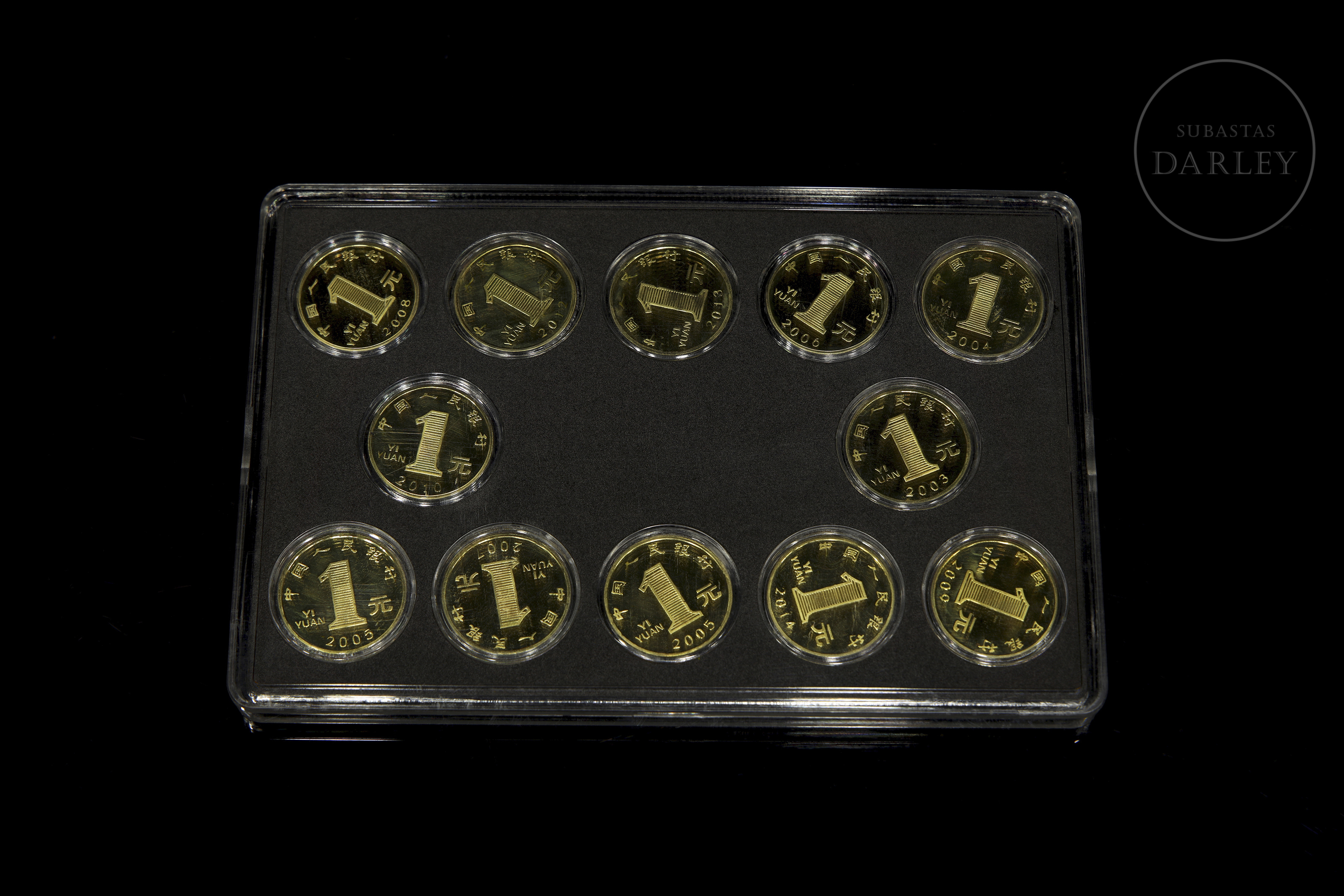 Conjunto para coleccionistas de 12 monedas de curso legal, emitidas por el Banco Popular de China, por valor de 1 Yuan cada una en diversos años (entre 2003 y 2014).