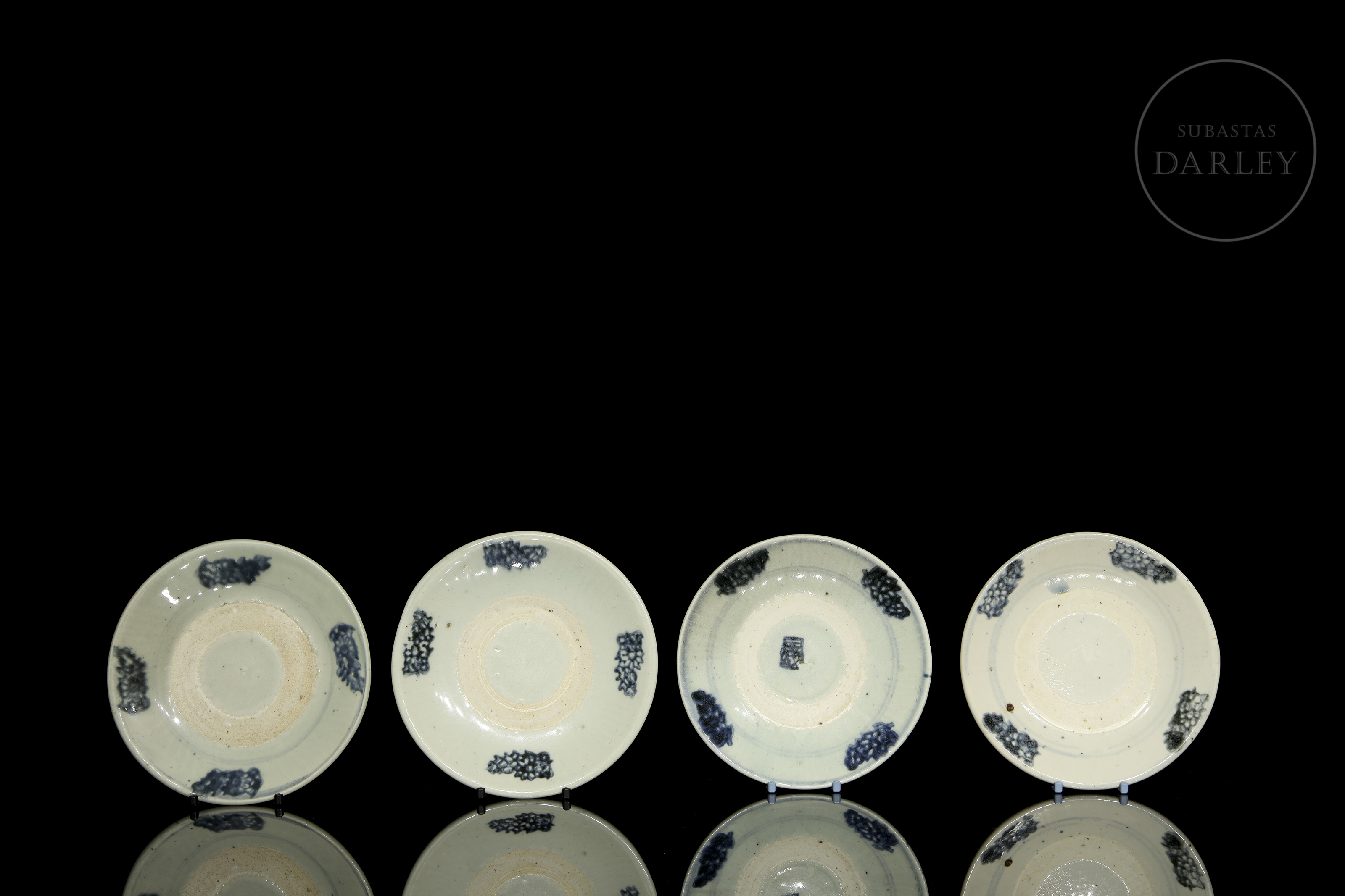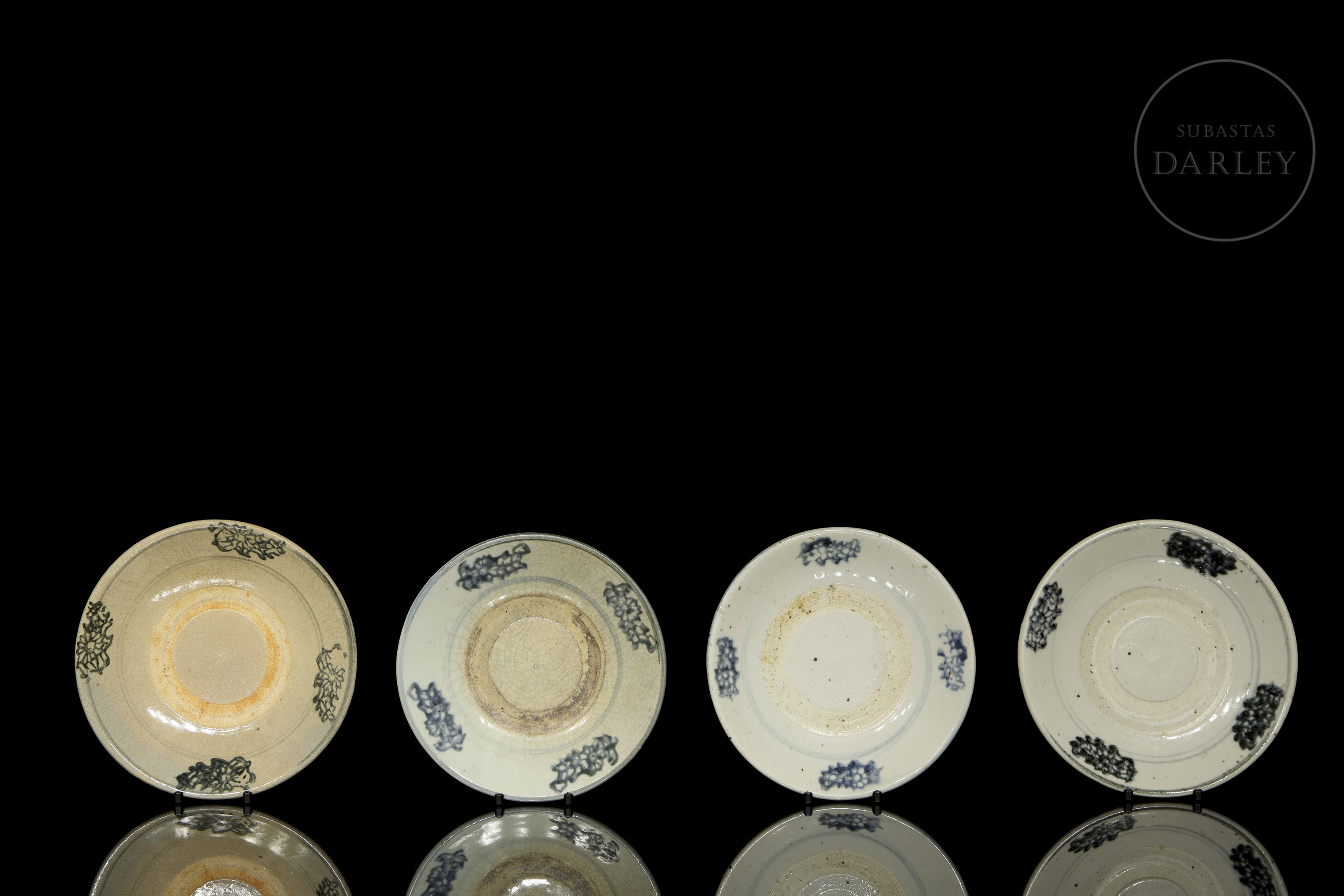 Cerámica esmaltada con decoración bajo vidriado en blanco y azul grisáceo. Poseen un cuerpo circular y paredes ligeramente acampanadas, asentados sobre un pequeño pie anular. Están decorados con un motivo de líneas y volutas (o ideogramas) dispuestos tanto en la cara superior como inferior del ala. Dinastía Ming (1368-1644).