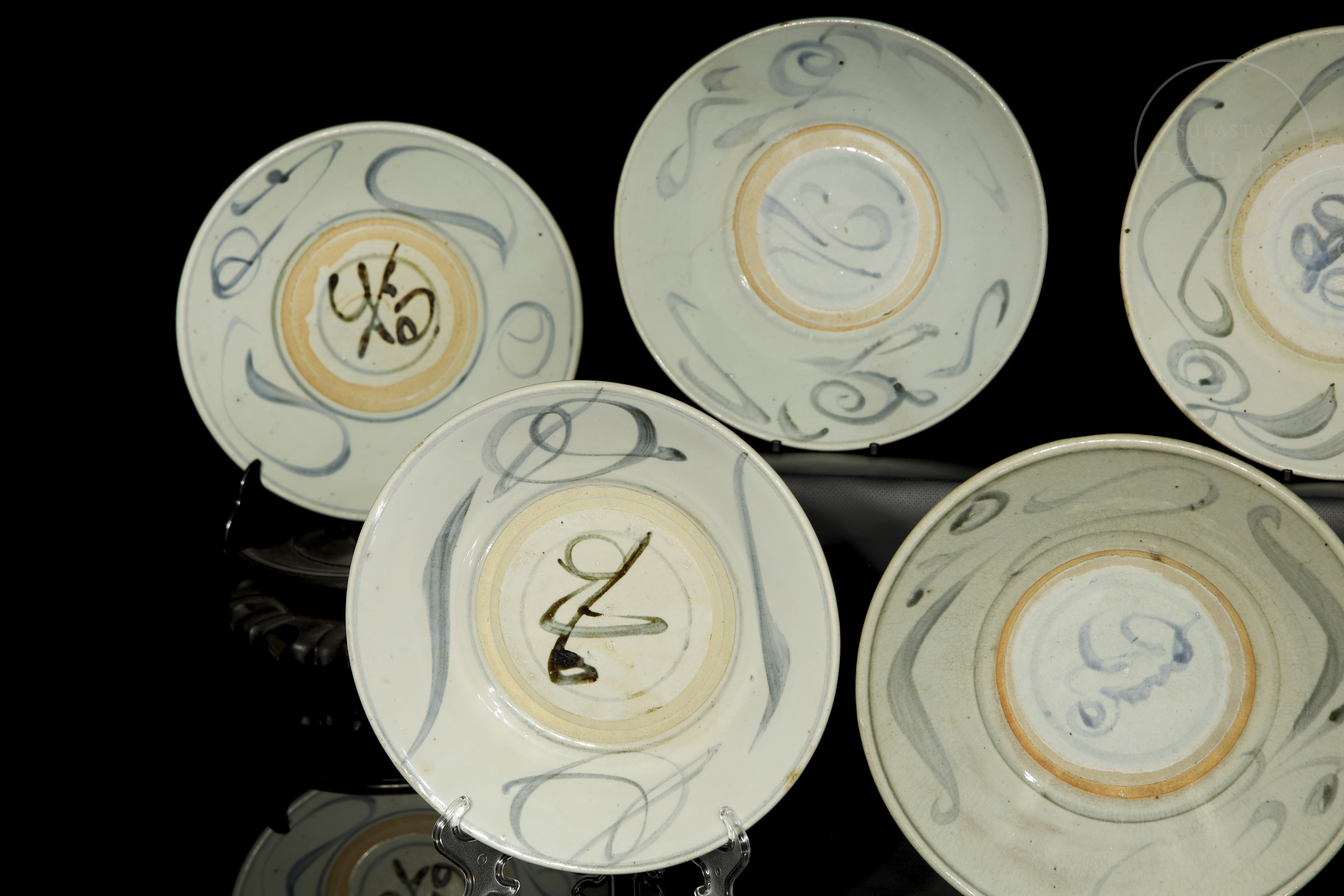 Once platos de cerámica esmaltada con decoración bajo vidriado en blanco, azul y óxidos de hierro. Poseen paredes acampanadas y un cuerpo circular y asentado sobre un corto pie circular. Están decorados con un motivo de líneas estilizadas y volutas. En la base se dispone un símbolo bajo vidriado. Dinastía Ming (1368-1644).