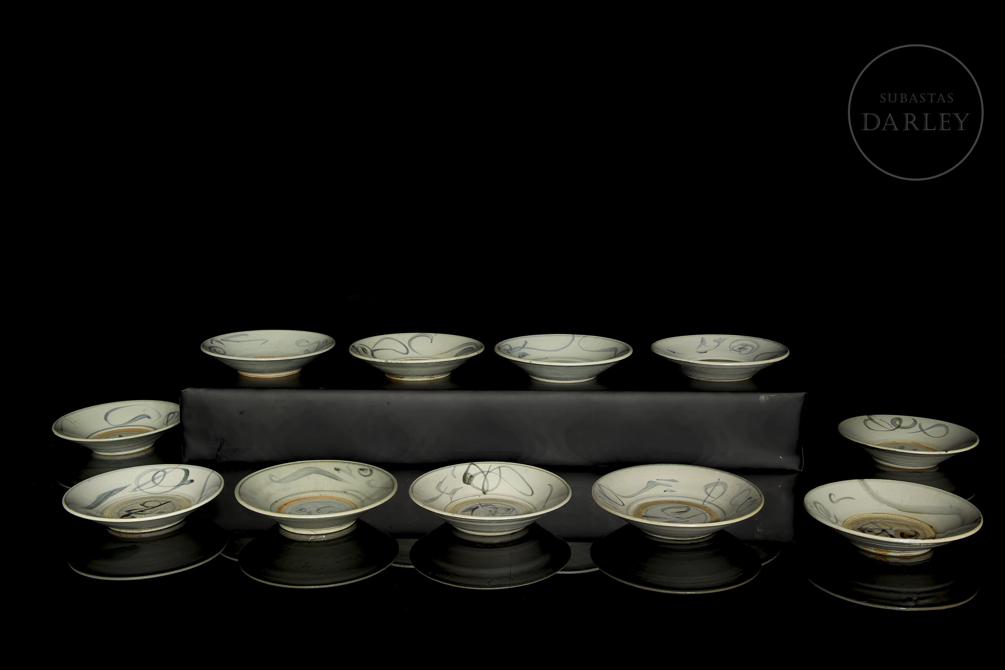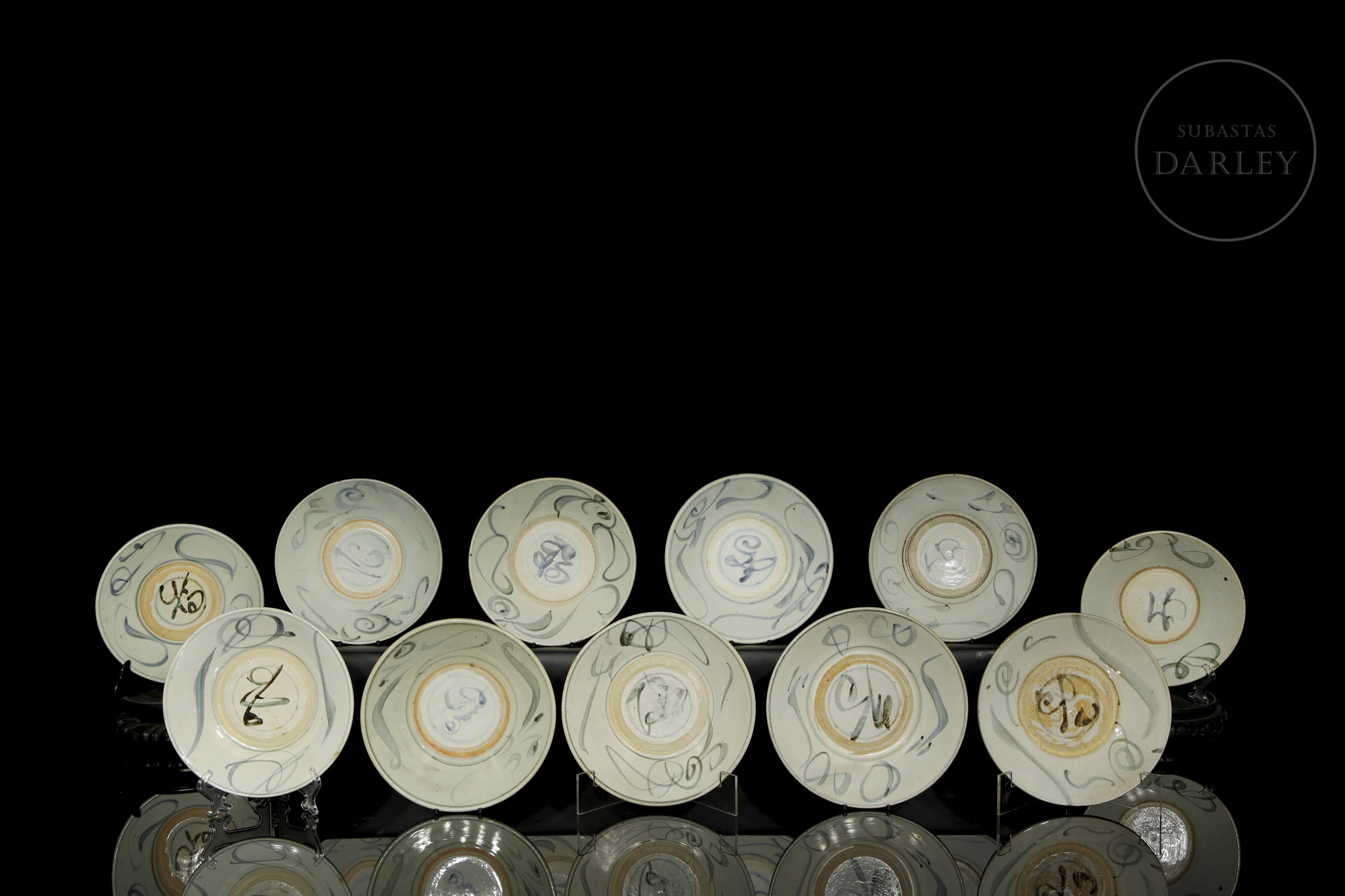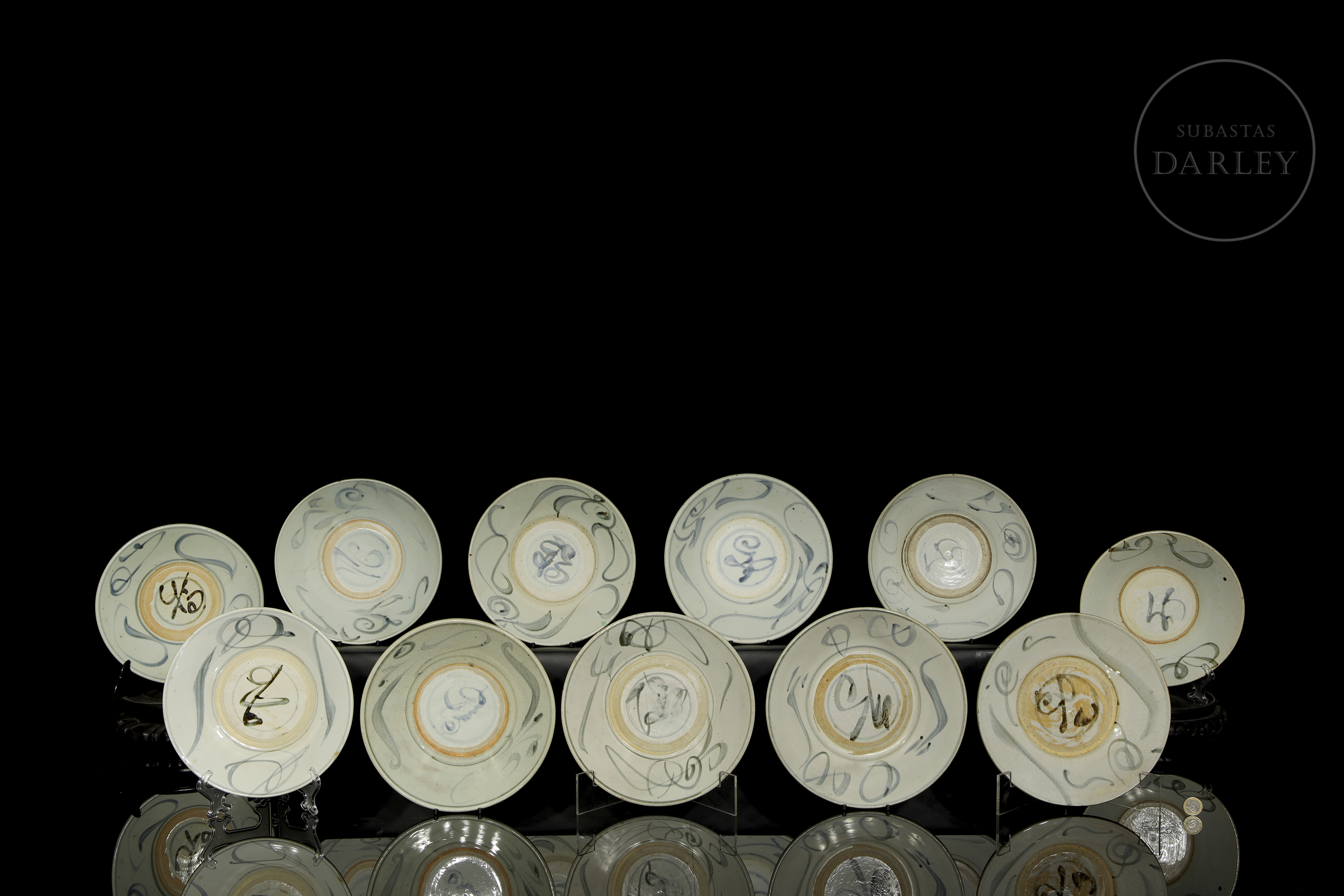 Once platos de cerámica esmaltada con decoración bajo vidriado en blanco, azul y óxidos de hierro. Poseen paredes acampanadas y un cuerpo circular y asentado sobre un corto pie circular. Están decorados con un motivo de líneas estilizadas y volutas. En la base se dispone un símbolo bajo vidriado. Dinastía Ming (1368-1644).