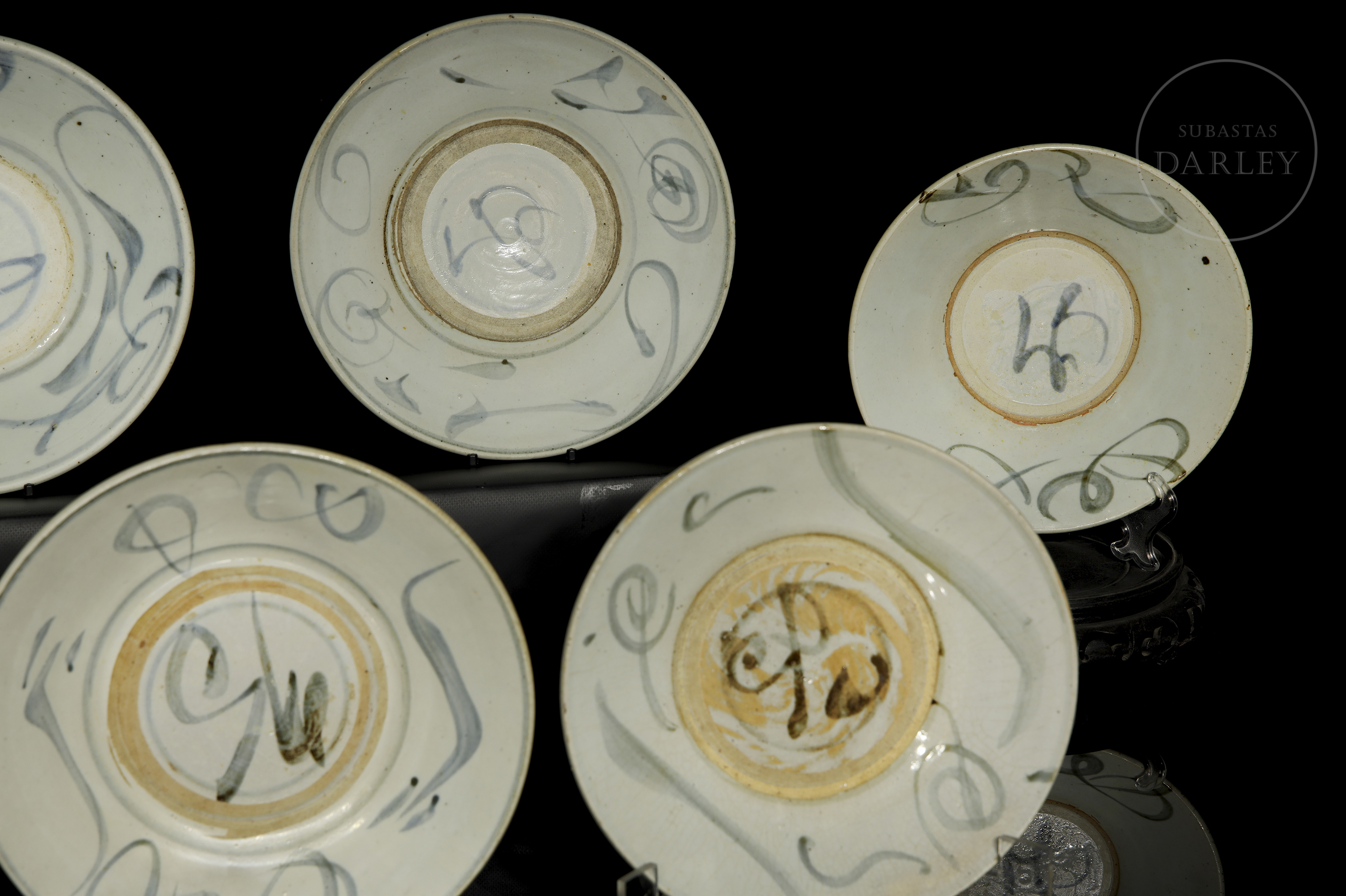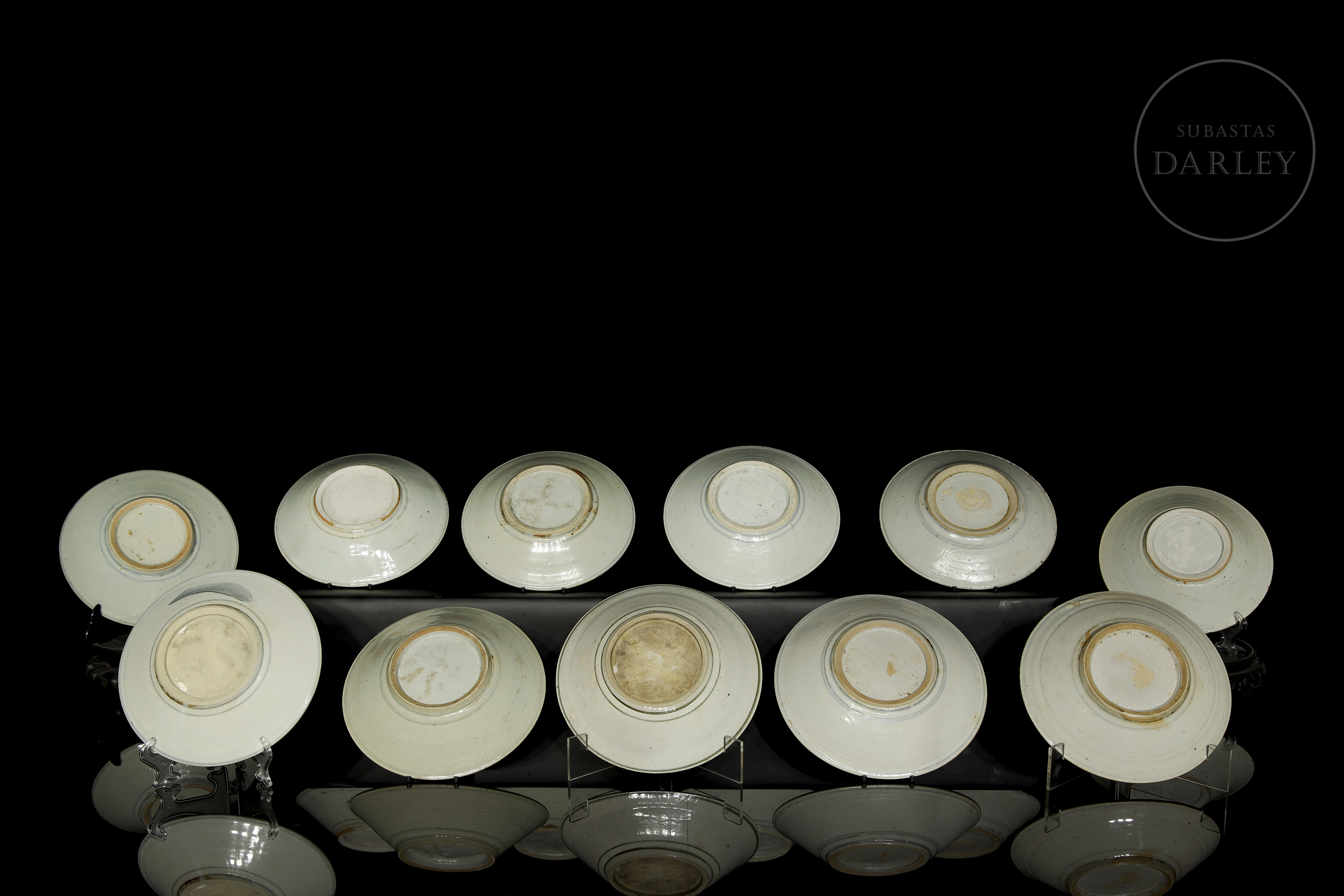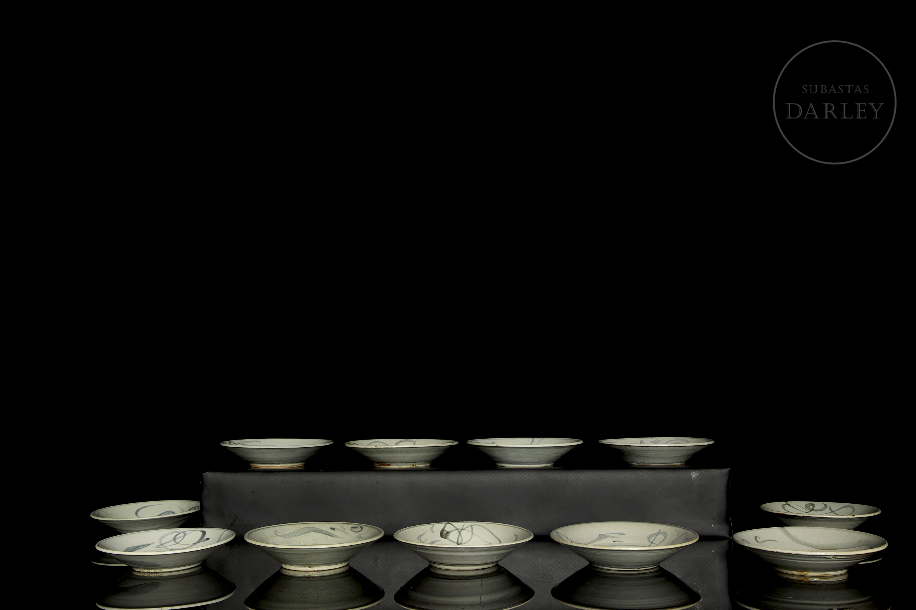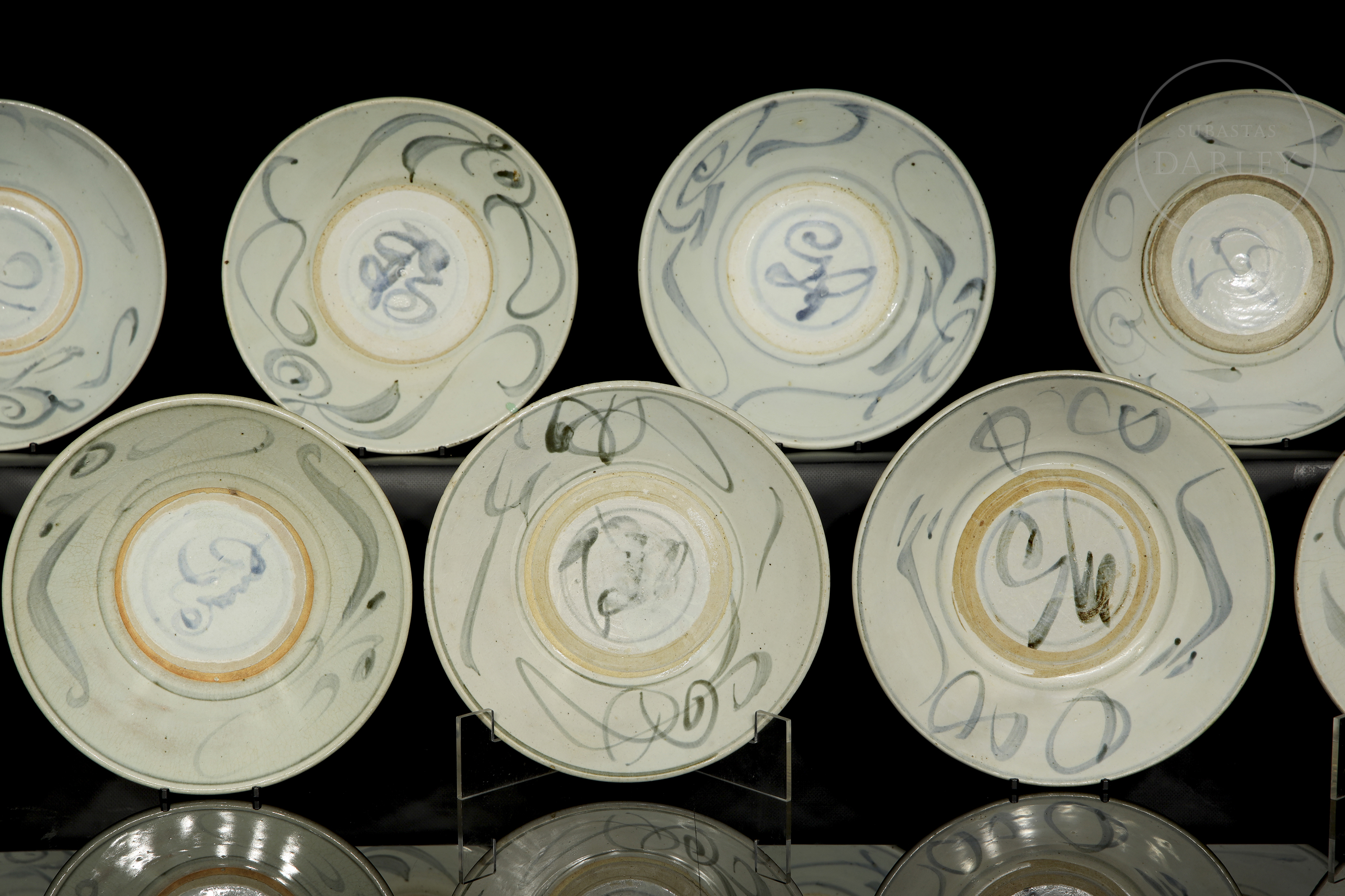 Once platos de cerámica esmaltada con decoración bajo vidriado en blanco, azul y óxidos de hierro. Poseen paredes acampanadas y un cuerpo circular y asentado sobre un corto pie circular. Están decorados con un motivo de líneas estilizadas y volutas. En la base se dispone un símbolo bajo vidriado. Dinastía Ming (1368-1644).