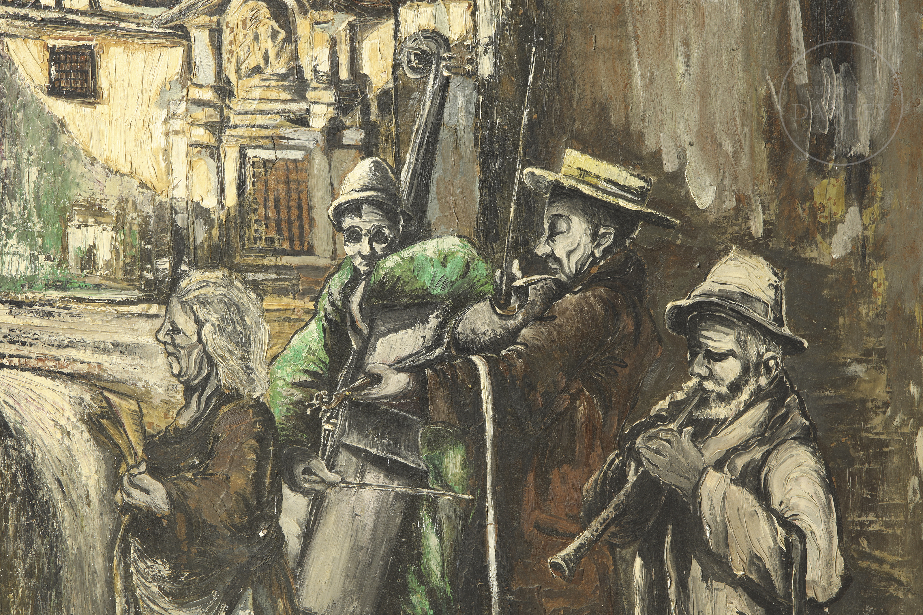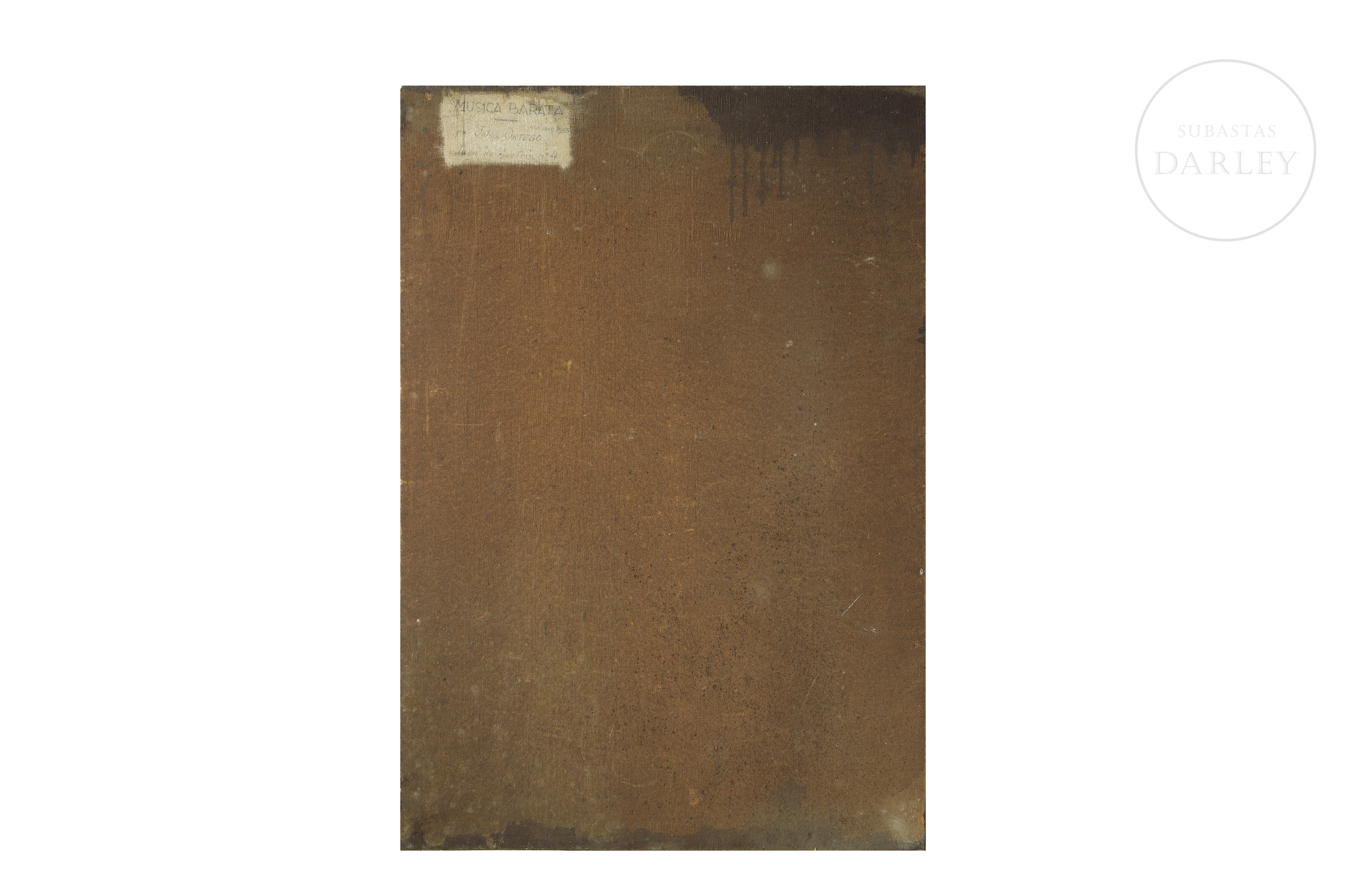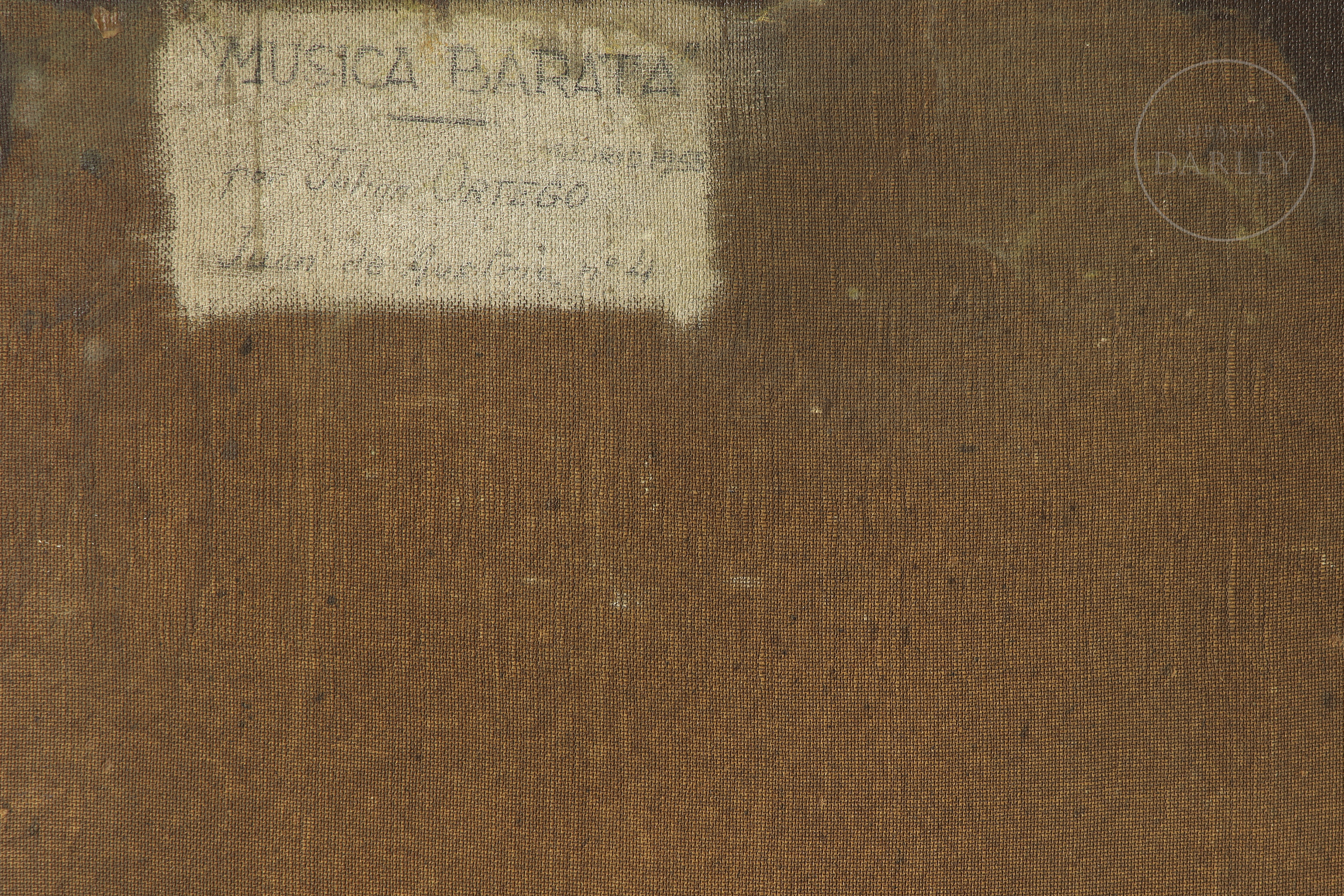 Óleo sobre tablex. Firmado, titulado y fechado "Música barata" por Julián Ortego. Juan de Austria nº4." en el reverso.