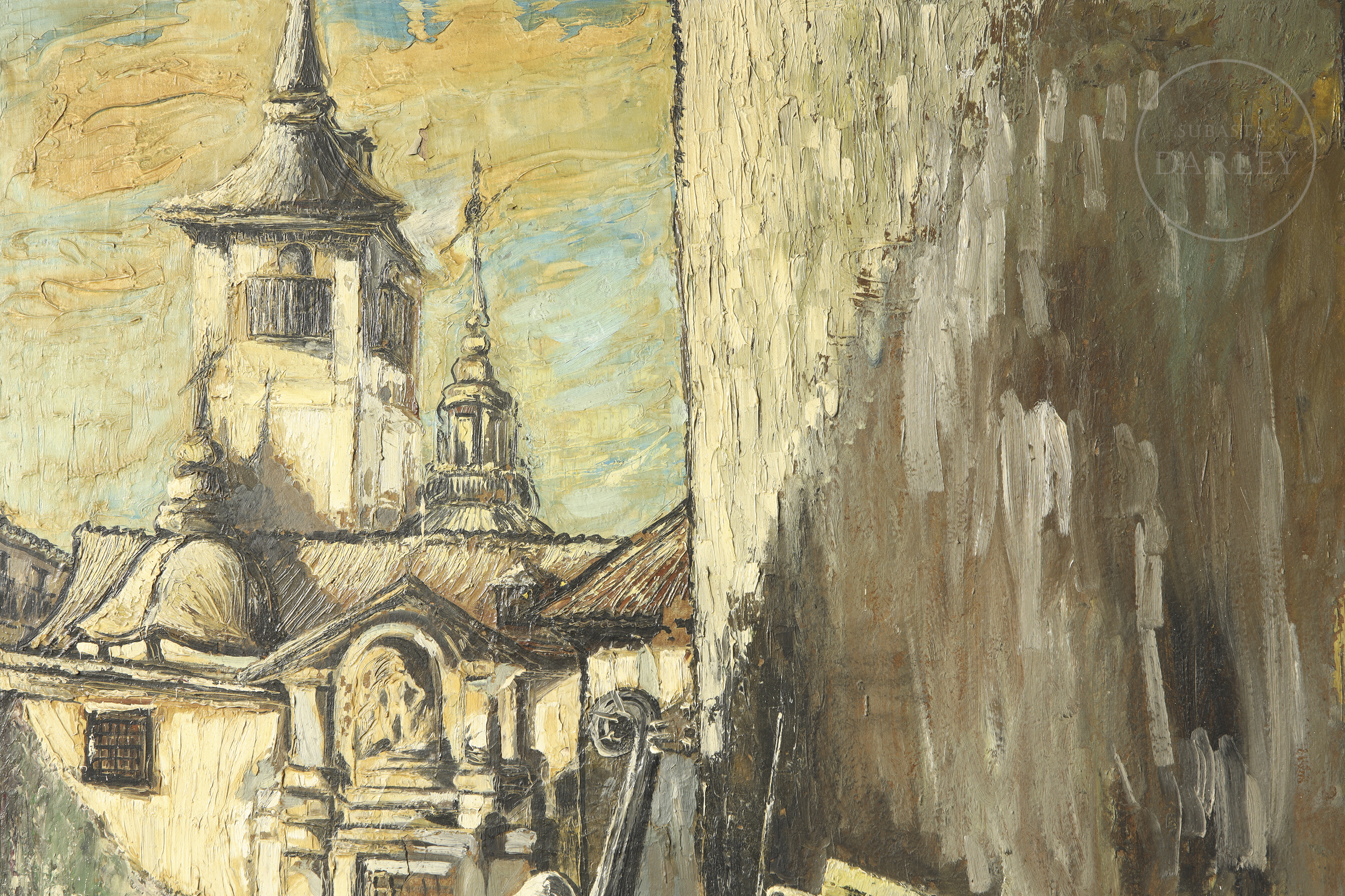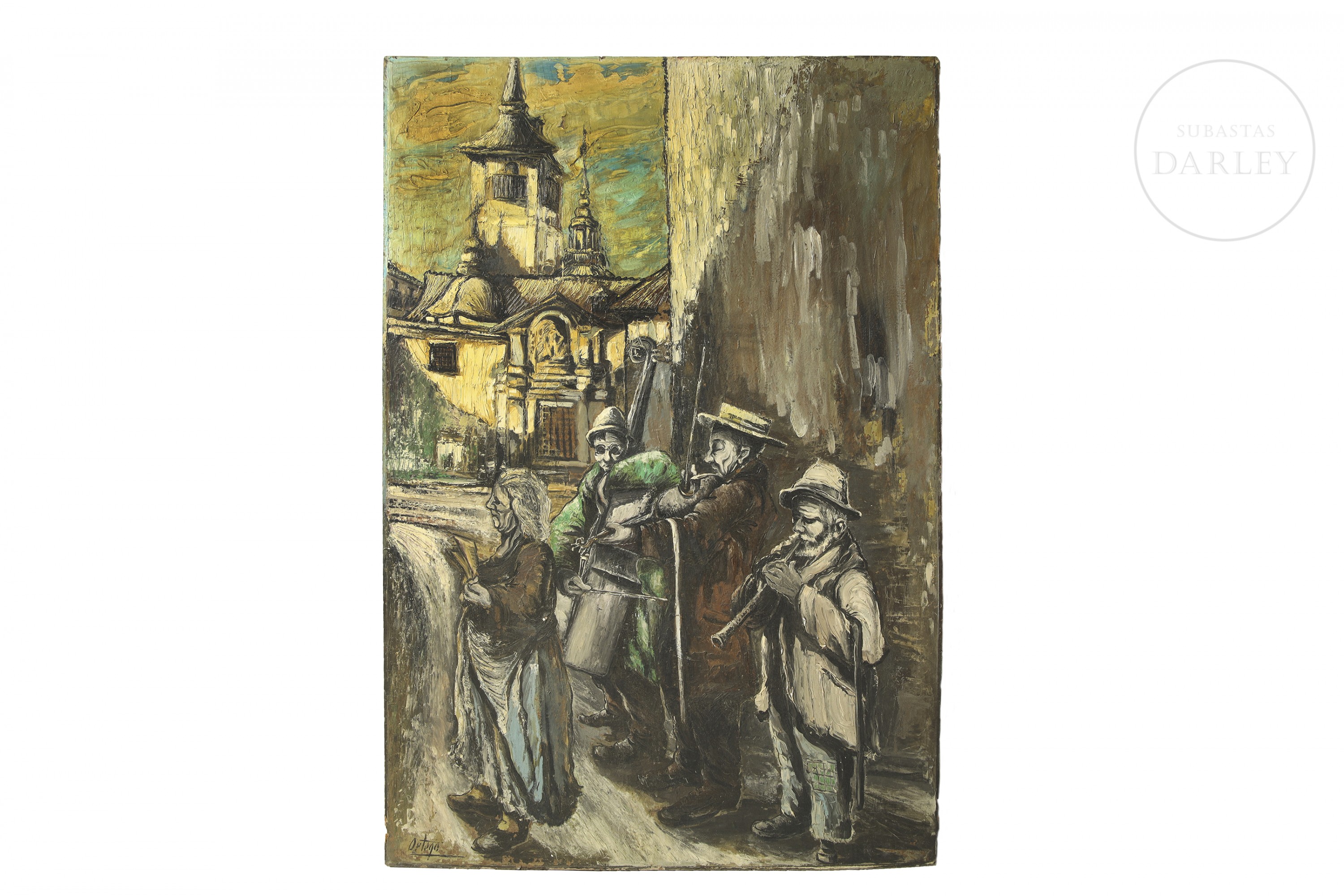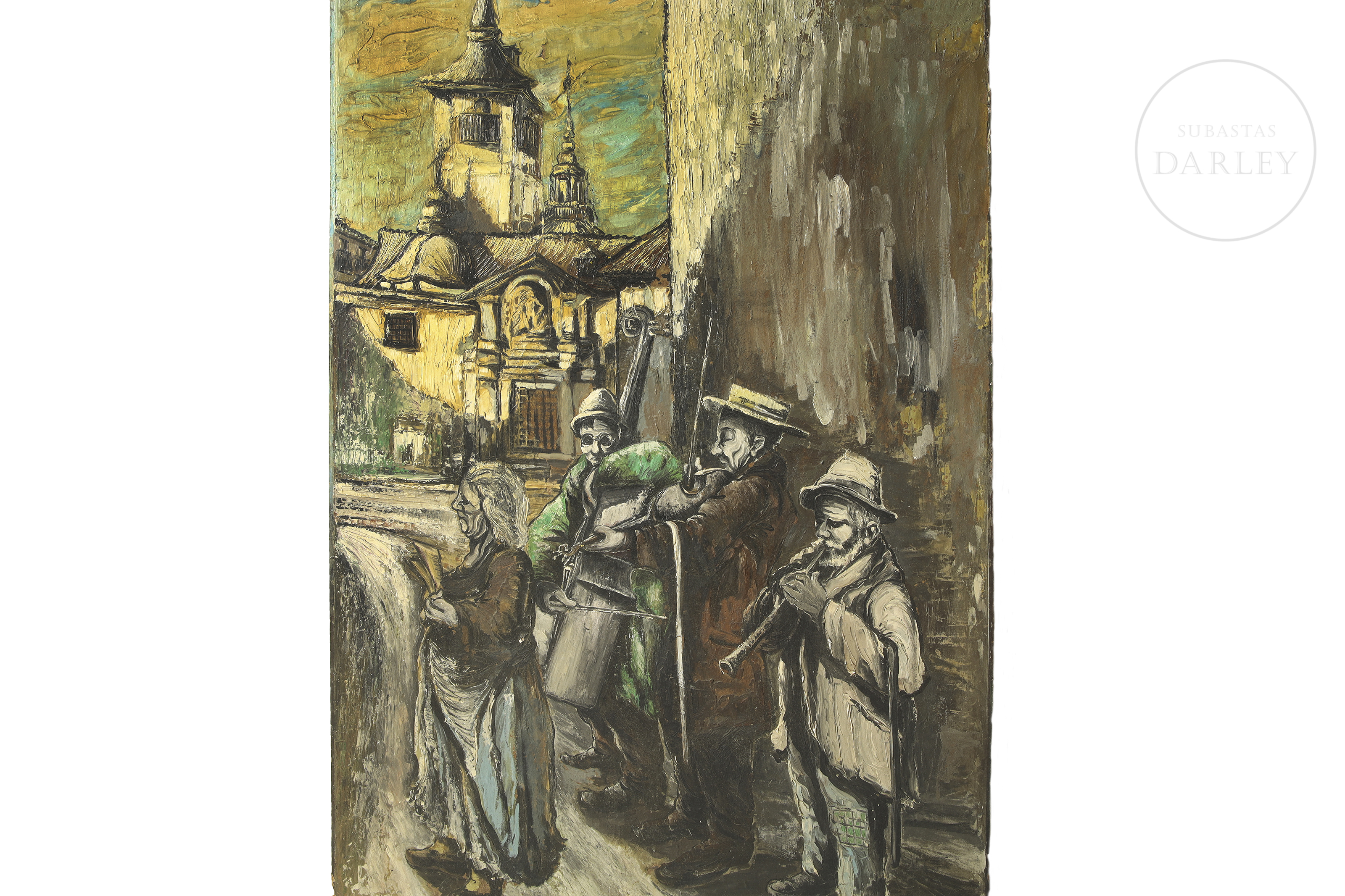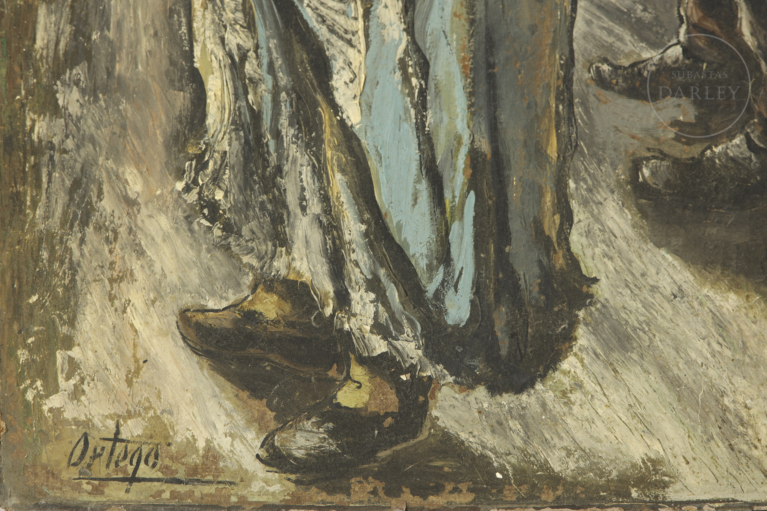 Óleo sobre tablex. Firmado, titulado y fechado "Música barata" por Julián Ortego. Juan de Austria nº4." en el reverso.