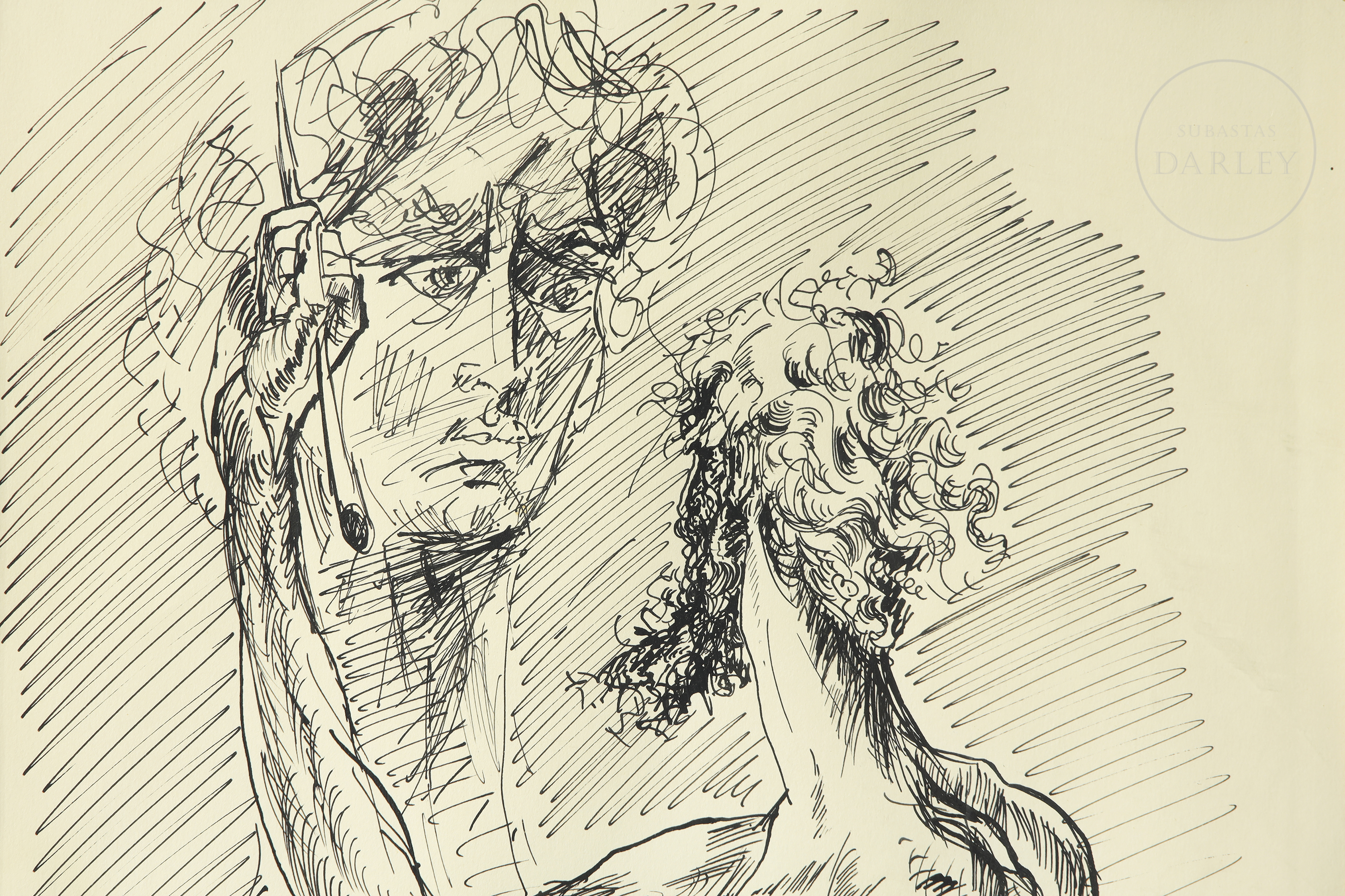 Tinta sobre papel, que rinde homenaje a Miguel Ángel a través de un lenguaje expresionista y reflexivo. La figura, desnuda y musculada, sostiene un rostro. Firmada, titulada y fechada “3-5-75” en la esquina inferior izquierda.