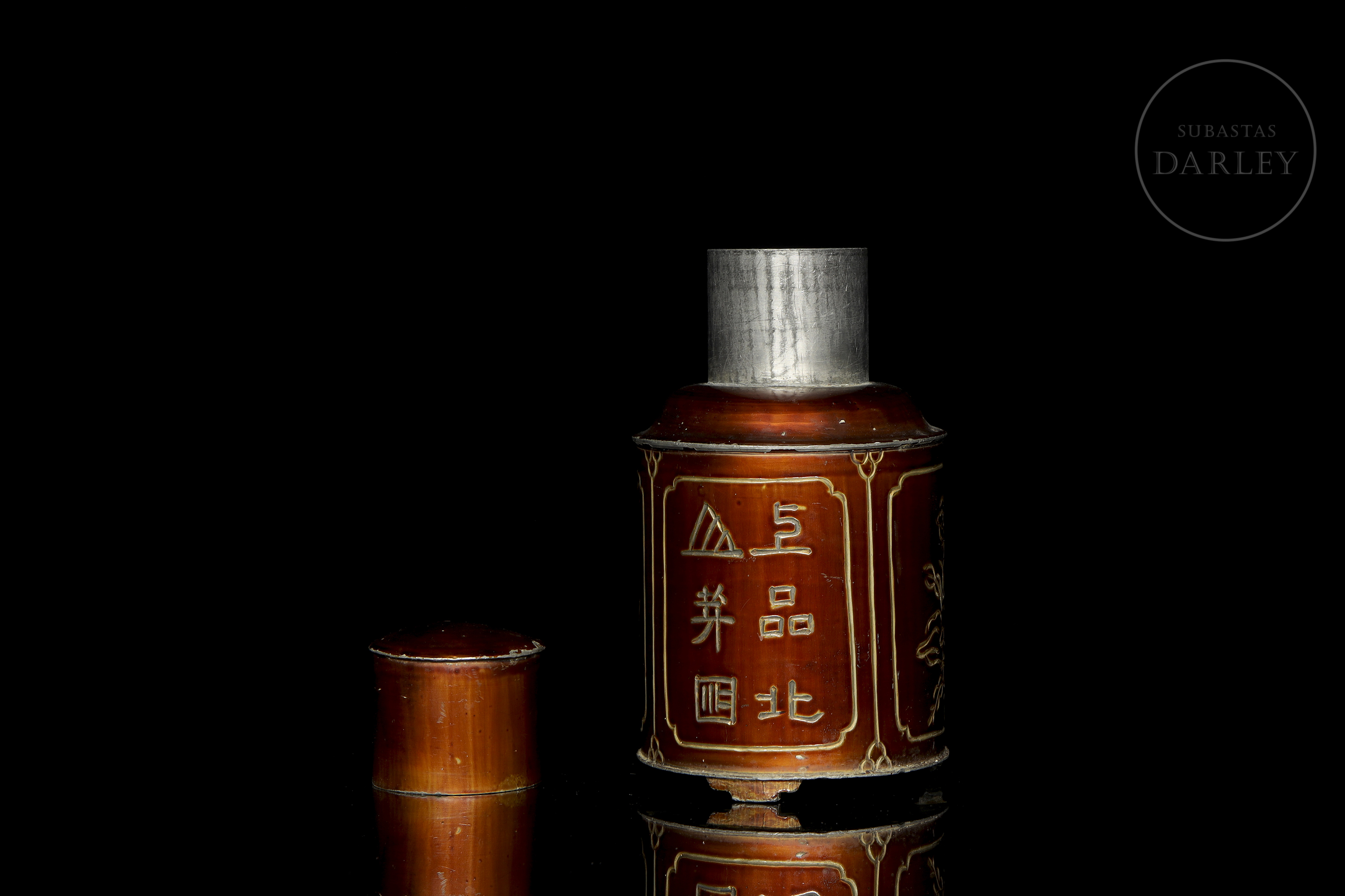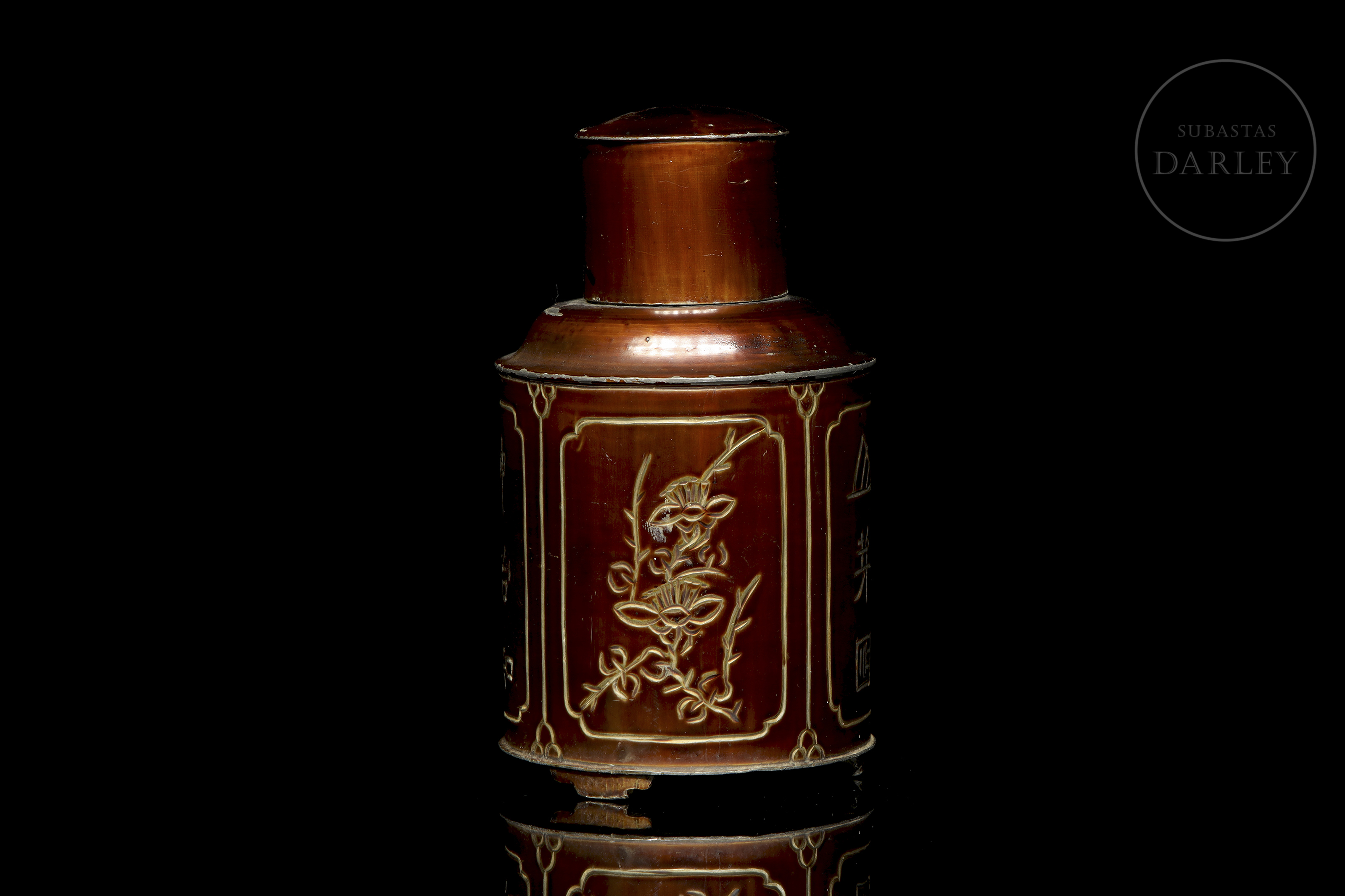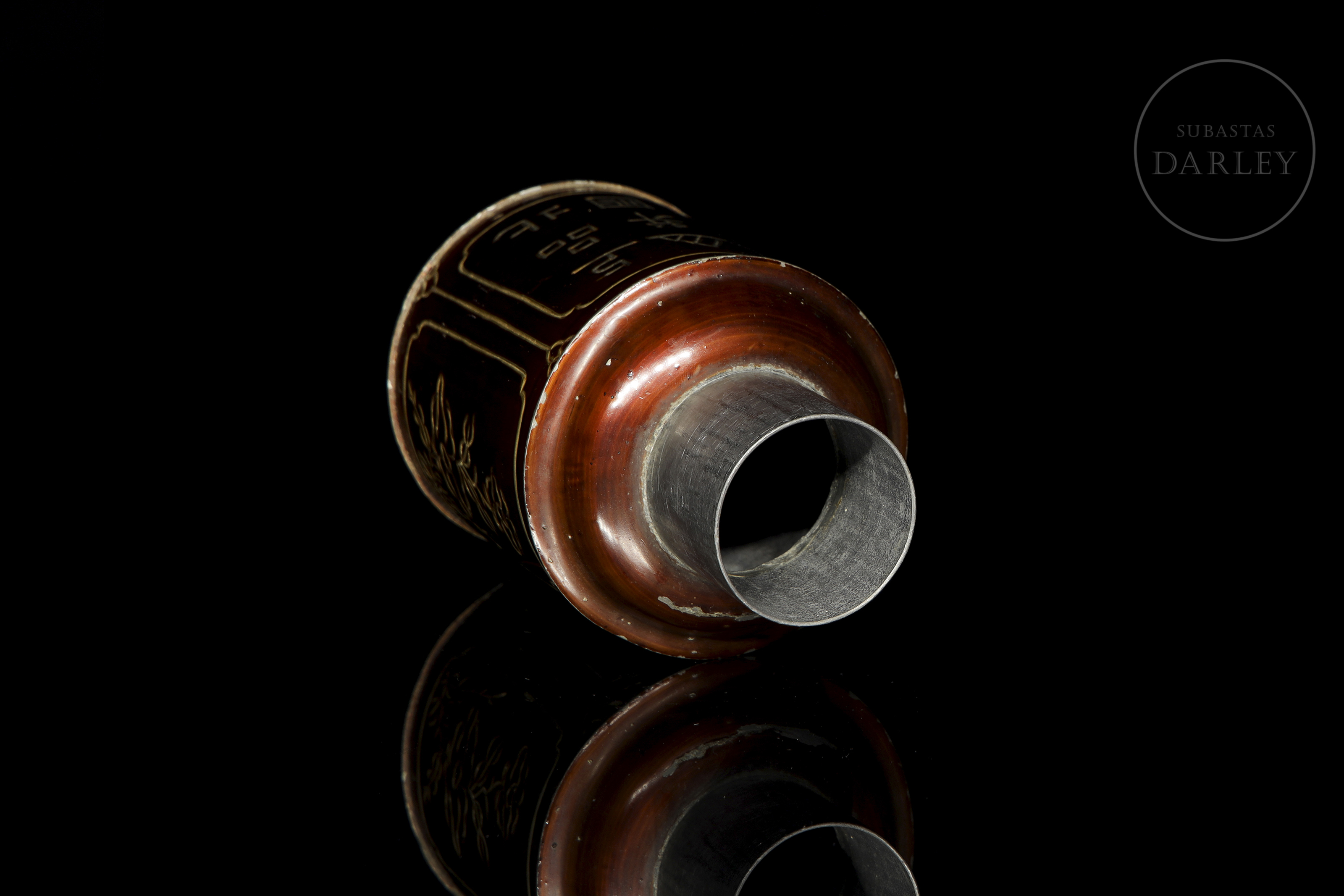 Metal esmaltado con laca en color marrón rojizo. Posee un cuerpo cilíndrico con hombros y cuello marcados, cubiertos por una tapa extraíble. Está decorada con paneles de motivos florales y caracteres chinos realizados mediante líneas incisas sobre la laca.