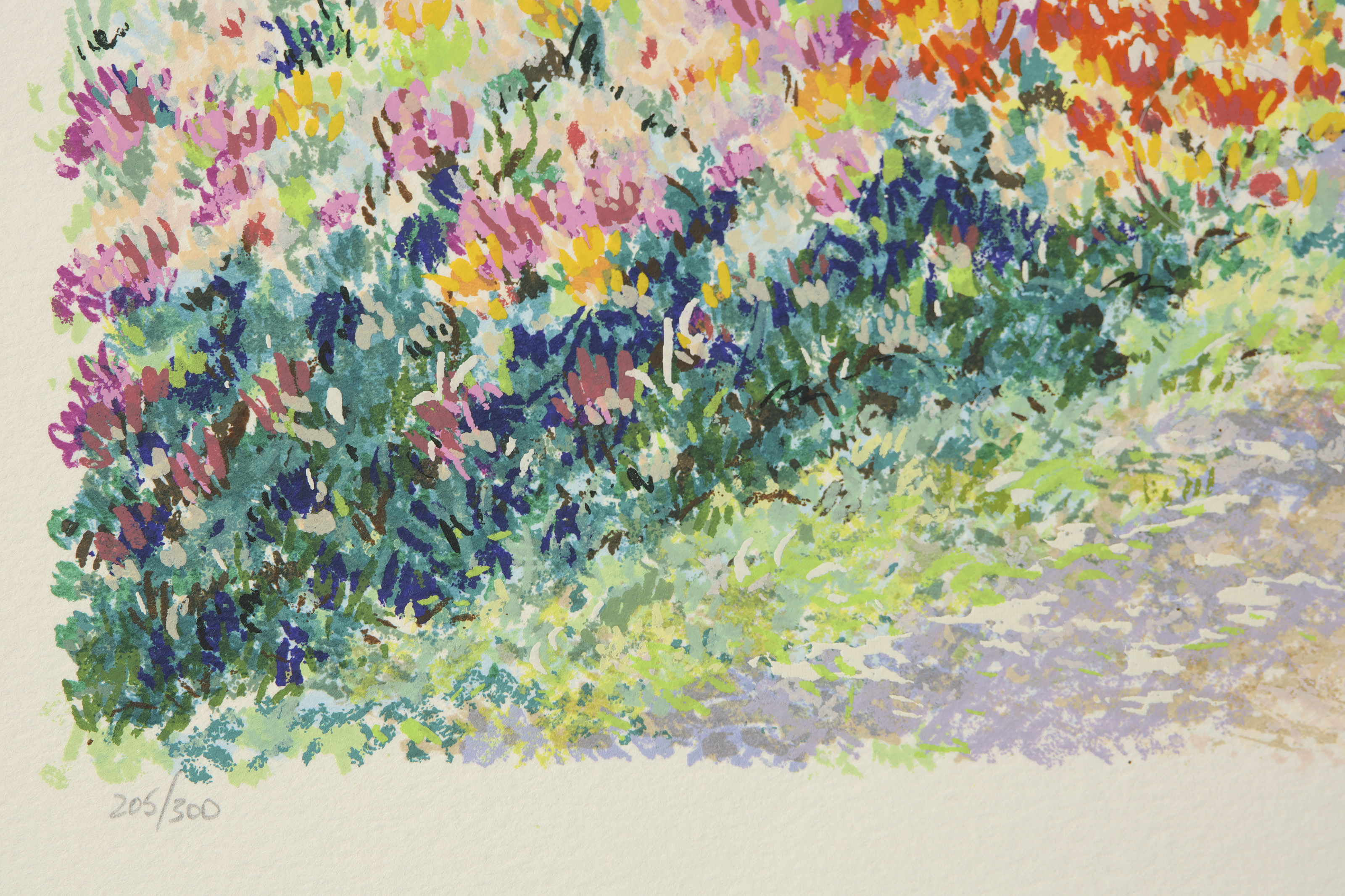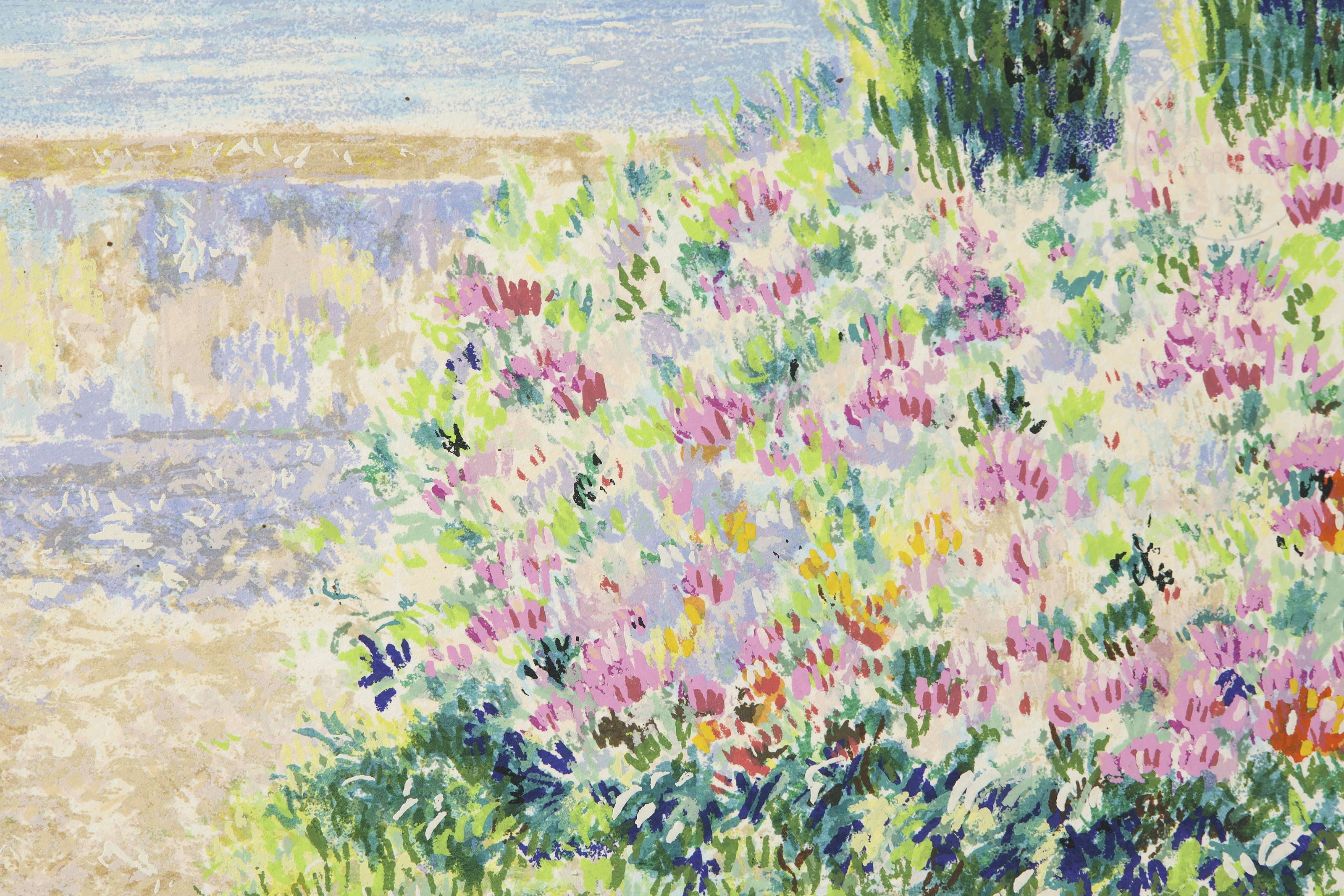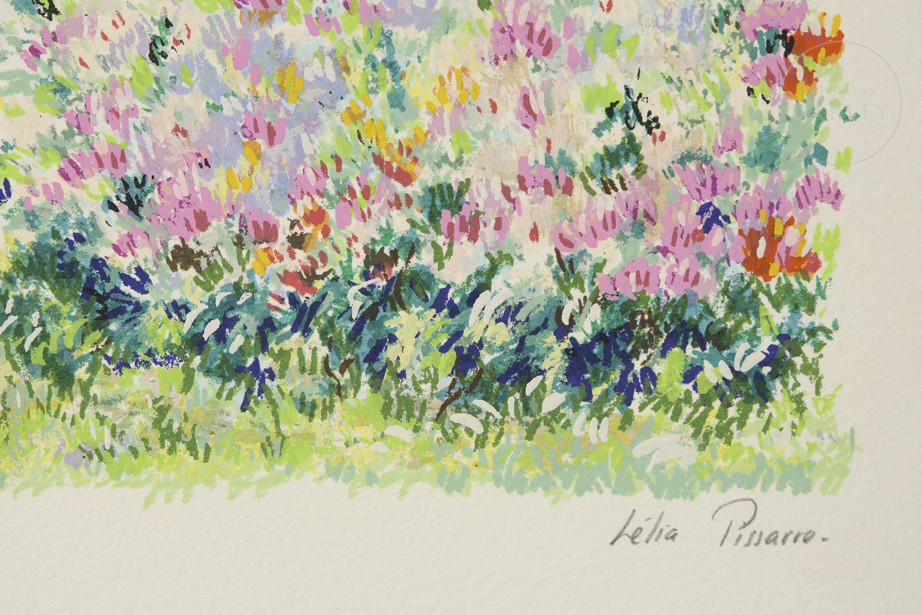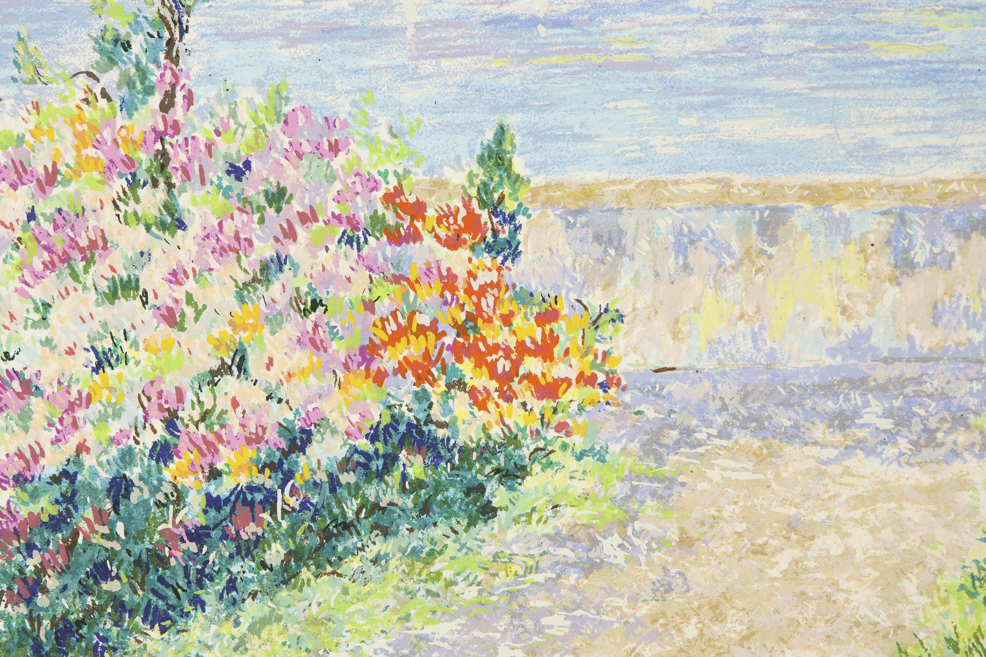 Serigrafía sobre papel. Muestra un hermoso y colorido paisaje, siguiendo los modelos impresionistas franceses, Firmado ''Leila Pissarro'' en la esquina inferior derecha. Numerado "205/300" en la esquina inferior izquierda.