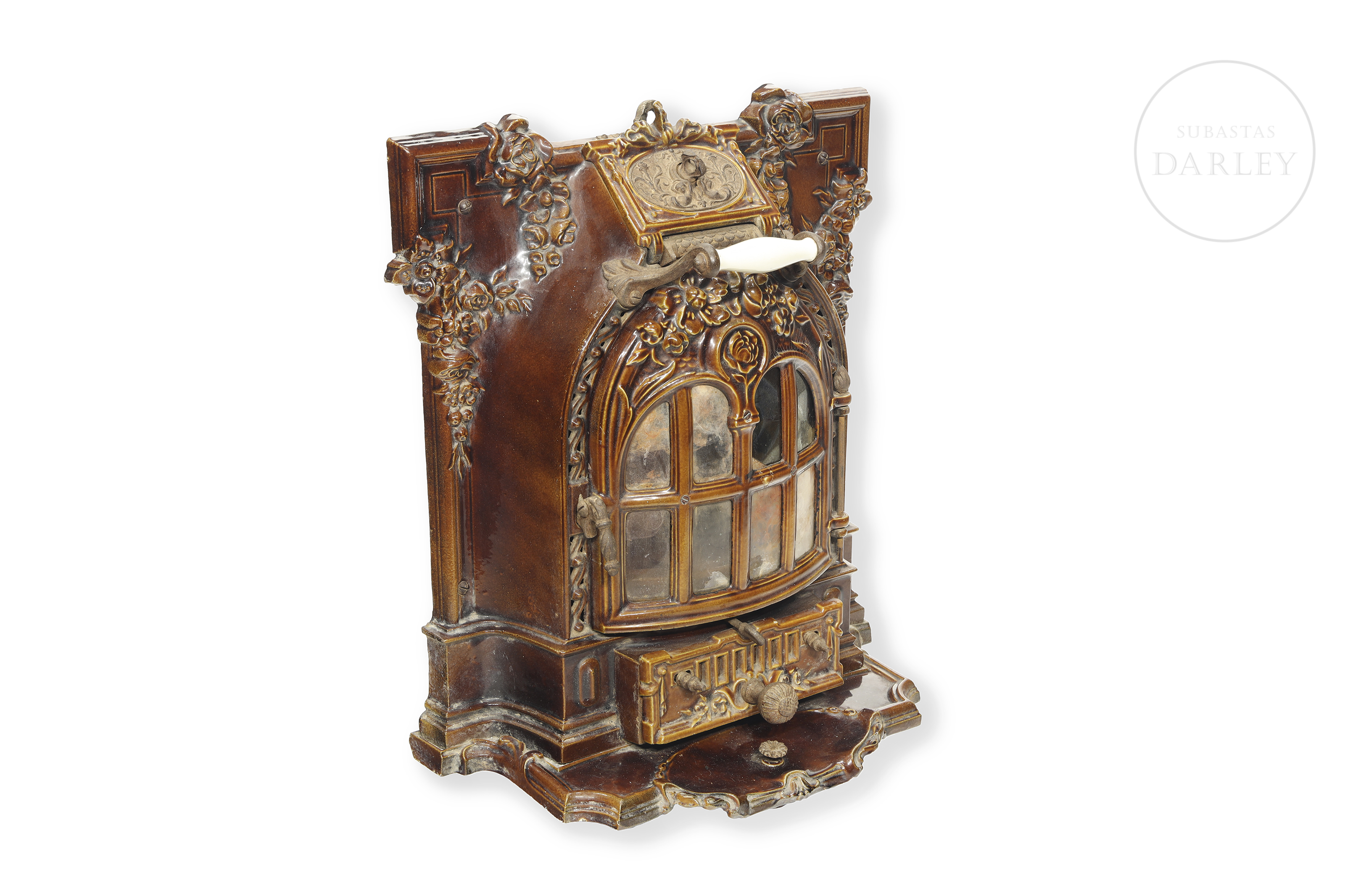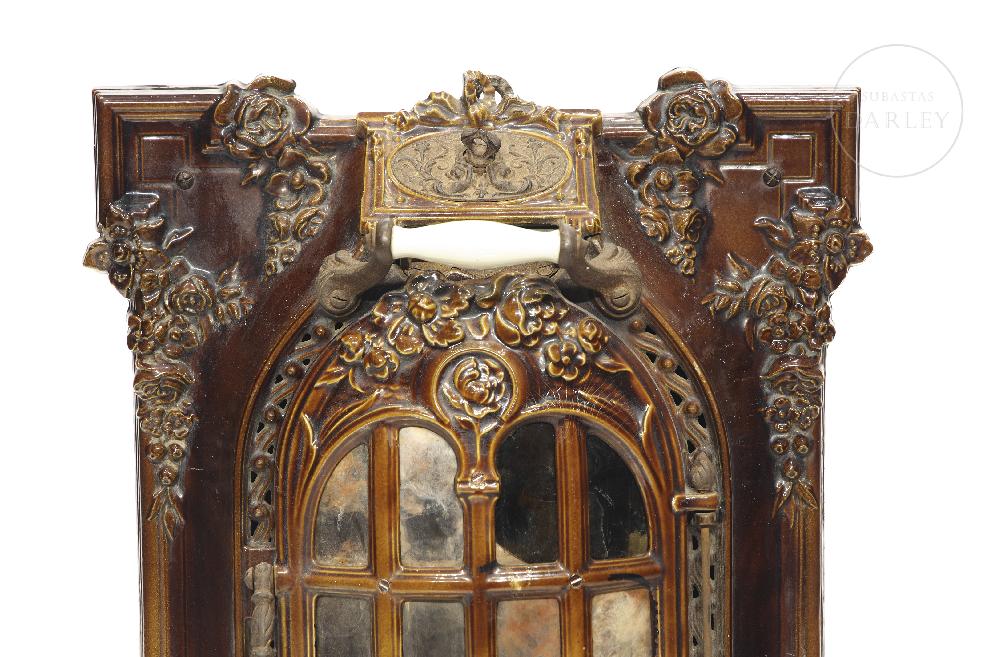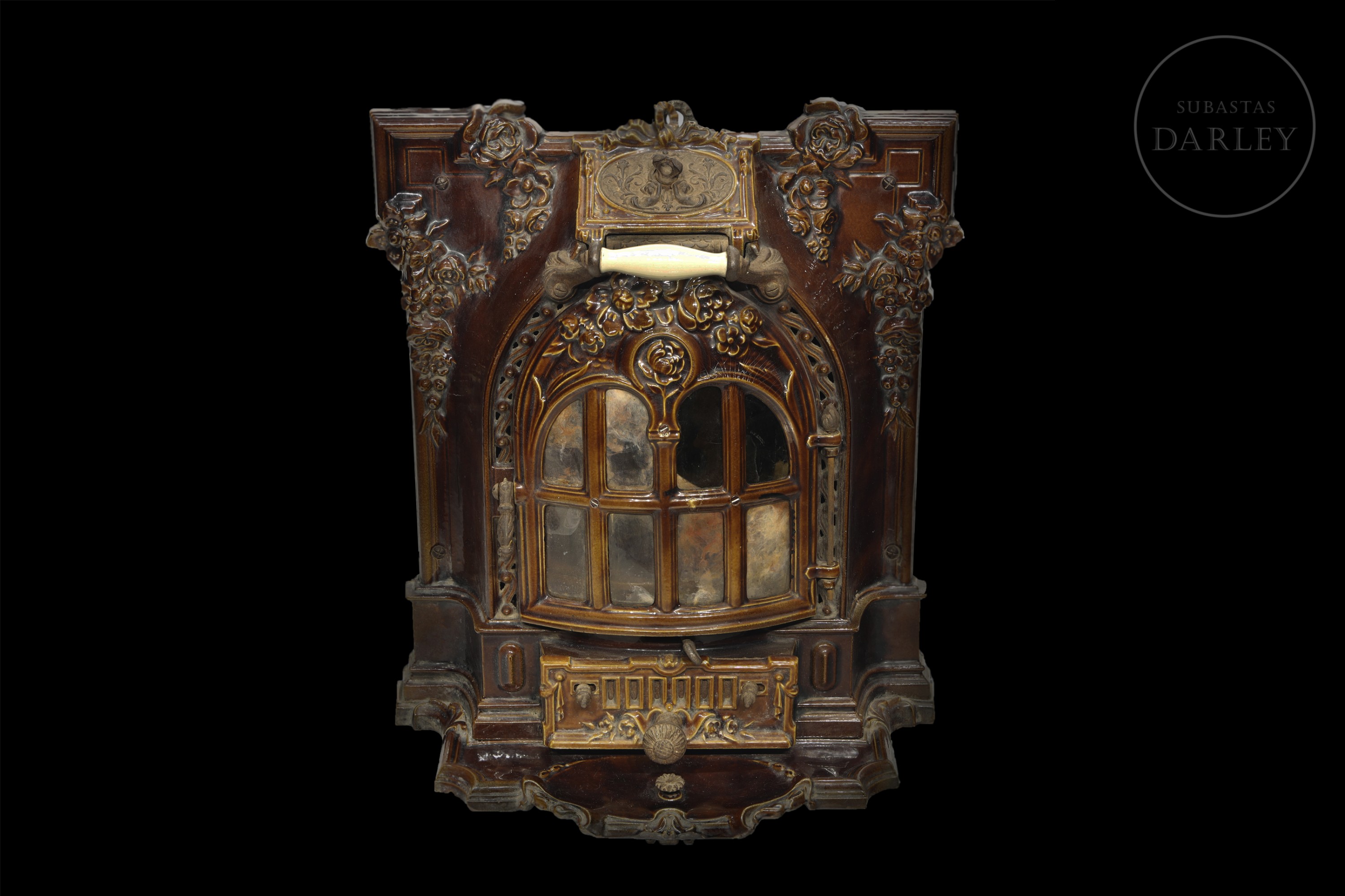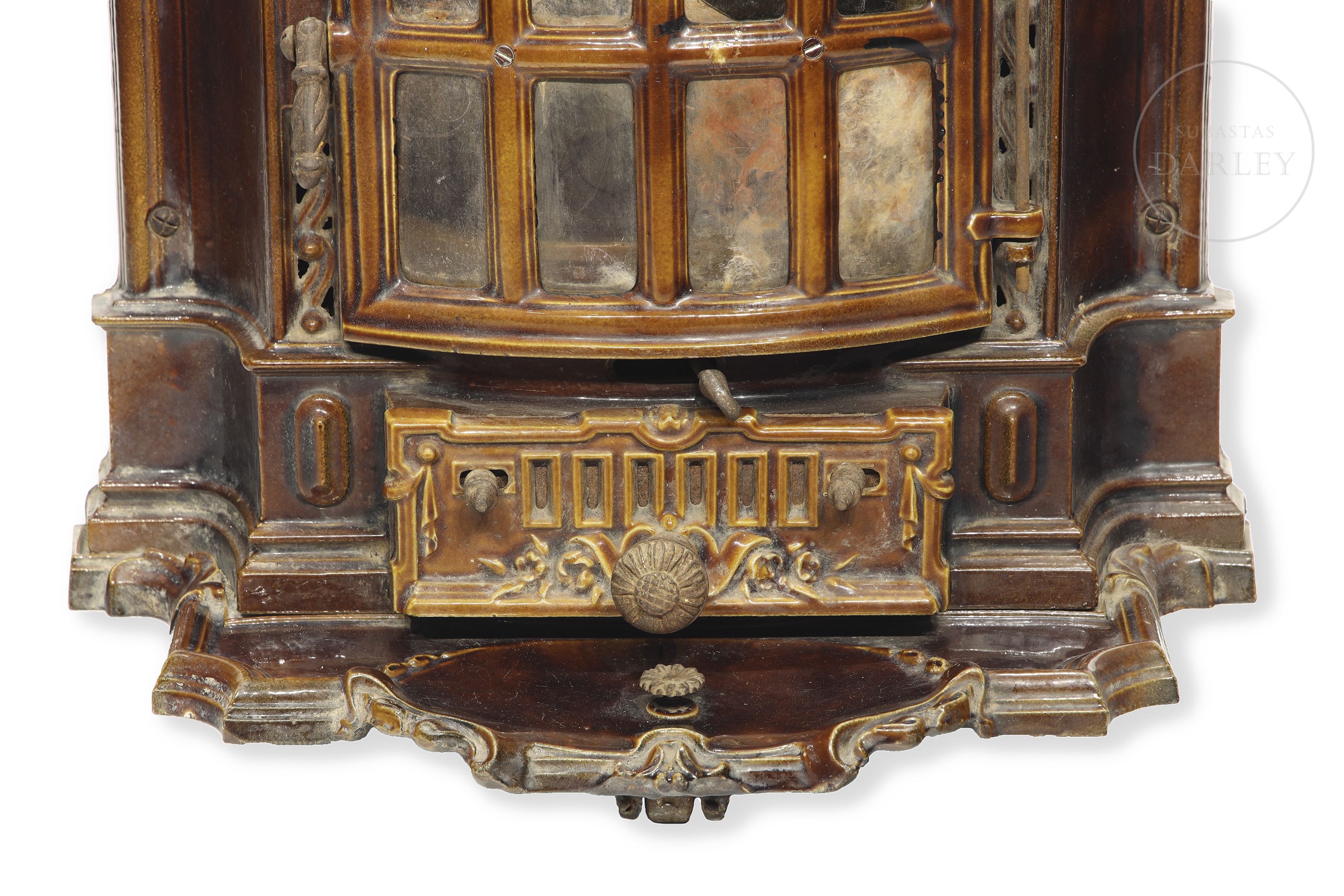 Estufa de combustión lenta (salamandra) diseñada originalmente para quemar carbón o leña. De diseño Art Nouveau y fabricada por Lent-Moyen íntegramente en hierro fundido y acabado de hierro esmaltado o vidriado en colores como marrón.