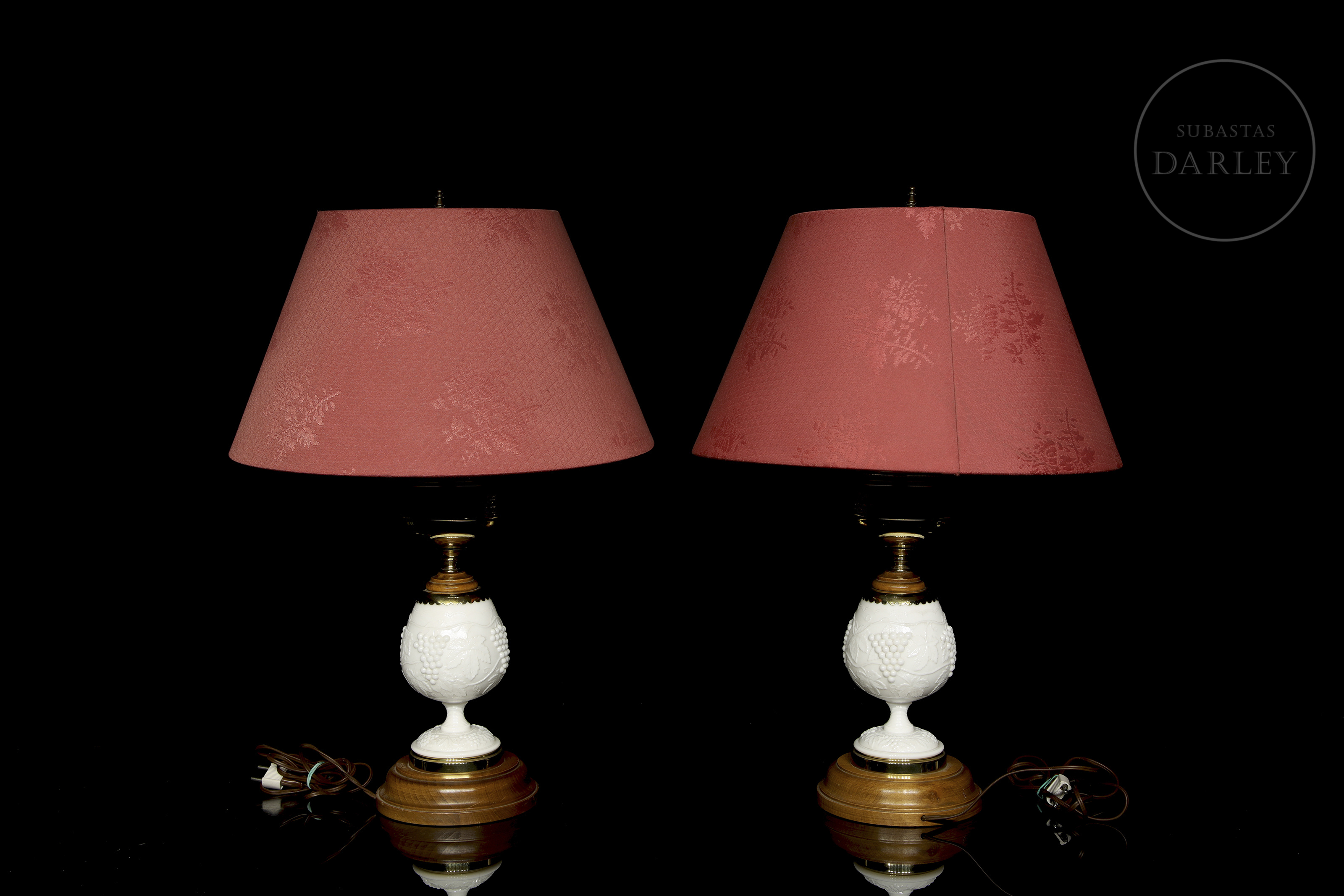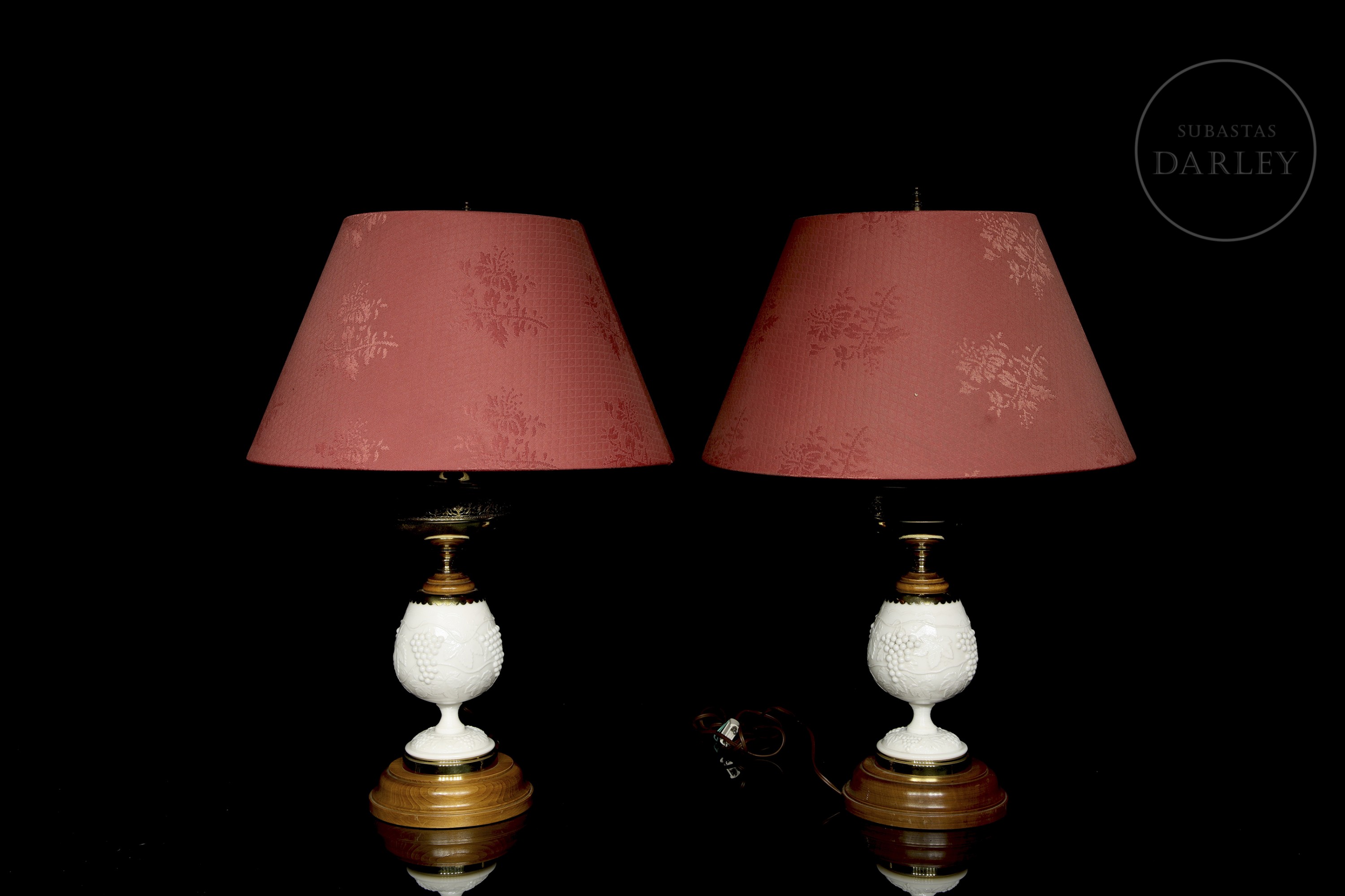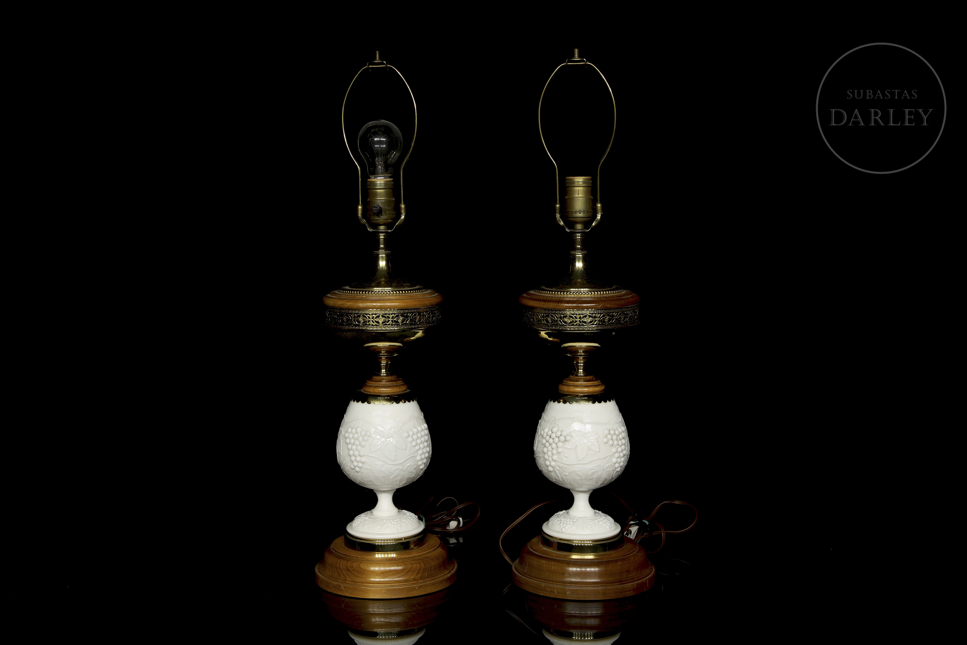 Pareja de lámparas de mesa de producción Norte Americana por la casa Levinton, con pie adornado por cristal de opalina blanco con un diseño en relieve de uvas en rama. Ambas lámparas descansan sobre una peana o base de madera.