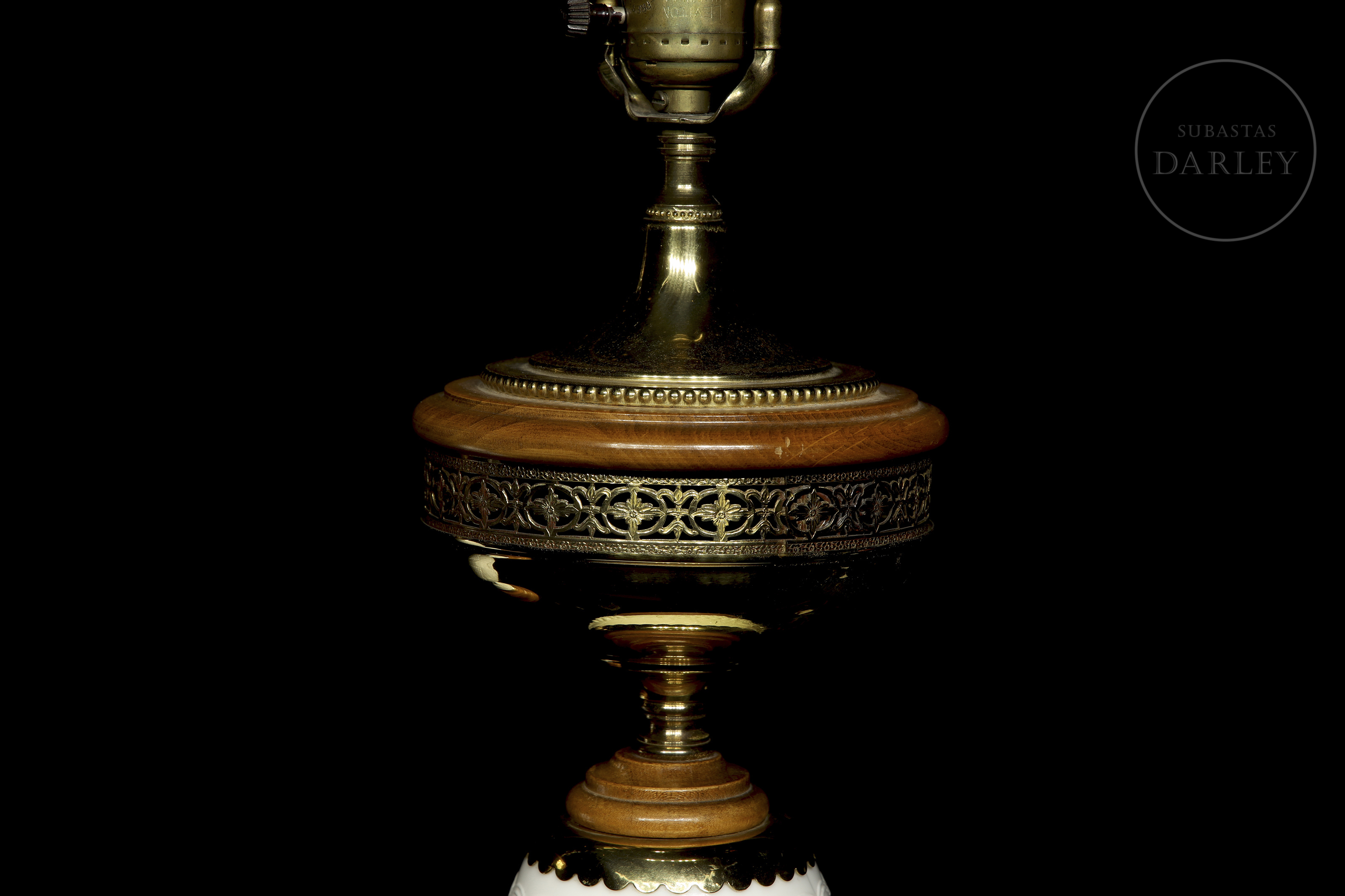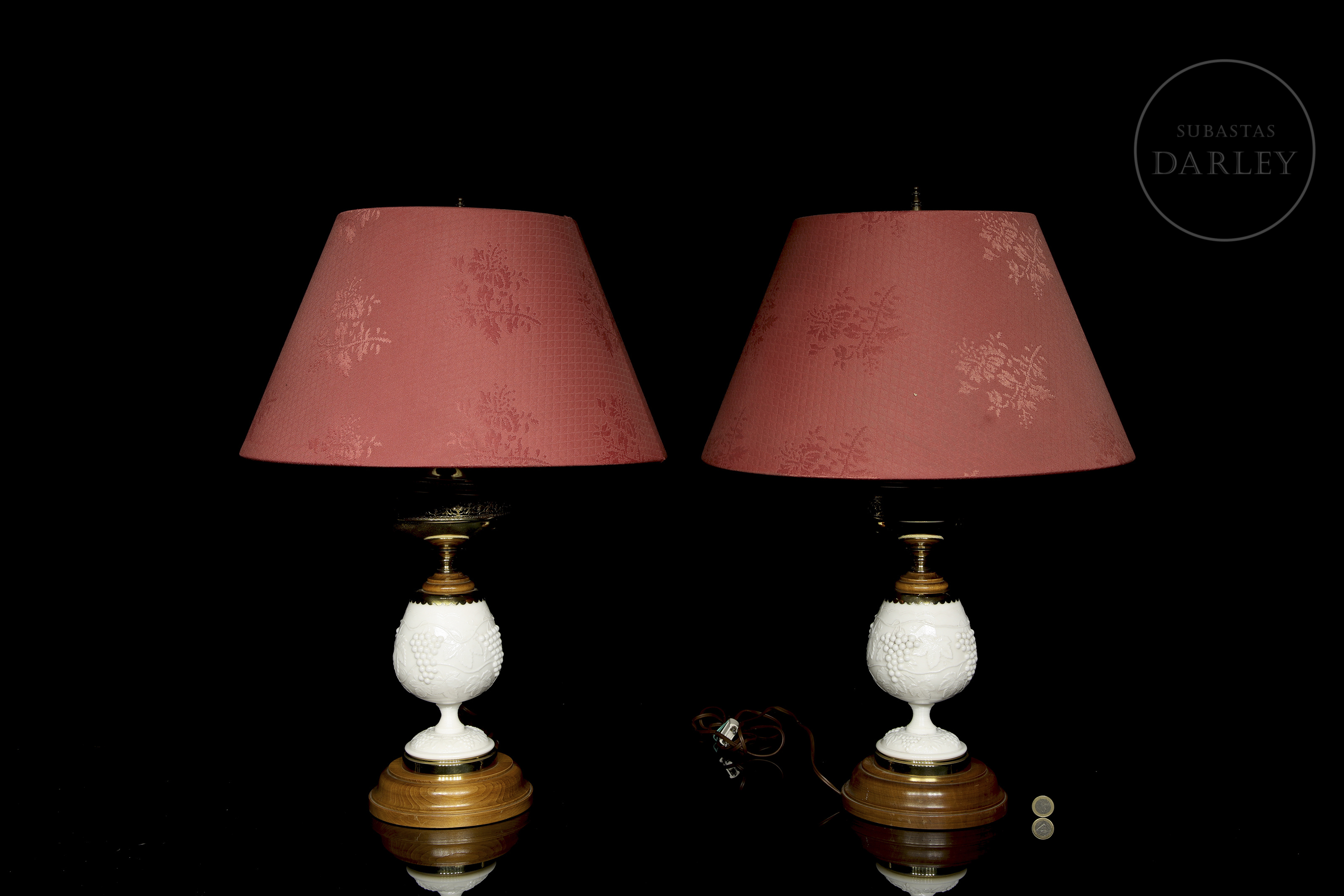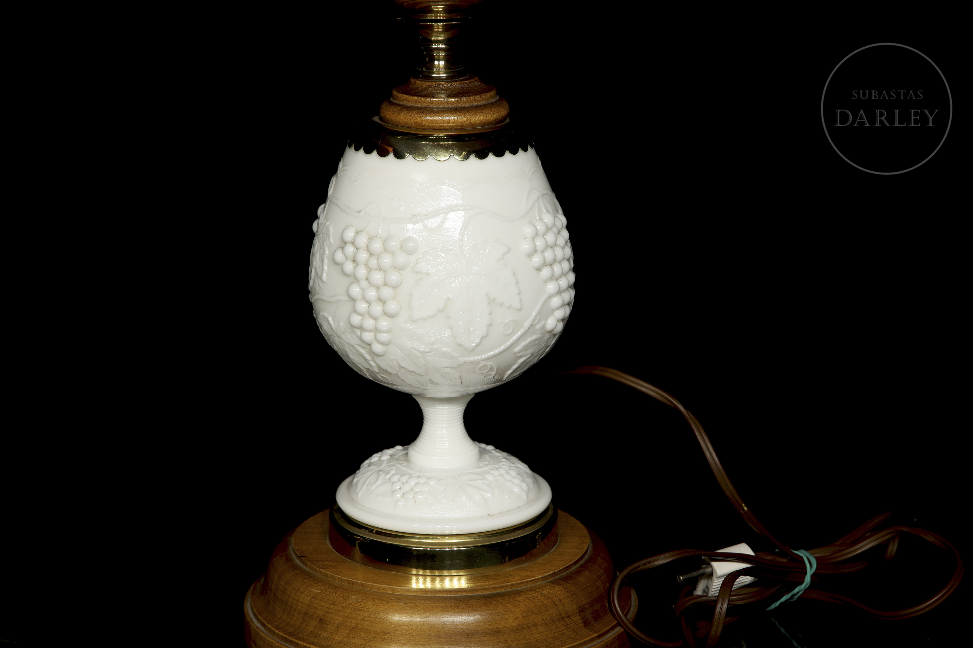 Pareja de lámparas de mesa de producción Norte Americana por la casa Levinton, con pie adornado por cristal de opalina blanco con un diseño en relieve de uvas en rama. Ambas lámparas descansan sobre una peana o base de madera.