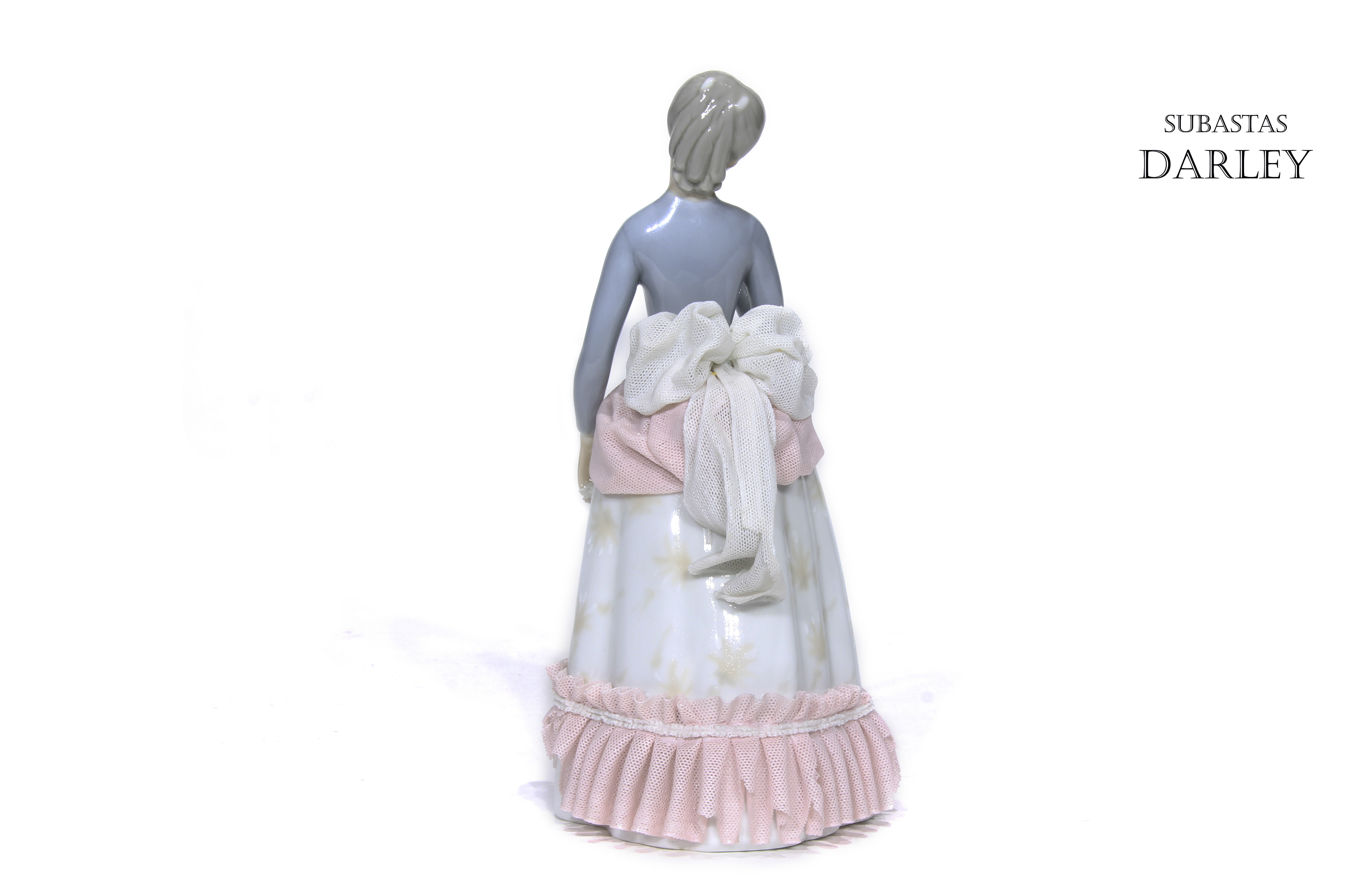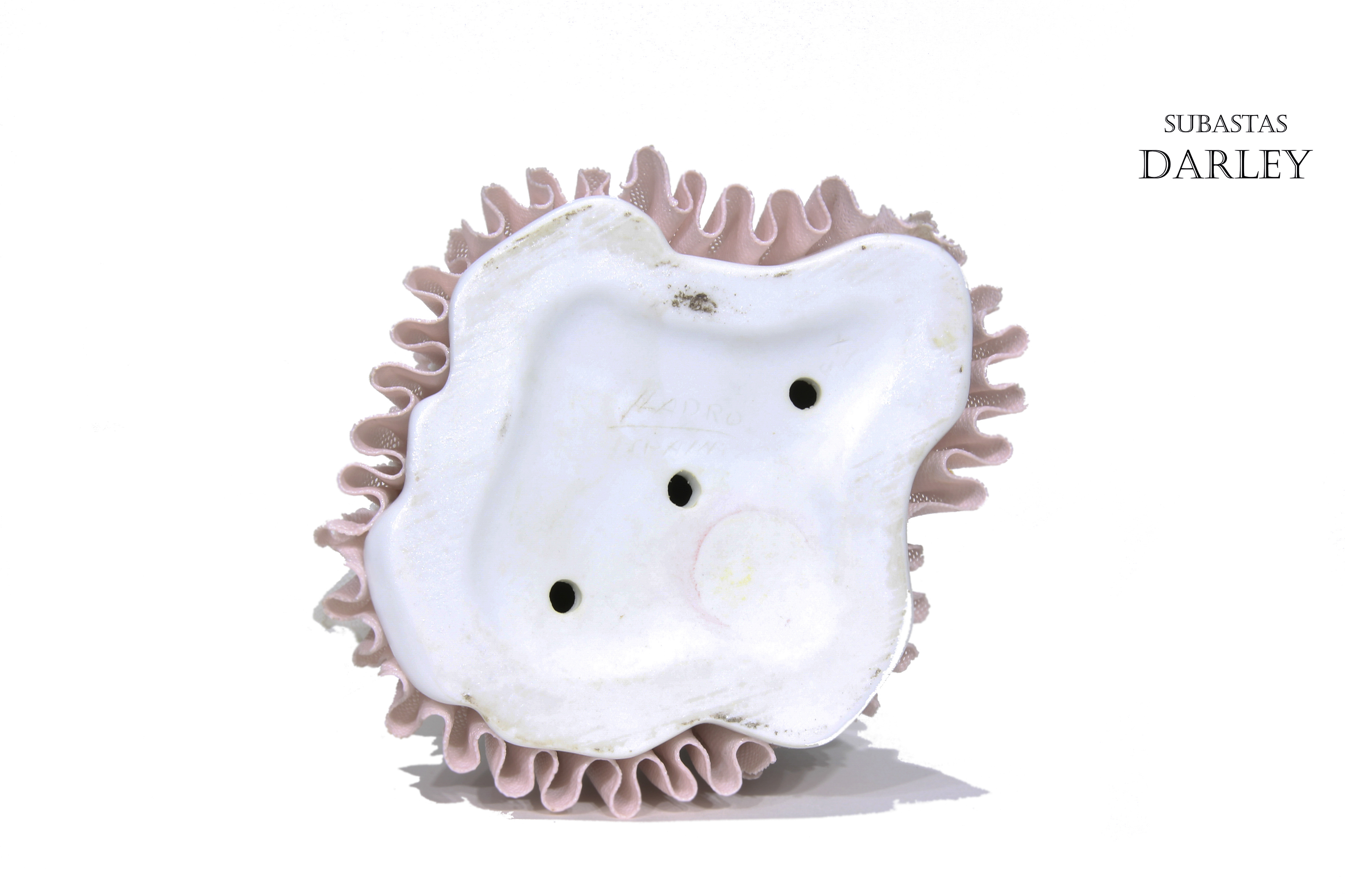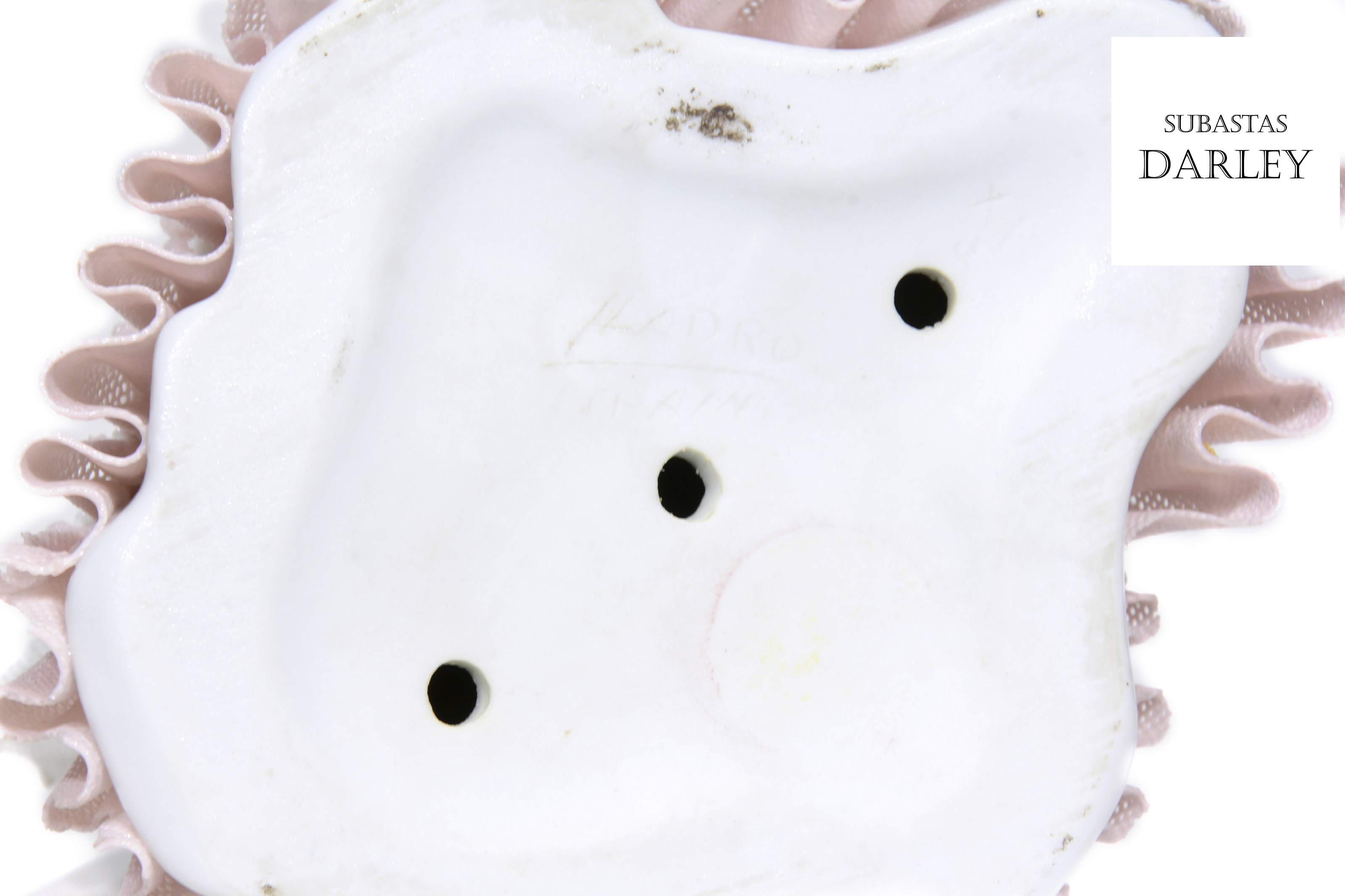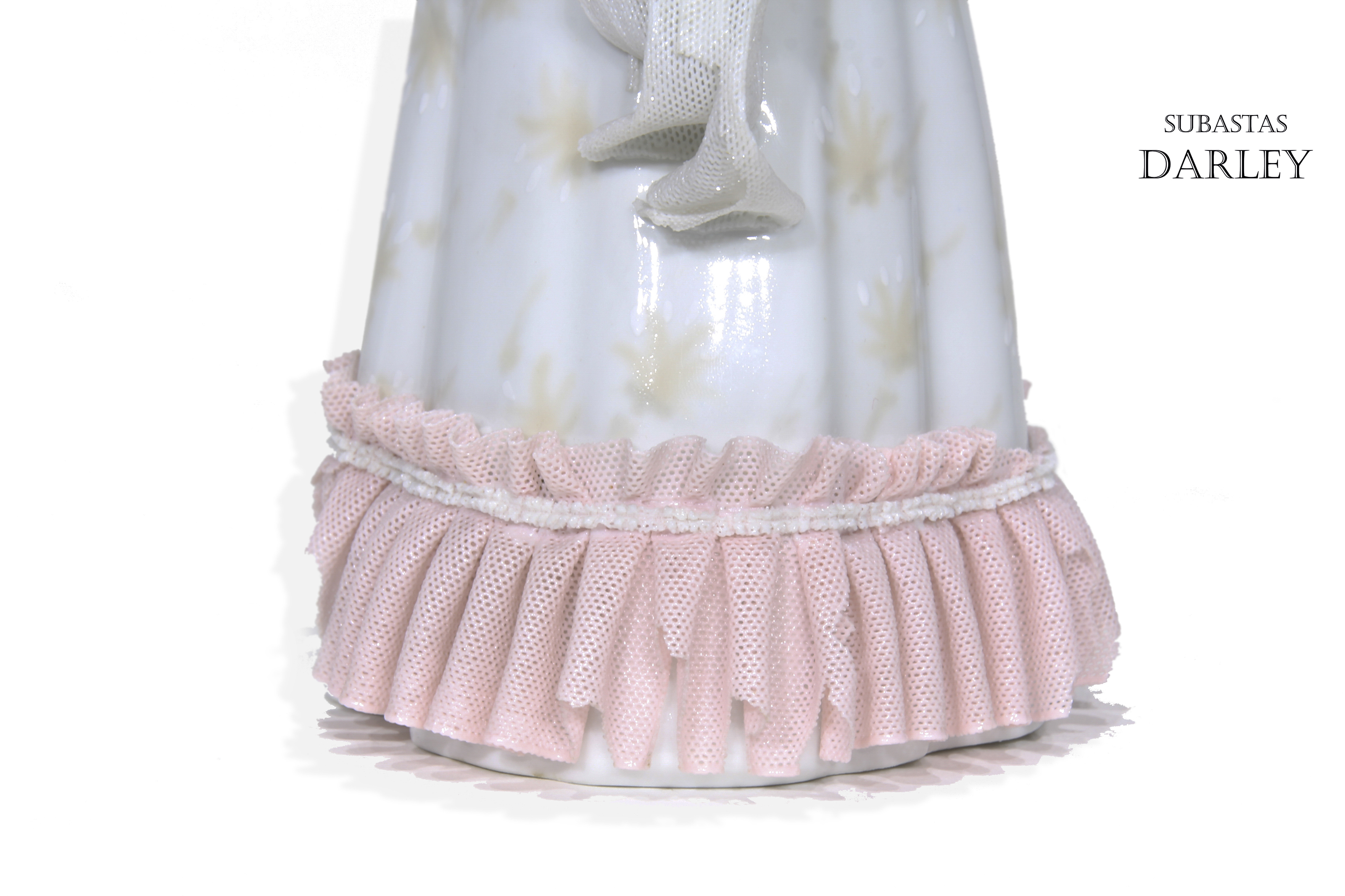 Porcelana brillo. Sellado en la base. Presenta desperfectos en la falda y falta un elemento (paraguas).