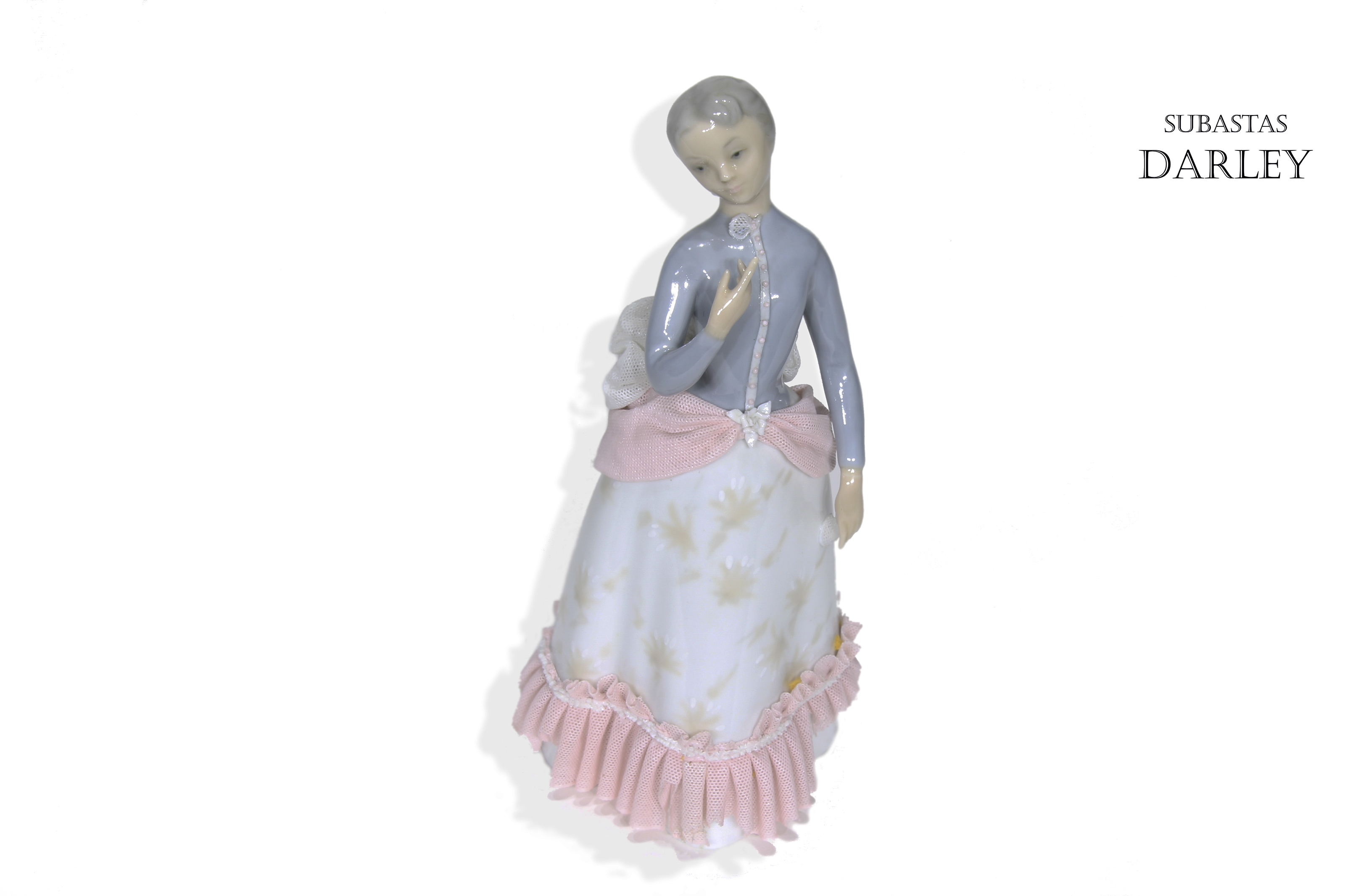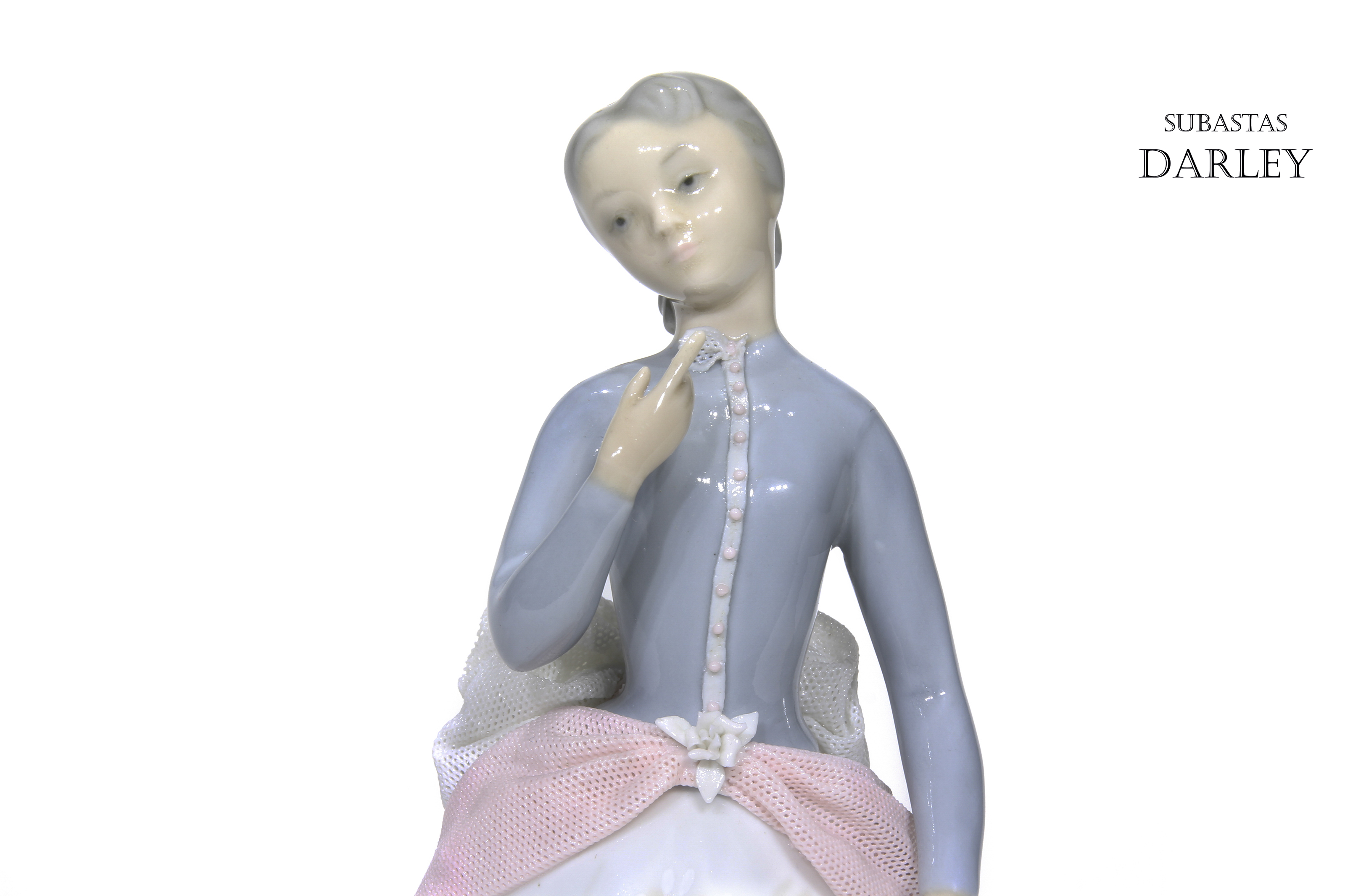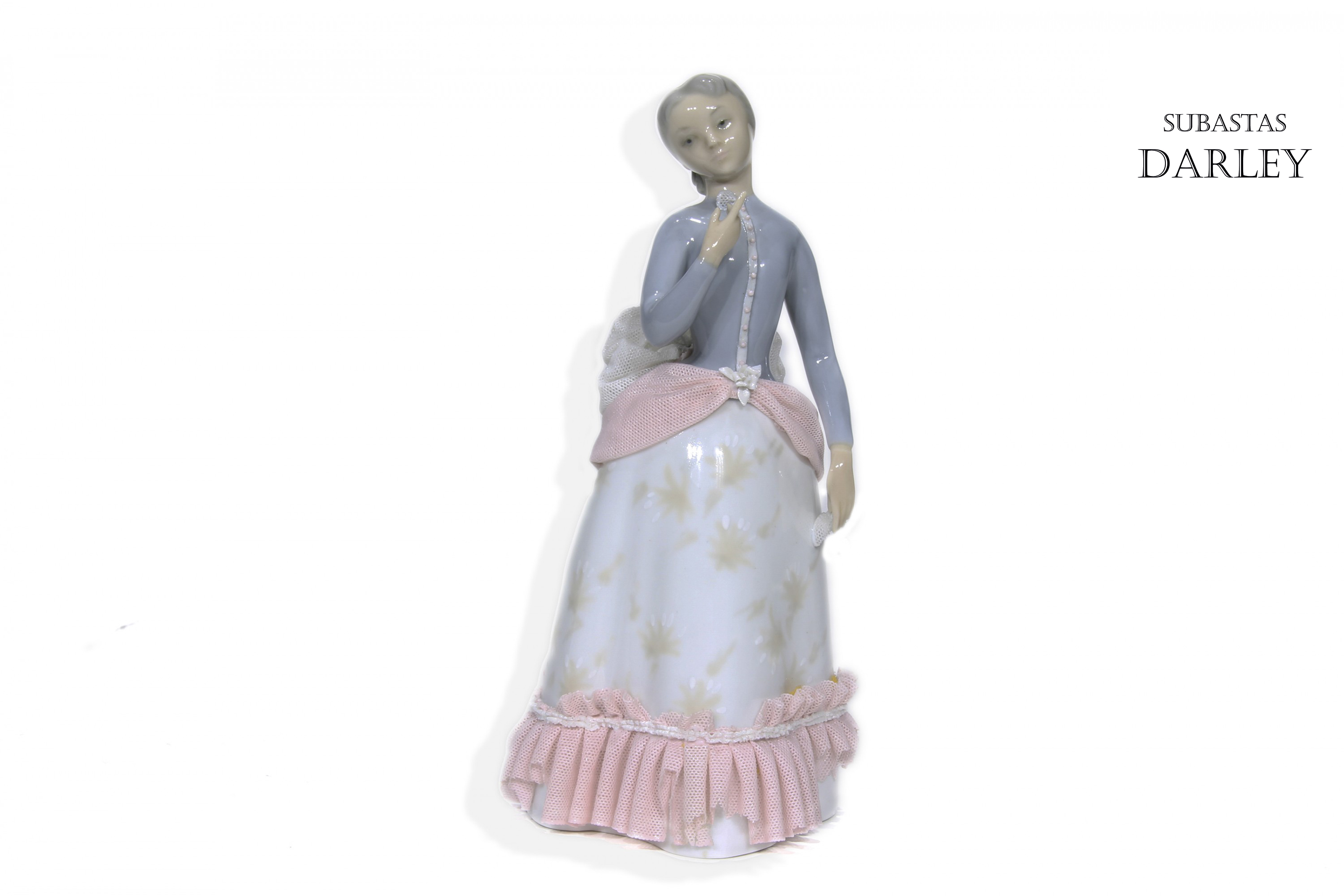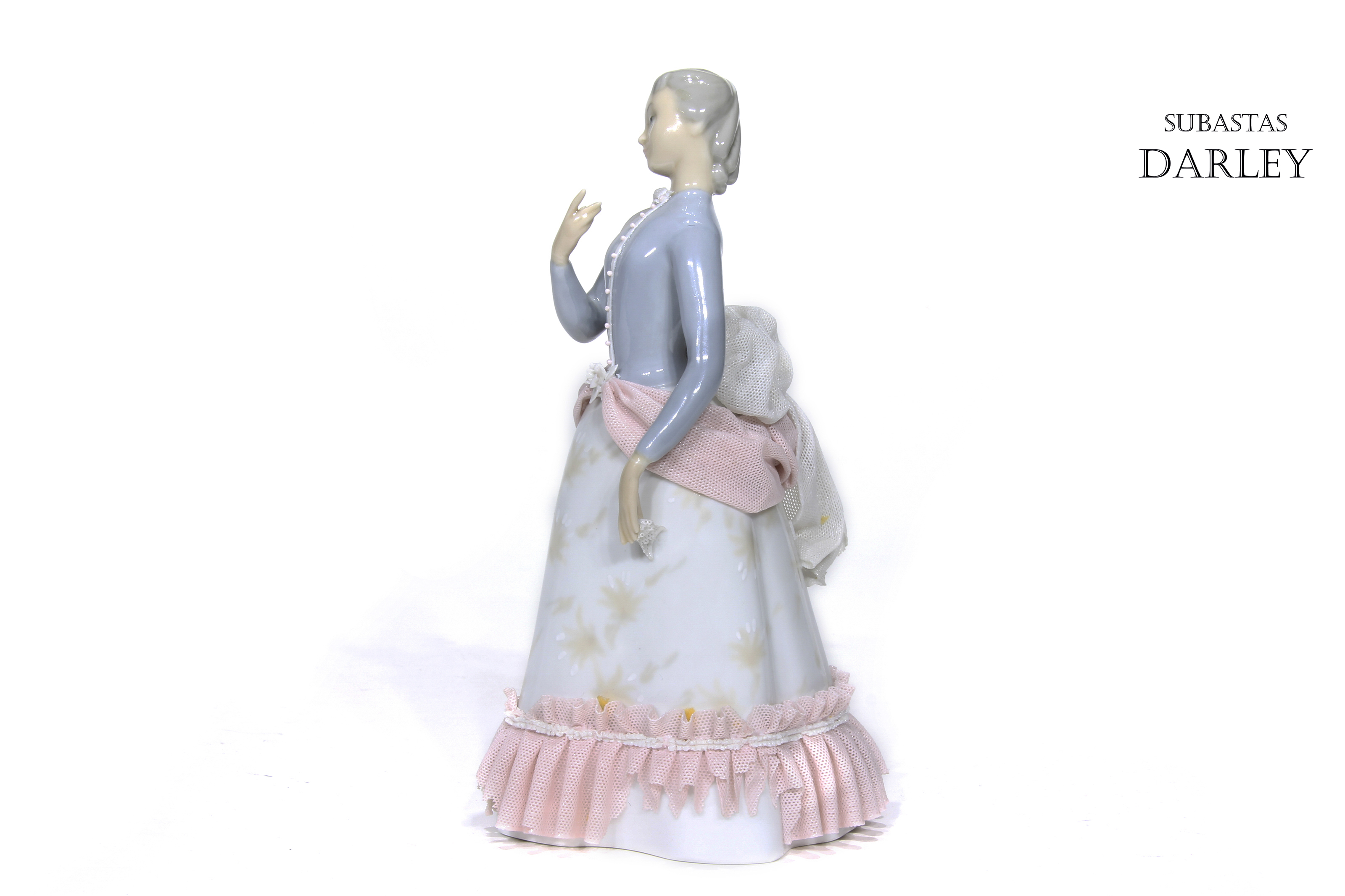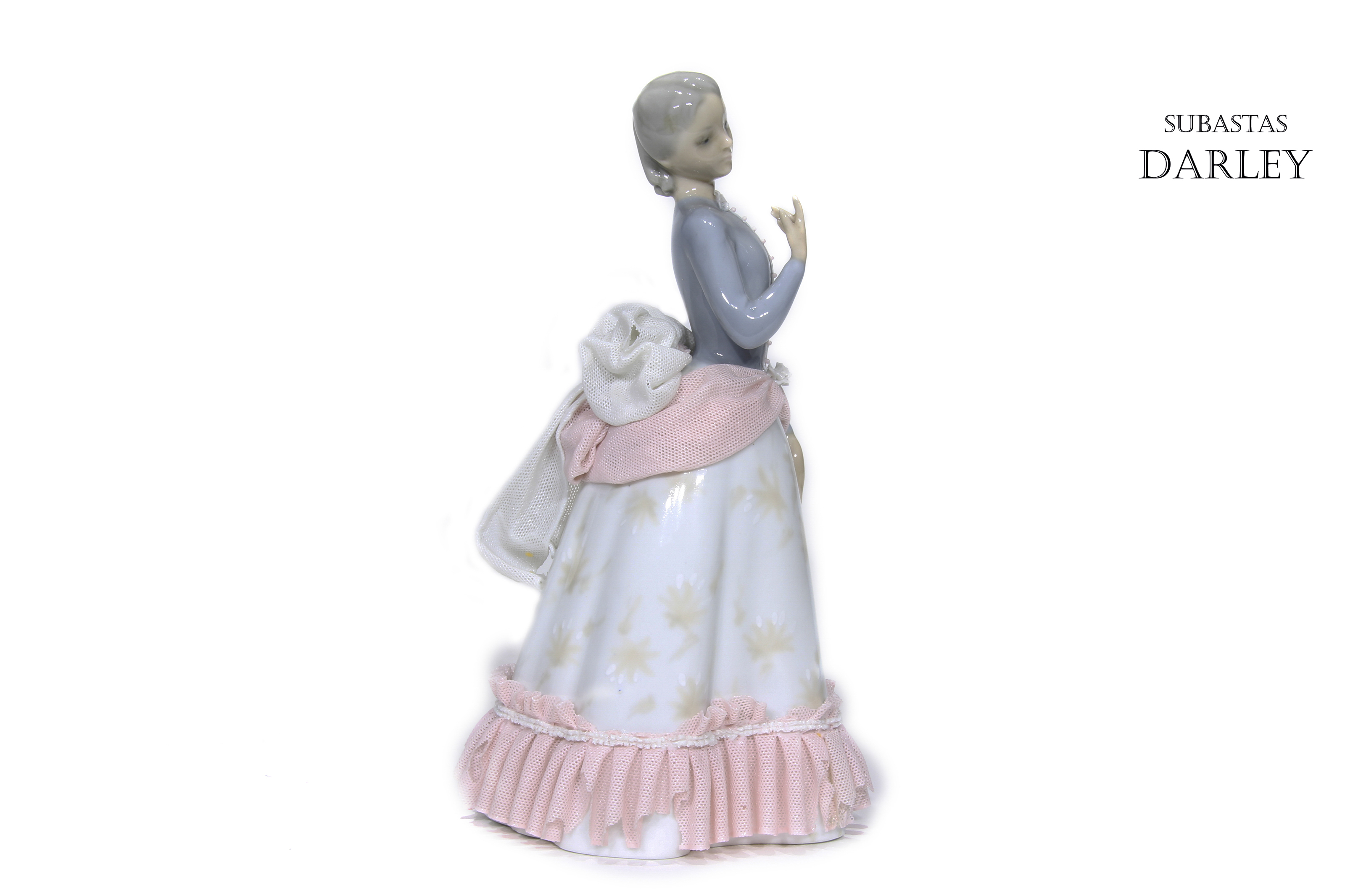Porcelana brillo. Sellado en la base. Presenta desperfectos en la falda y falta un elemento (paraguas).