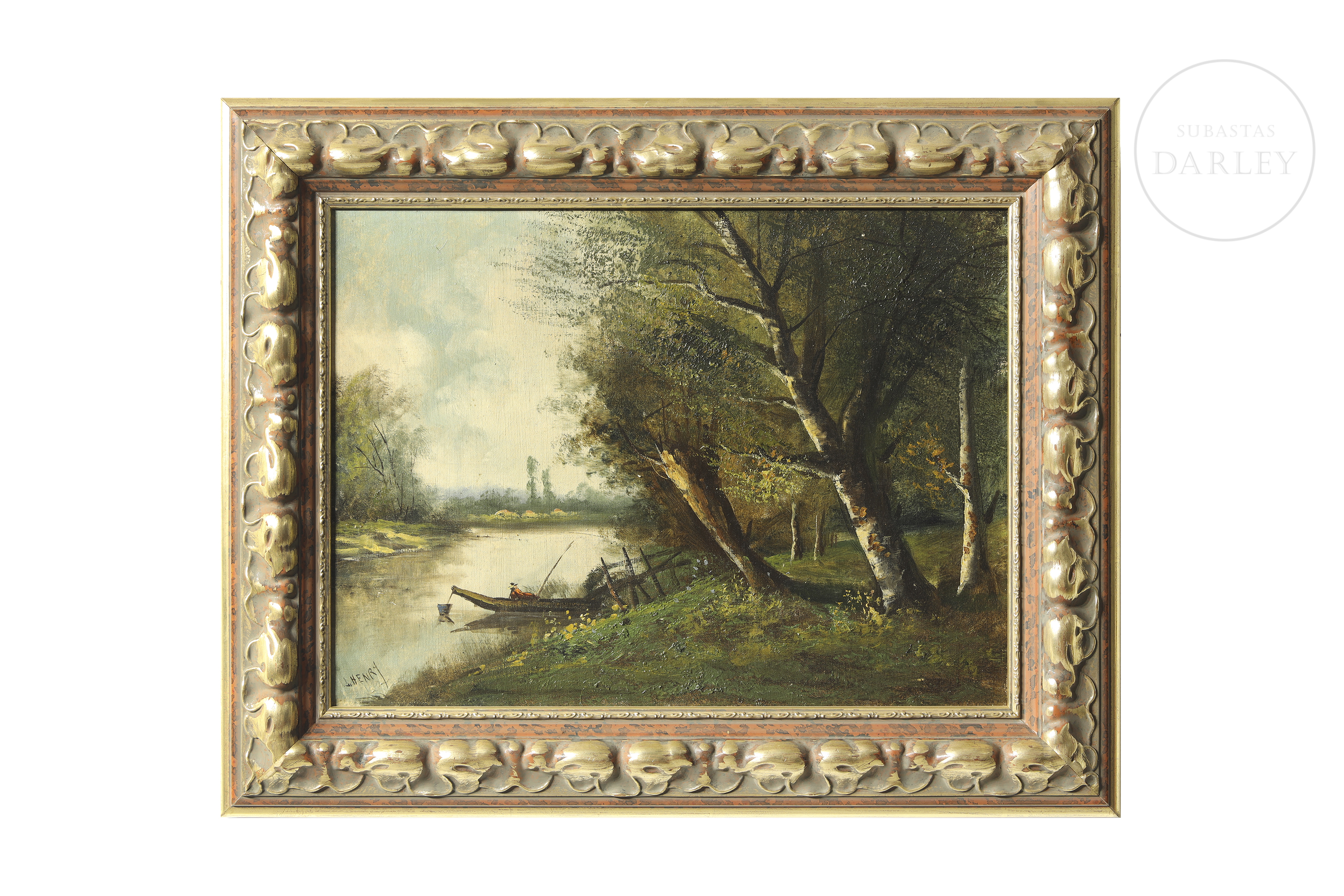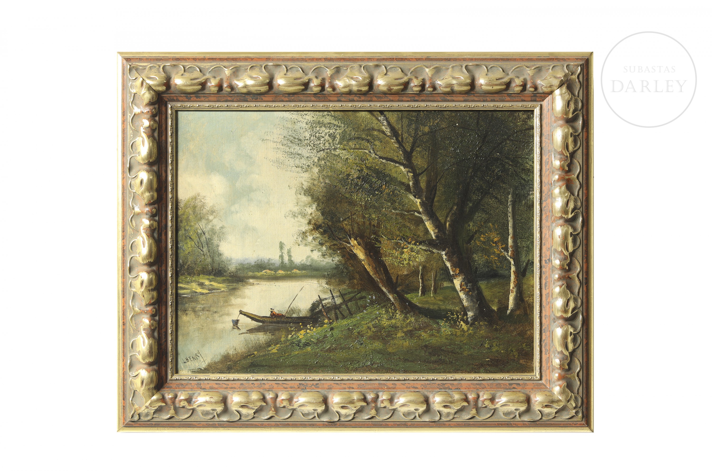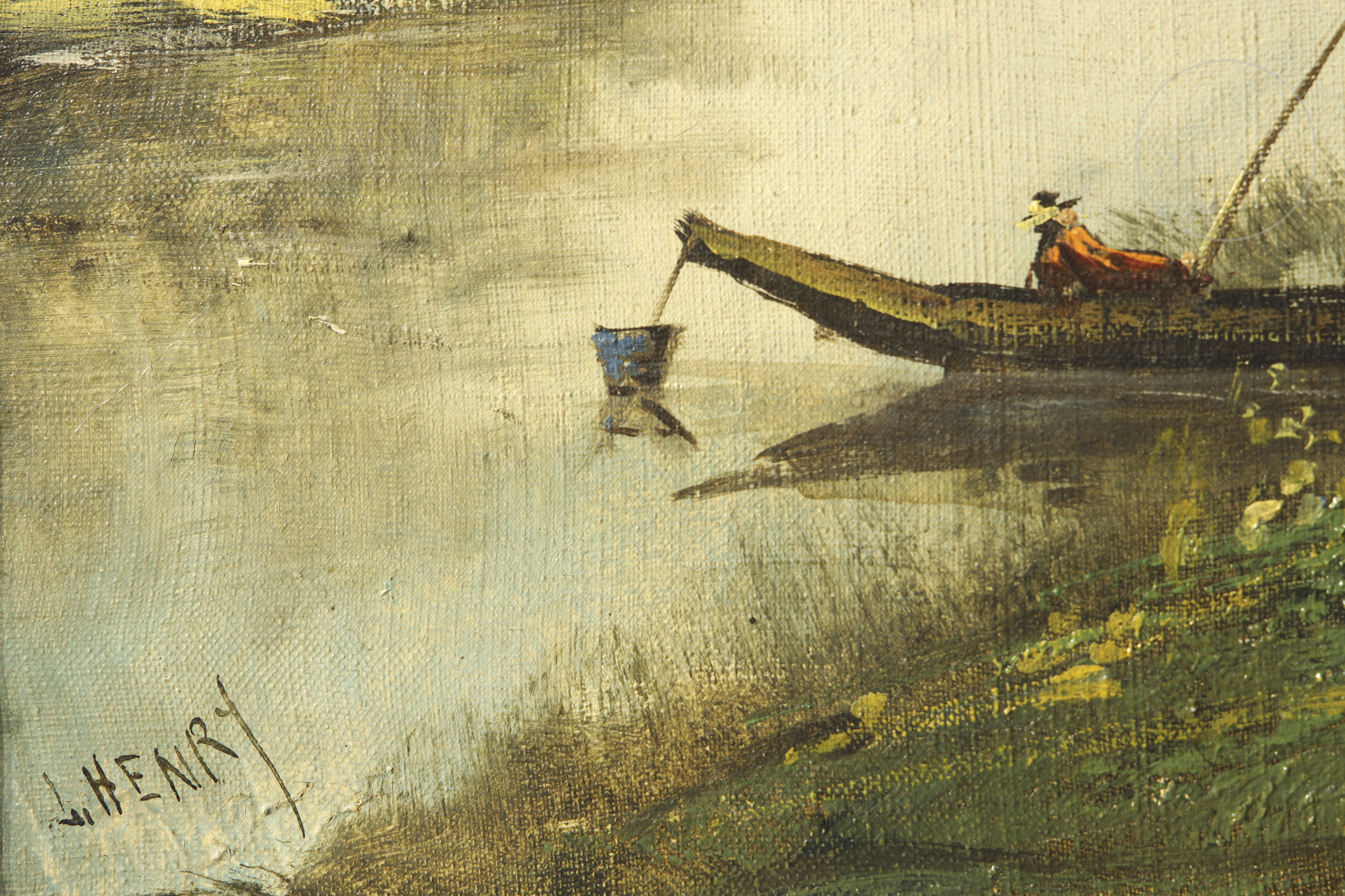 Óleo sobre lienzo. Paisaje que muestra un río rodeado de vegetación, sobre el que navega una pequeña barca de madera. Firmado "L. Henry" en la esquina inferior izquierda.