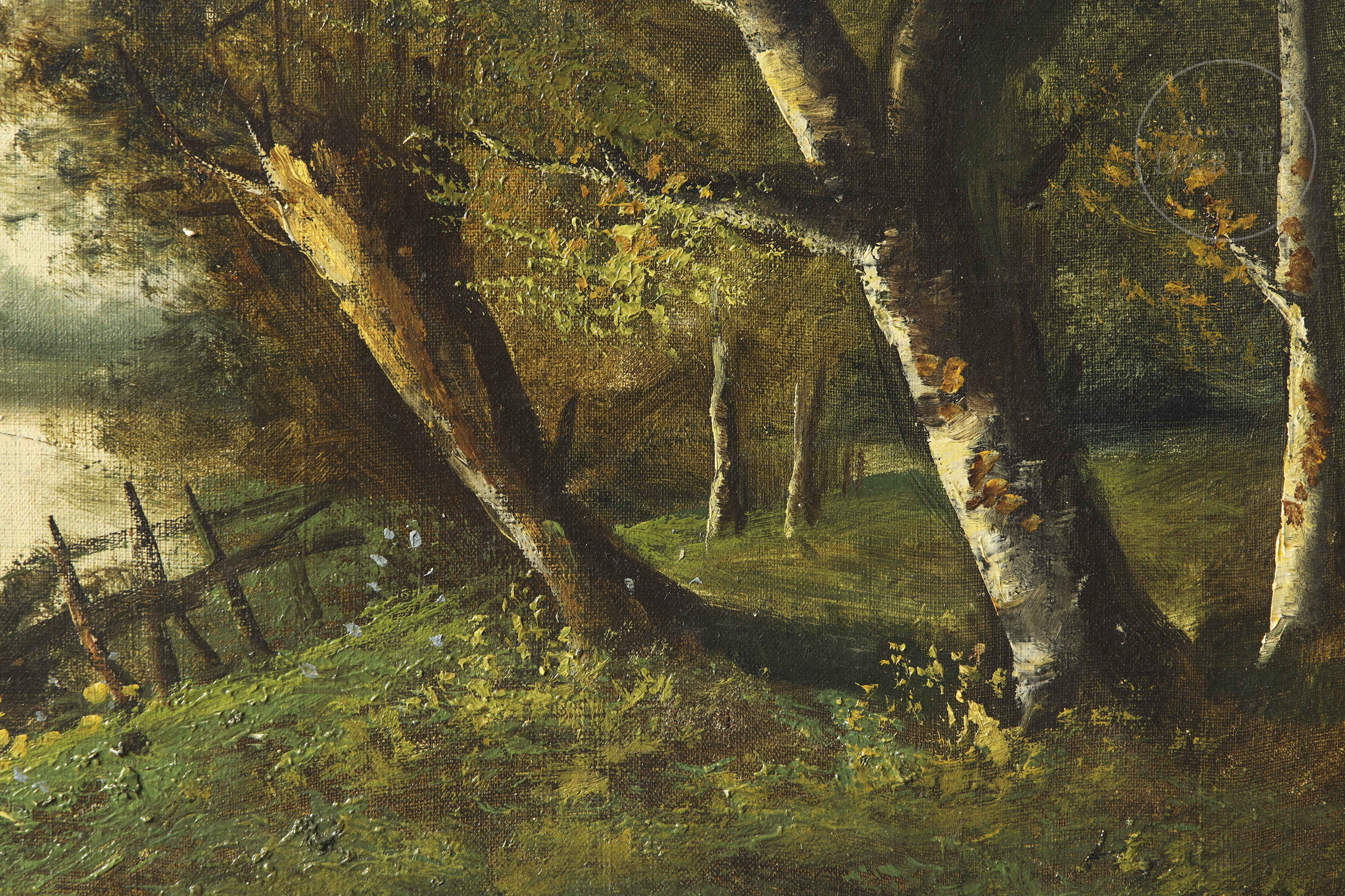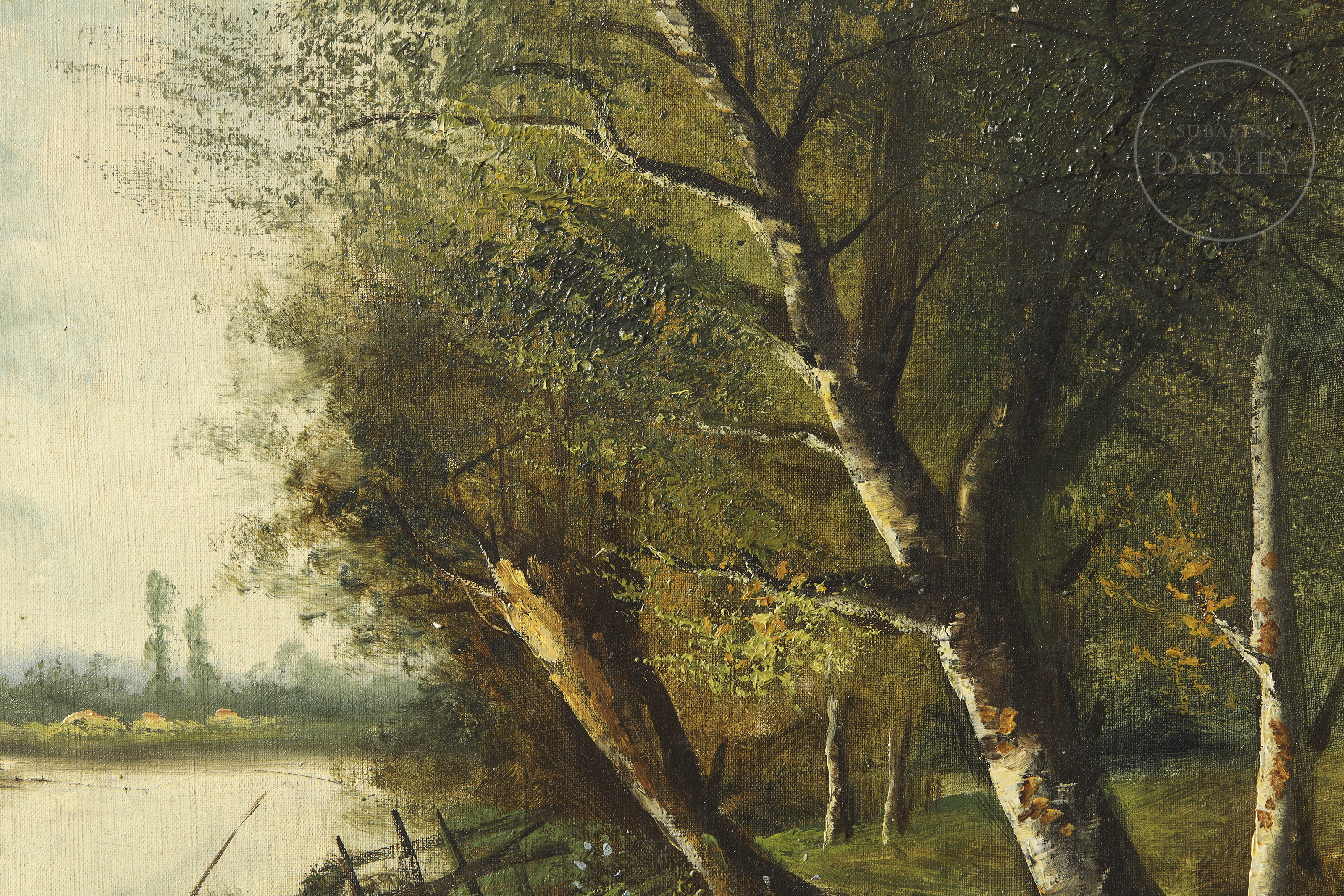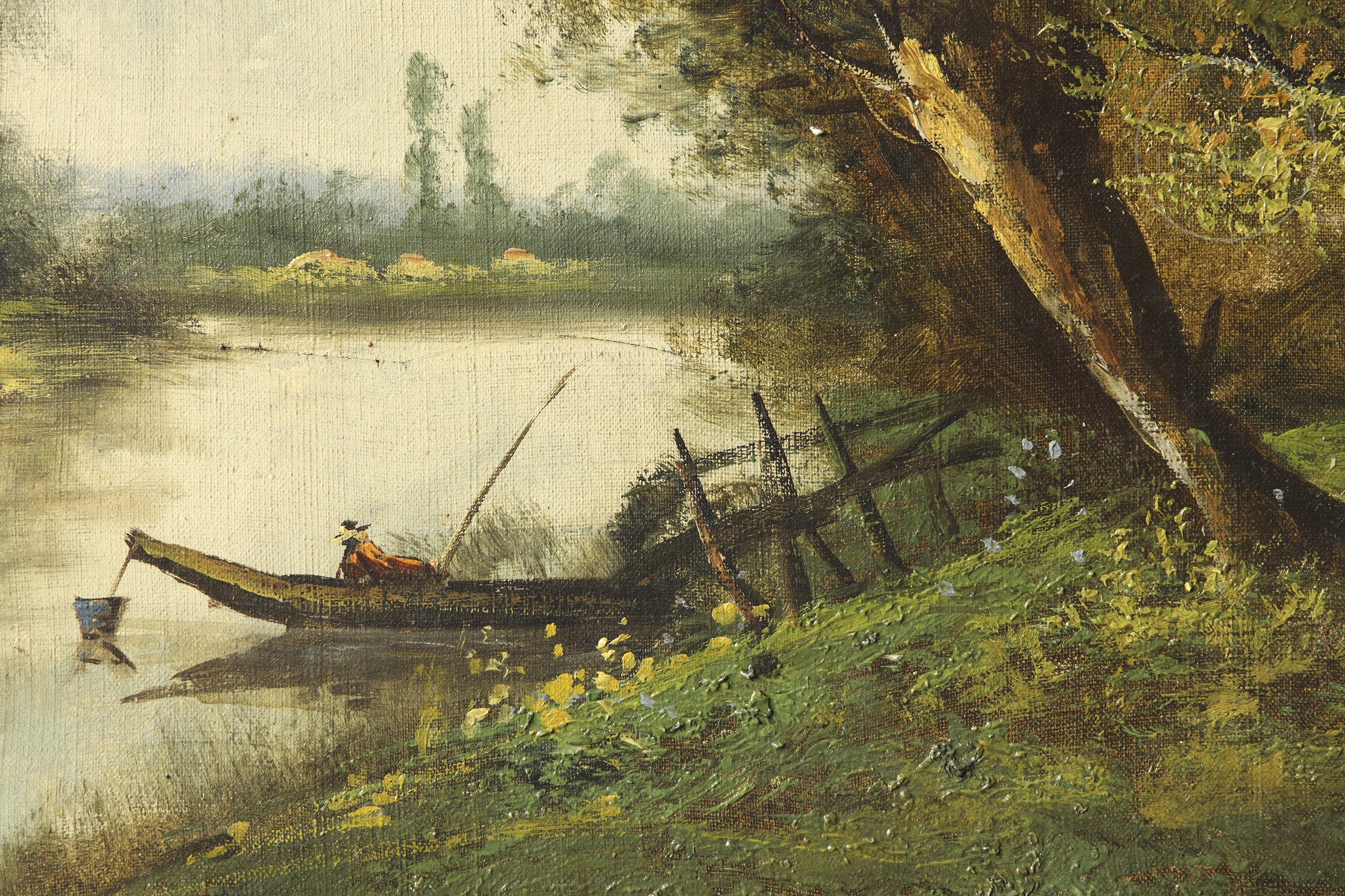 Óleo sobre lienzo. Paisaje que muestra un río rodeado de vegetación, sobre el que navega una pequeña barca de madera. Firmado "L. Henry" en la esquina inferior izquierda.