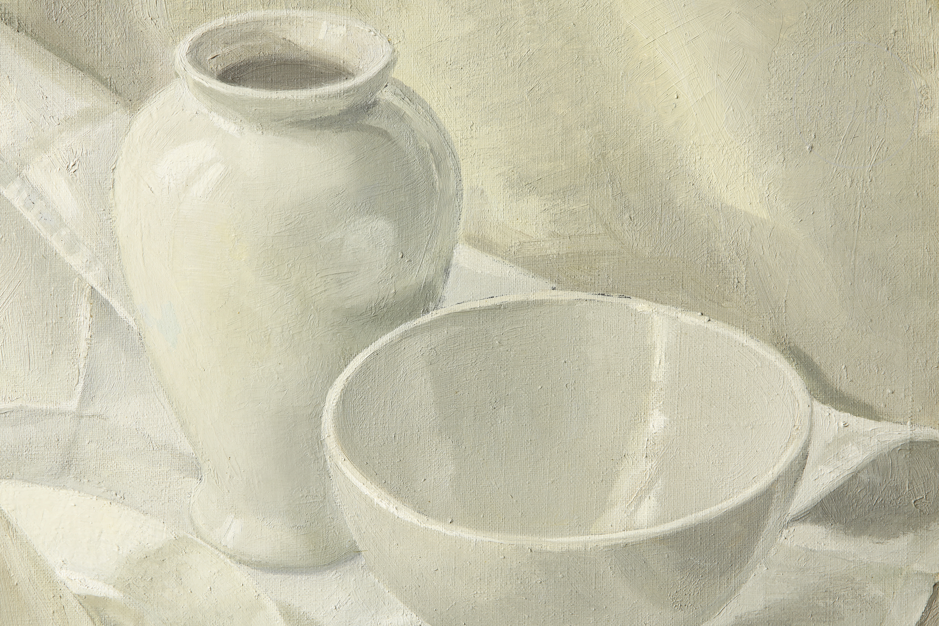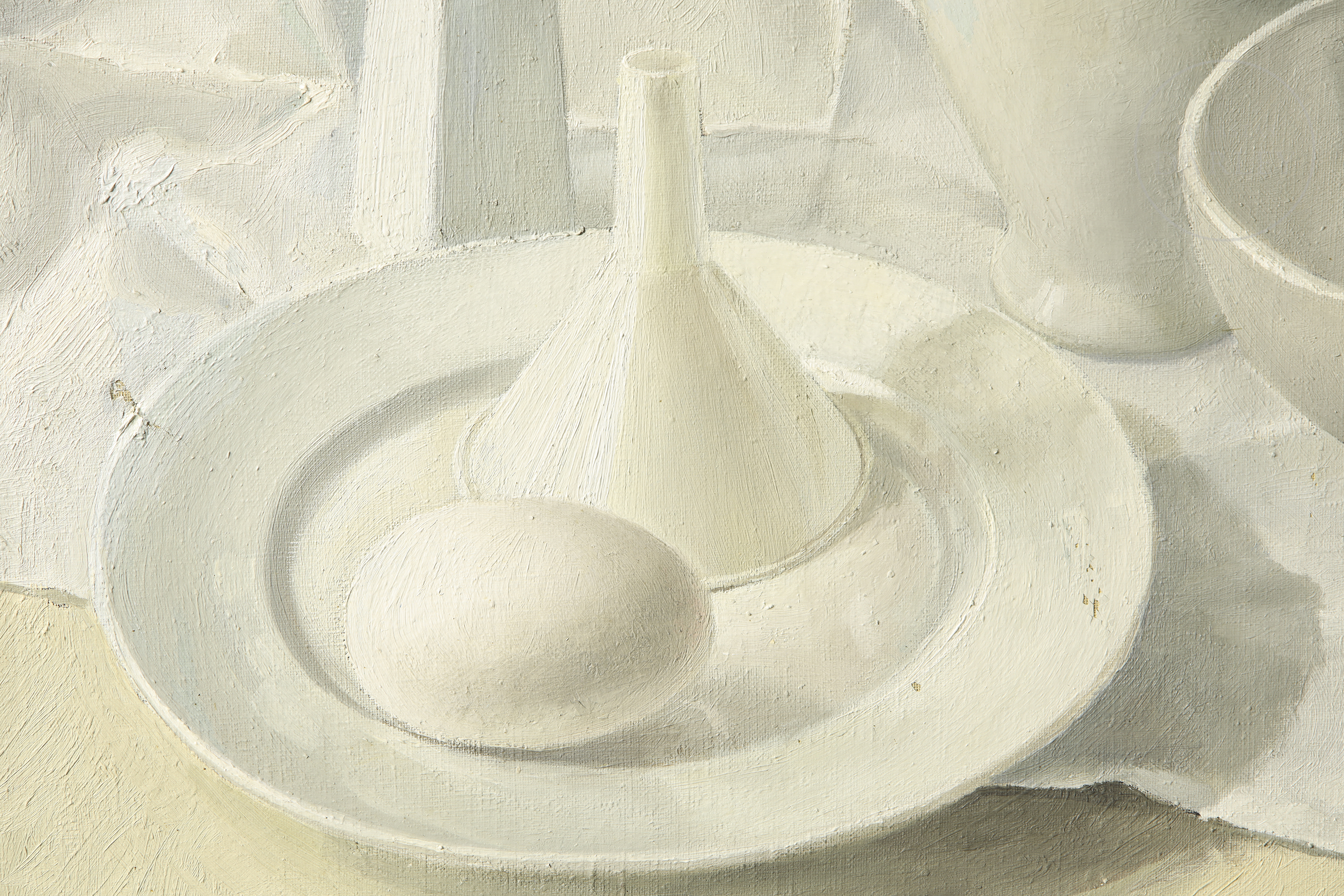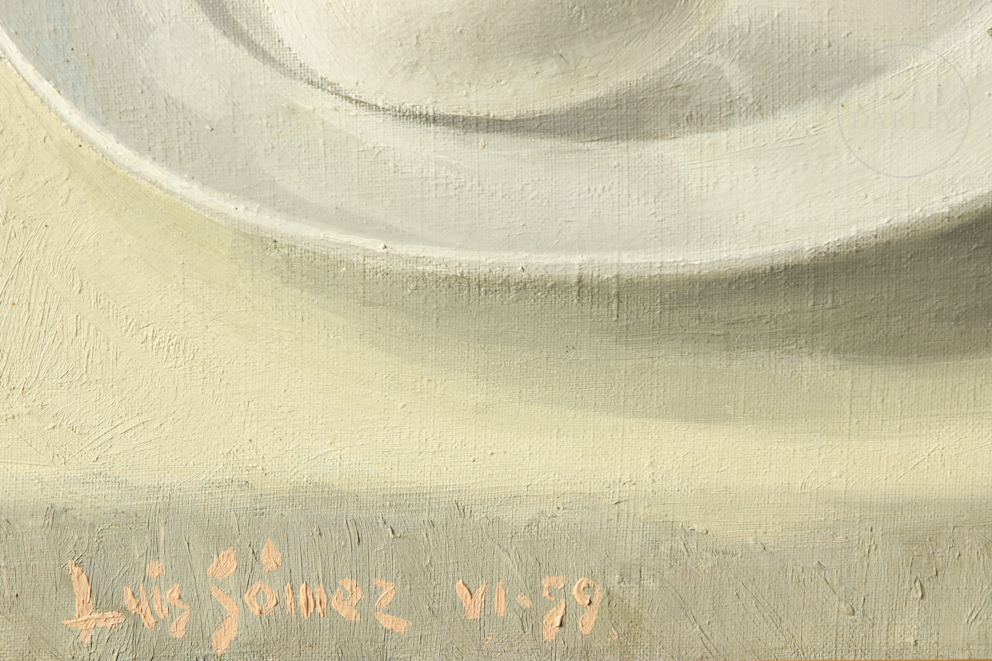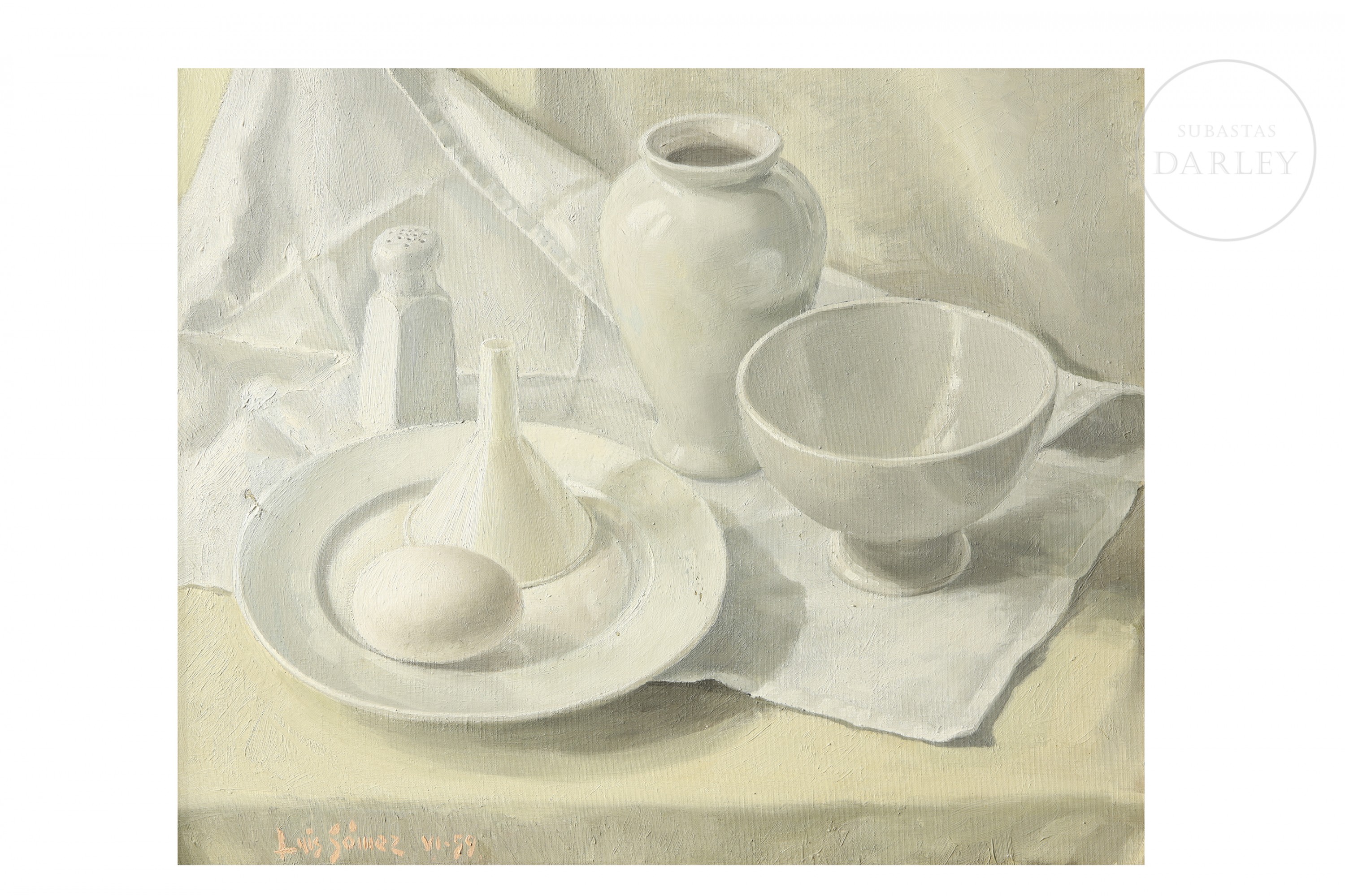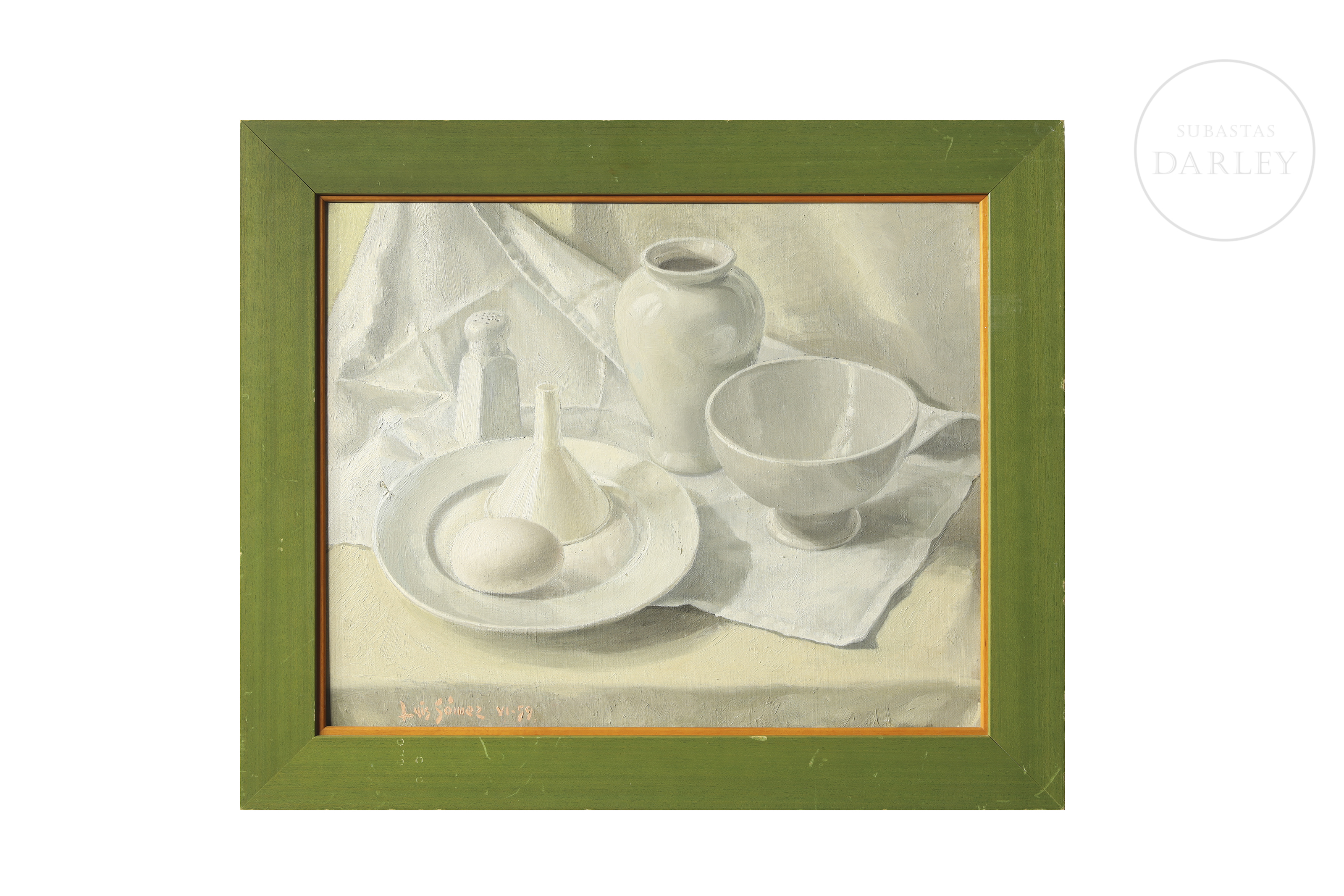 Óleo sobre lienzo. Composición sobria y equilibrada en tonos blancos y grises, donde se disponen diversos objetos cerámicos, un huevo y un paño sobre fondo neutro. Firmado y fechado “Luis Gómez VI-59” en el ángulo inferior izquierdo.
