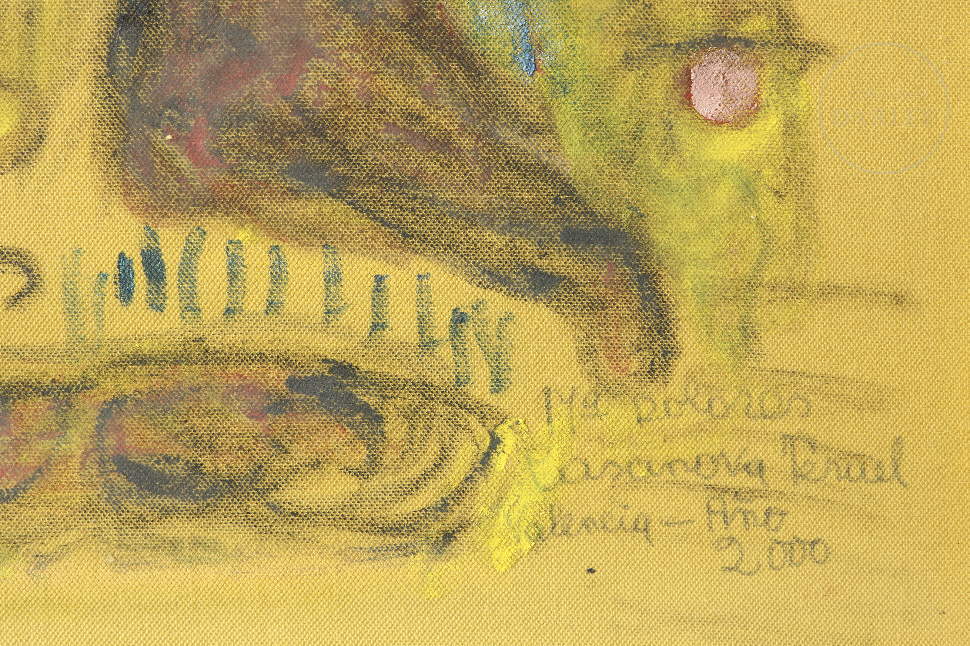 Óleo sobre lienzo. La obra representa una Natividad en clave simbólica y cromática, con la Sagrada Familia en un entorno de tonos dorados que evocan un ambiente espiritual y onírico. Firmado y fechado en la parte inferior derecha “Valencia, Año 2000”.