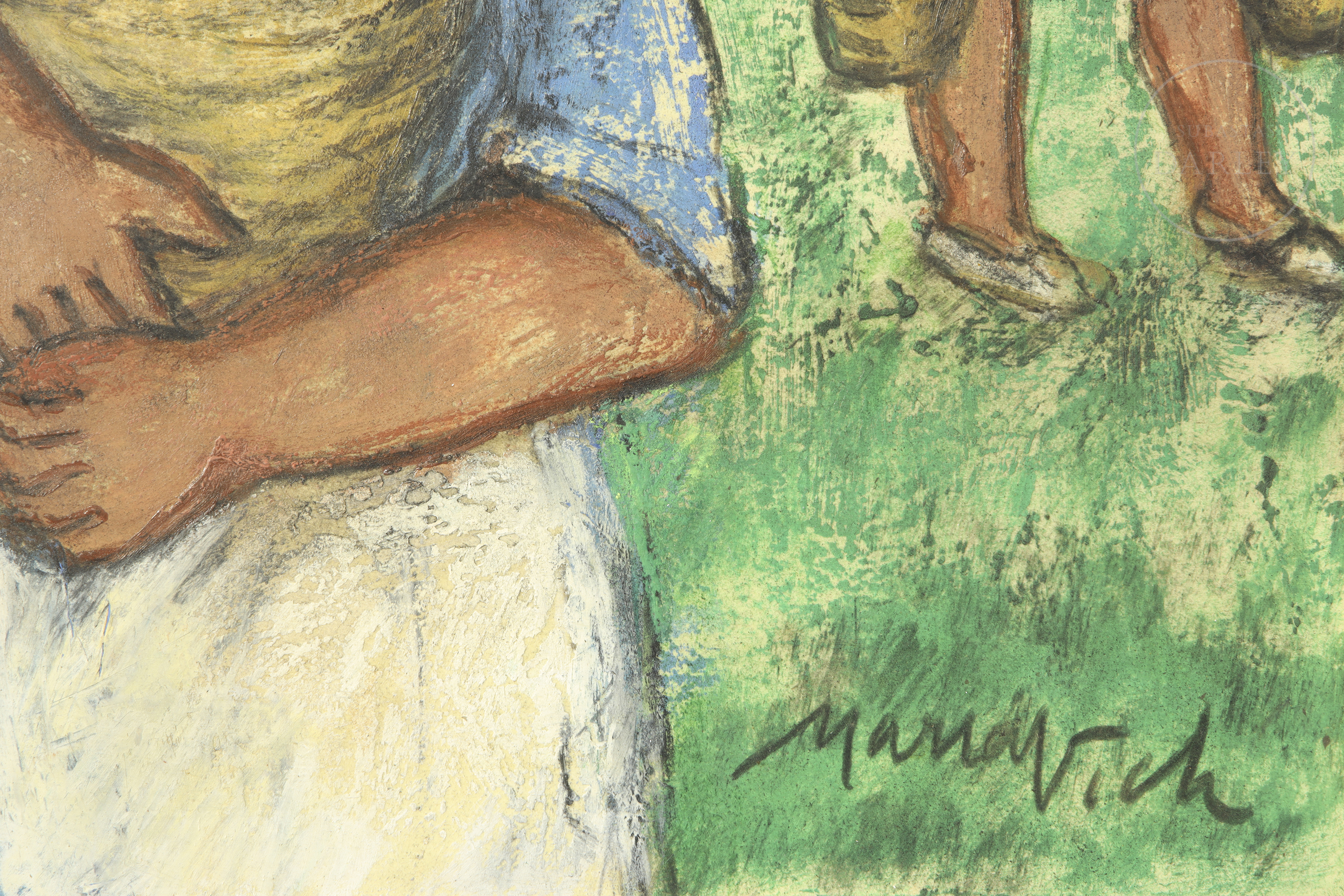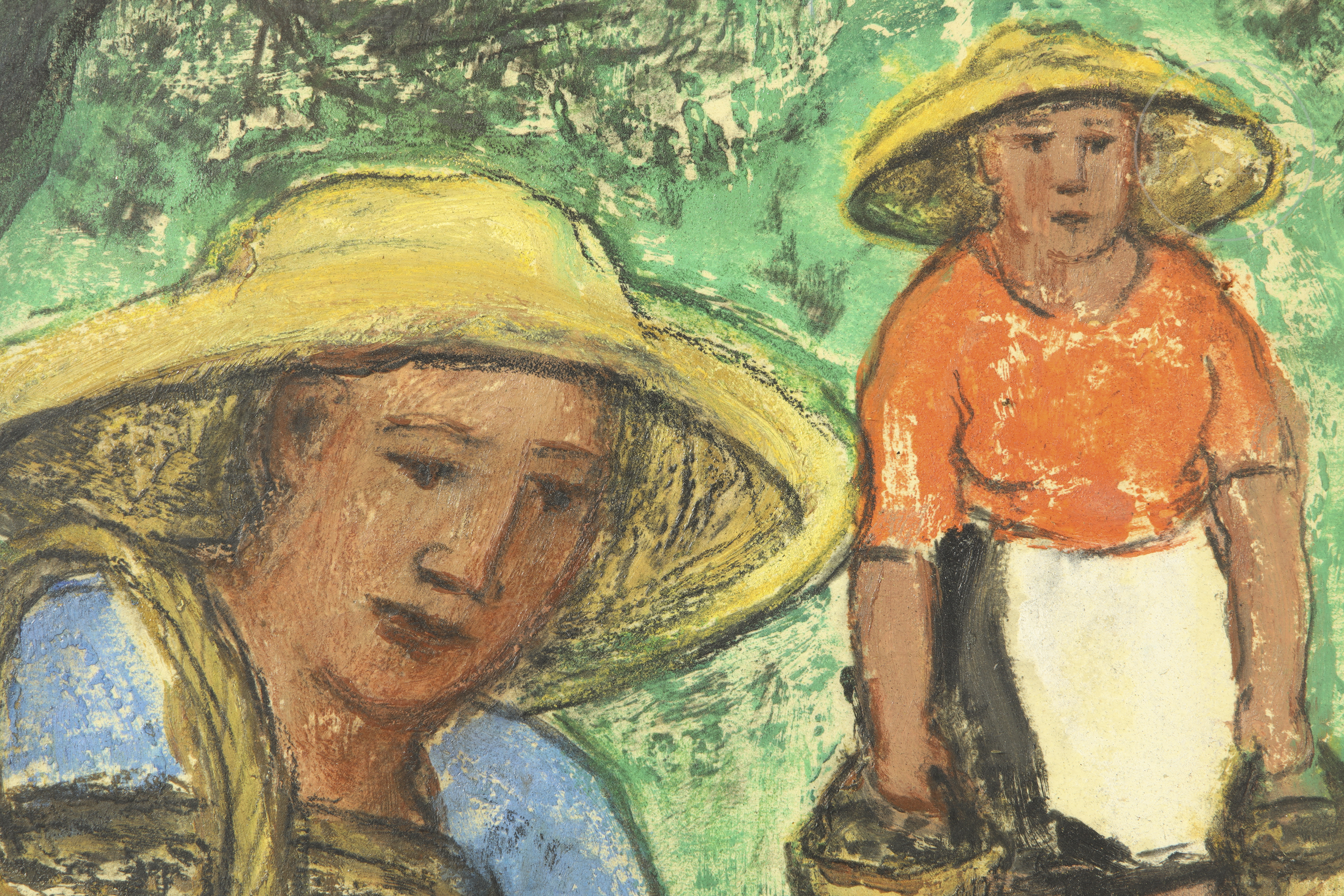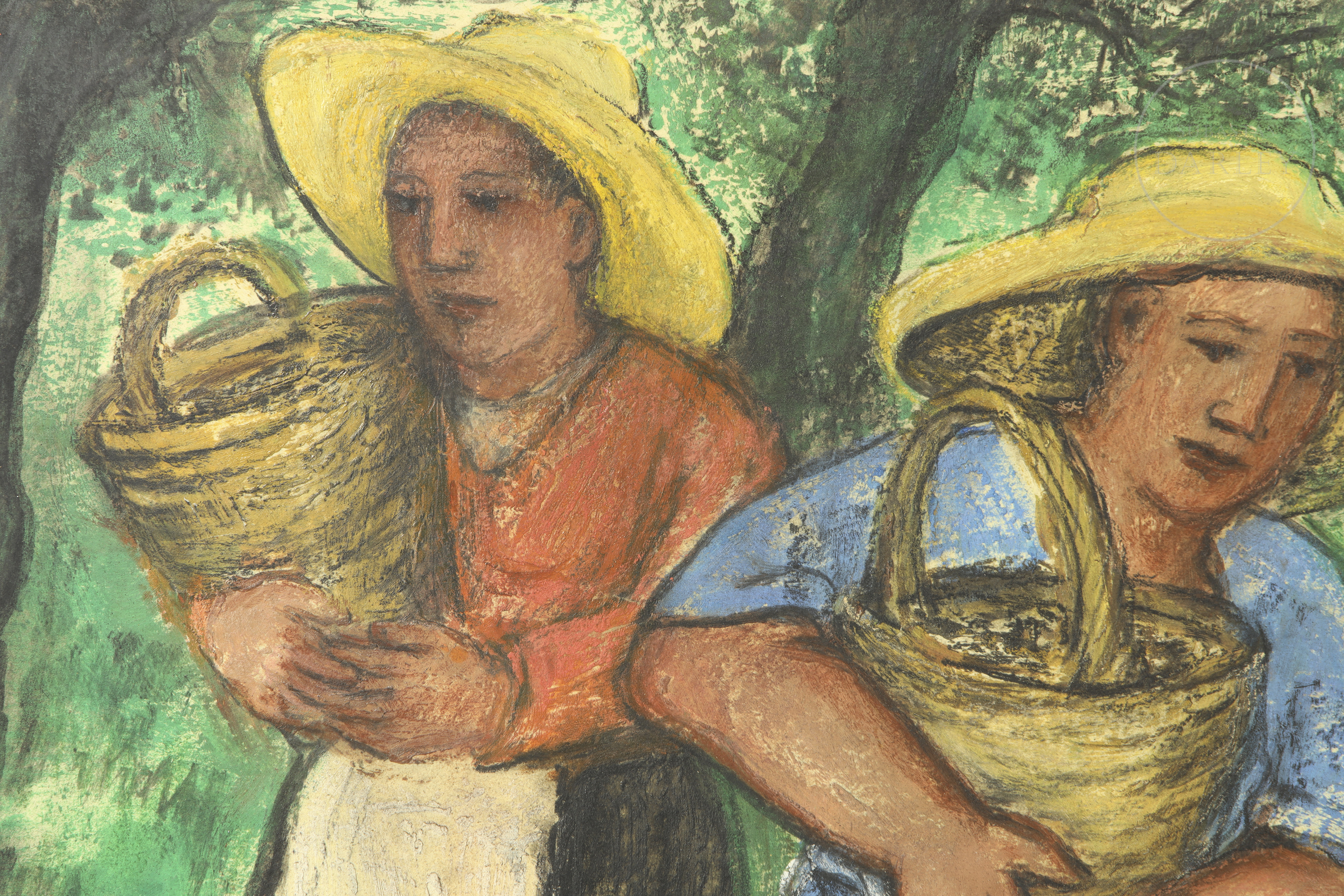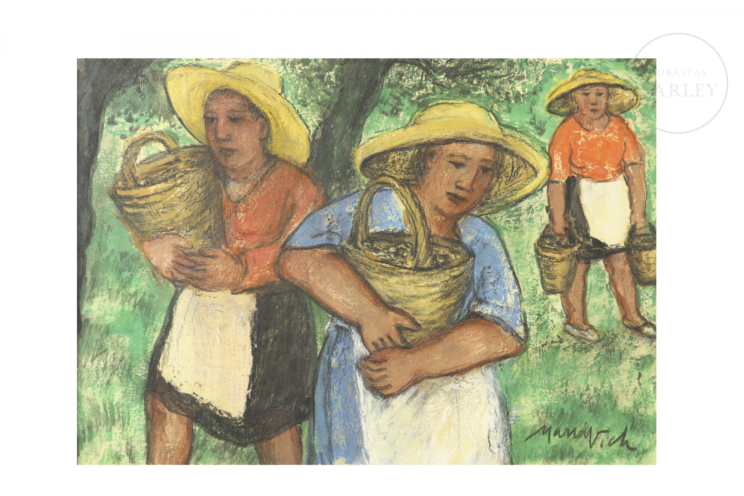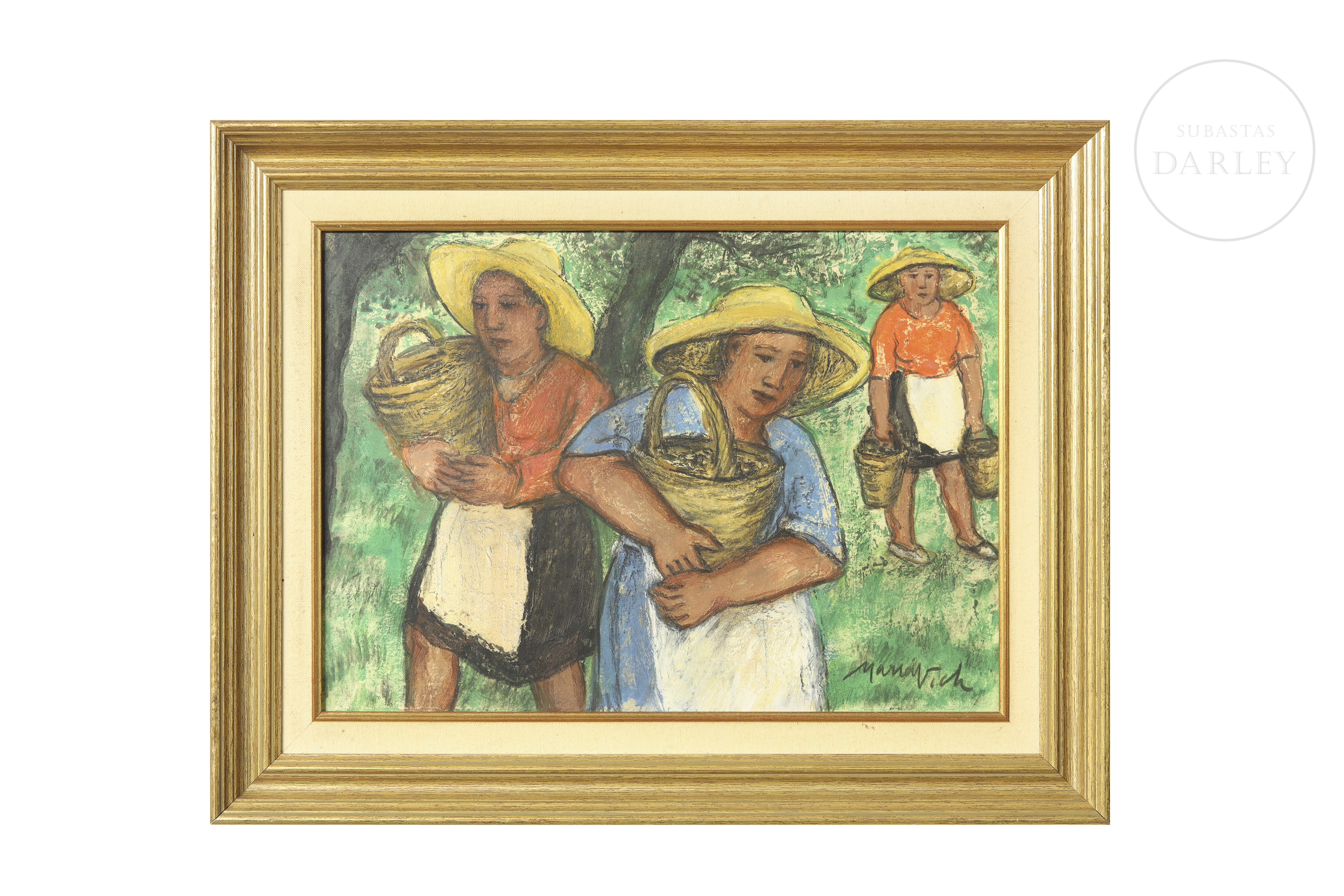 Técnica mixta sobre tabla. Escena costumbrista que representa a tres campesinas con cestos en un entorno rural. La obra destaca por su trazo vigoroso y la solidez de las figuras. Firmado "Maria Vich" en el ángulo inferior derecho.