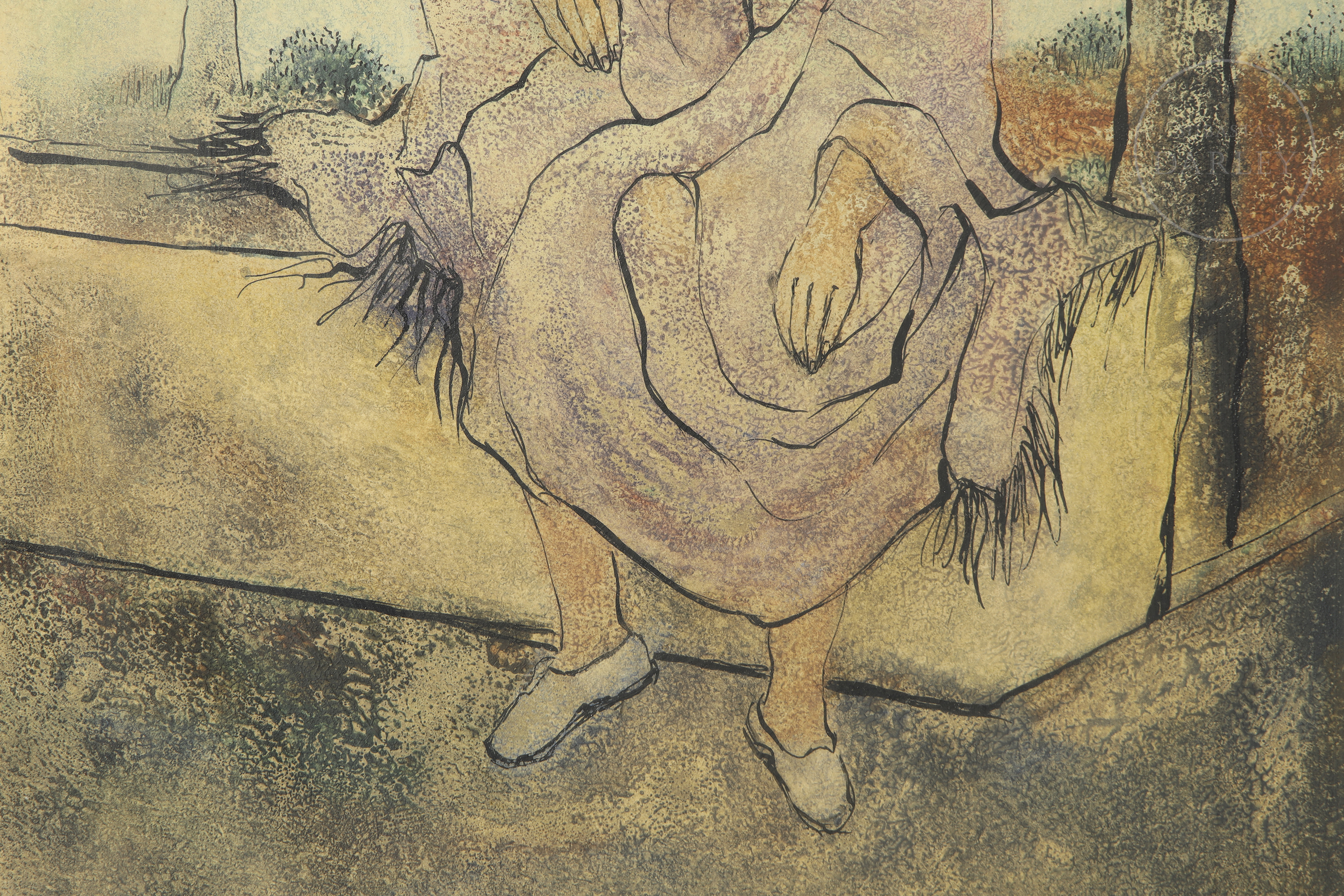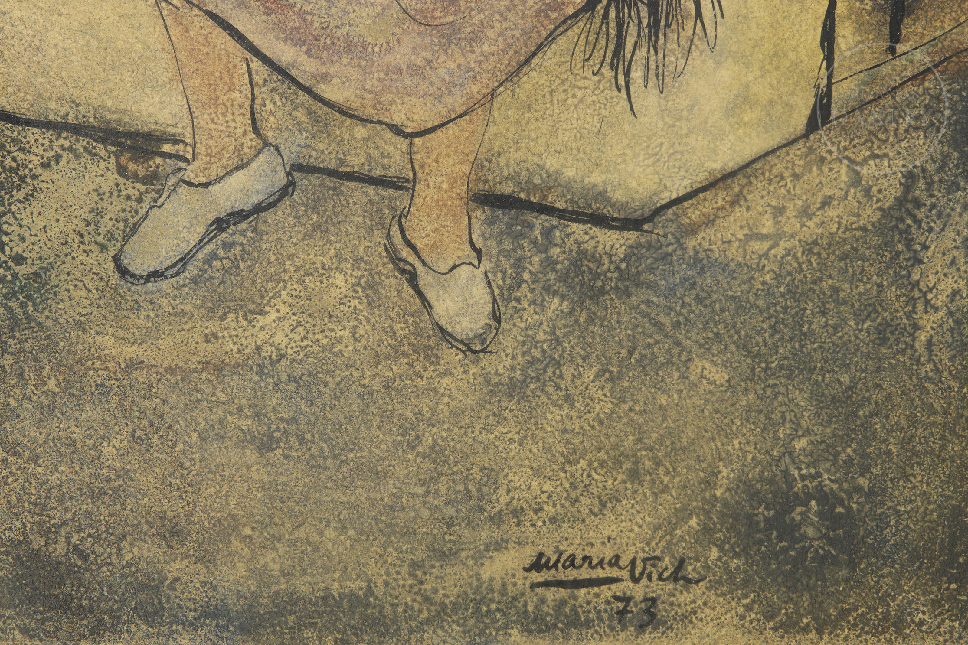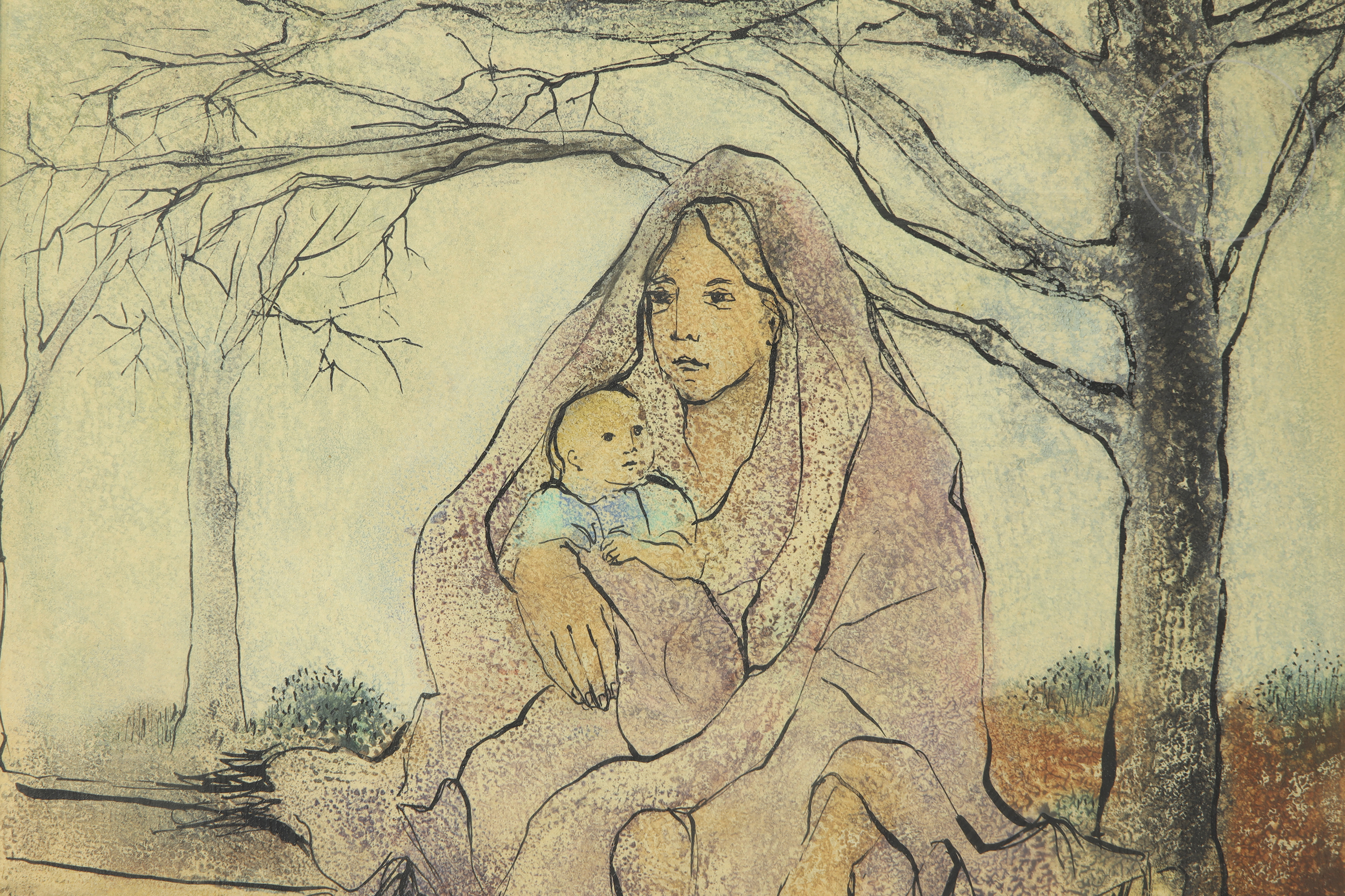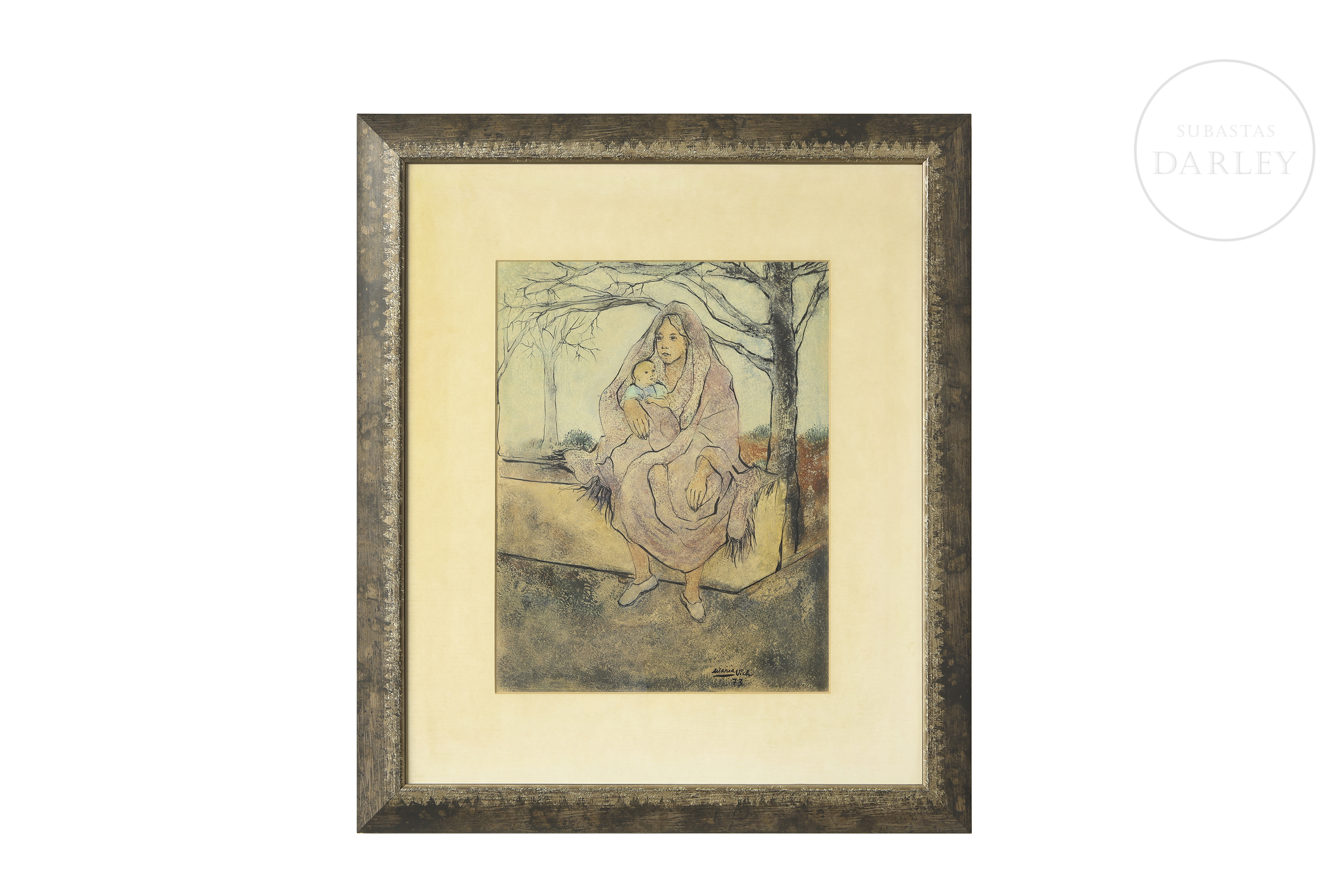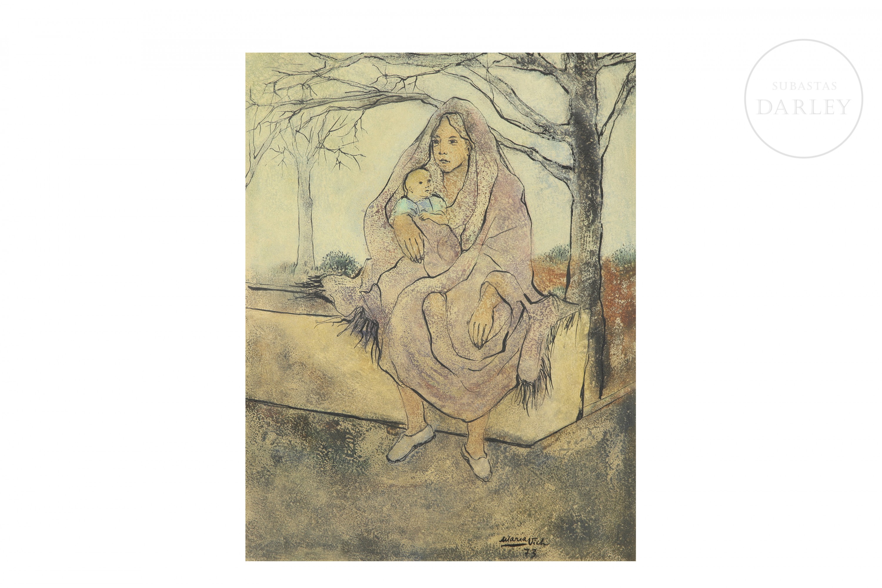 Técnica mixta sobre papel. Obra figurativa que representa una maternidad, resuelta con un trazo definido y expresivo. La escena, de gran ternura, está ambientada en un paisaje austero. Firmado y fechado "Maria Vich/73" en el ángulo inferior derecho.