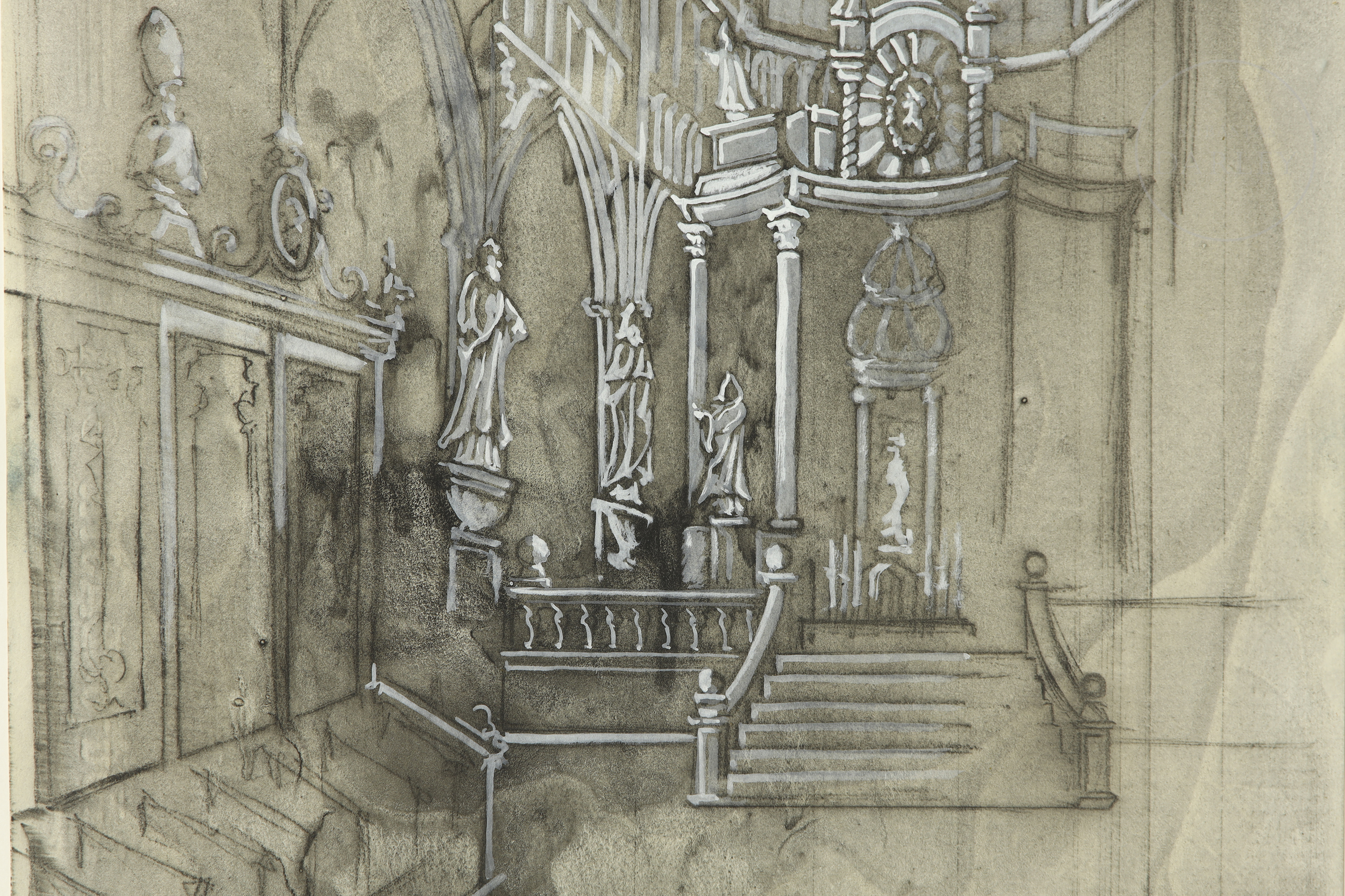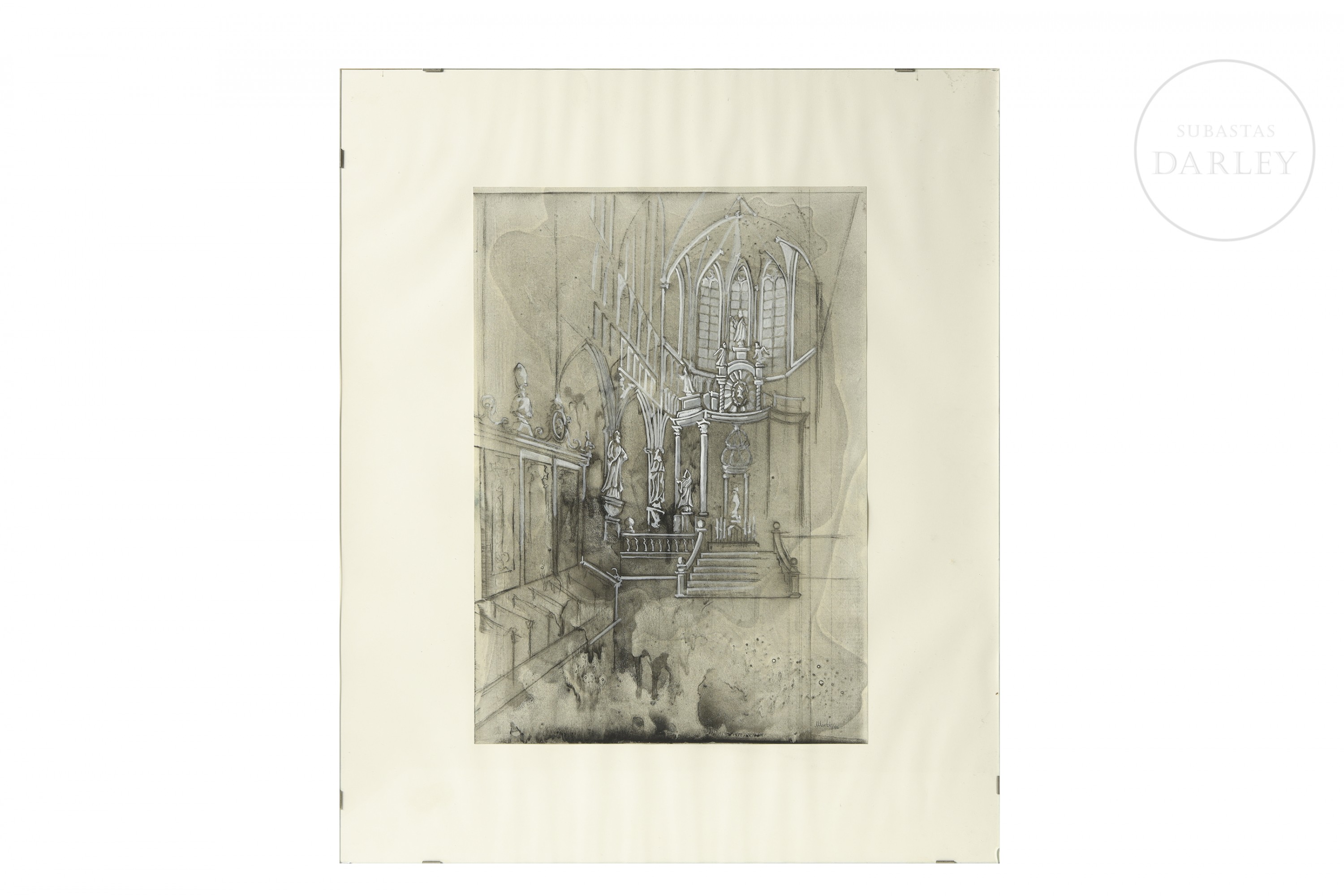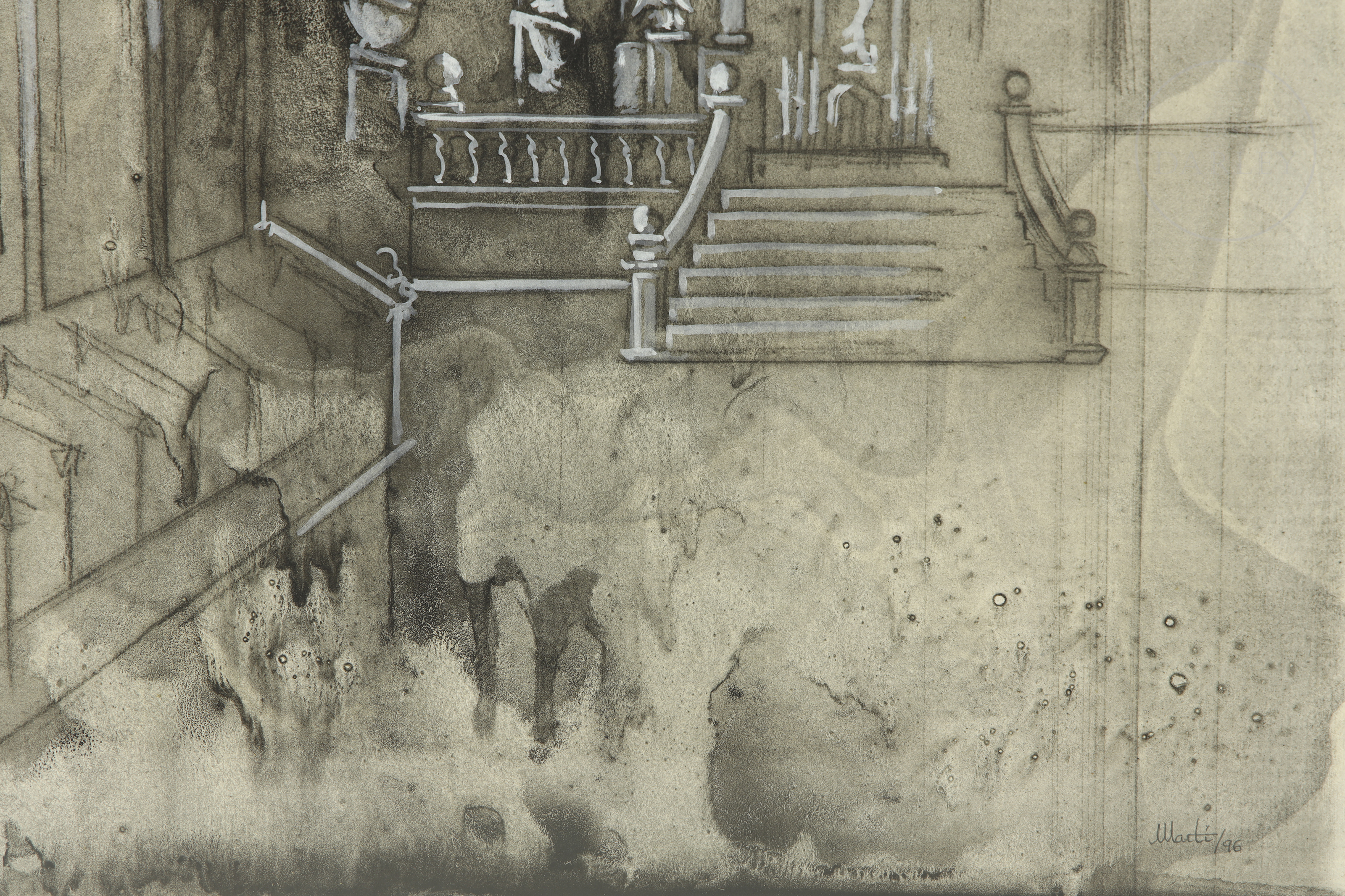 Técnica mixta sobre papel. Apunte arquitectónico del interior una catedral , específicamente la escalinata lateral que conduce a un presbiterio elevado y una tribuna. El estilo combina el dibujo lineal con aguadas. Firmado y fechado "Marti '96" en la esquina inferior derecha.