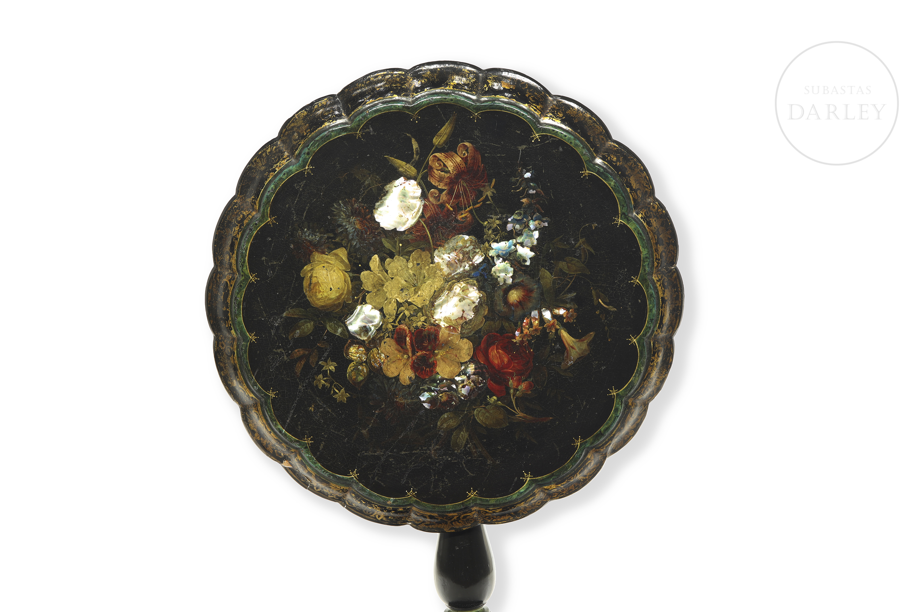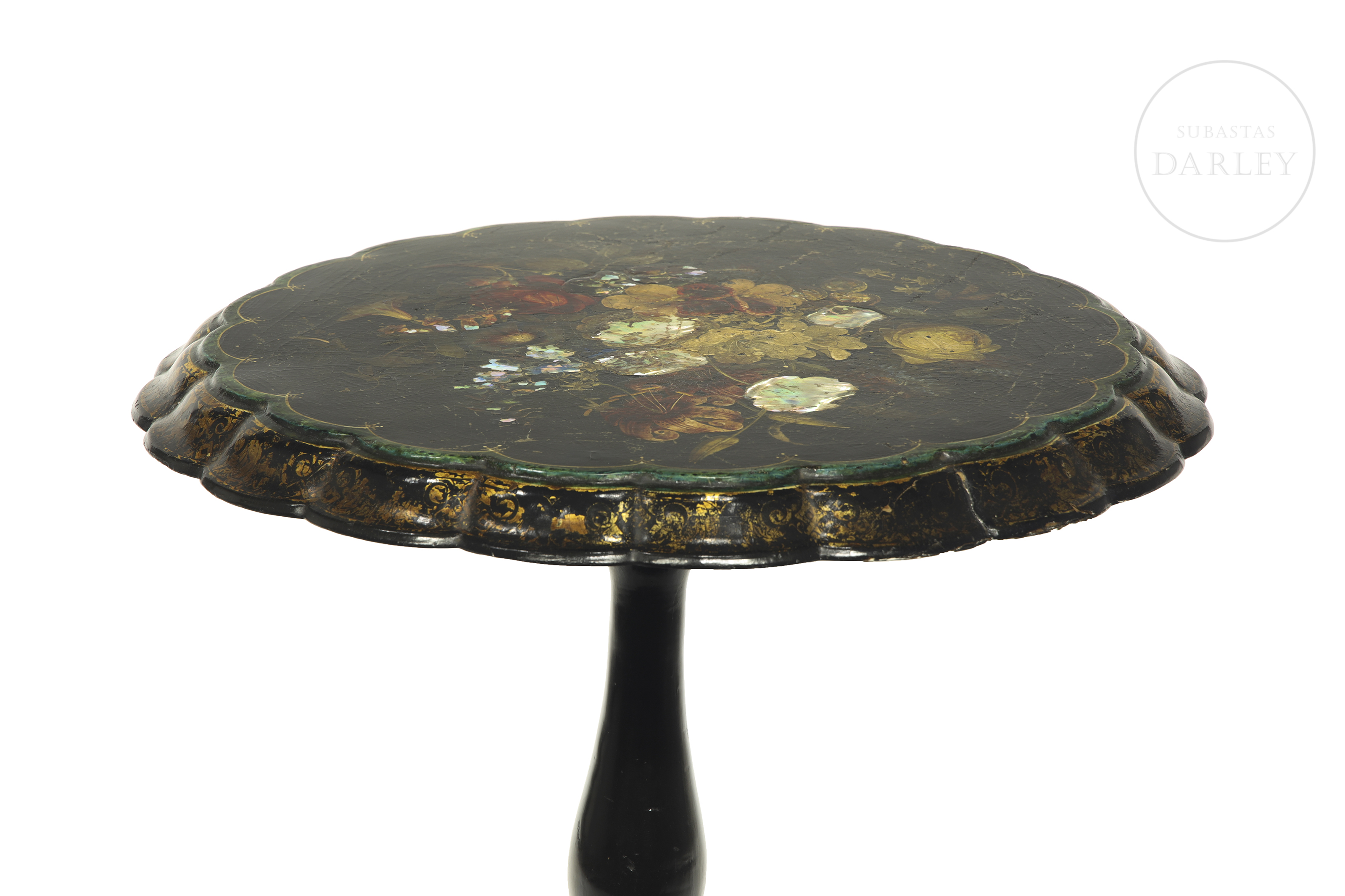 Mesa victoriana de papel maché (también conocida como mesa velador) con pedestal inclinable de madera y papel maché lacado en negro motivos foliados dorados en los bordes, flores pintadas e incrustaciones de nácar. Con ligeros desperfectos.