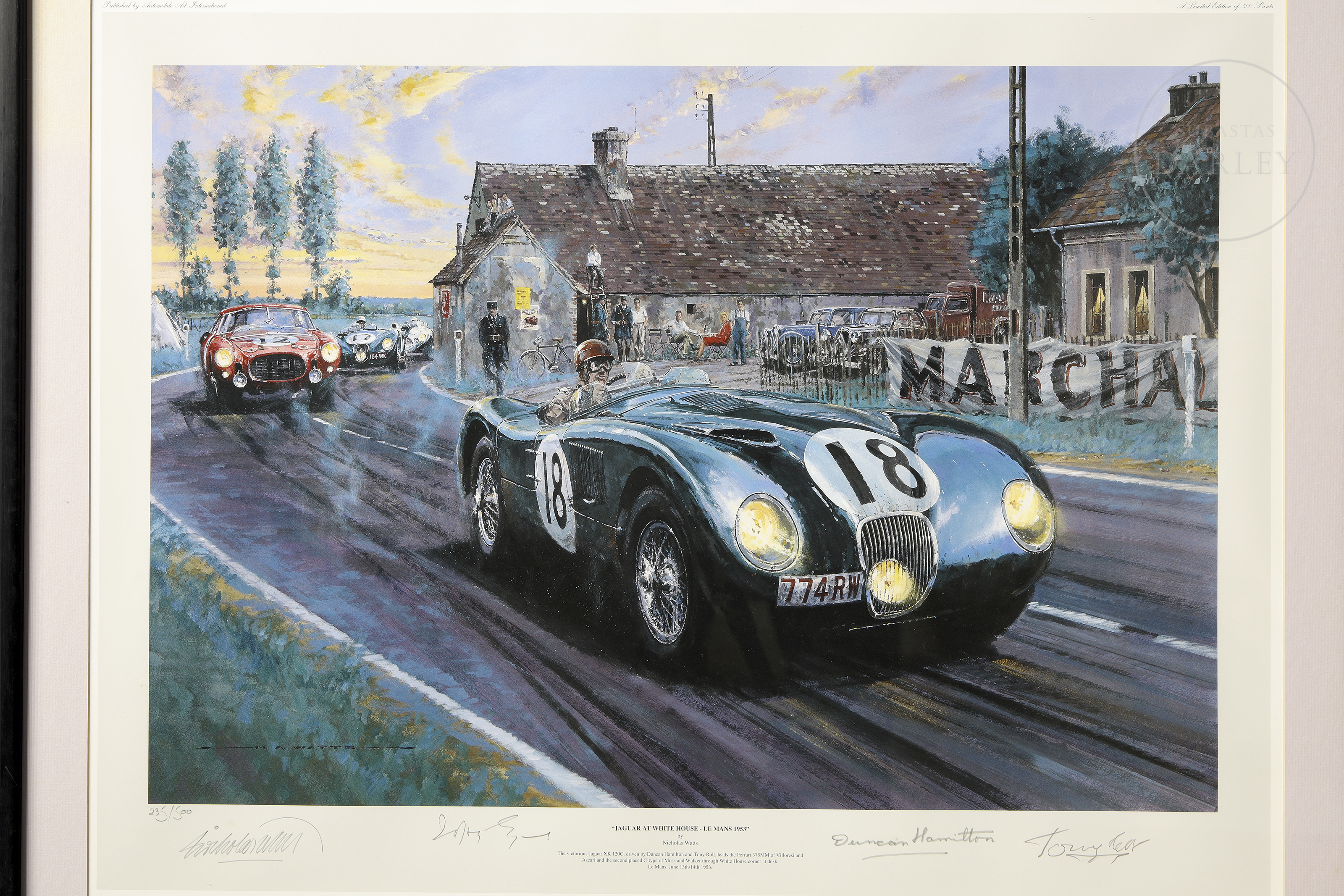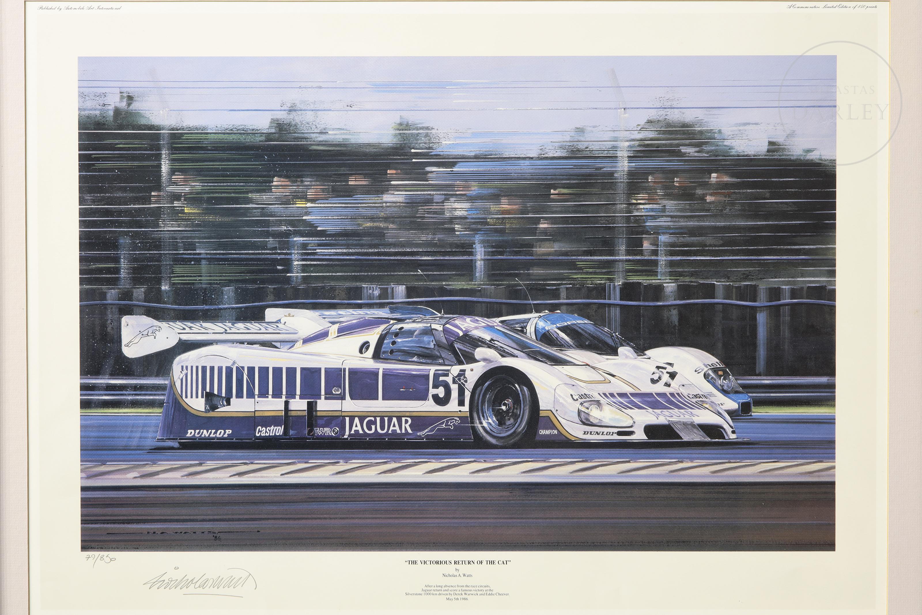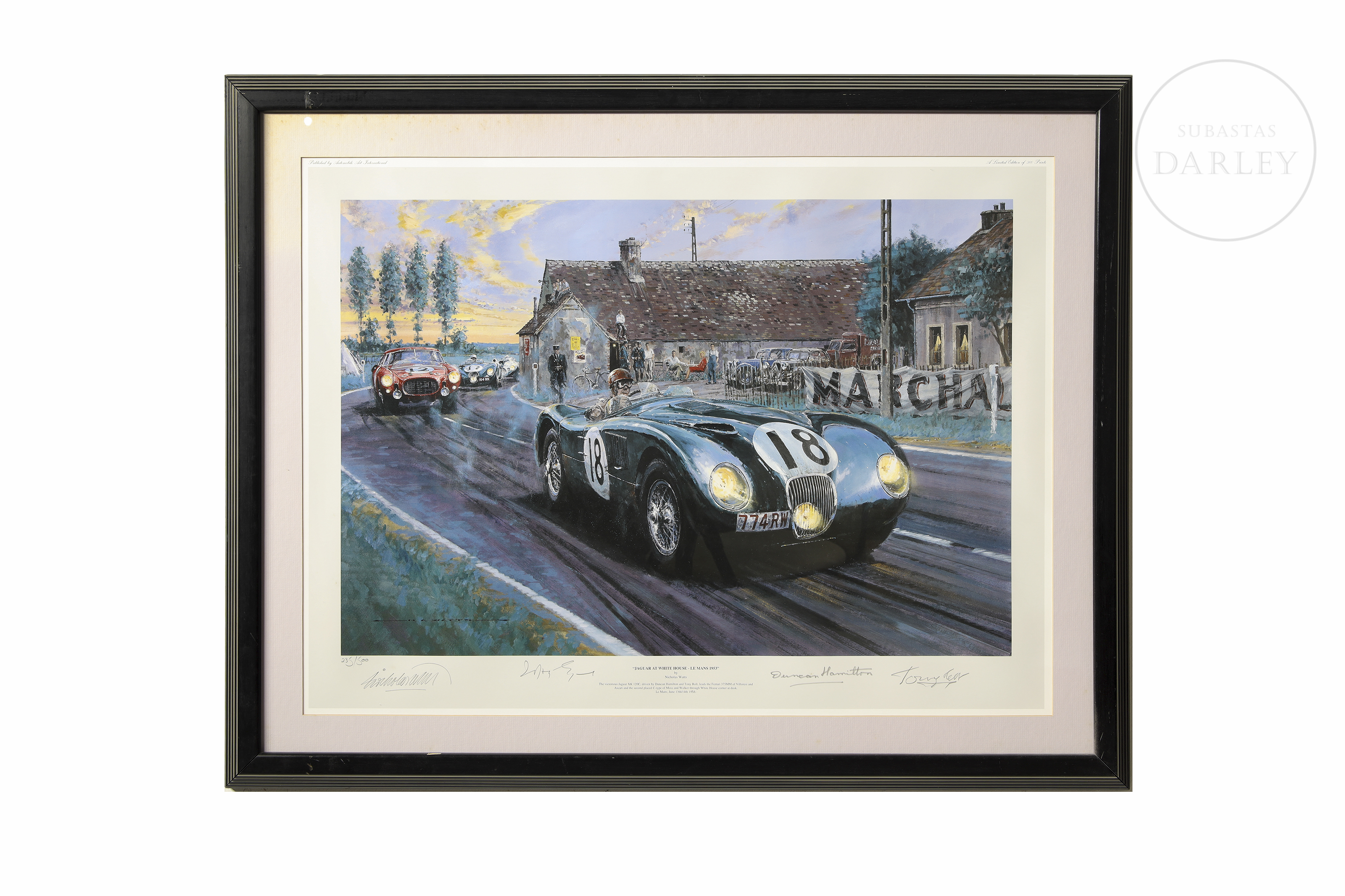 Impresión sobre papel. Dos representaciones de pinturas conmemorativas de coches de carreras de la marca Jaguar. El primero, titulado "The Victorious return of the Cat" numerado como 79/850, y el segundo "Jaguar at White House- Le Mans 1953" numerado como 235/500. Ambos con firma del autor, y uno de ellos con firma de los pilotos.