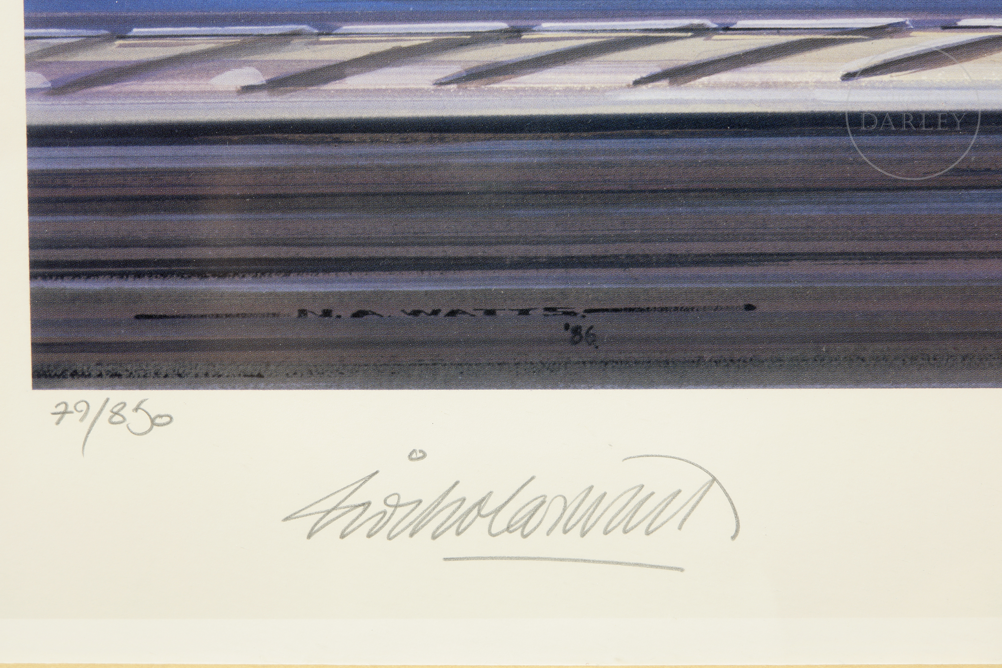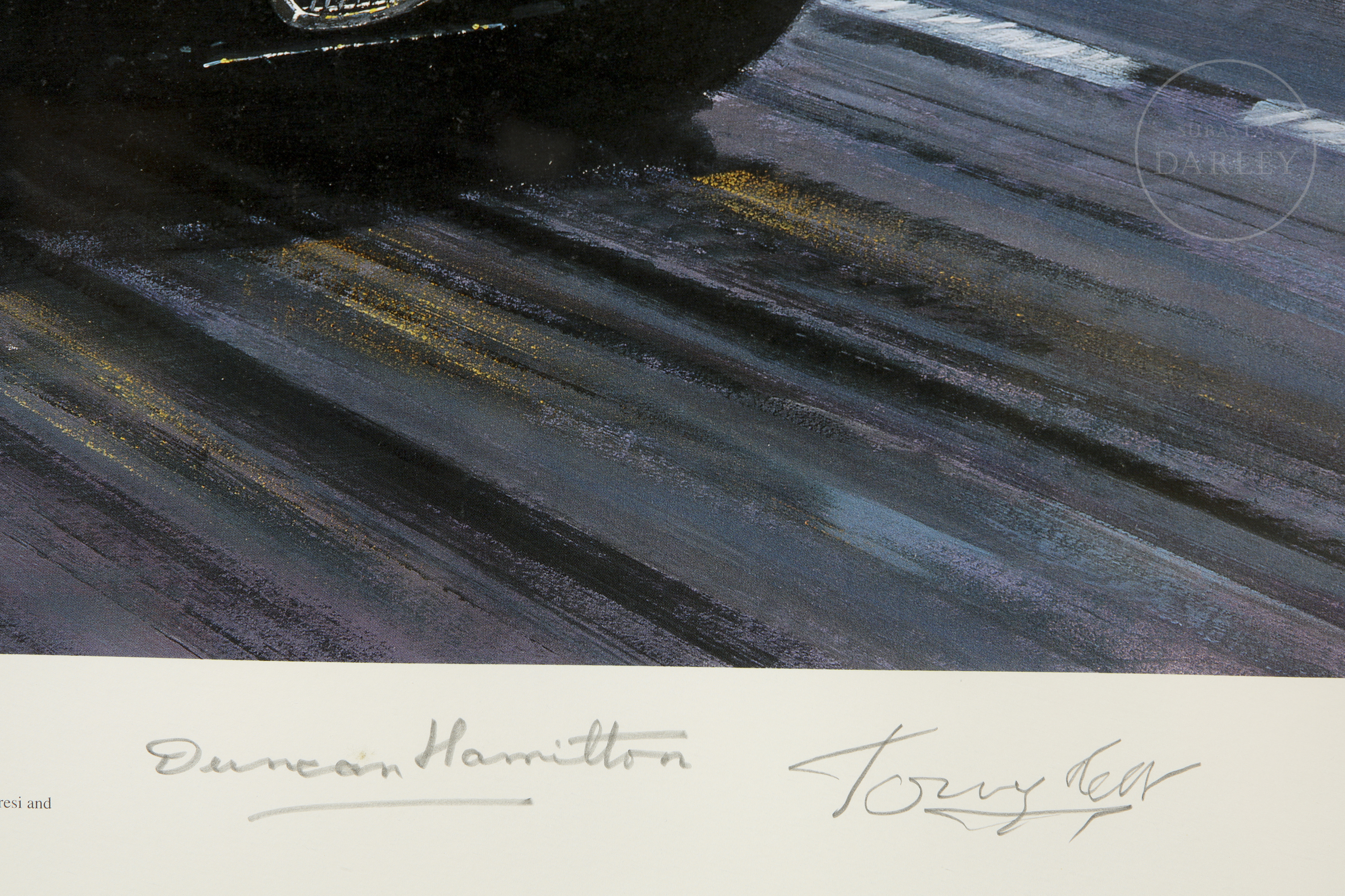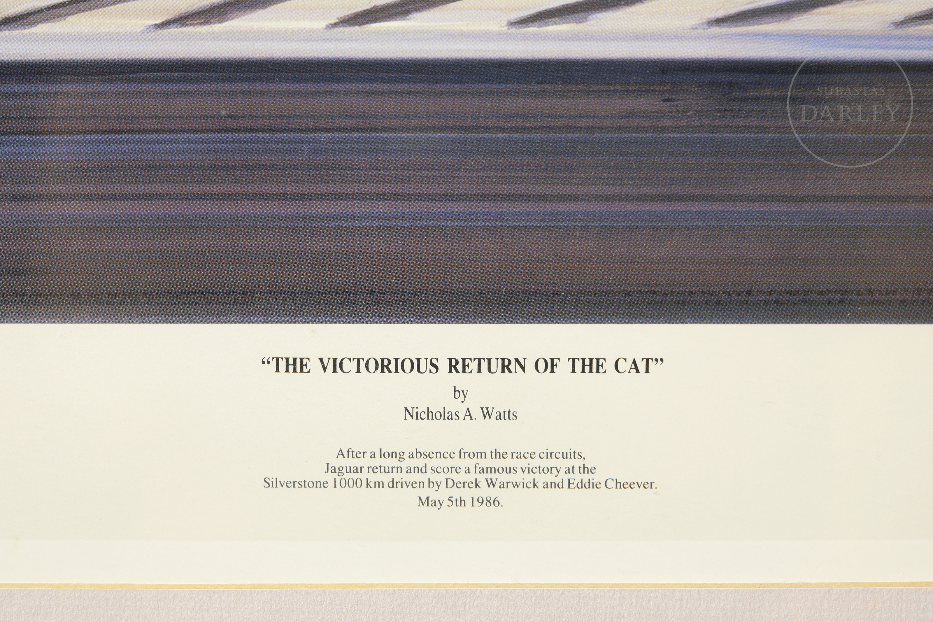 Impresión sobre papel. Dos representaciones de pinturas conmemorativas de coches de carreras de la marca Jaguar. El primero, titulado "The Victorious return of the Cat" numerado como 79/850, y el segundo "Jaguar at White House- Le Mans 1953" numerado como 235/500. Ambos con firma del autor, y uno de ellos con firma de los pilotos.