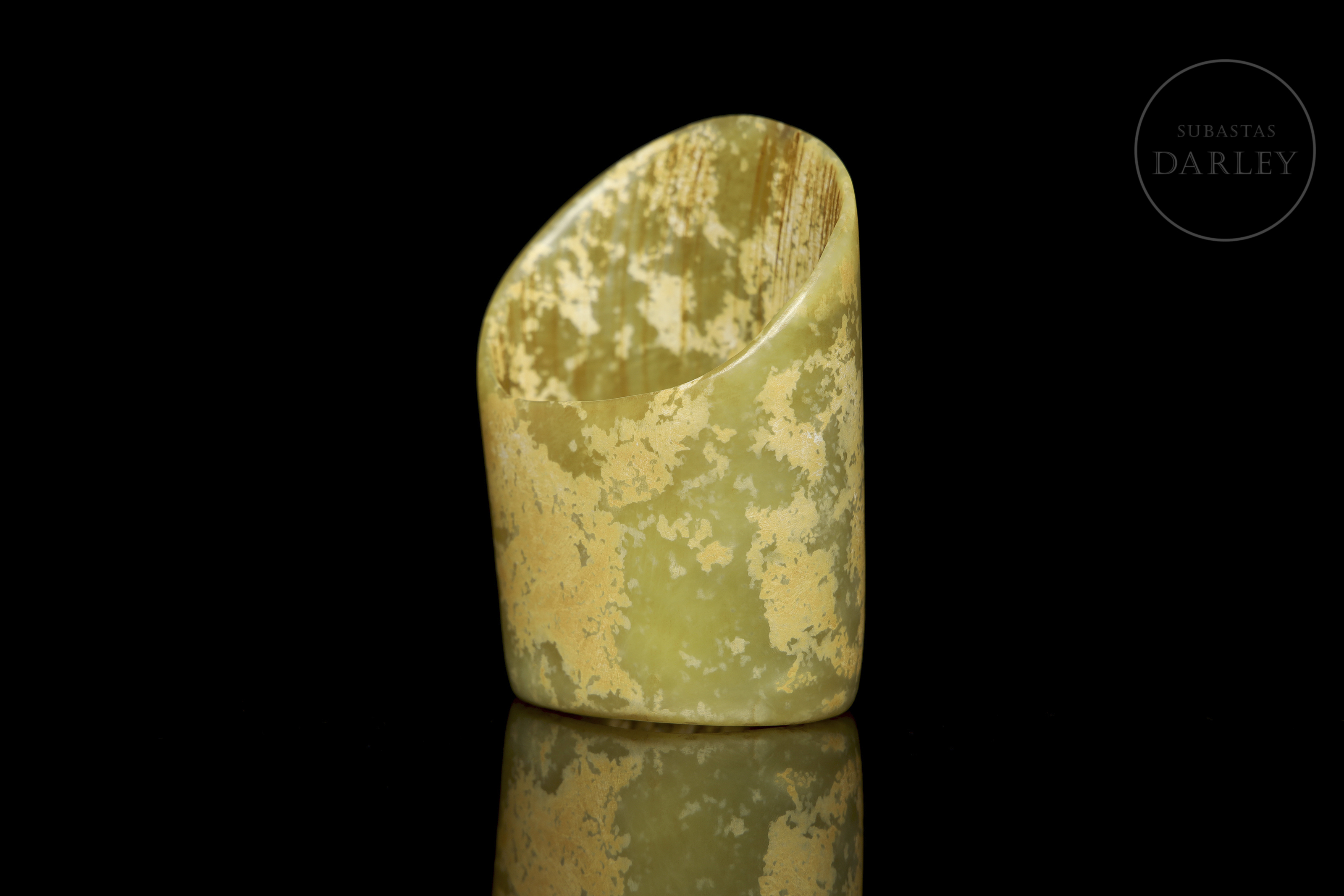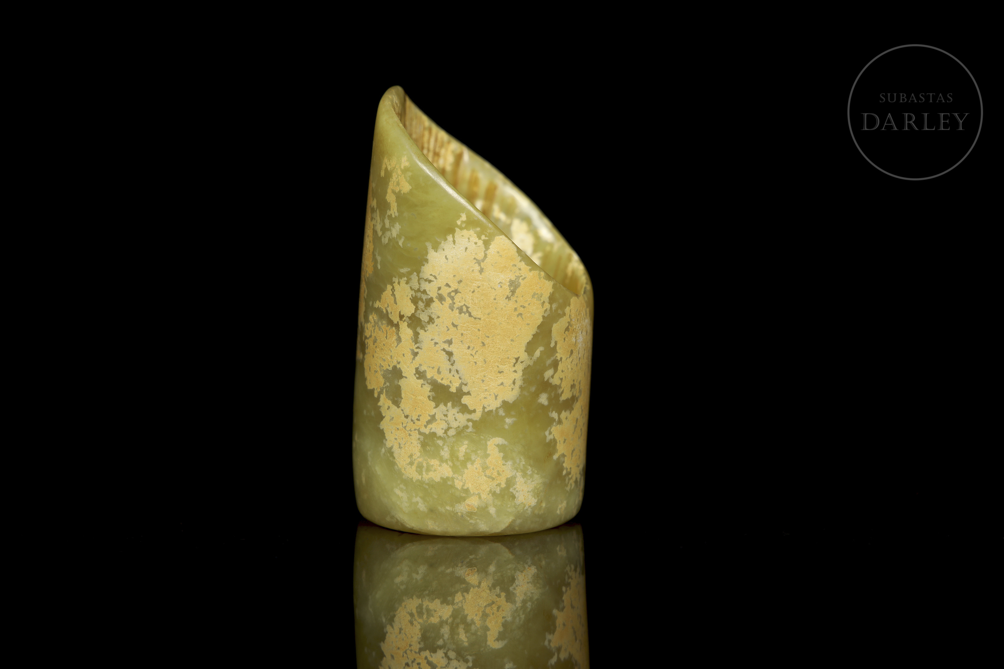 Objeto ritual tallado, con la forma de tubo hueco de paredes delgadas y sección ovalada, que se ensancha hacia una apertura superior de corte inclinado o biselado. Esta tipología distintiva se conoce como "馬蹄筒". La superficie se presenta lisa, en tono verde celadón con matices amarillentos y vetas en tonos ocre y marrón rojizo. Cultura Hongshan (c. 4700-2900 a.C.). o posterior.