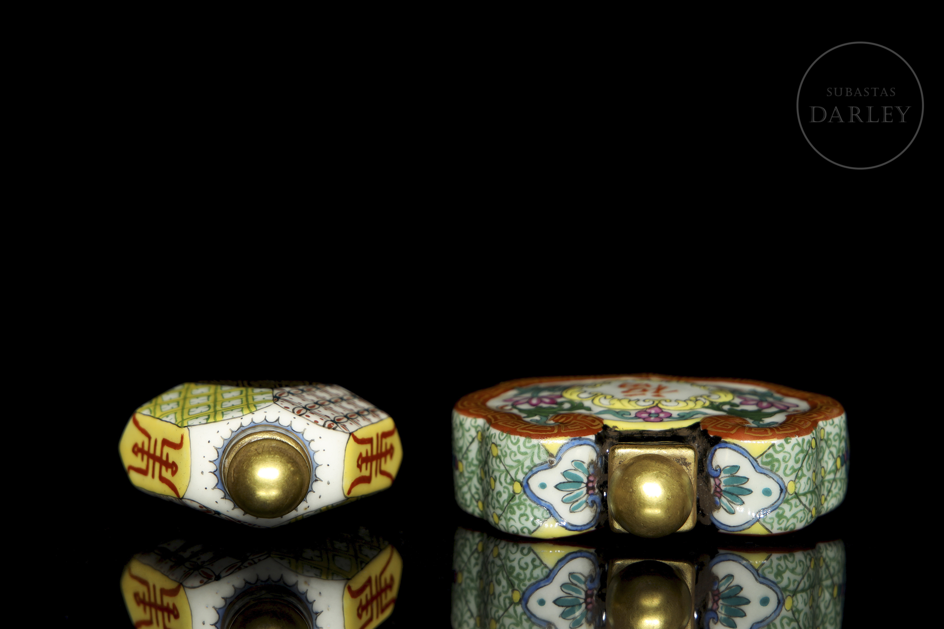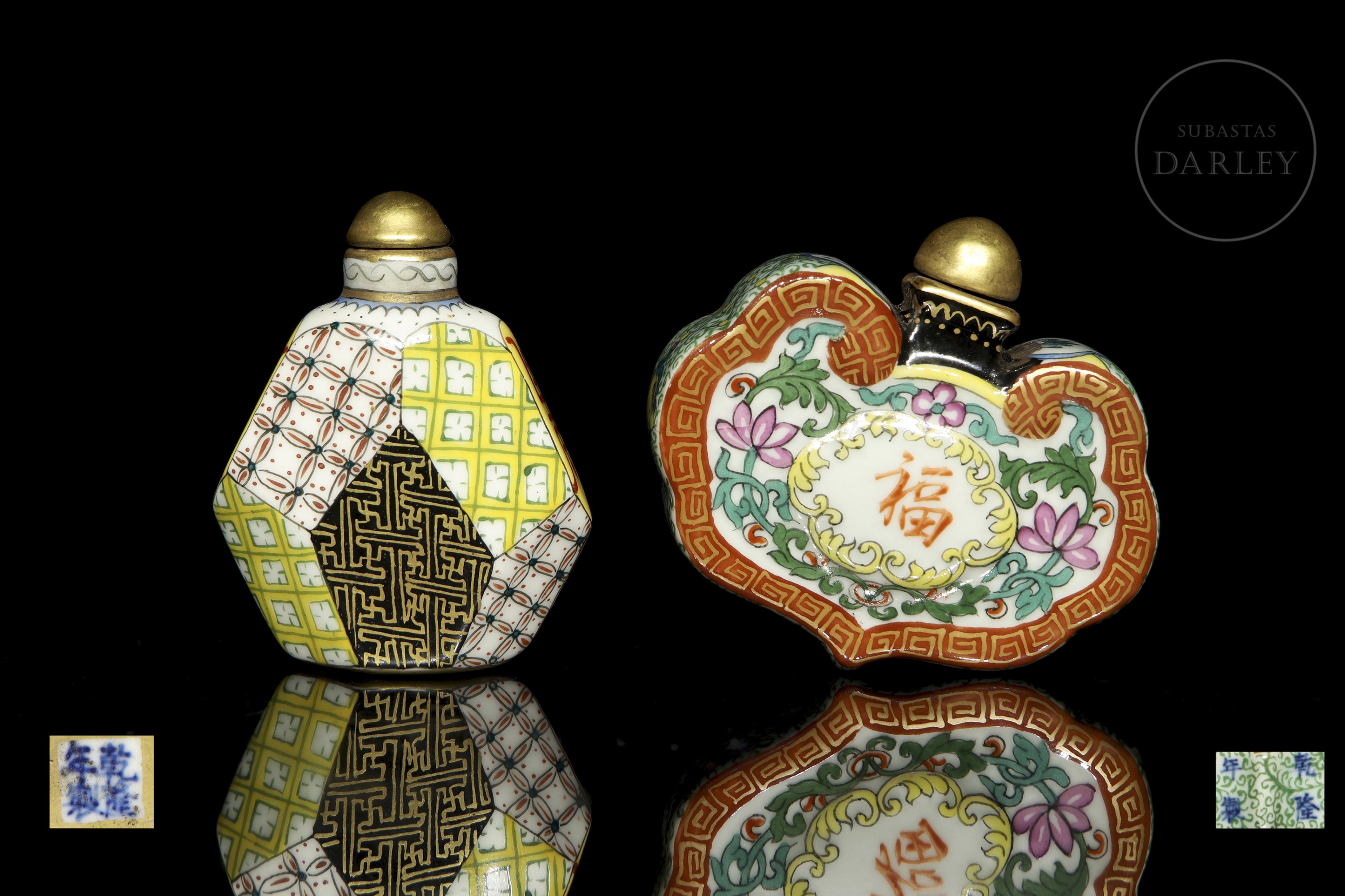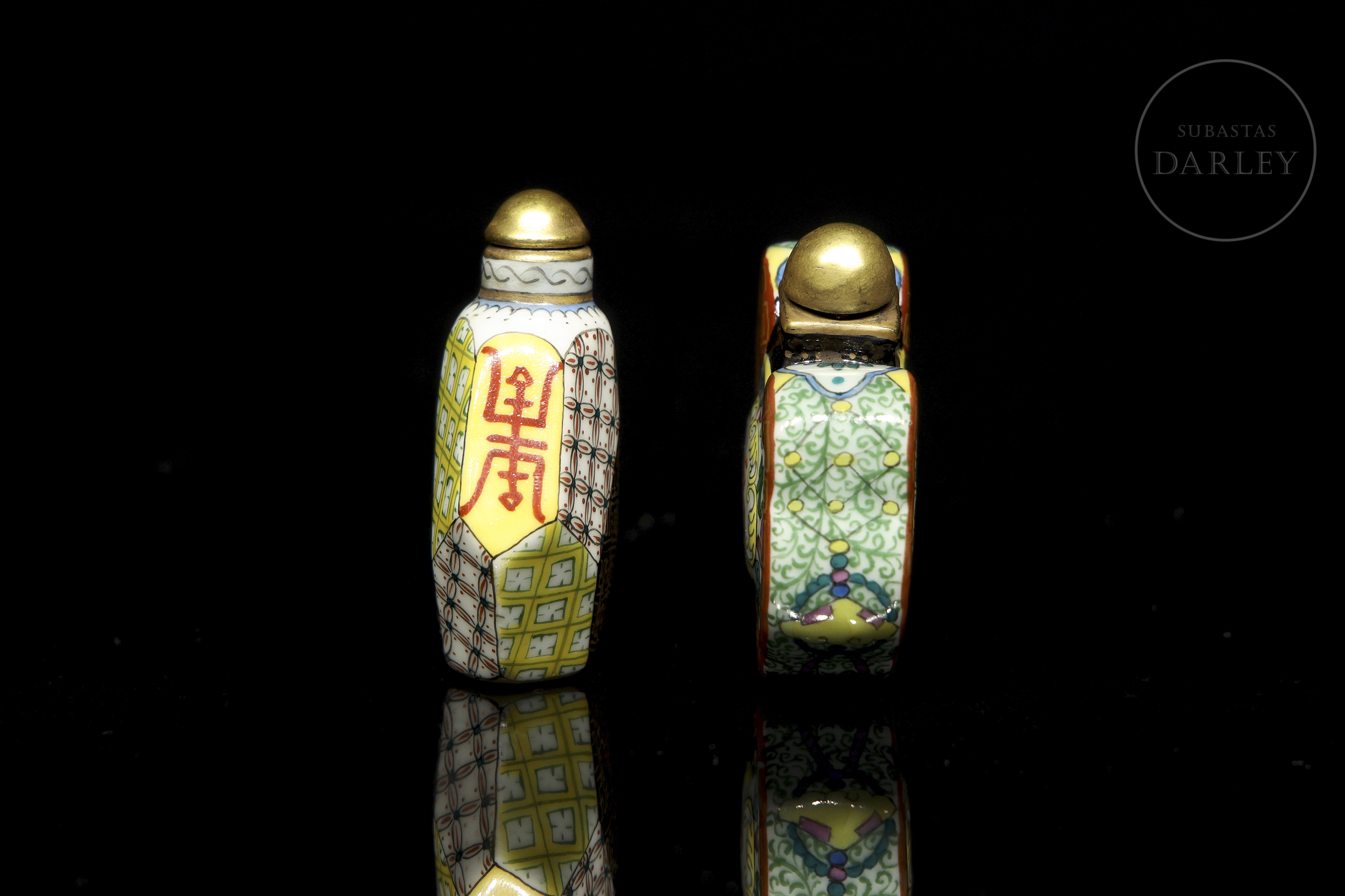 Pareja de botellas de rapé de porcelana esmaltada, con sello Qianlong