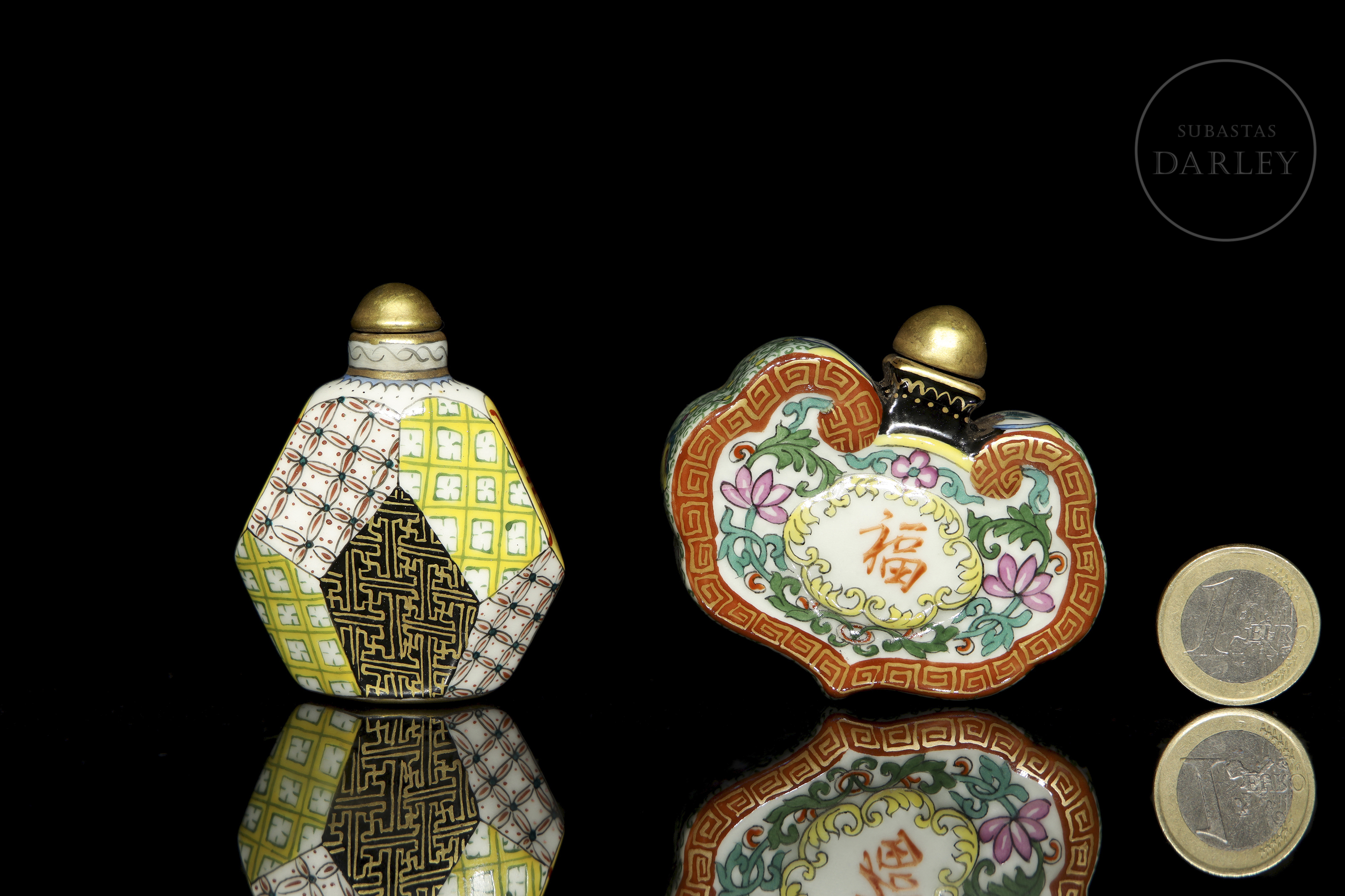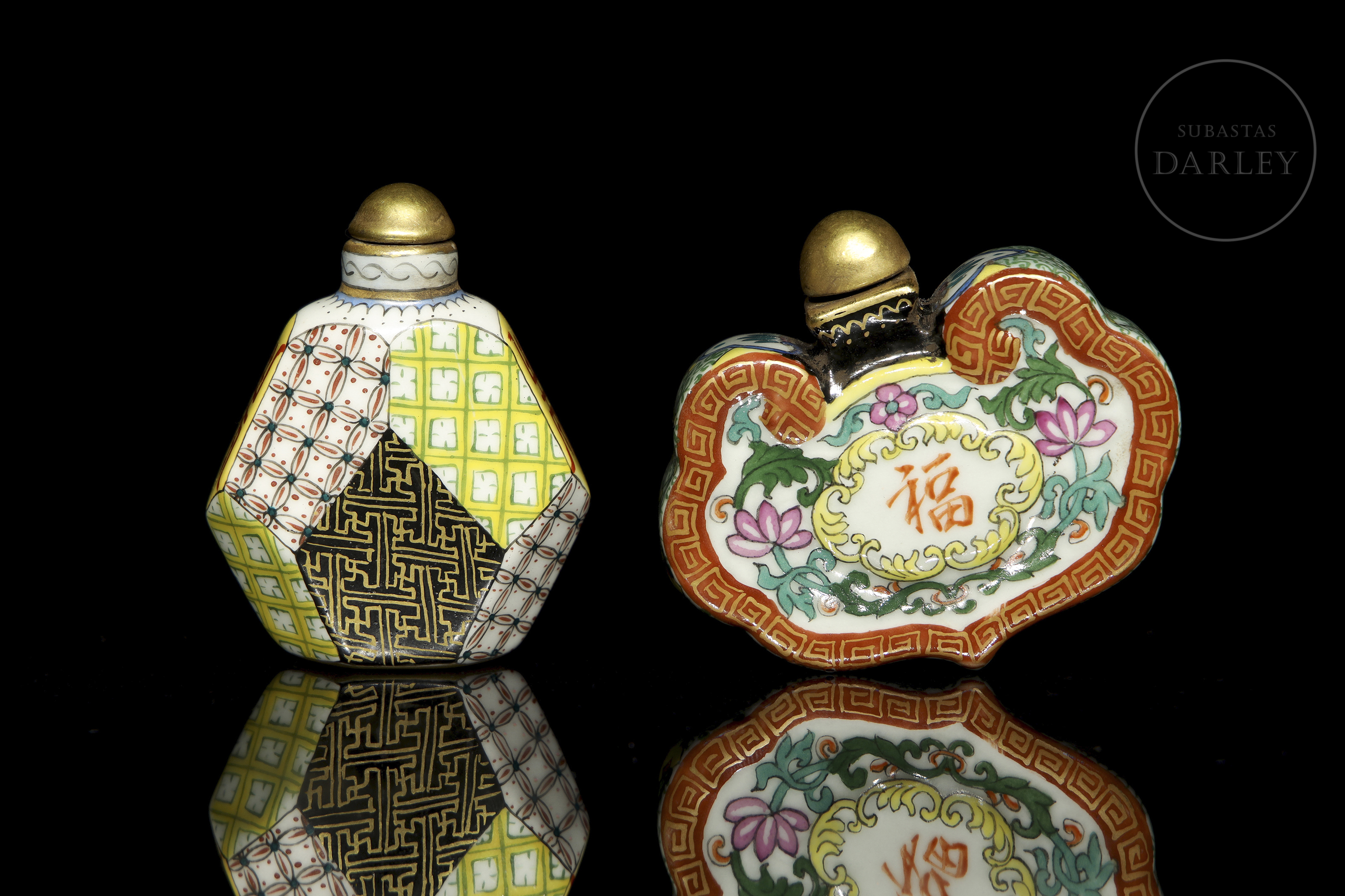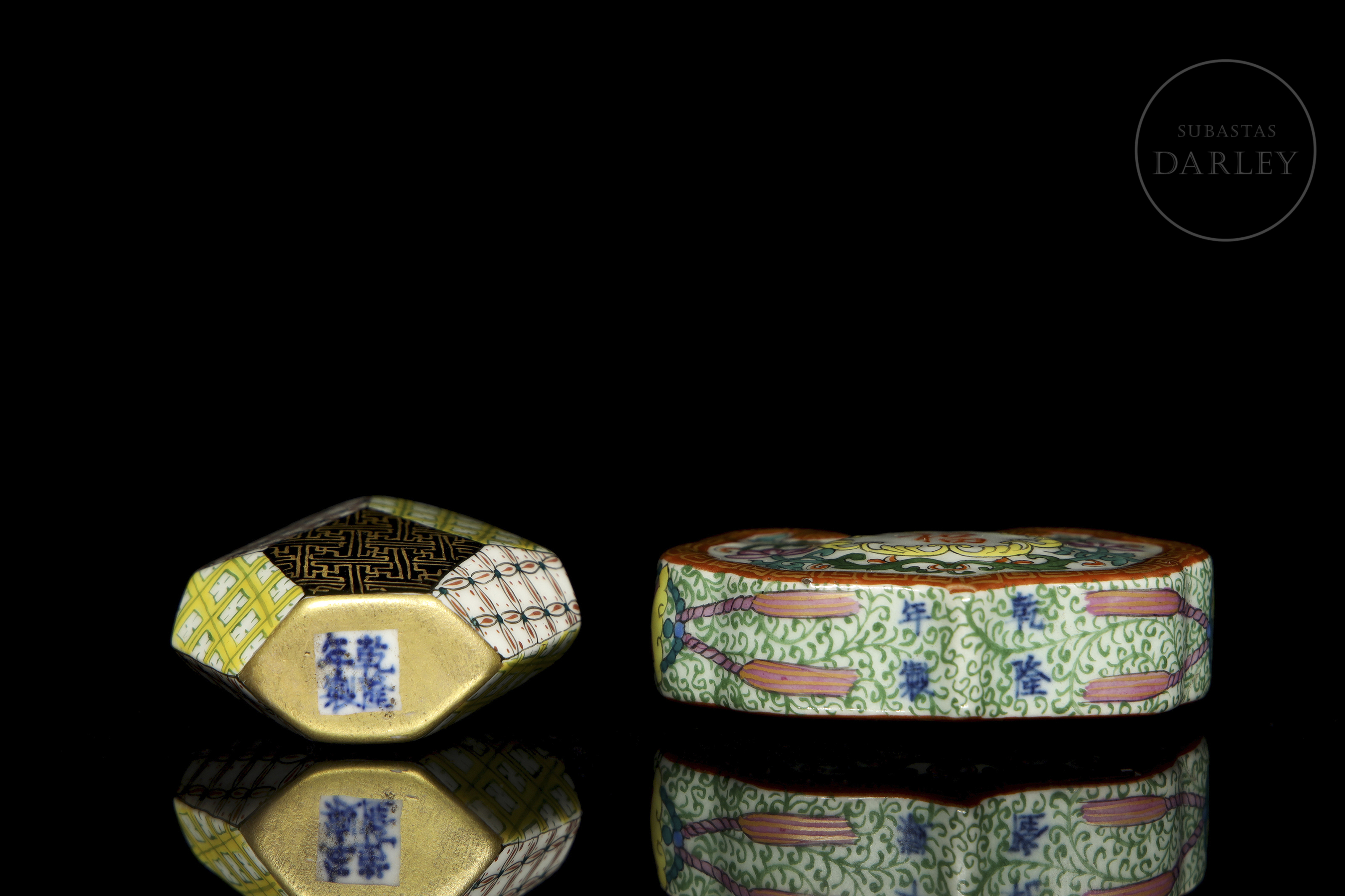 Porcelana modelada en pequeños frascos, coronados por un tapón semicircular. Cada uno, decorado en esmaltes policromo. Uno con forma hexagonal y diseño geométrico; el otro, con forma lobulada, presenta flores de loto, grecas y un carácter central. Ambos con sello "乾隆年制" en la base.