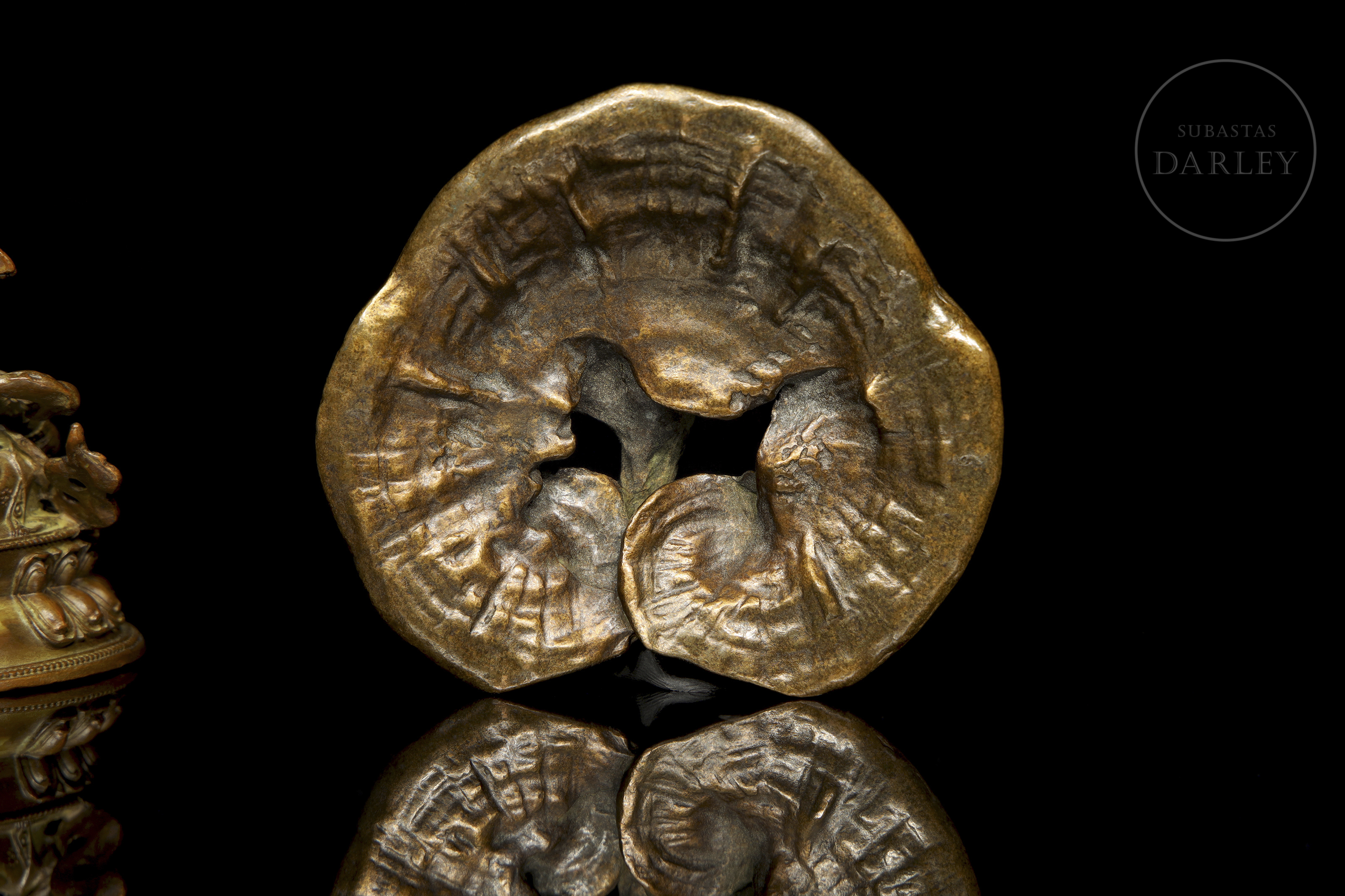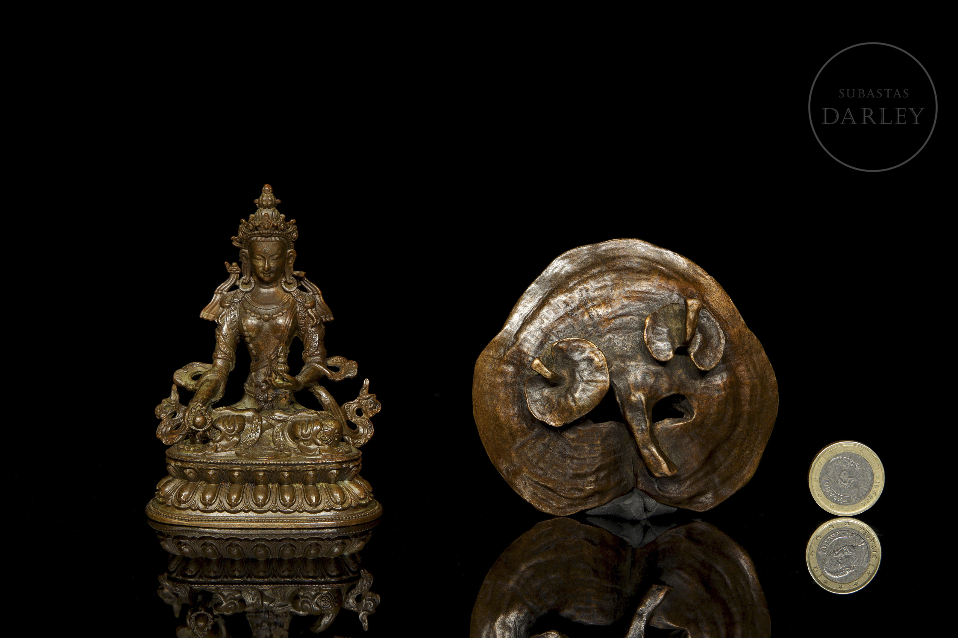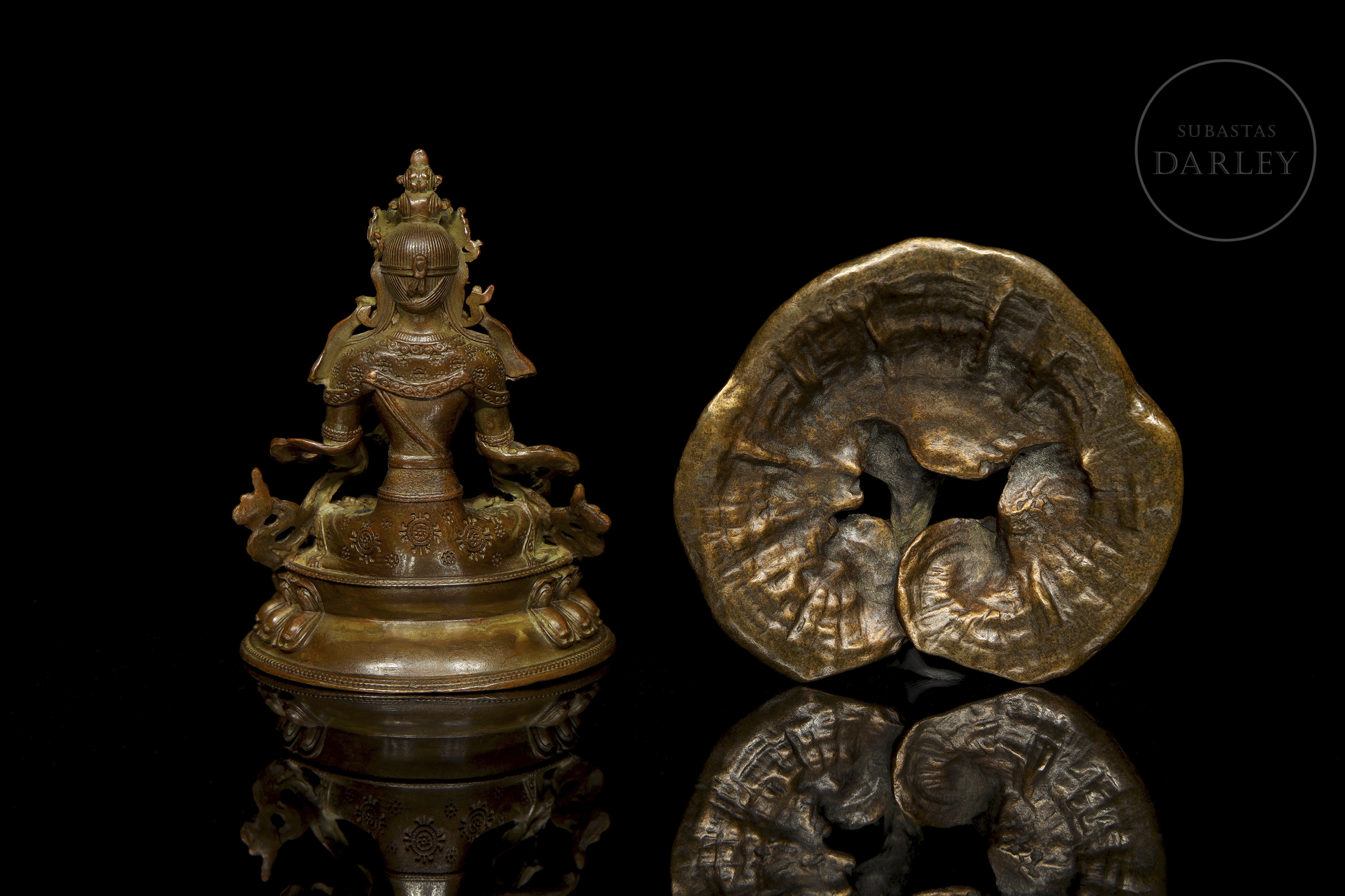 Dos figuras de bronce con pátina. La primera muestra la figura de una deidad, posiblemente "Tara" en posición sedente, con las manos en gesto de meditación (dhyana mudra). La segunda pieza es una escultura que representa un gran hongo Lingzhi junto a otros dos más pequeños brotando.